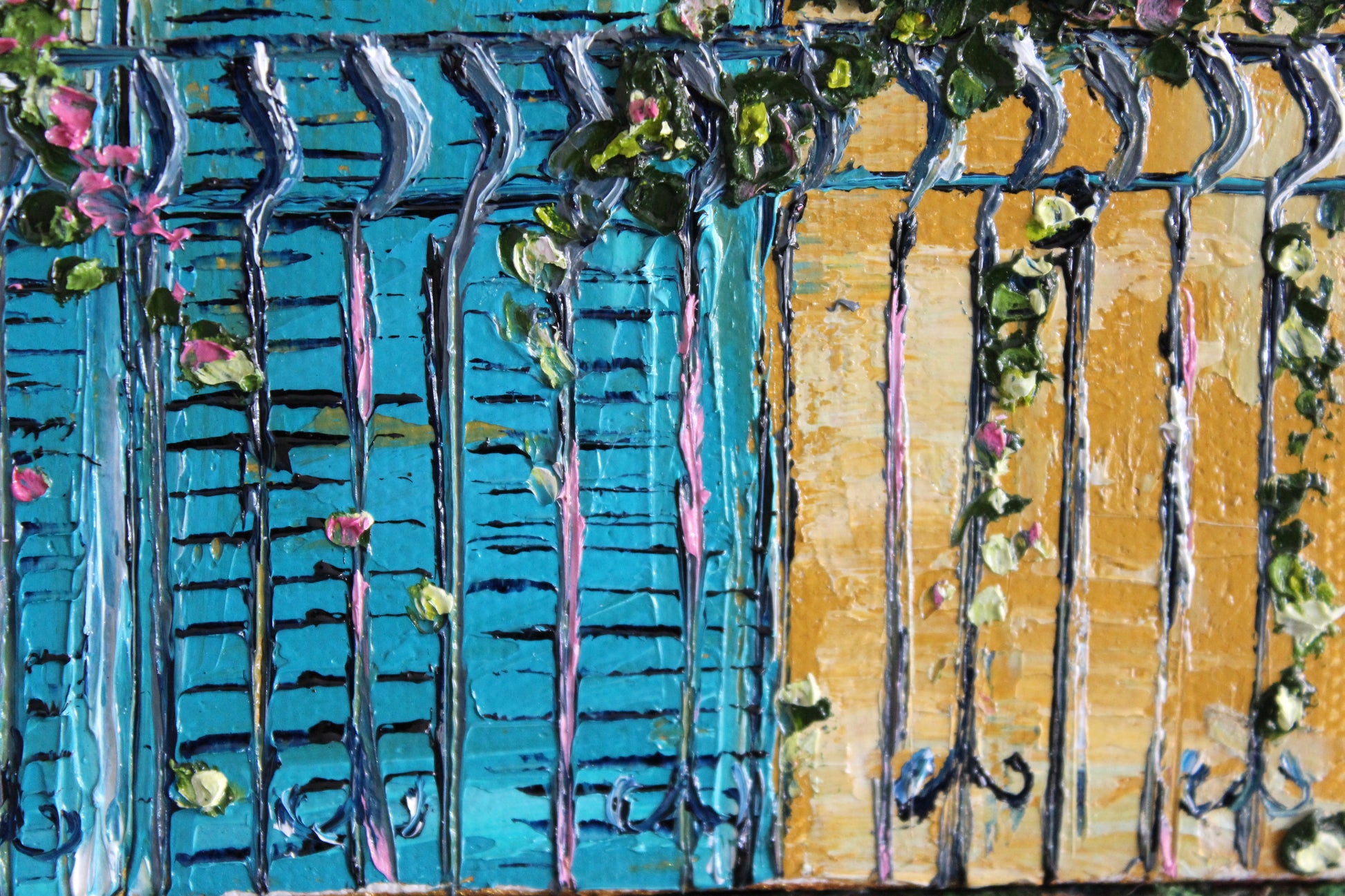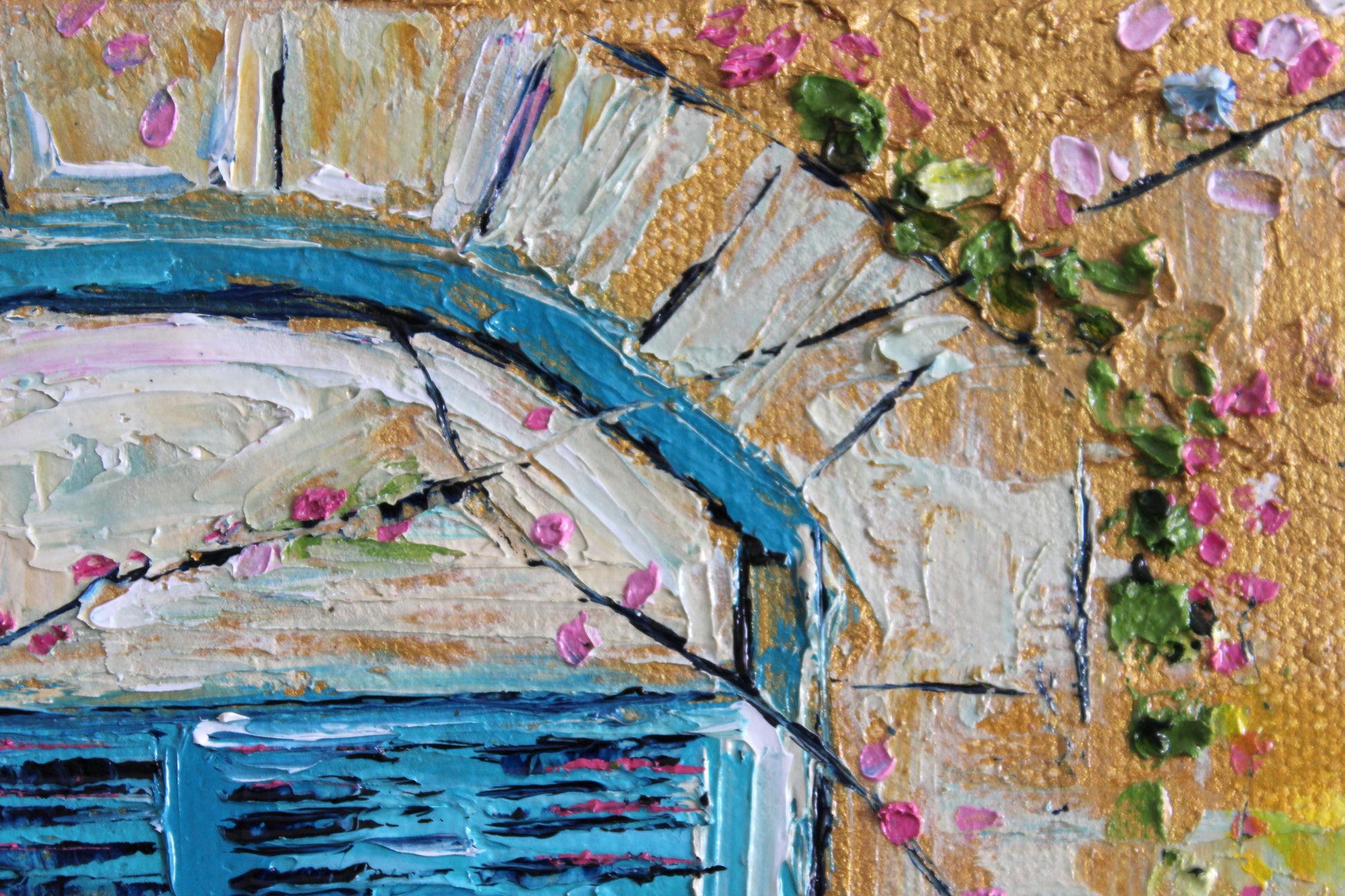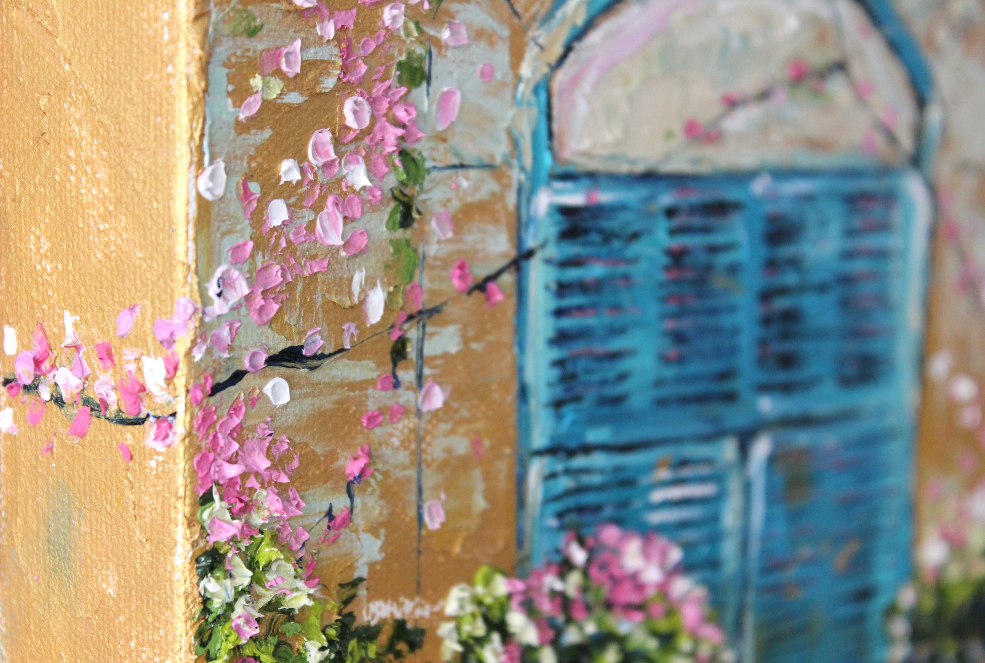 This textured palette knife painting features a charming balcony with a blue window and blooming flowers, creating a peaceful and timeless scene. The rich textures and vibrant colors bring the beauty of the moment to life, perfect for brightening any space.