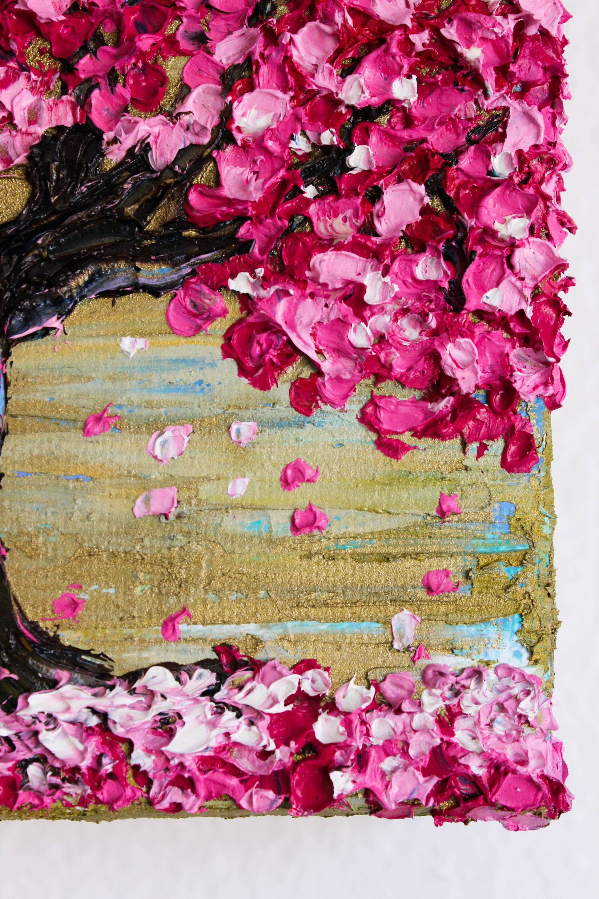 This original artwork features a heavily textured, Deep Impasto palette knife cherry tree painting. This piece has several layers of paint that creates thick and luxurious textures, giving the painting a 3D effect.
