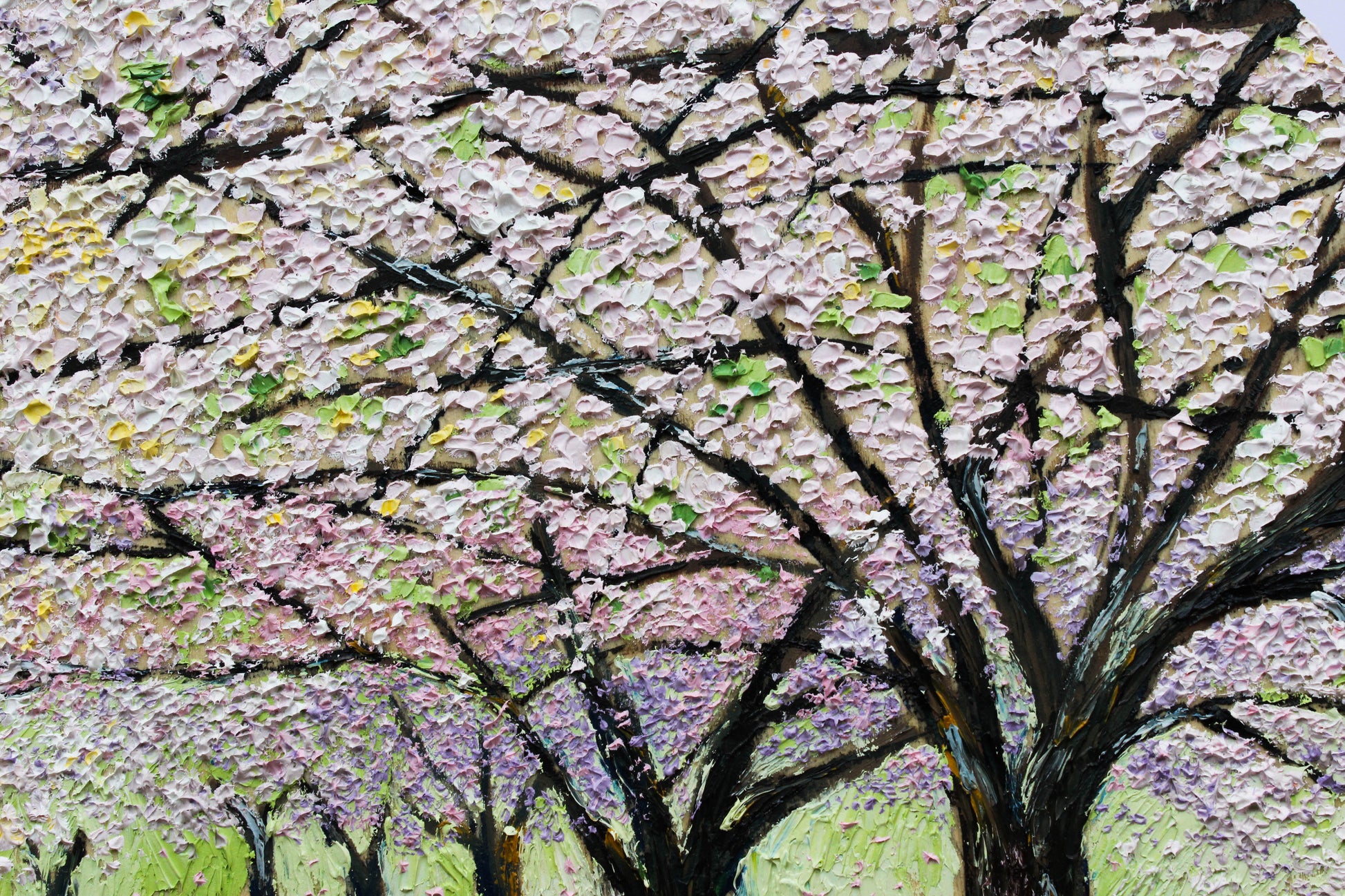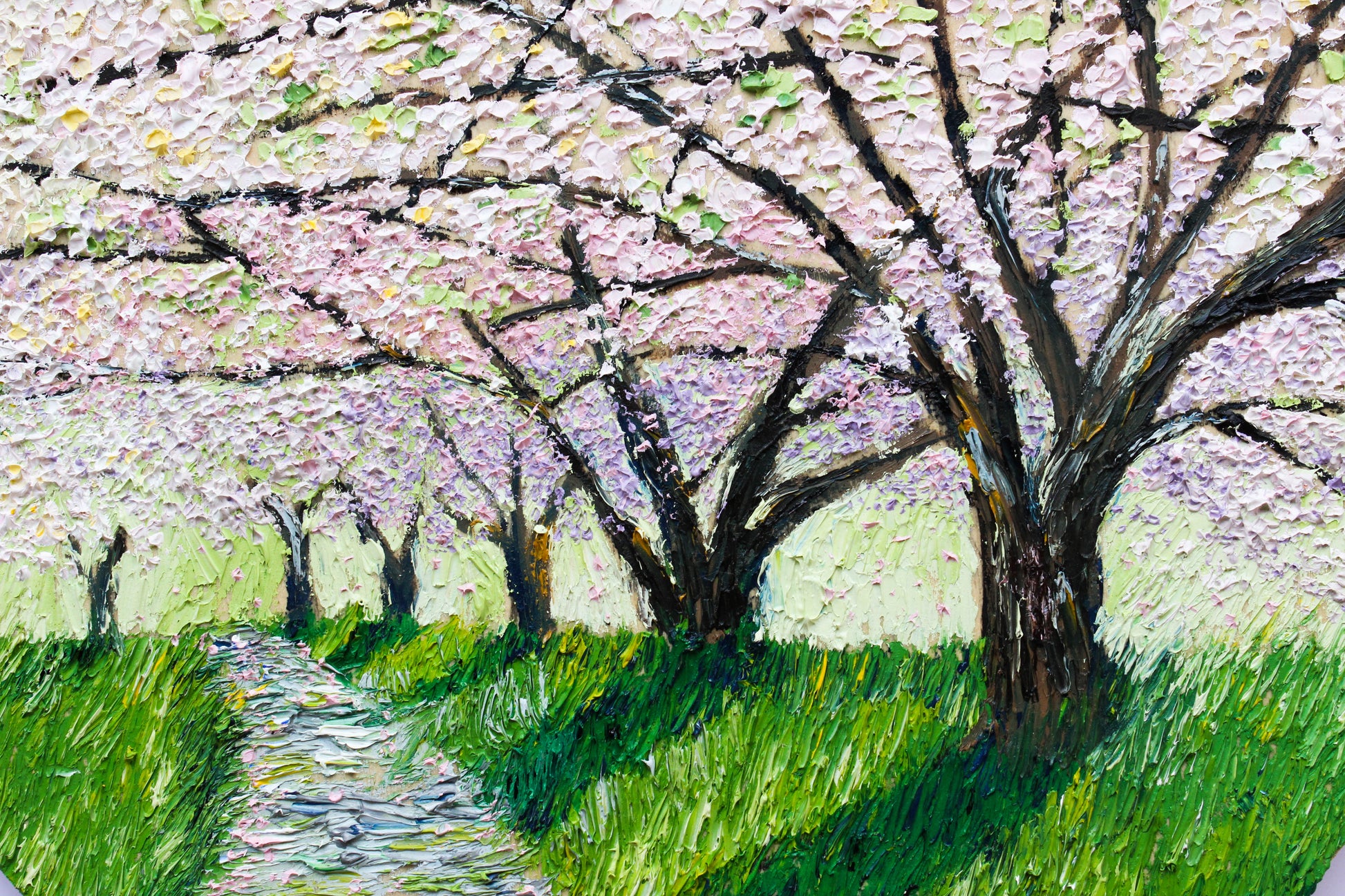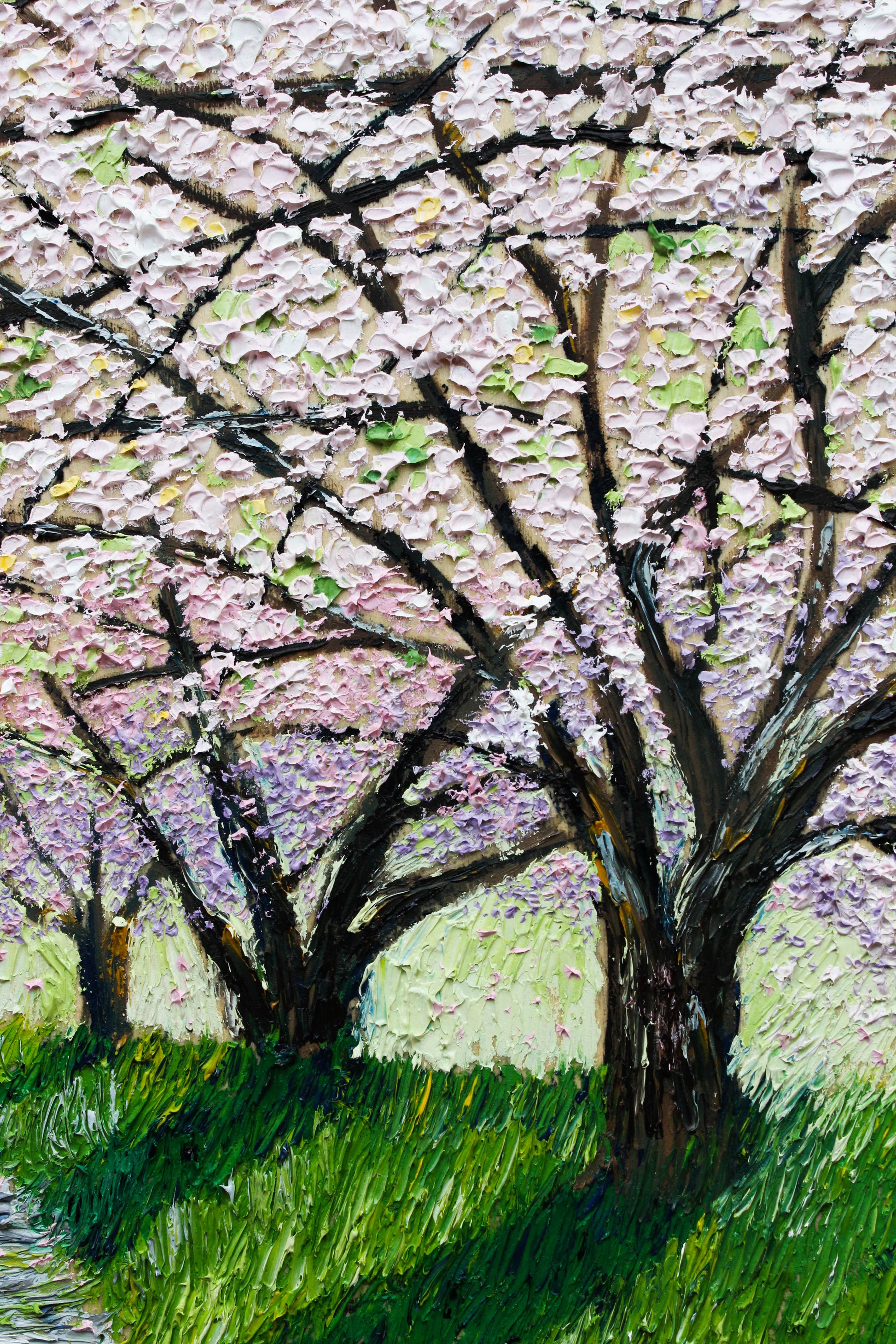 A textured palette knife painting in oil, featuring a beautiful view of Cherry Blossom trees blooming in white color. Cherry Blossoms are a symbol of renewal, they also represent the fleeting nature of life.
