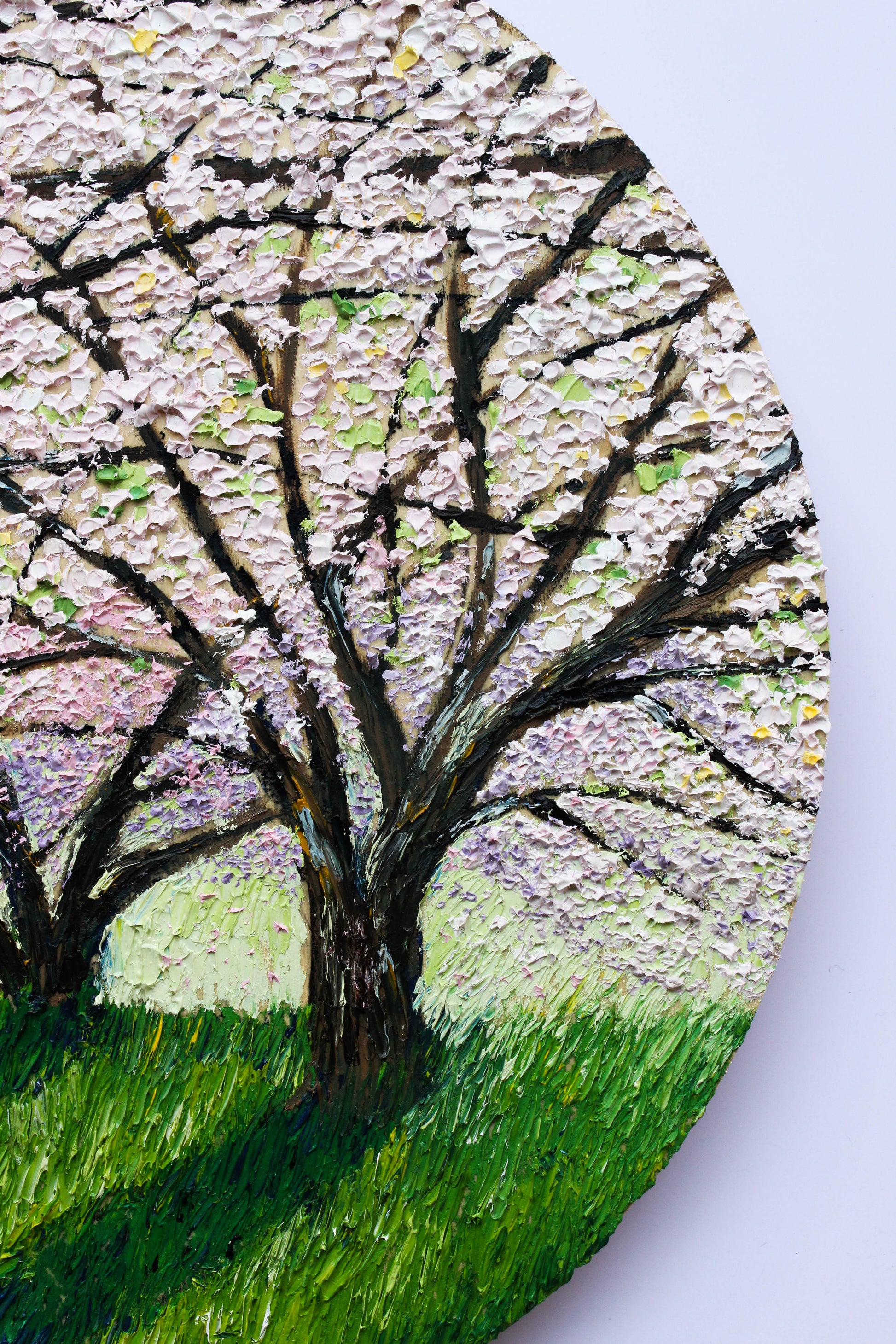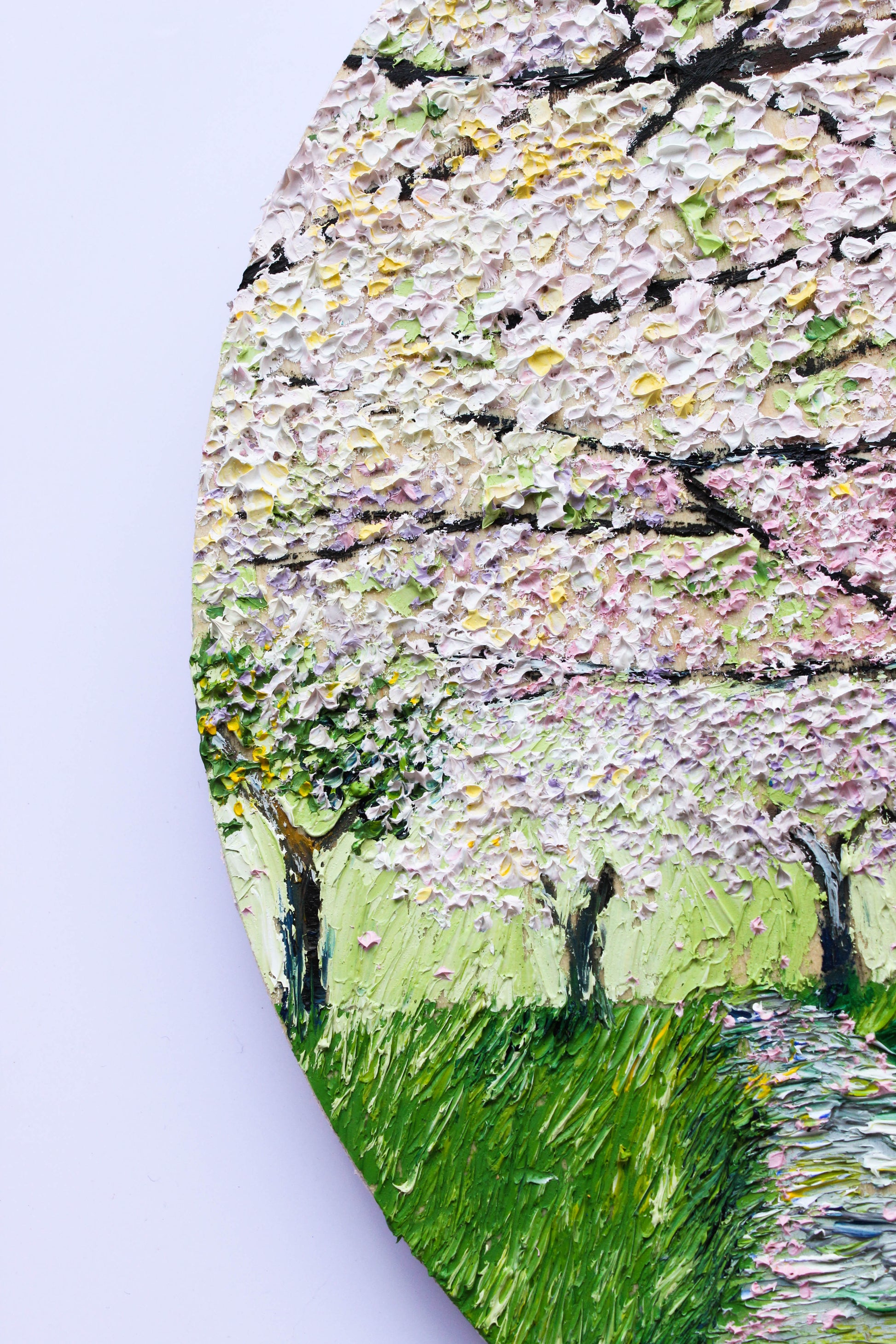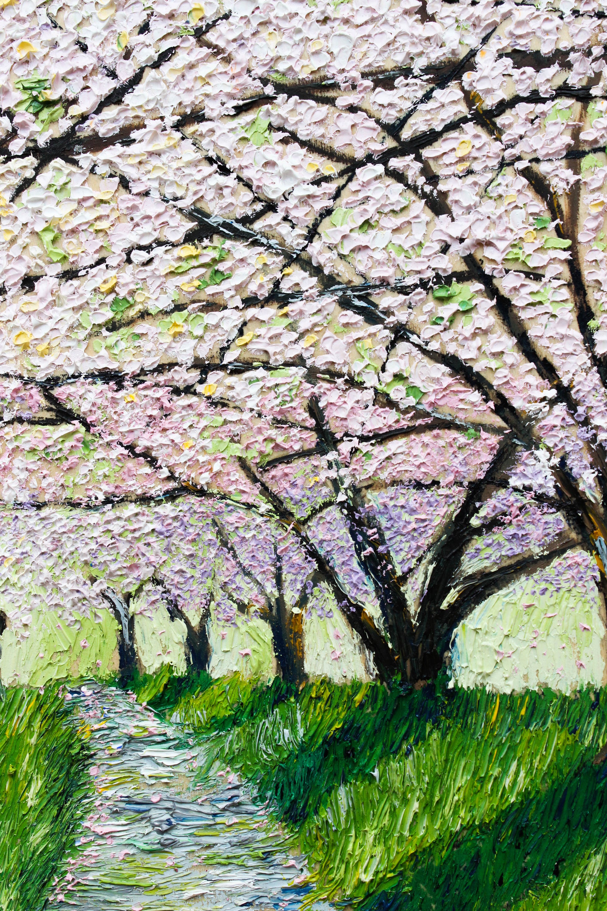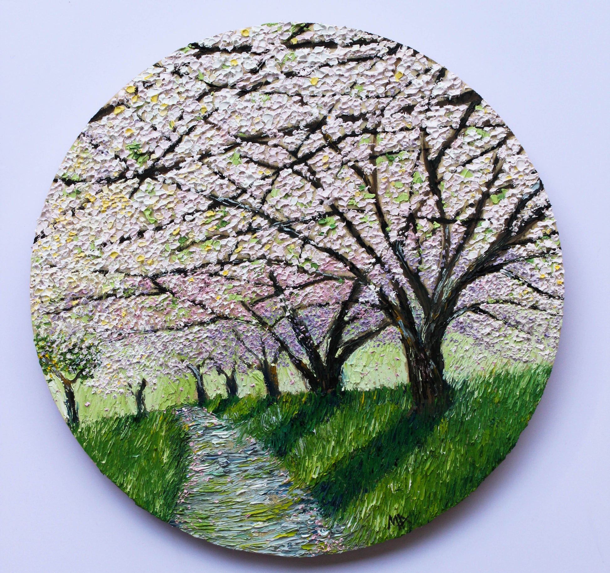 A textured palette knife painting in oil, featuring a beautiful view of Cherry Blossom trees blooming in white color. Cherry Blossoms are a symbol of renewal, they also represent the fleeting nature of life.