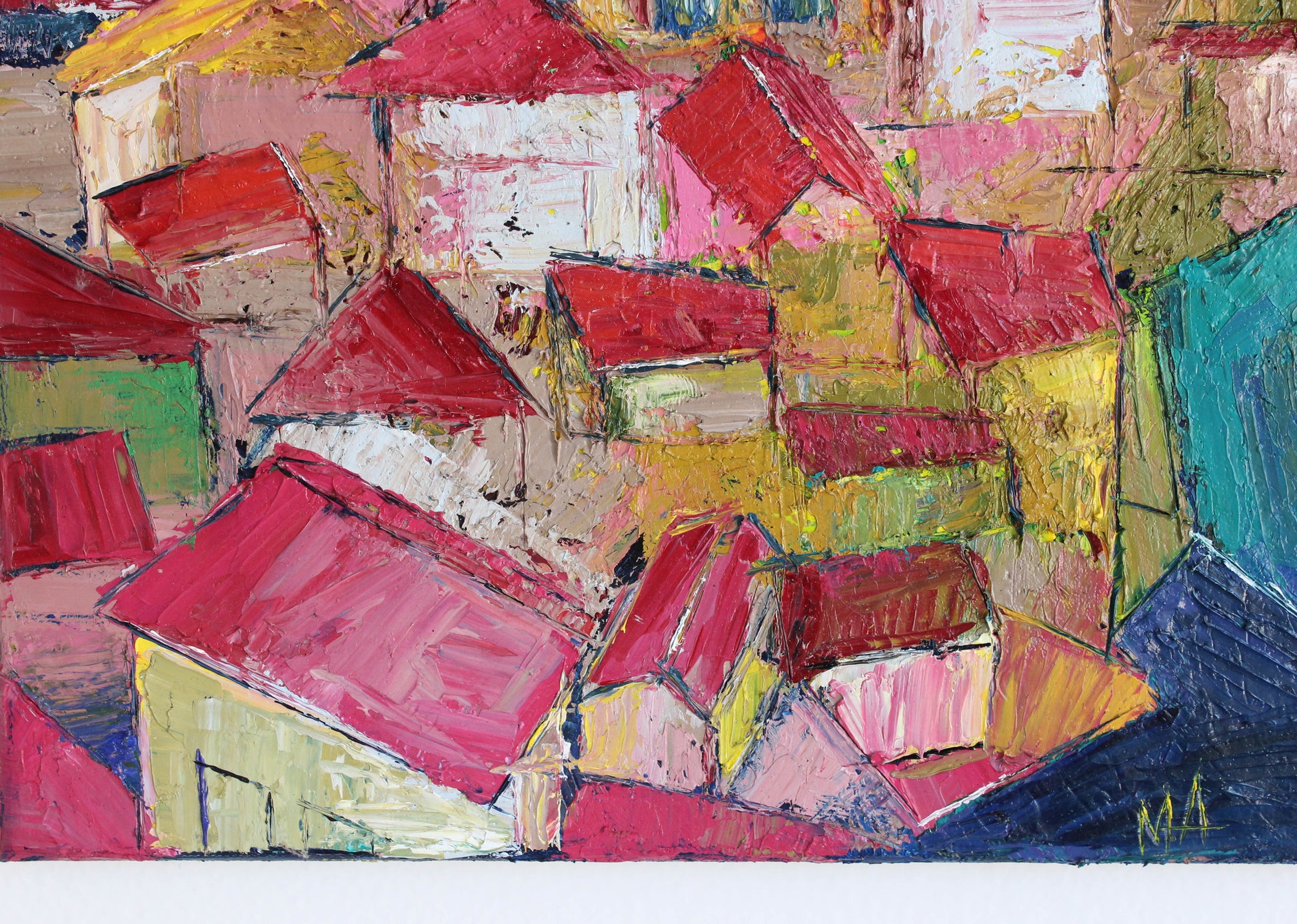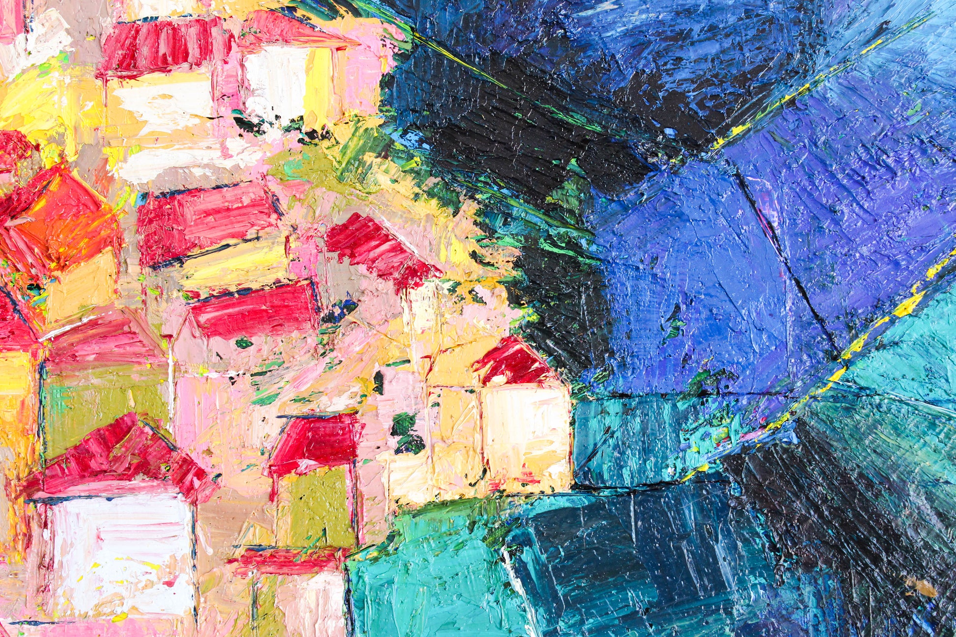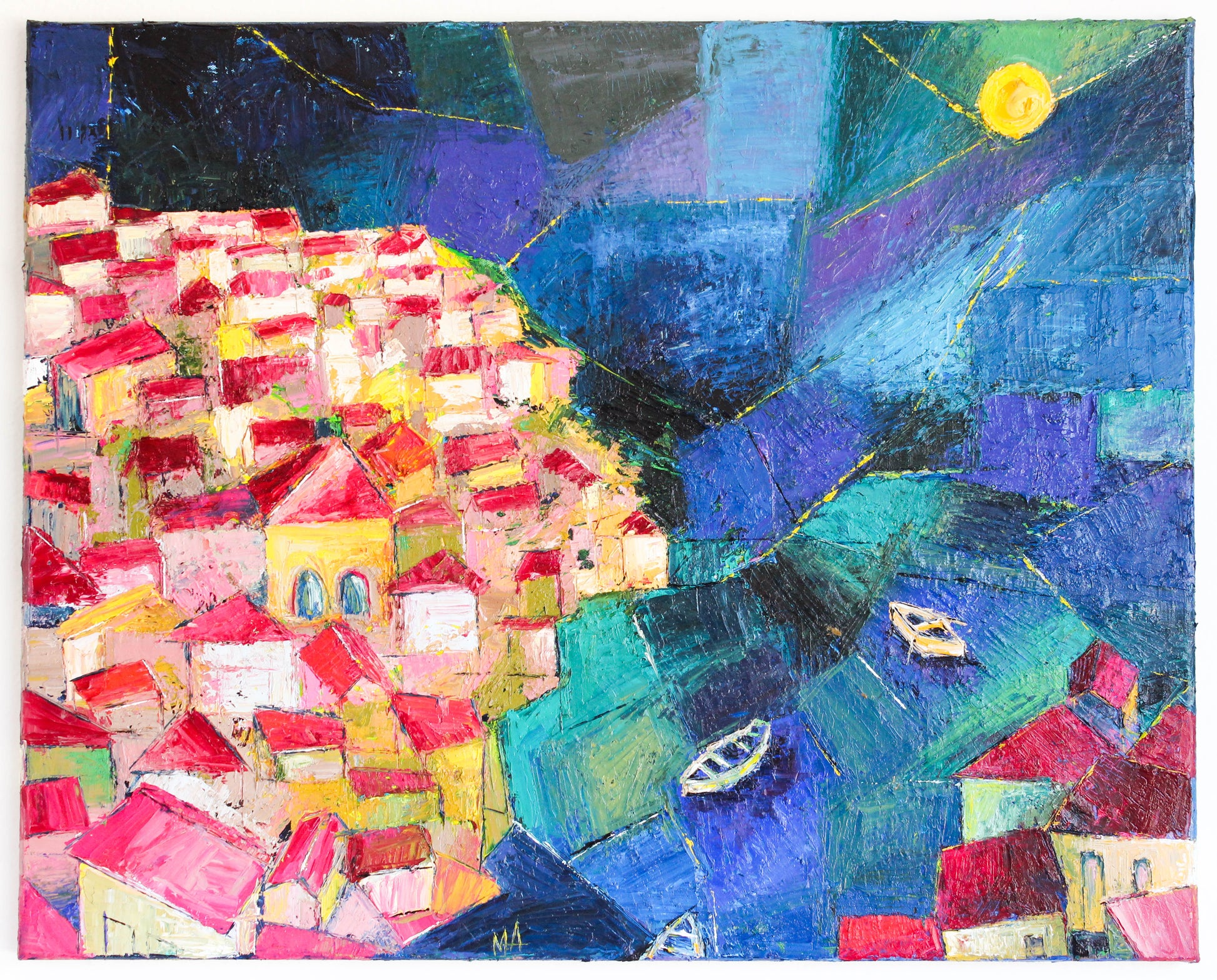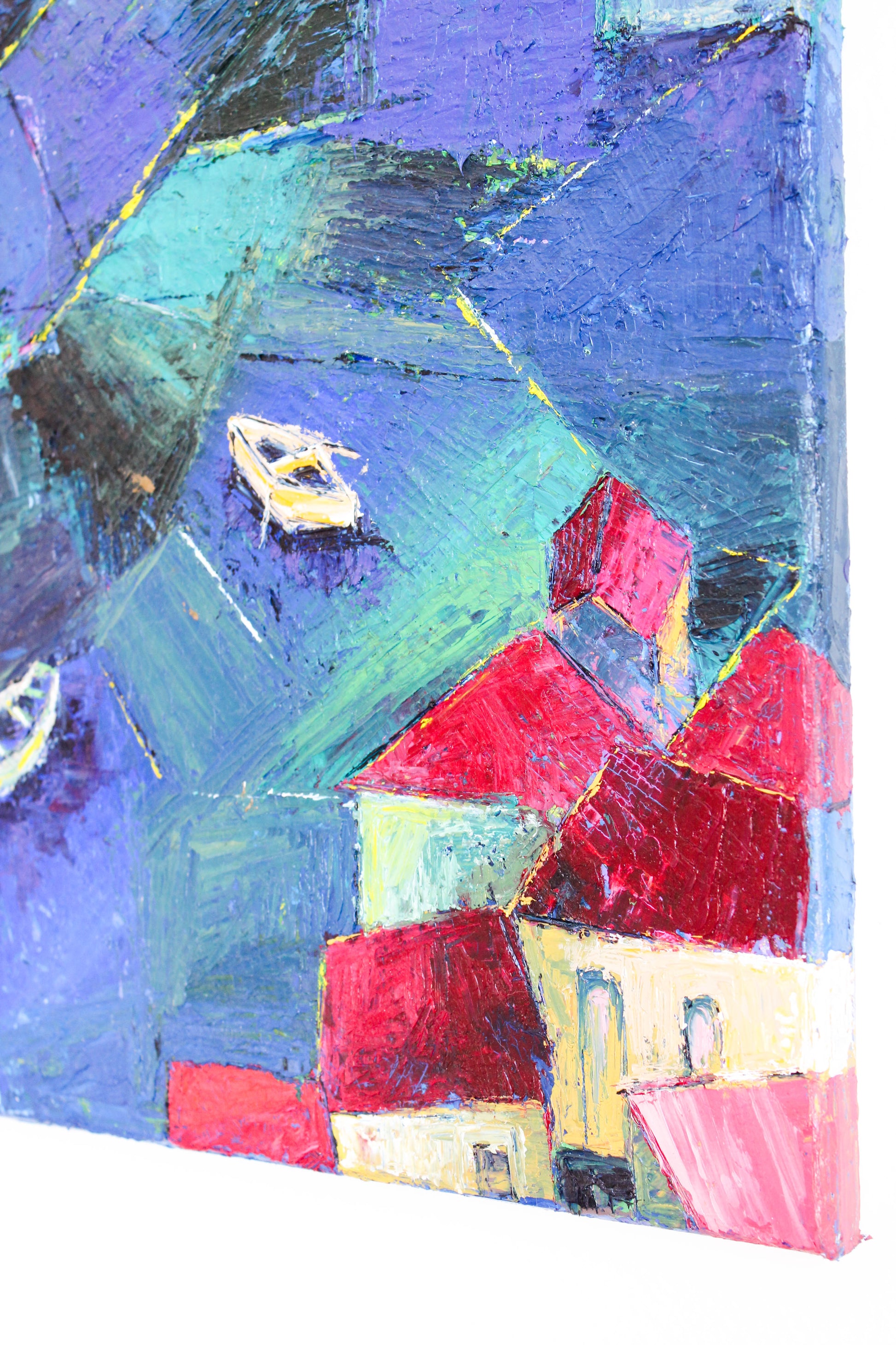 This original palette knife oil painting features a dream that I have of my home country "Lebanon". The sun is up in the sky, shining on the red rooftops of the houses sitting close to the sea. This semi-abstract painting has a thick layer of paint and is created with a complementary color scheme.