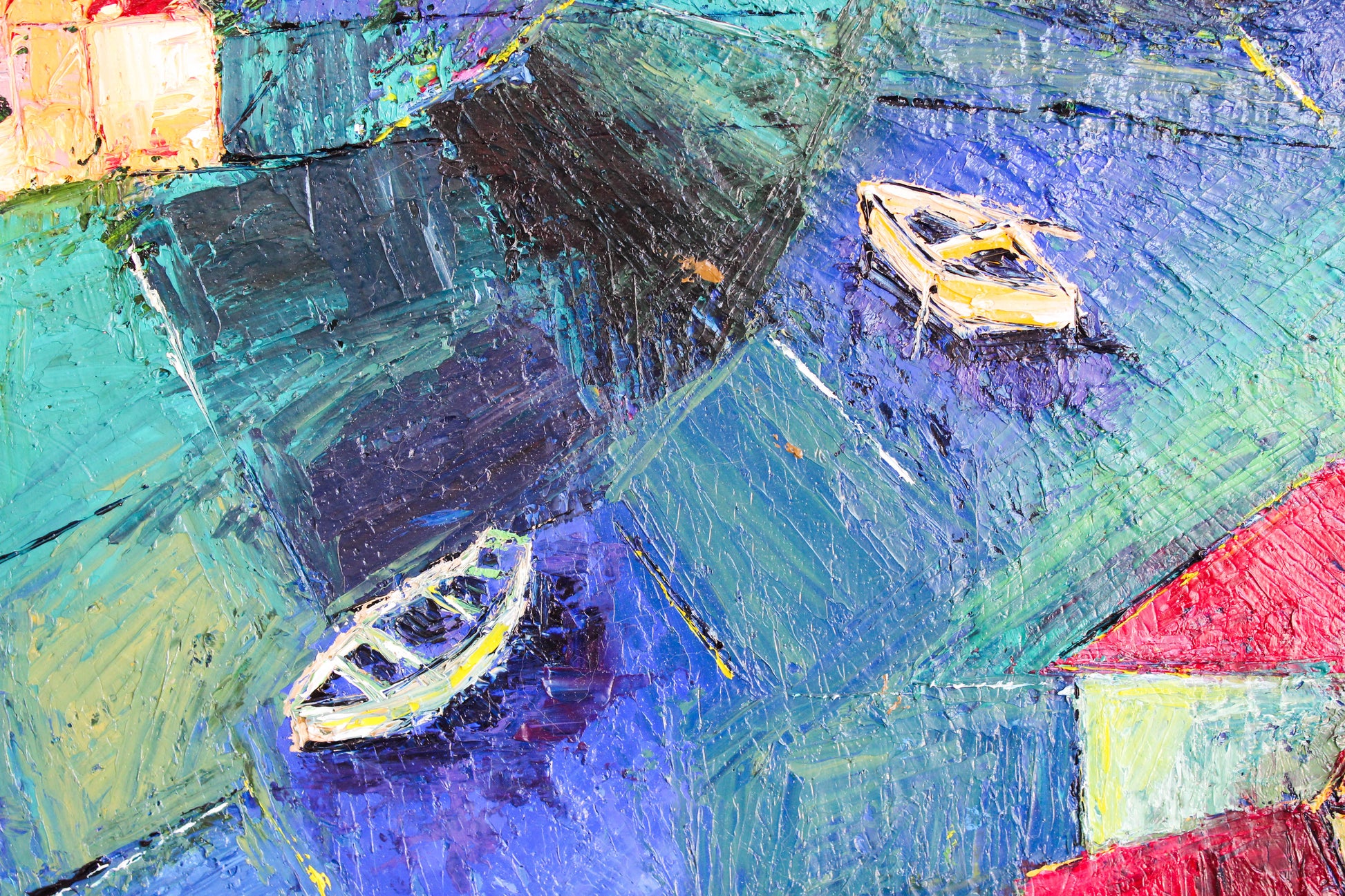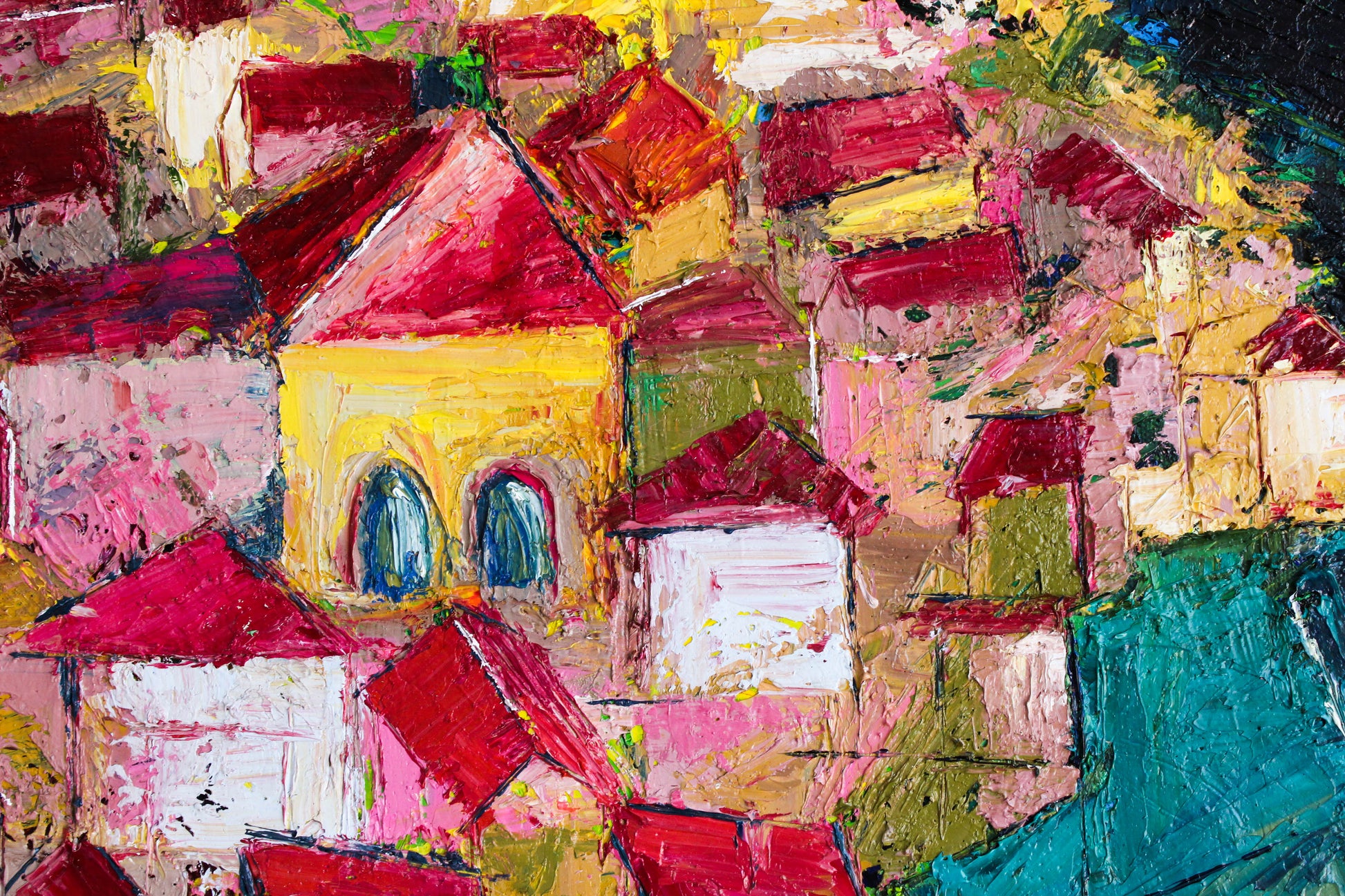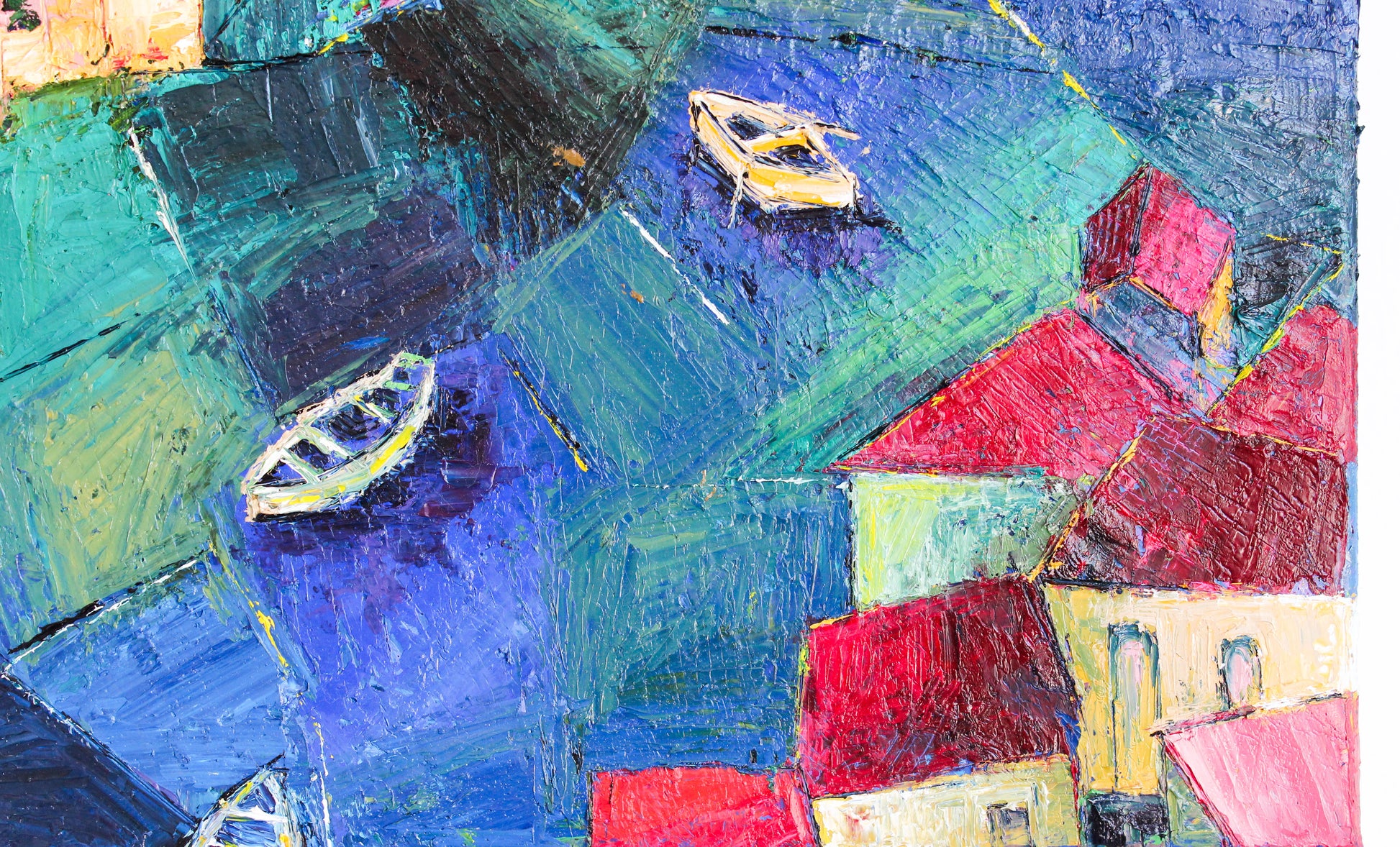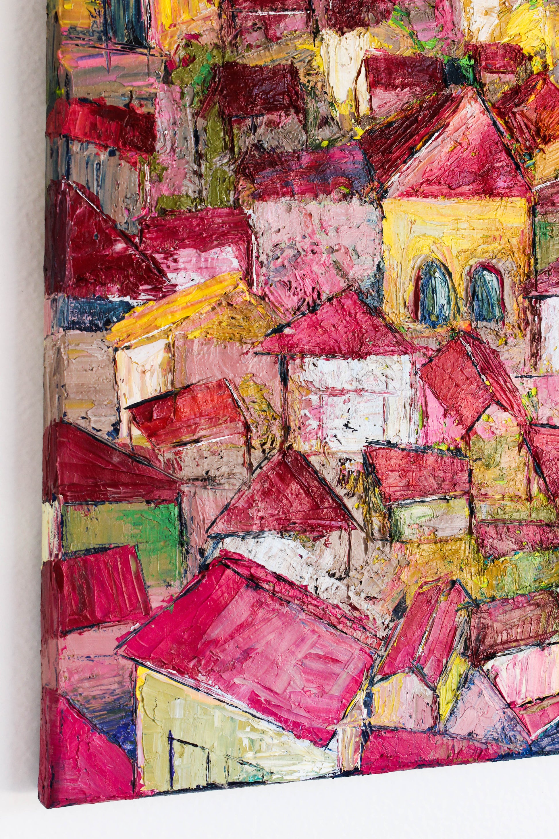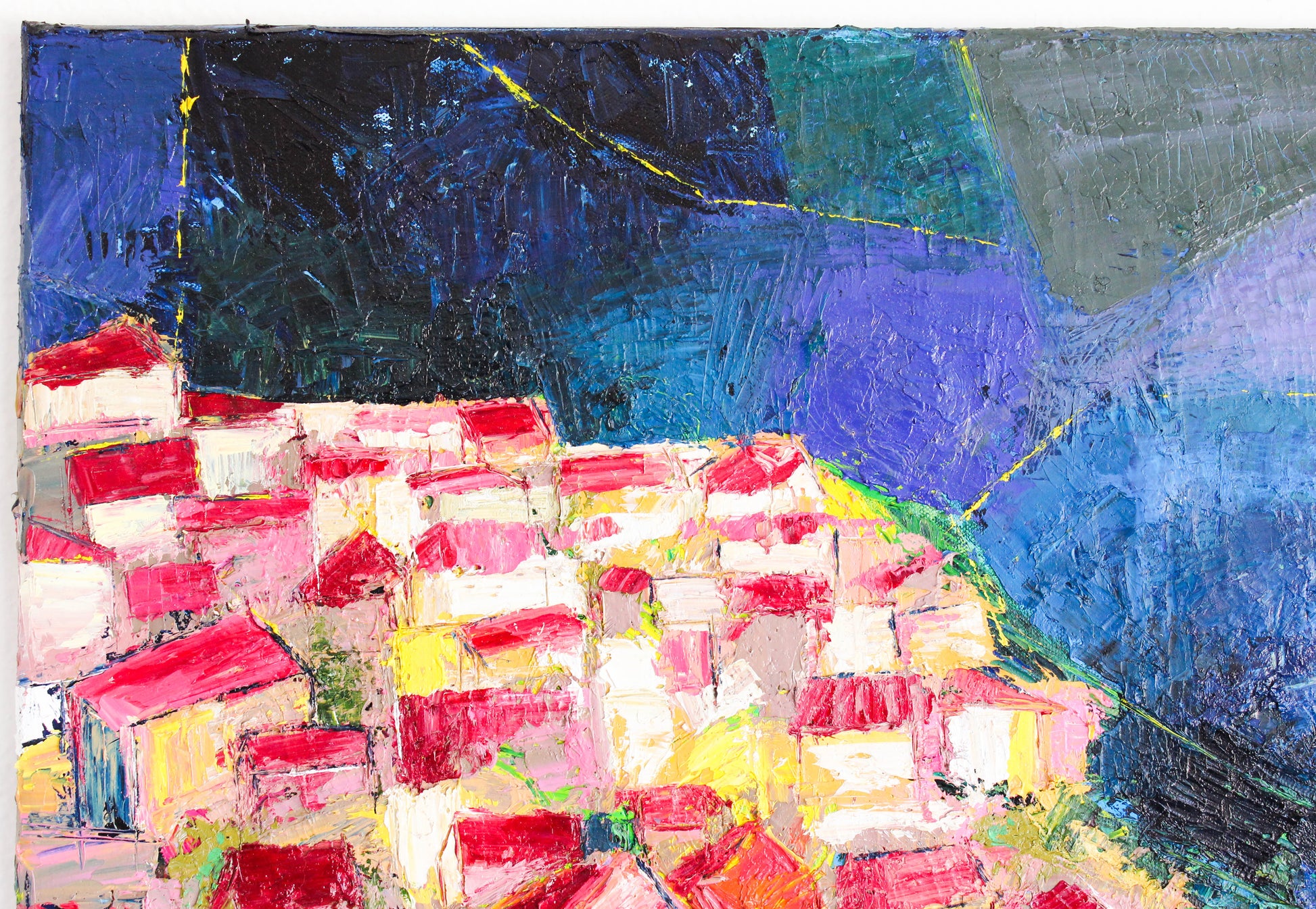 This original palette knife oil painting features a dream that I have of my home country "Lebanon". The sun is up in the sky, shining on the red rooftops of the houses sitting close to the sea. This semi-abstract painting has a thick layer of paint and is created with a complementary color scheme.