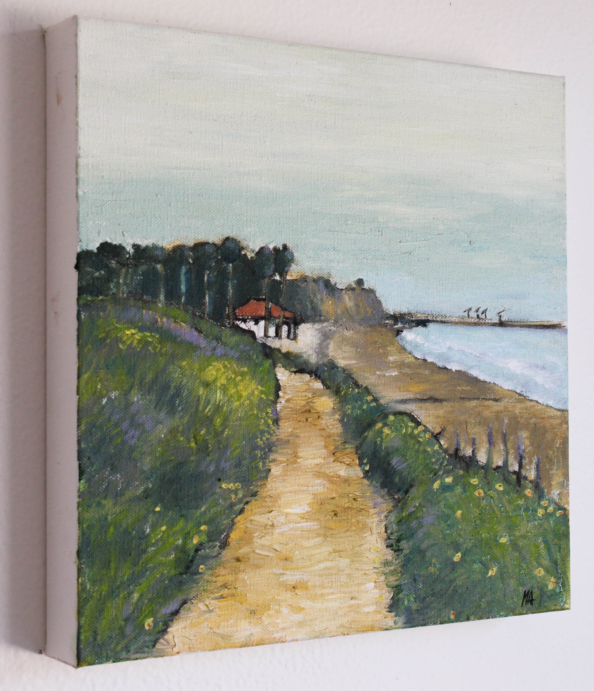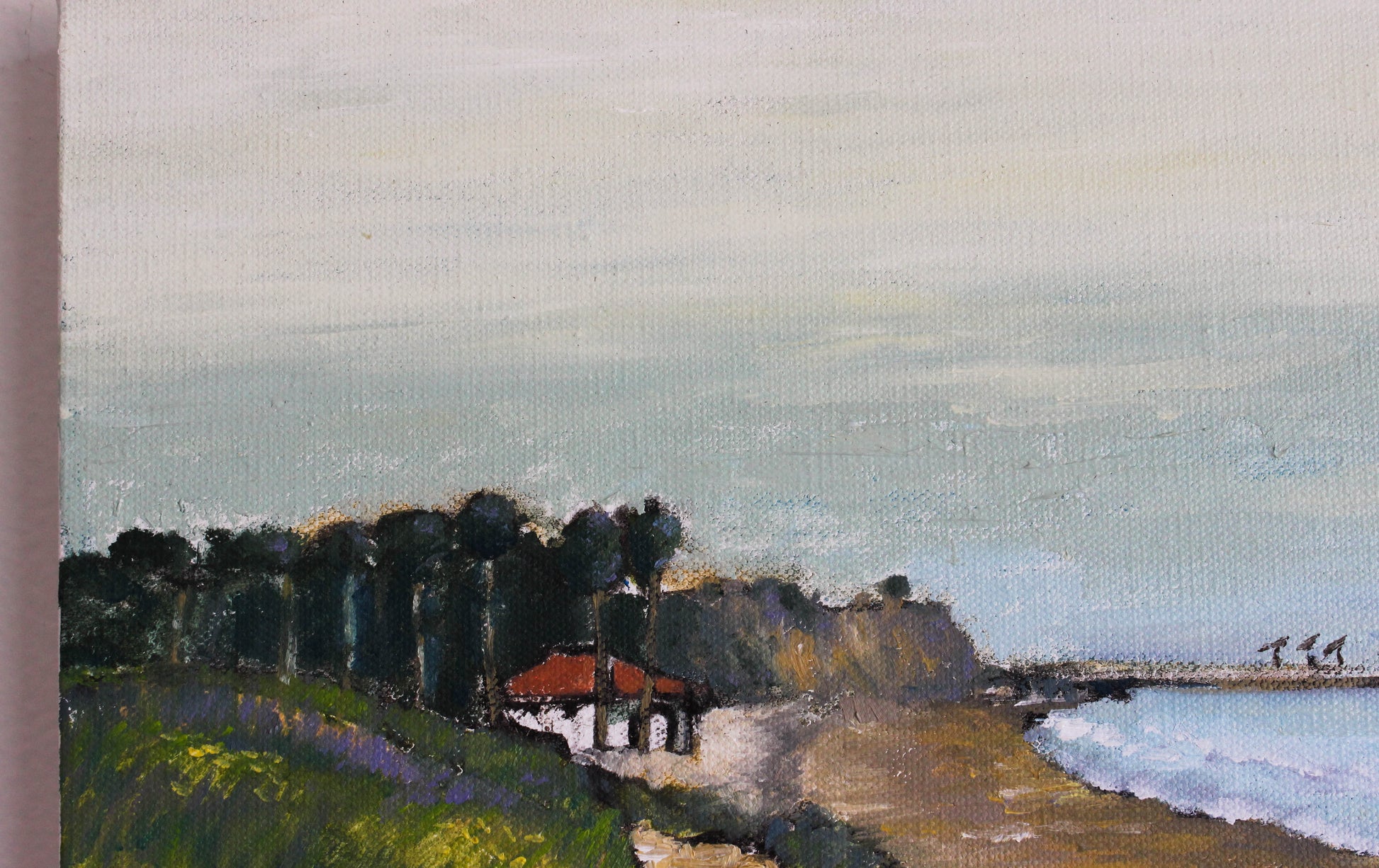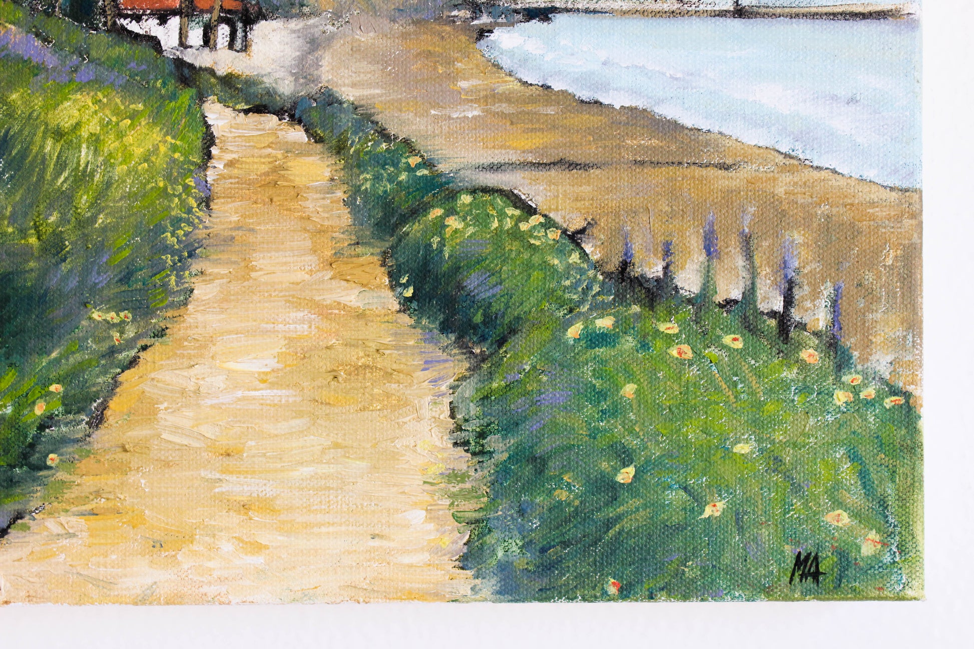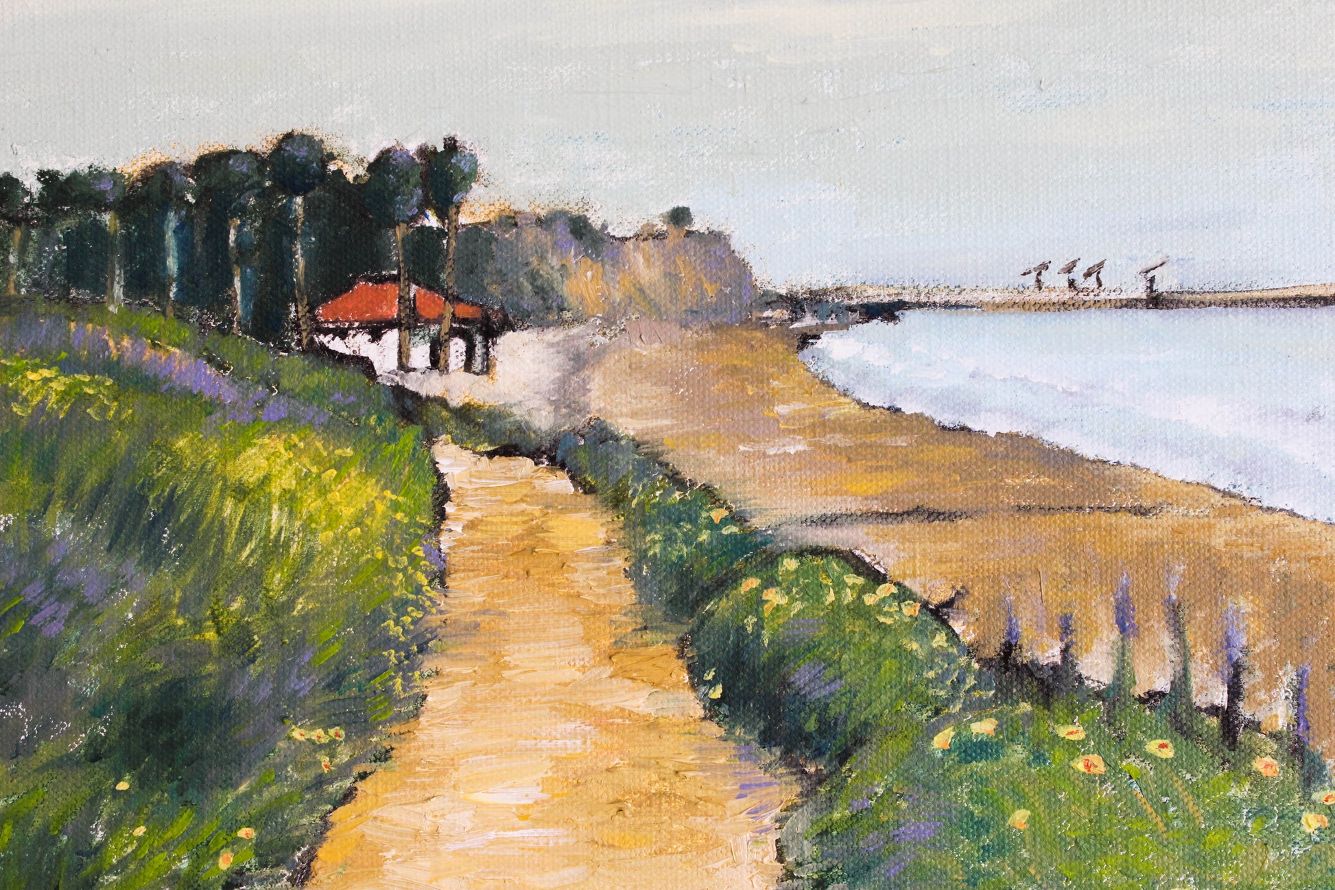 A beautiful oil painting with brush, featuring a colorful "Santa Barbara" landscape located in SoCal.