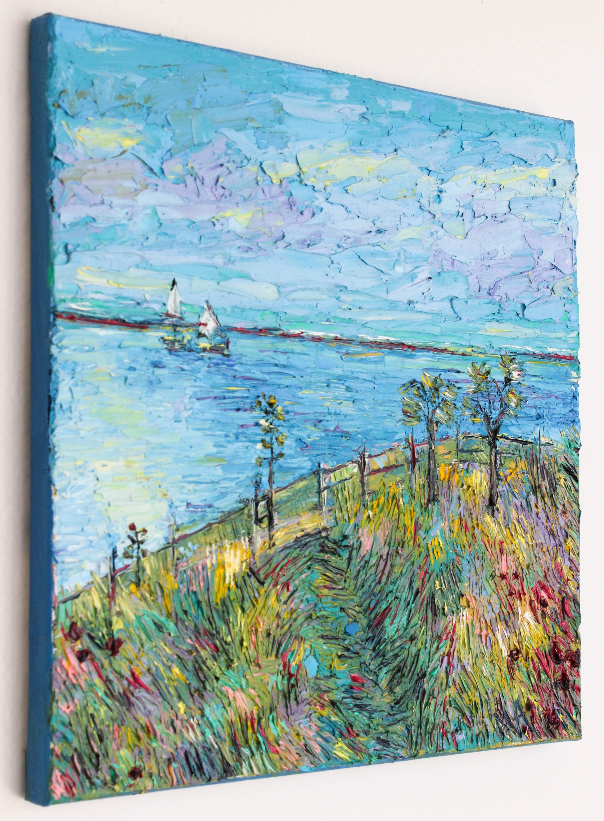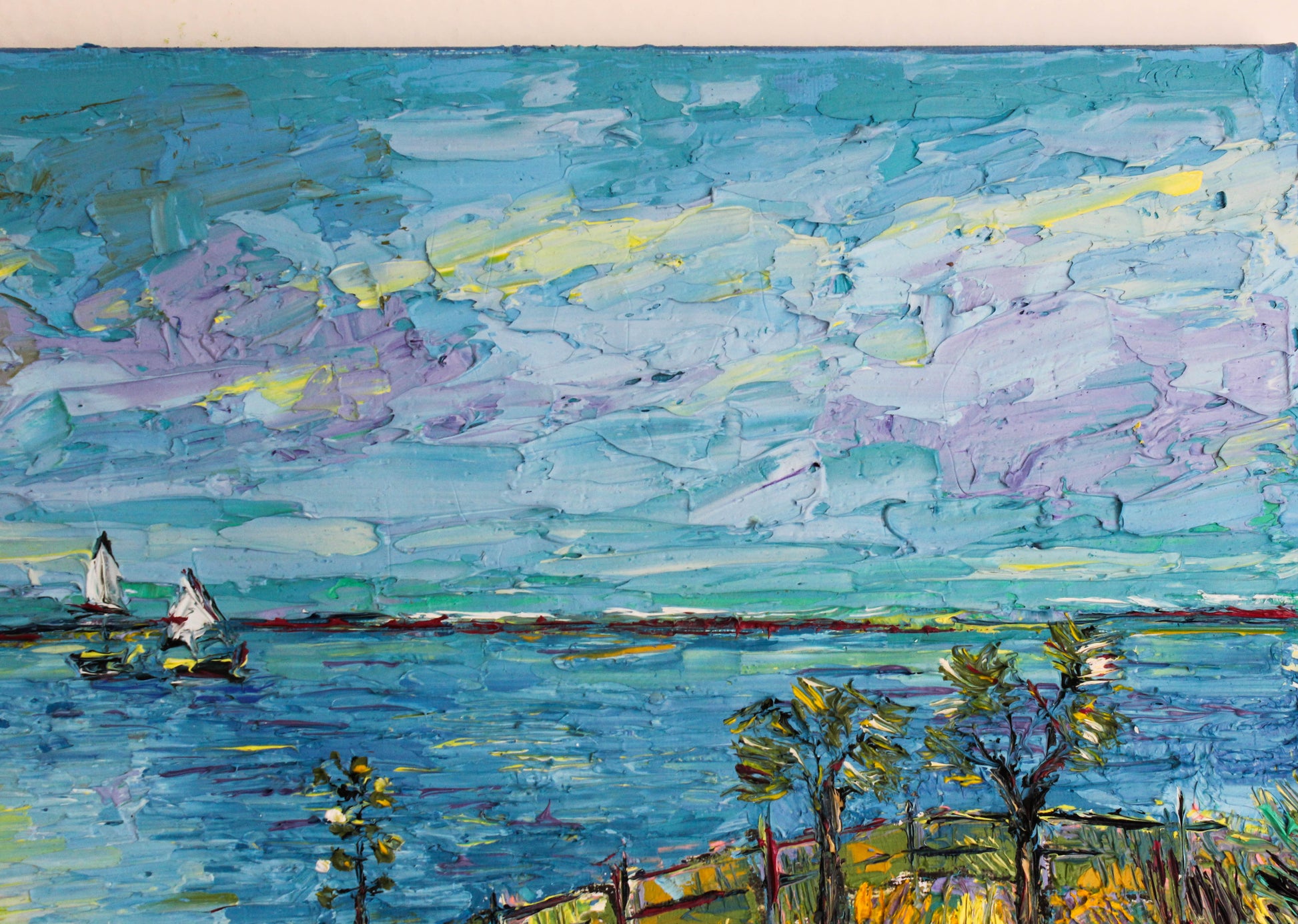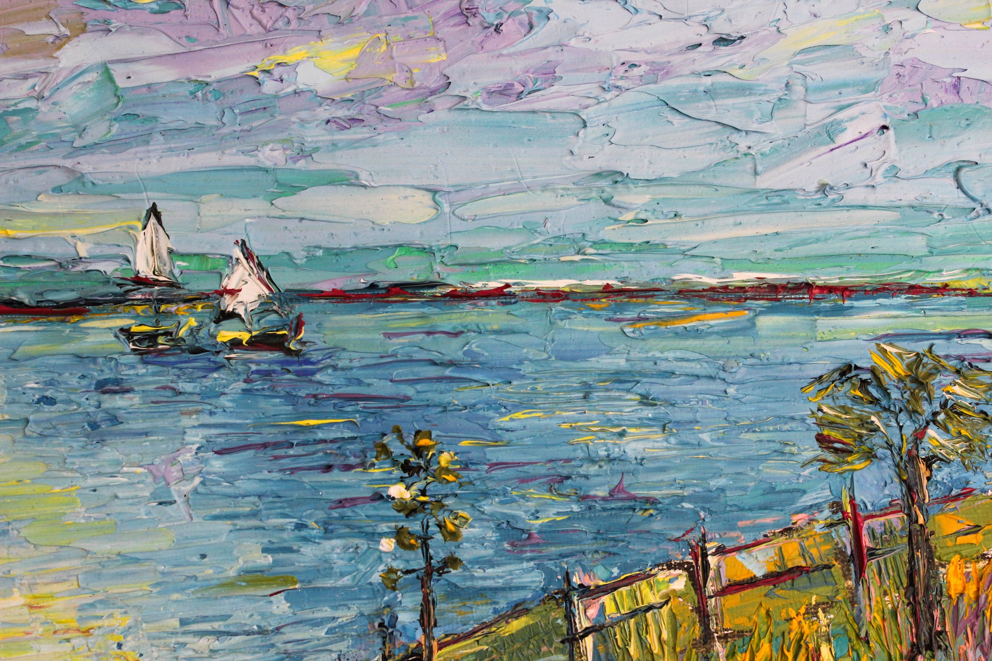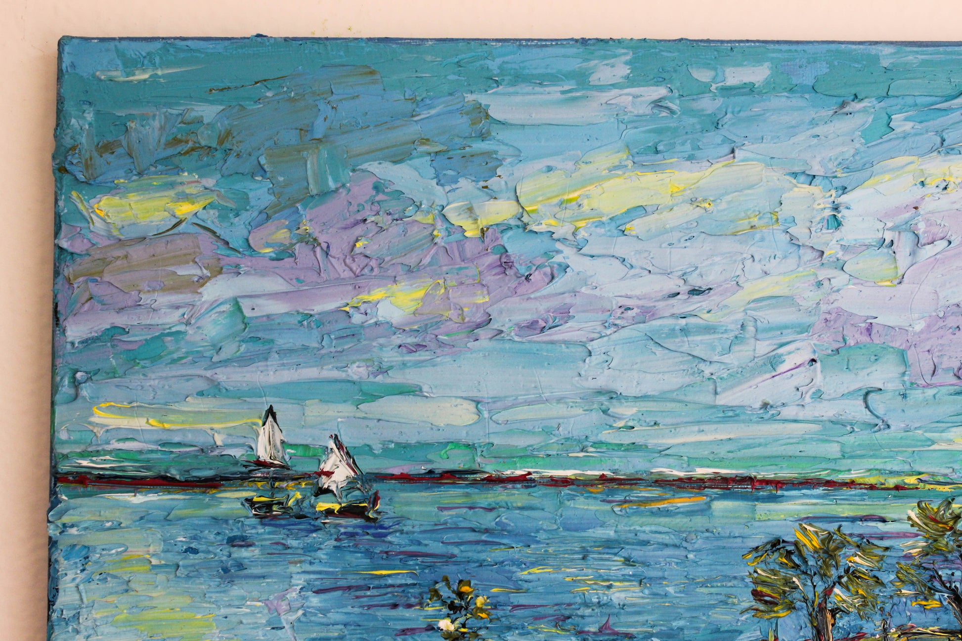 A textured palette knife painting in oil featuring the "Santa Barbara" coast, located in SoCal with a beautiful vivid color combination.