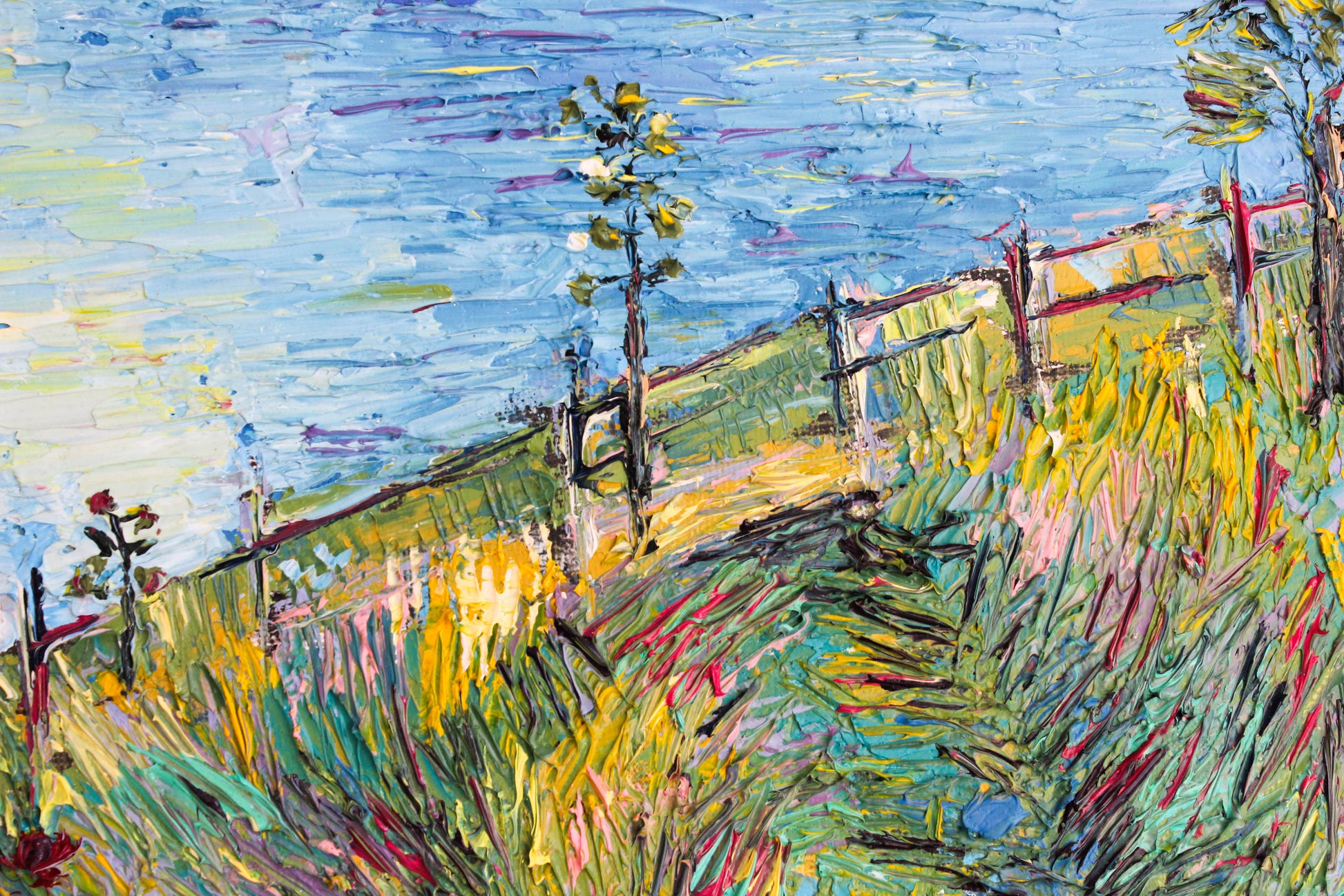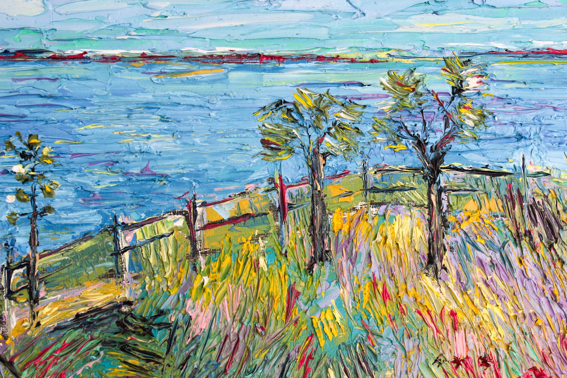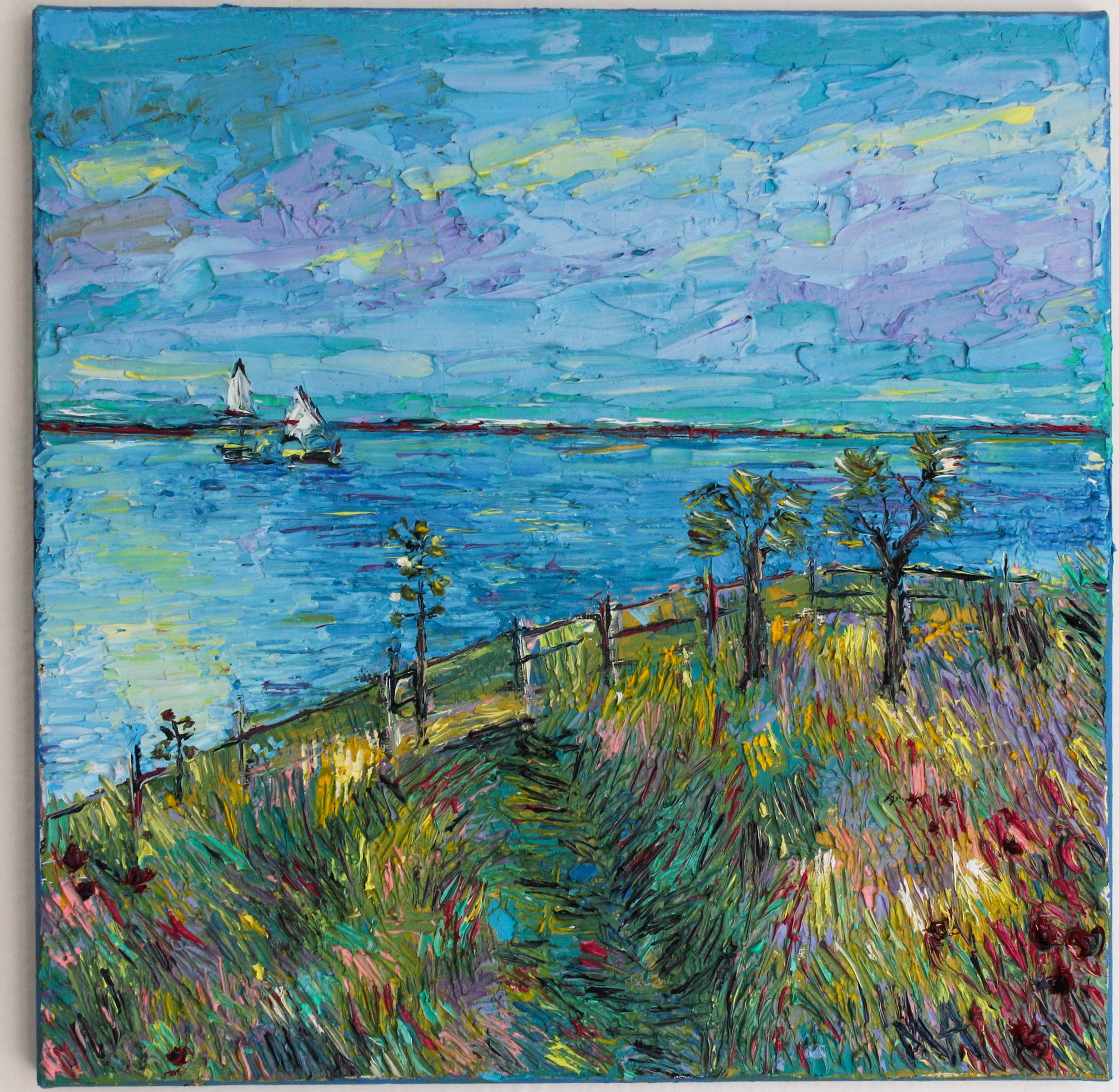 A textured palette knife painting in oil featuring the "Santa Barbara" coast, located in SoCal with a beautiful vivid color combination.