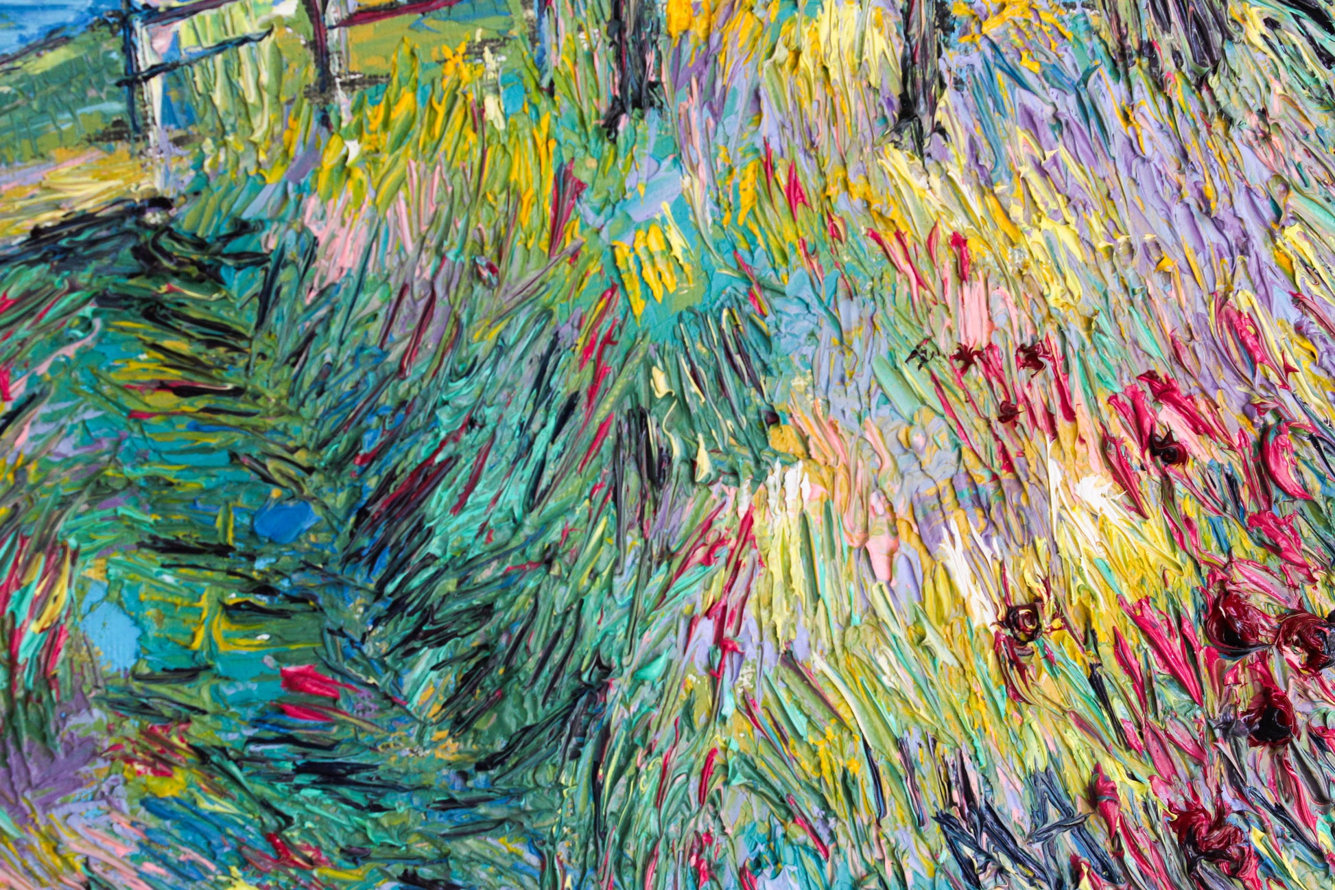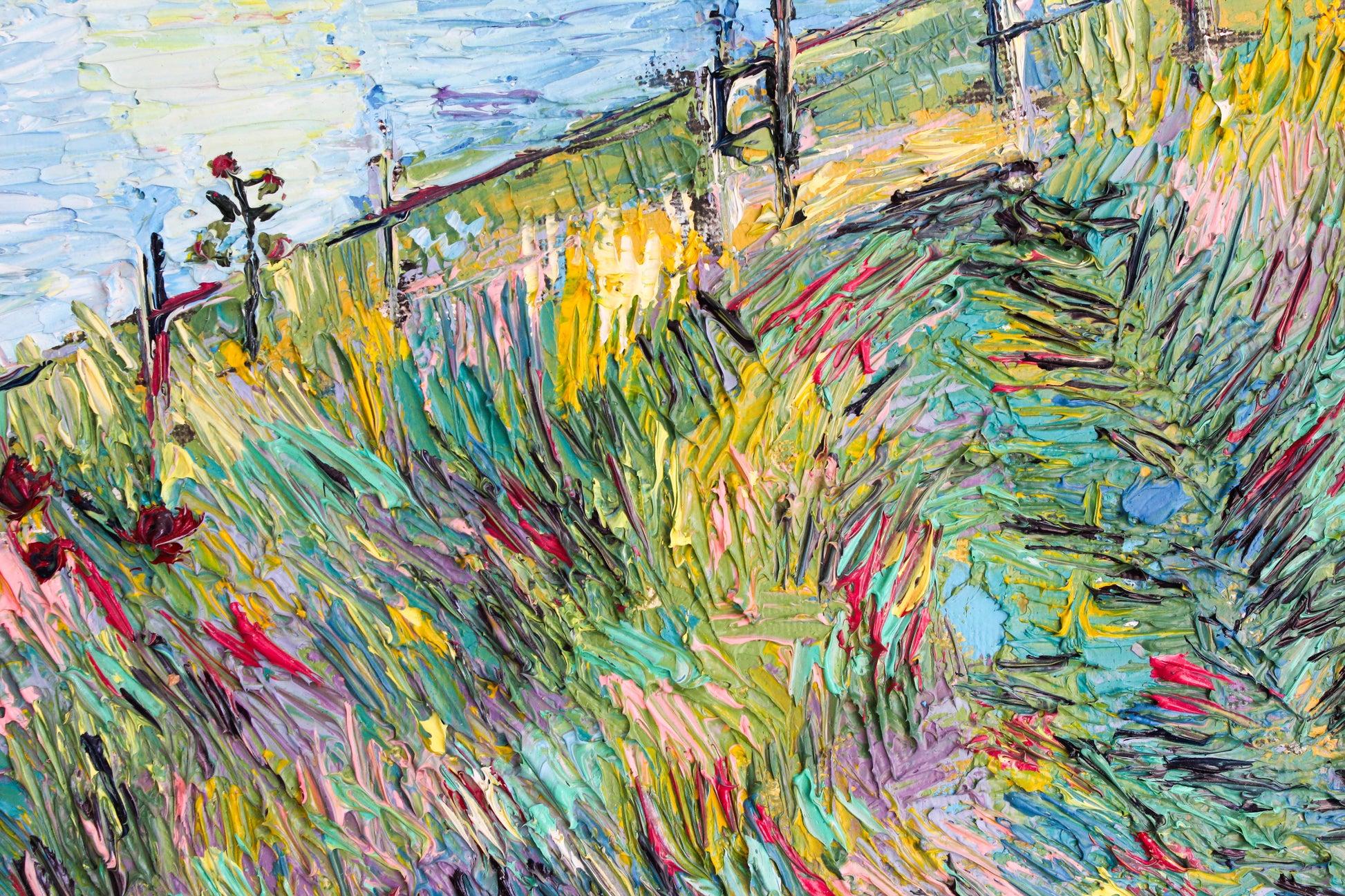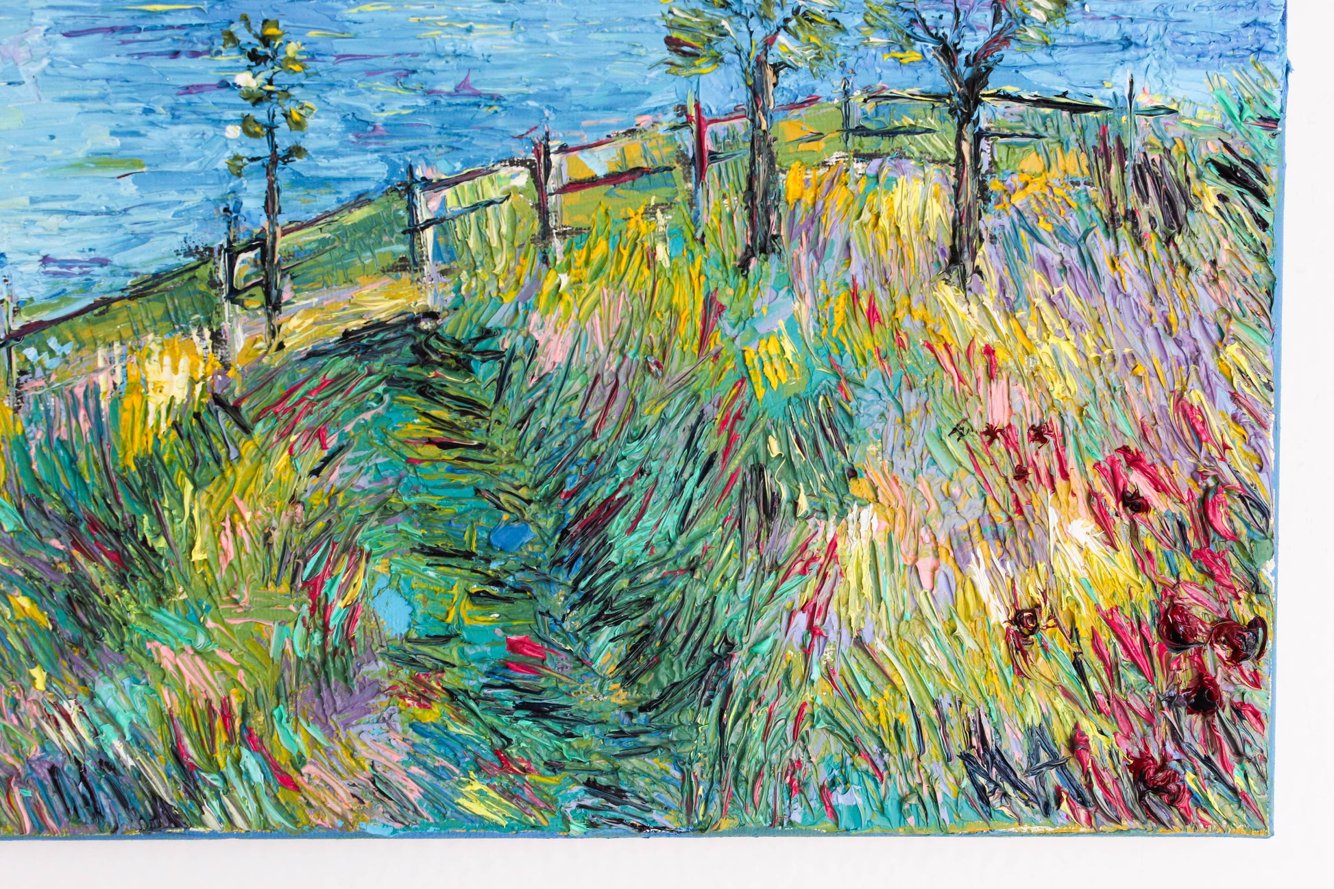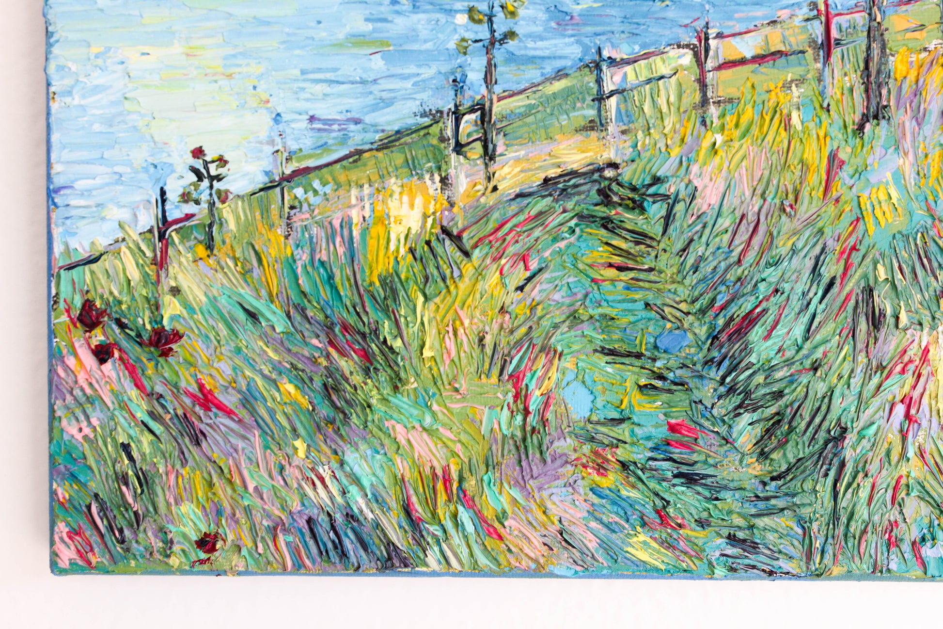 A textured palette knife painting in oil featuring the "Santa Barbara" coast, located in SoCal with a beautiful vivid color combination.