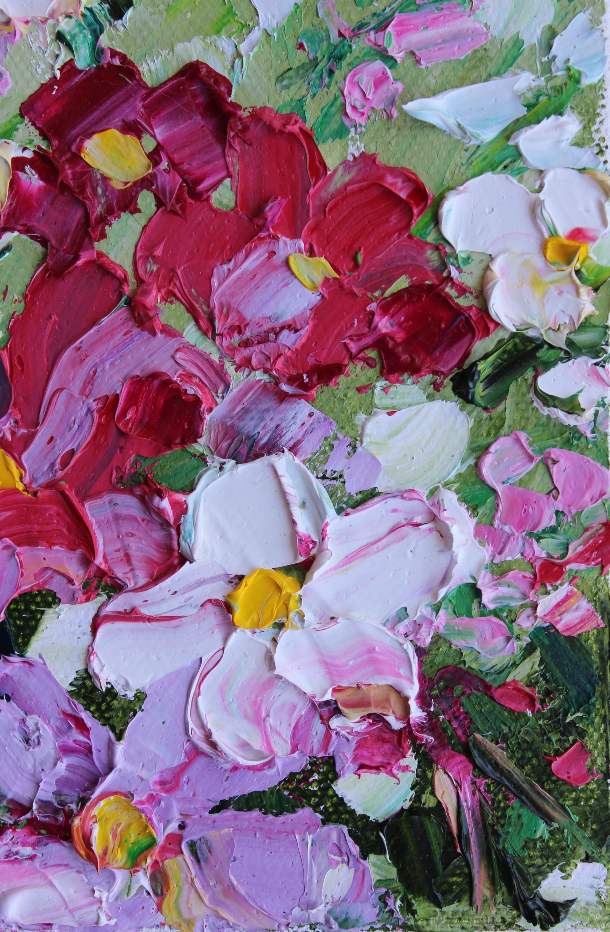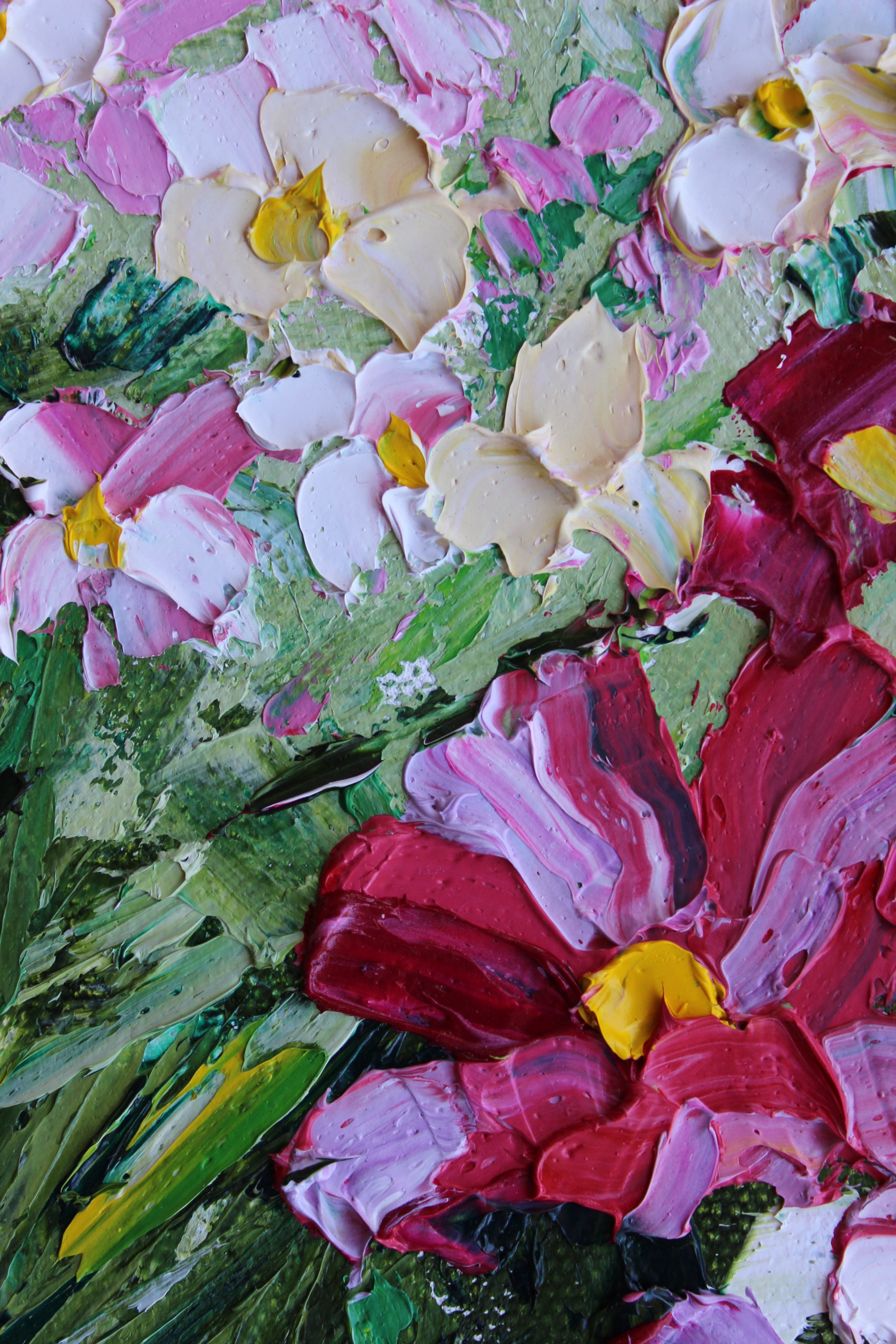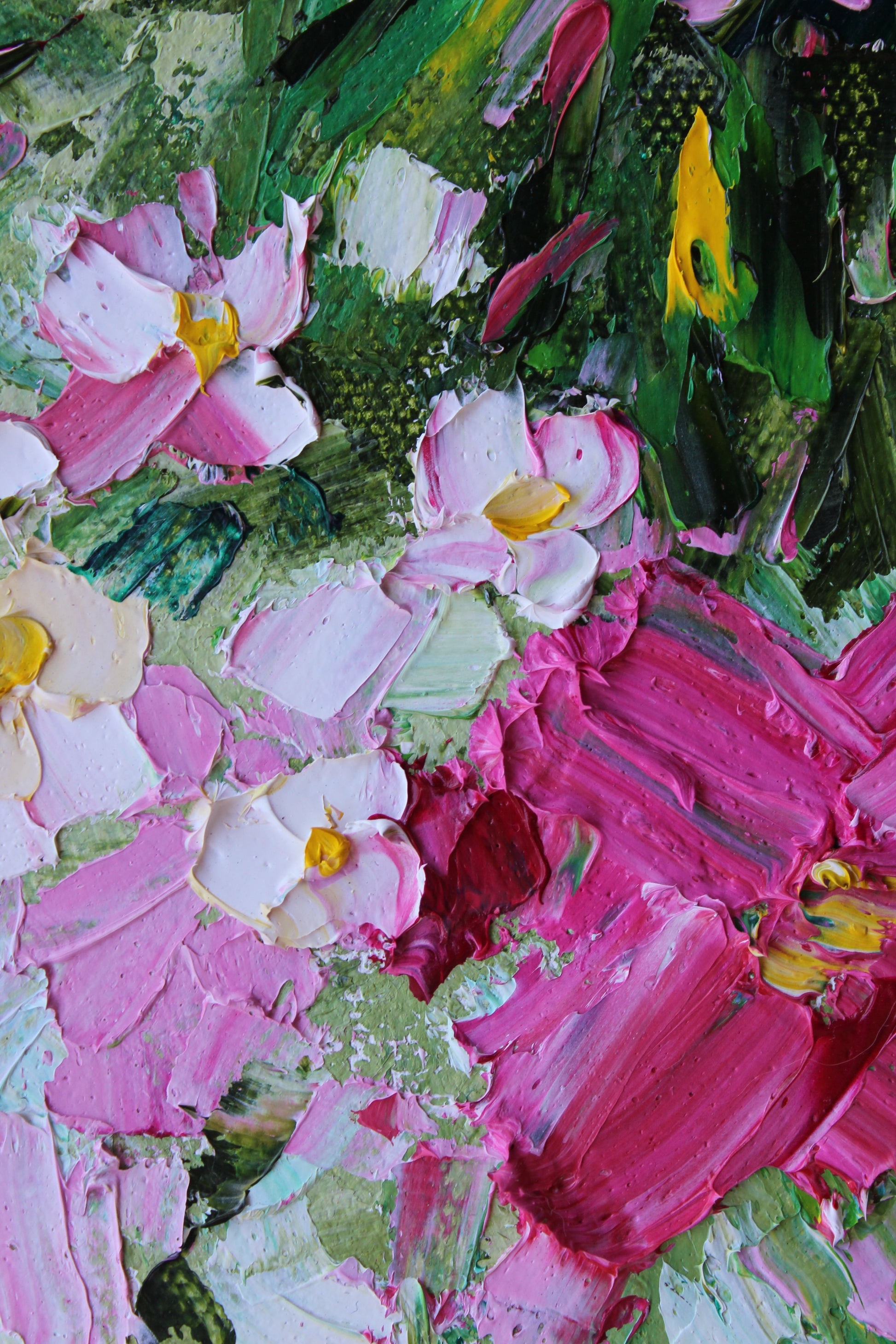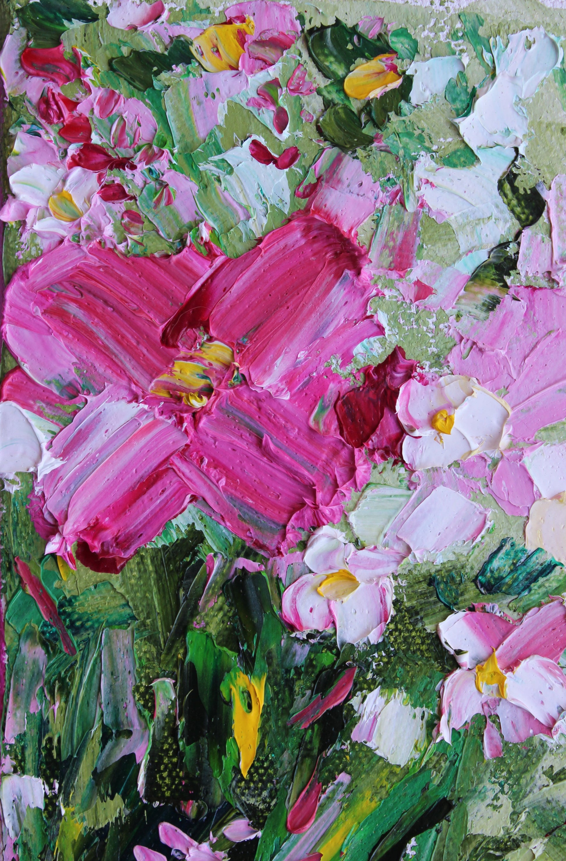 A textured palette knife painting in oil, featuring a bouquet of pink and white flowers. This artwork has several layers of paint creating thick, luxurious textures in a beautiful color combination.