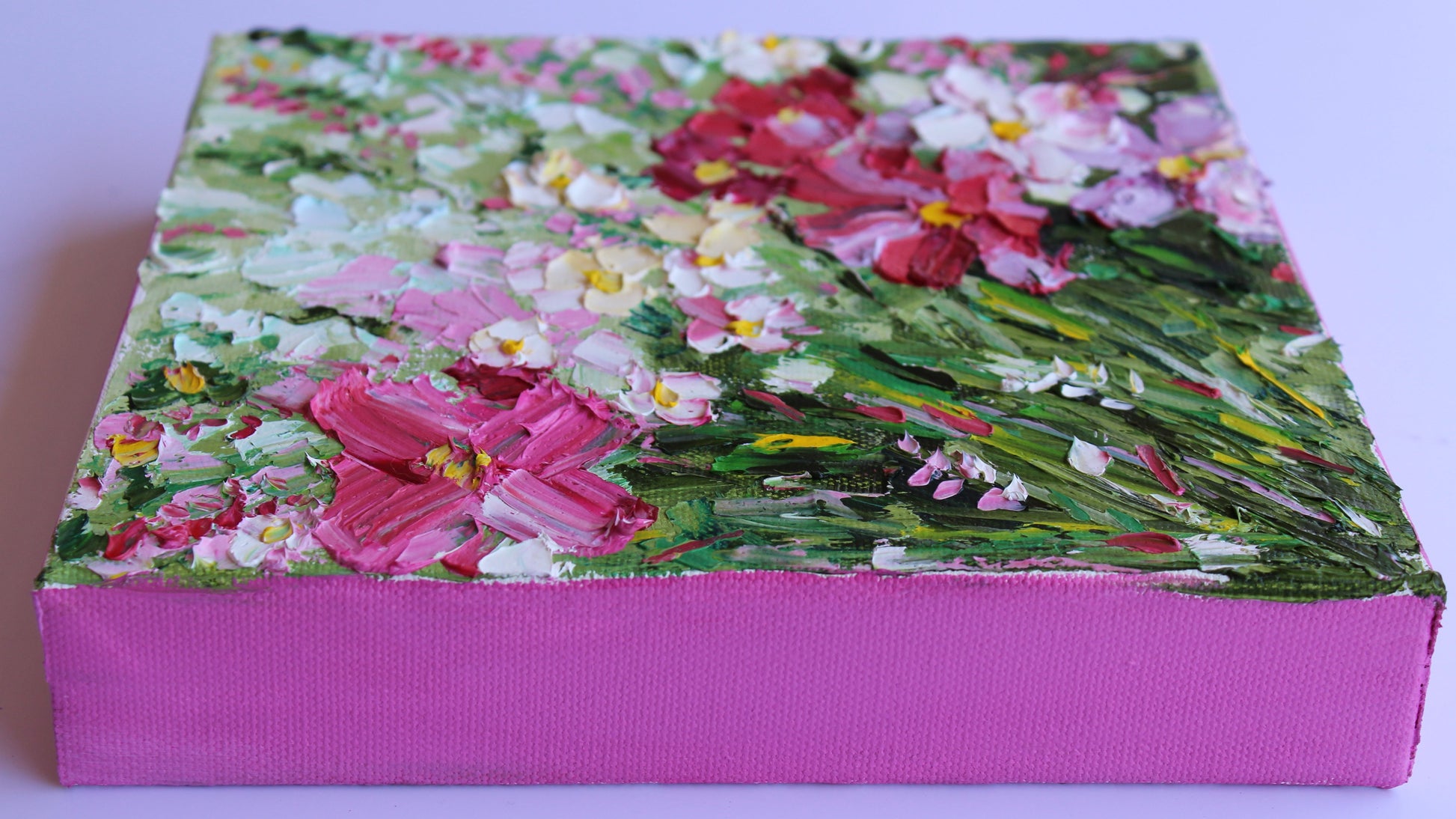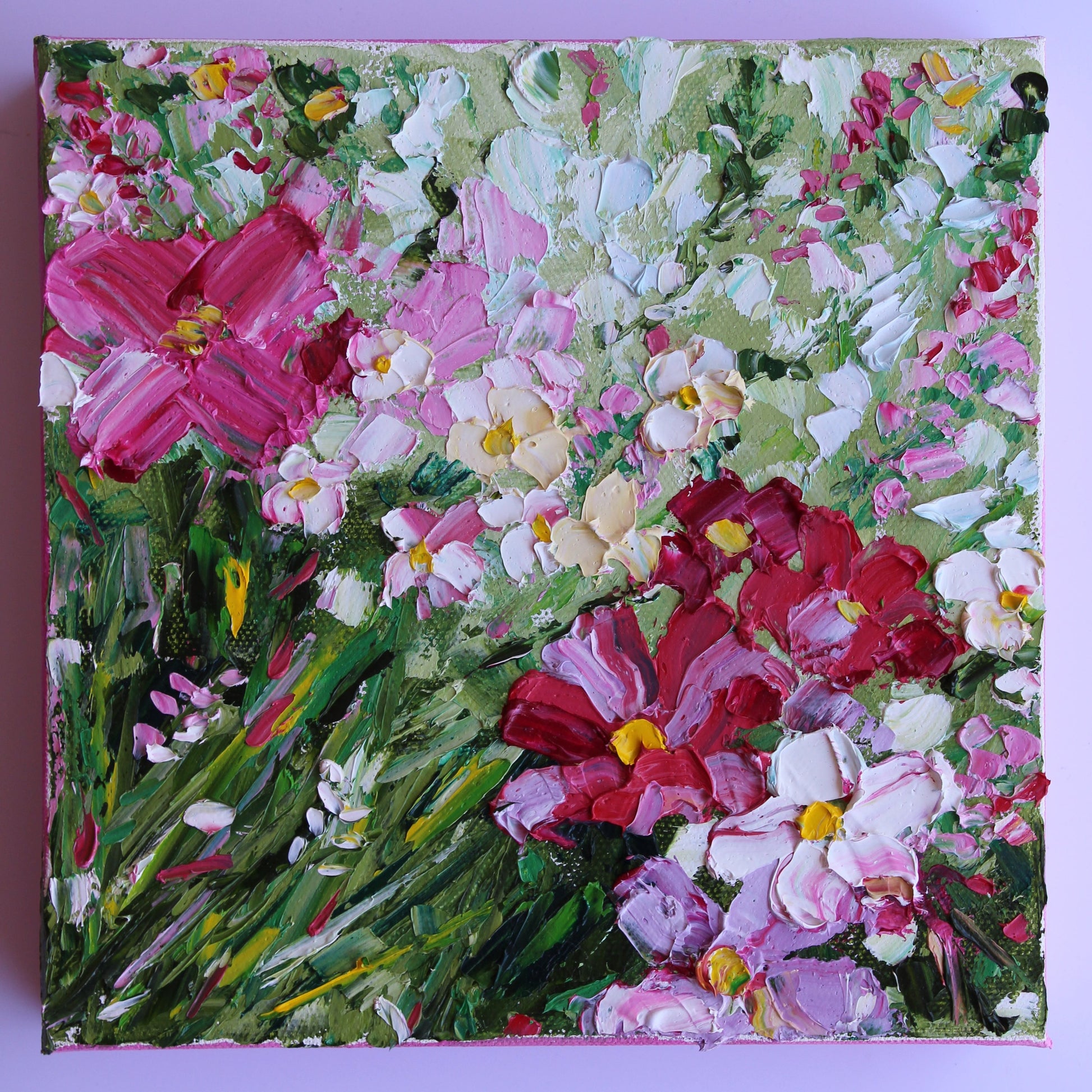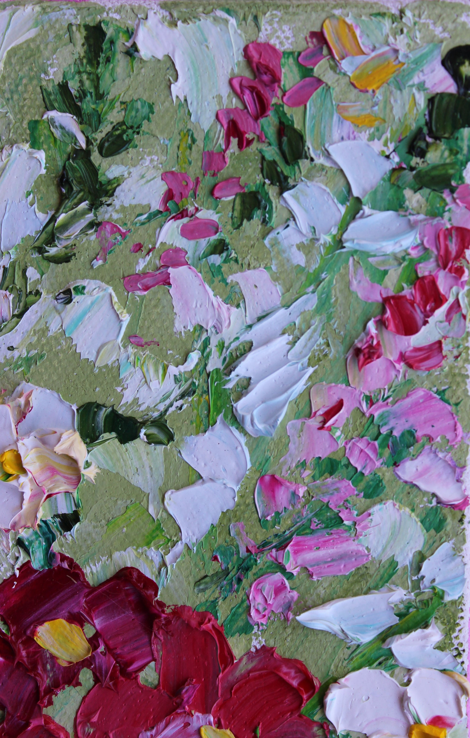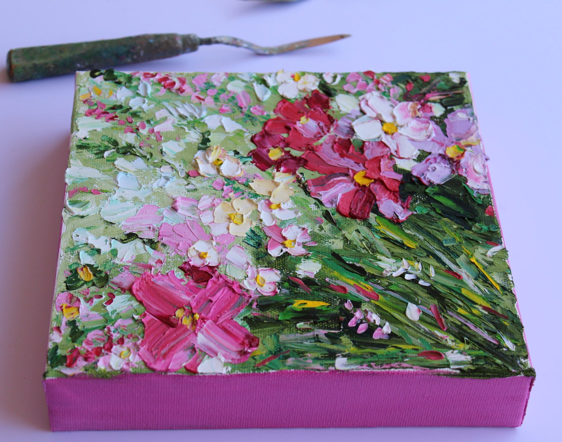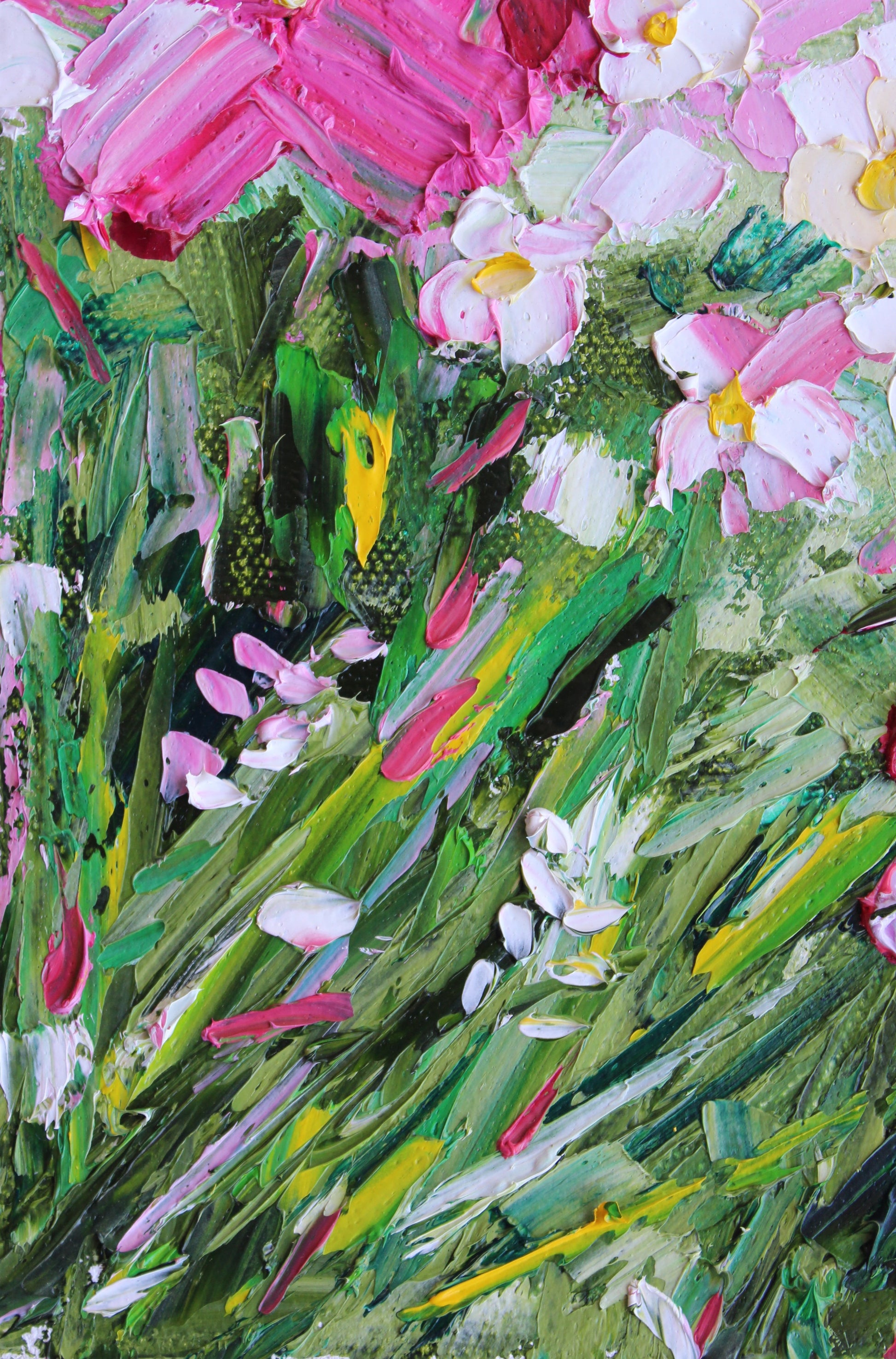 A textured palette knife painting in oil, featuring a bouquet of pink and white flowers. This artwork has several layers of paint creating thick, luxurious textures in a beautiful color combination.