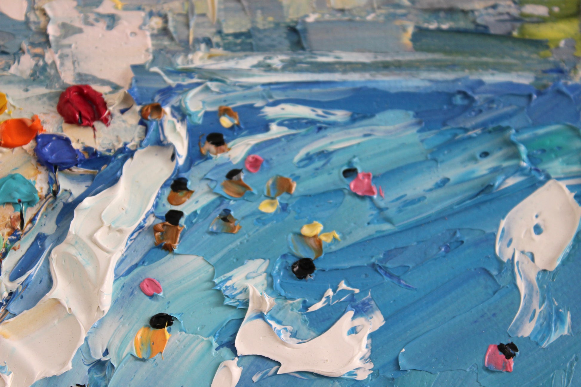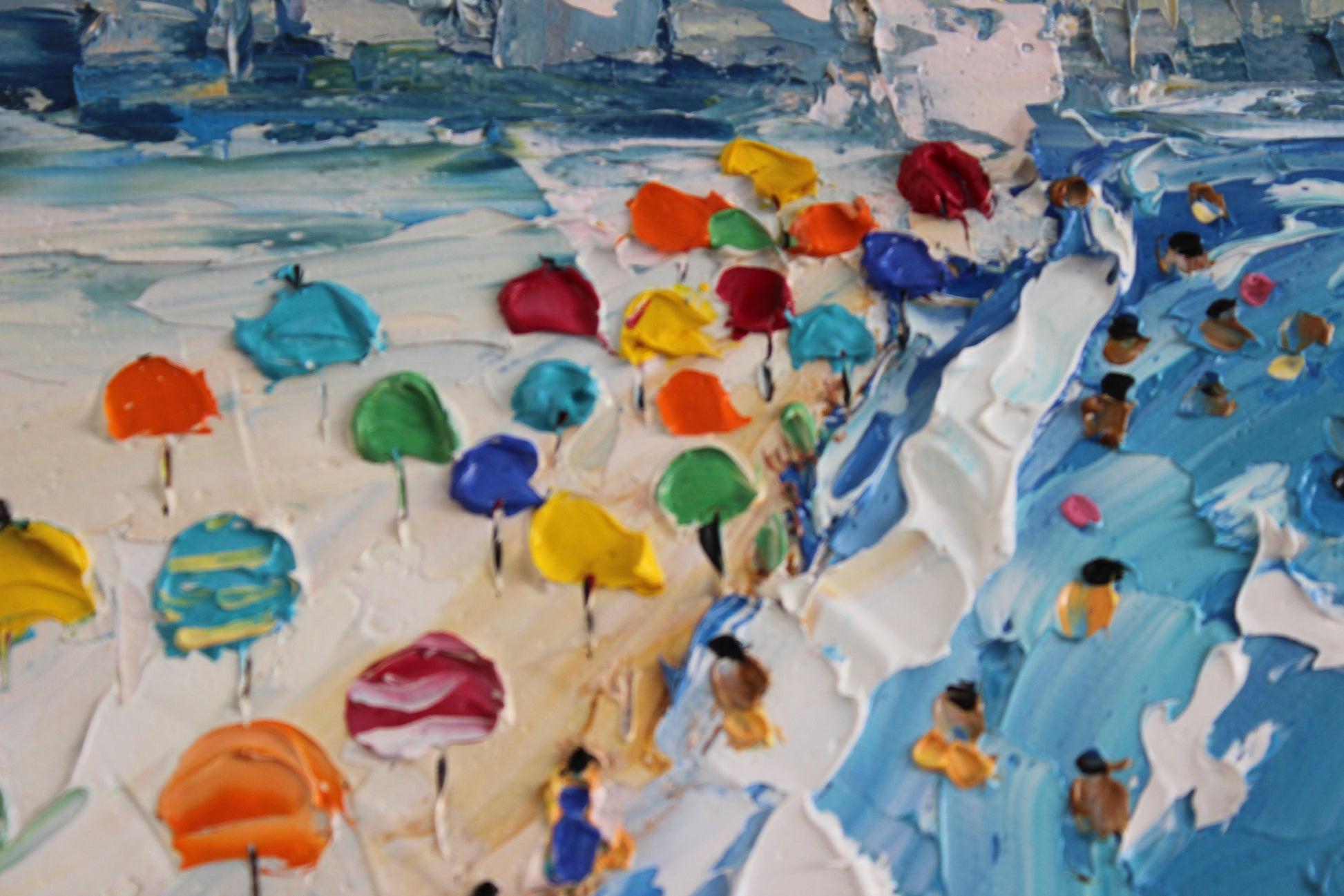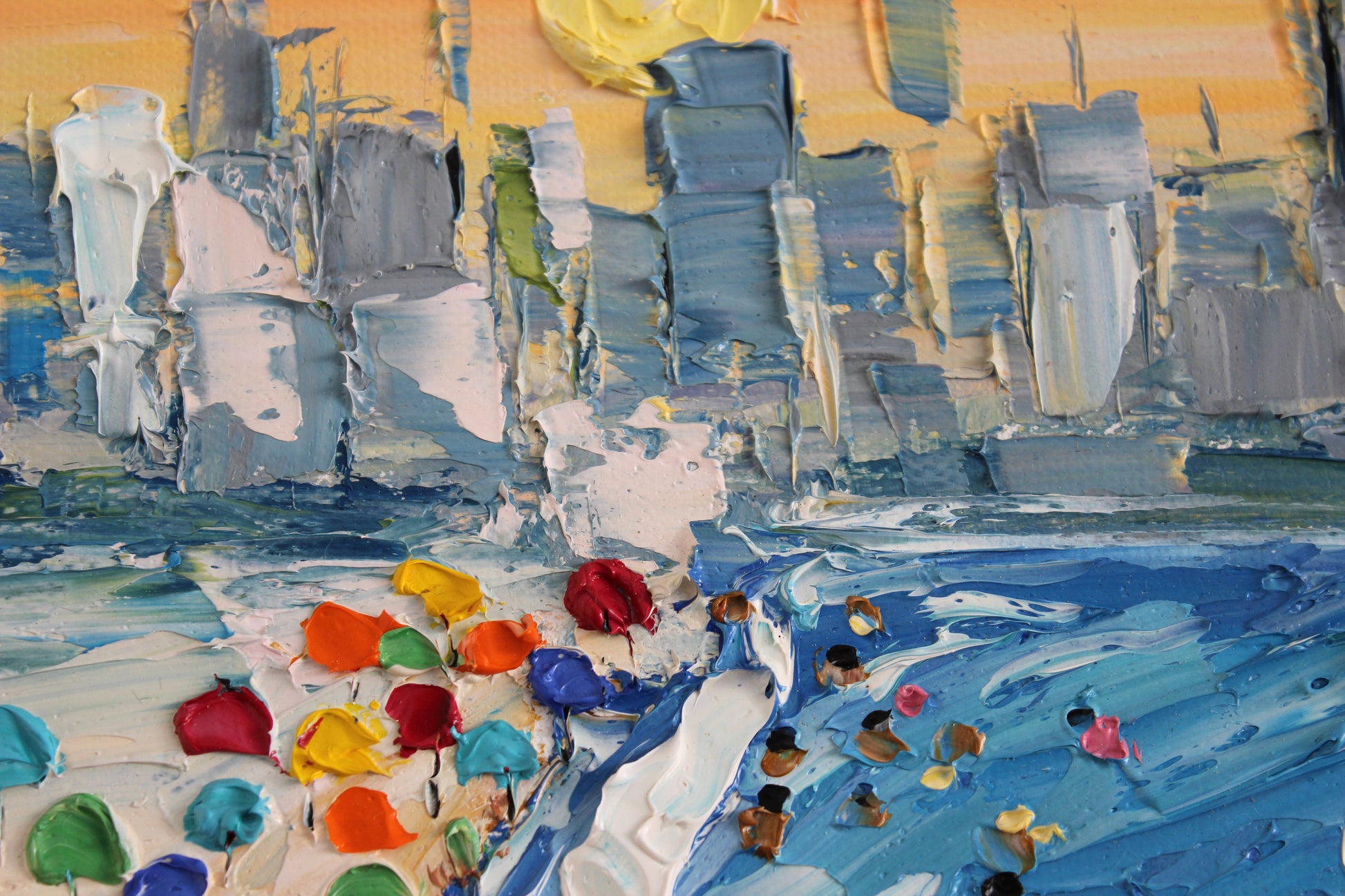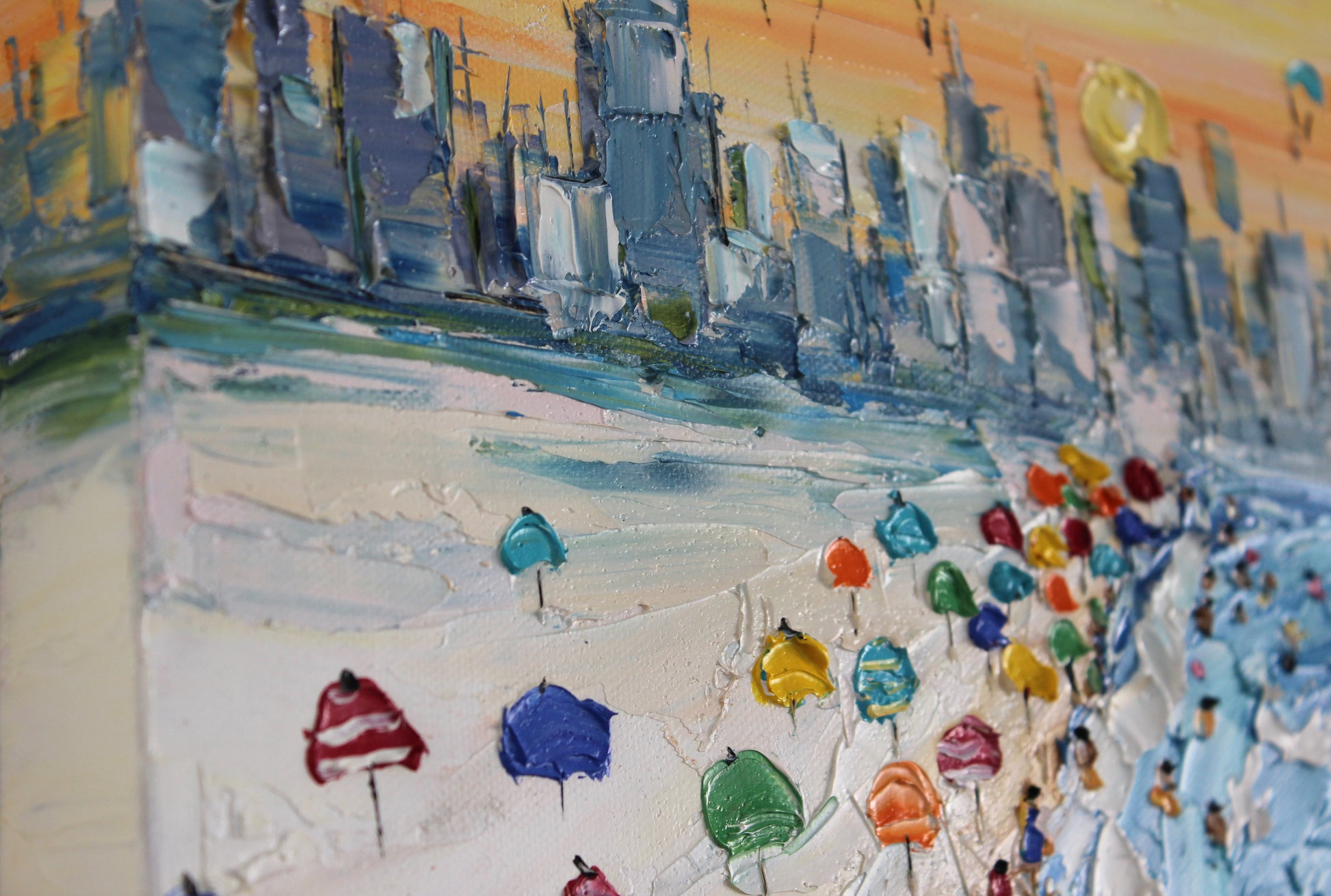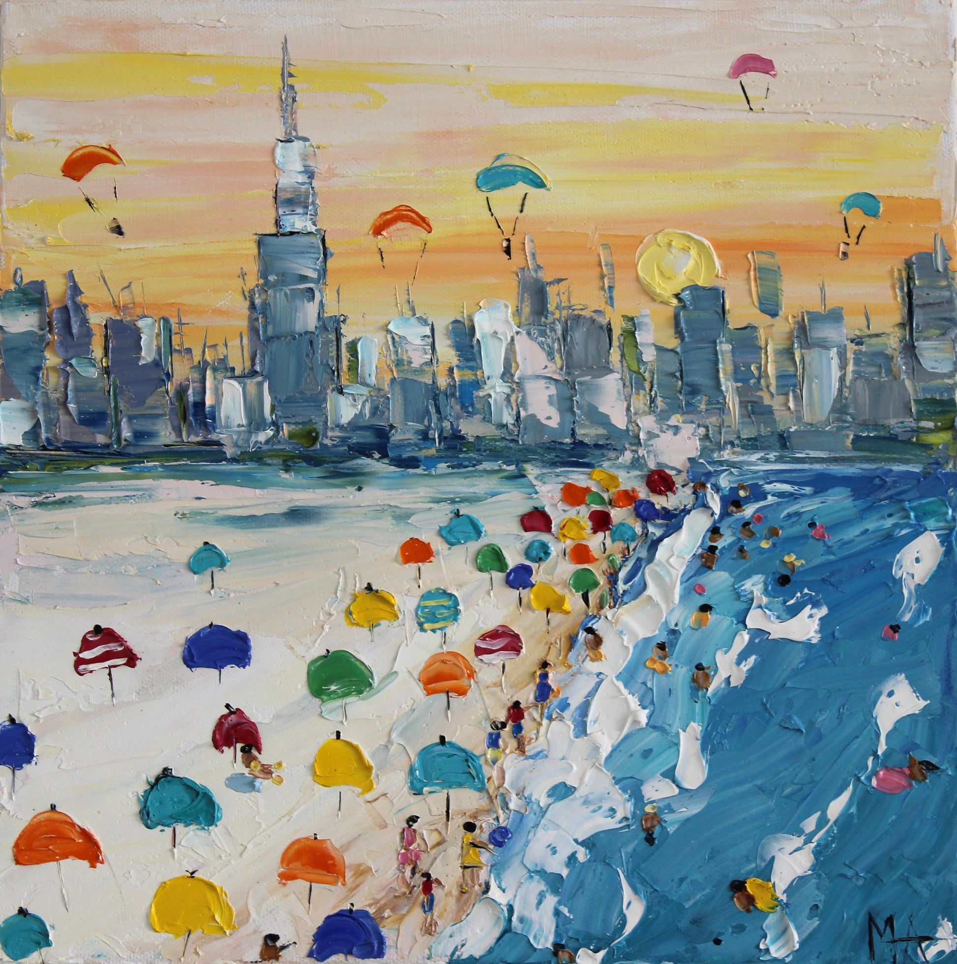 This painting captures a vibrant day on Dubai's beaches, set against the city's iconic skyline with the Burj Khalifa towering above. Colorful umbrellas and beachgoers fill the sandy shore, while parachutes soar in the sky. The palette knife technique adds texture, bringing the lively scene to life and highlighting Dubai's blend of modern cityscape and coastal beauty.