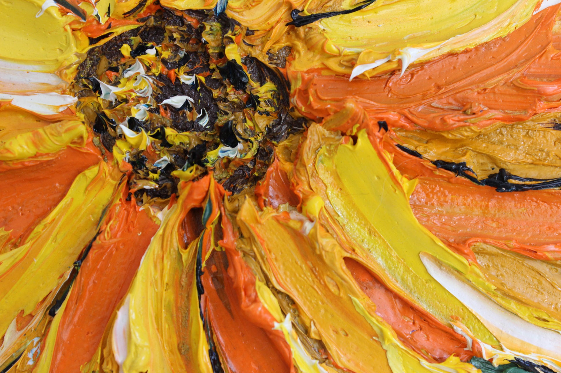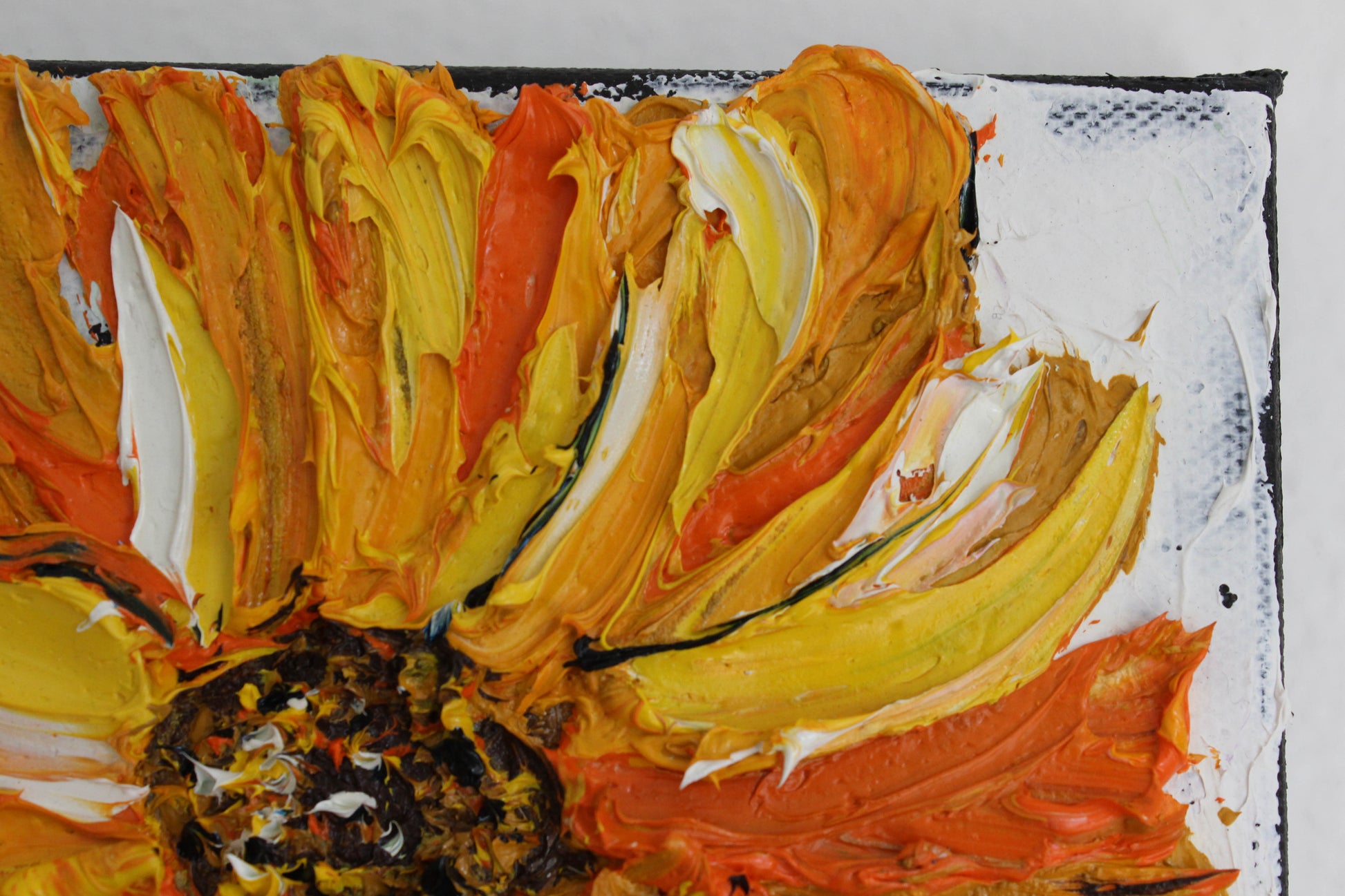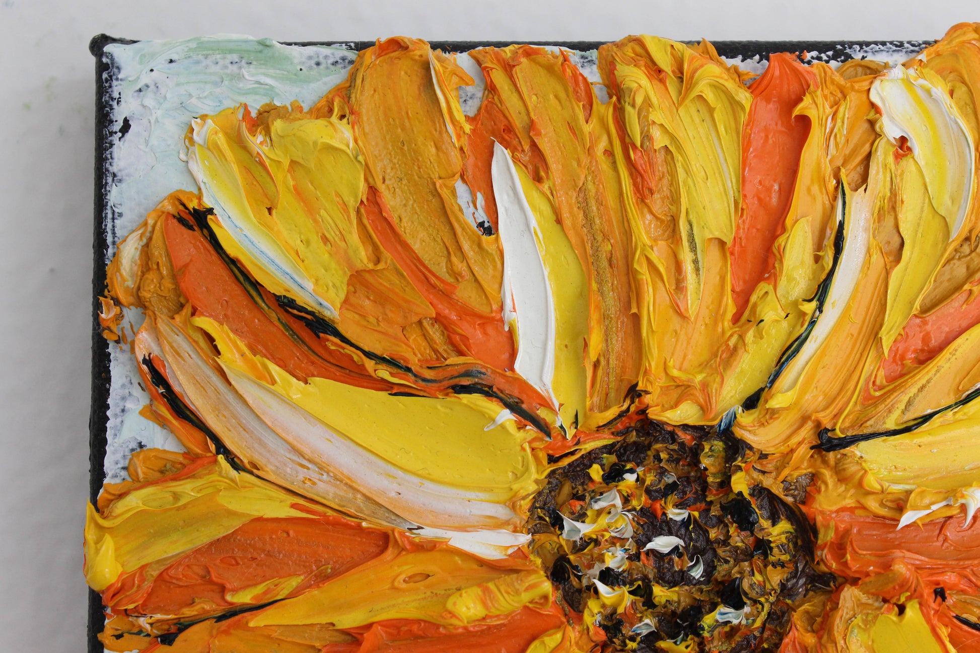A textured deep impasto palette knife painting in oil, featuring a colorful and textured Van Gogh inspired sunflower painting.