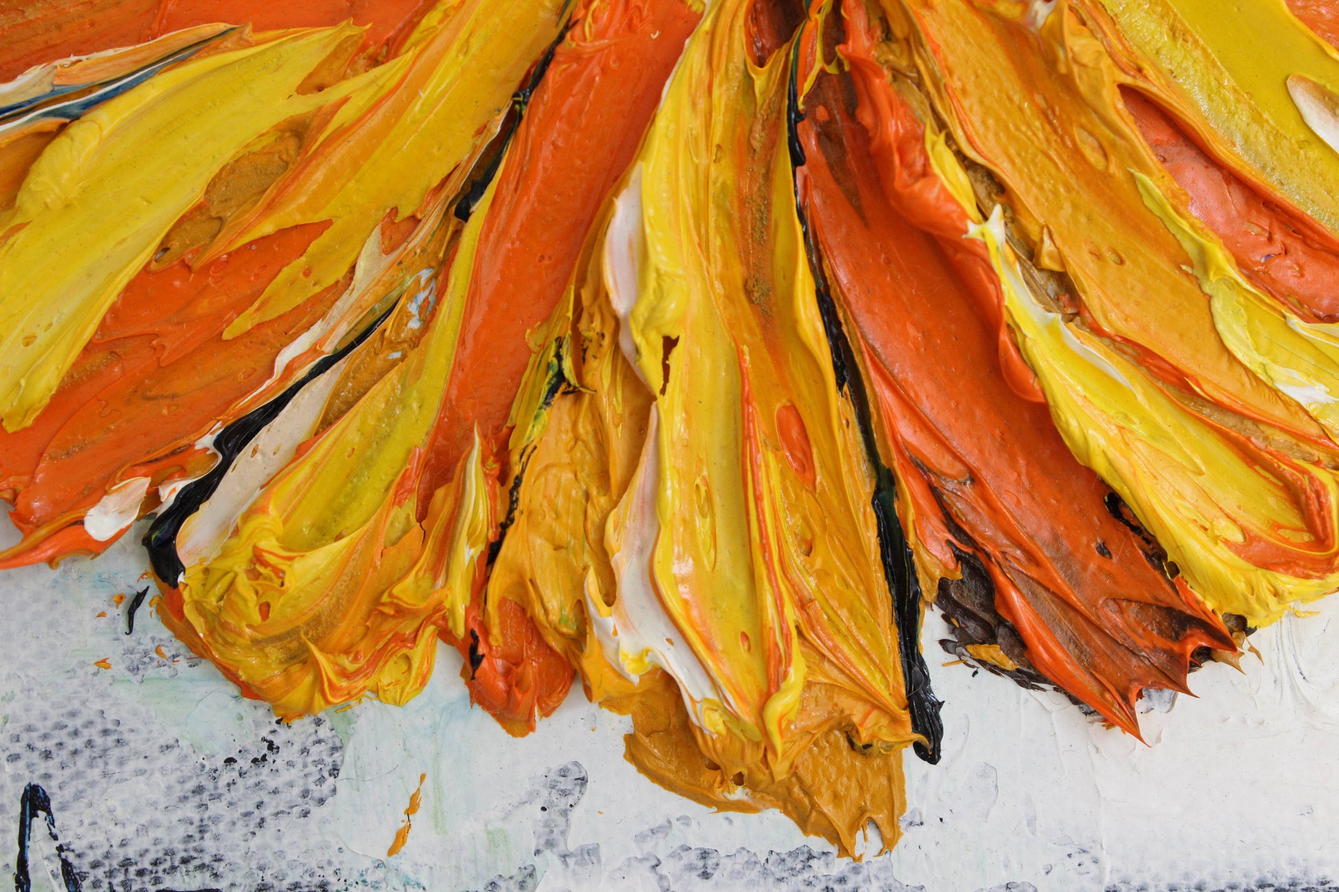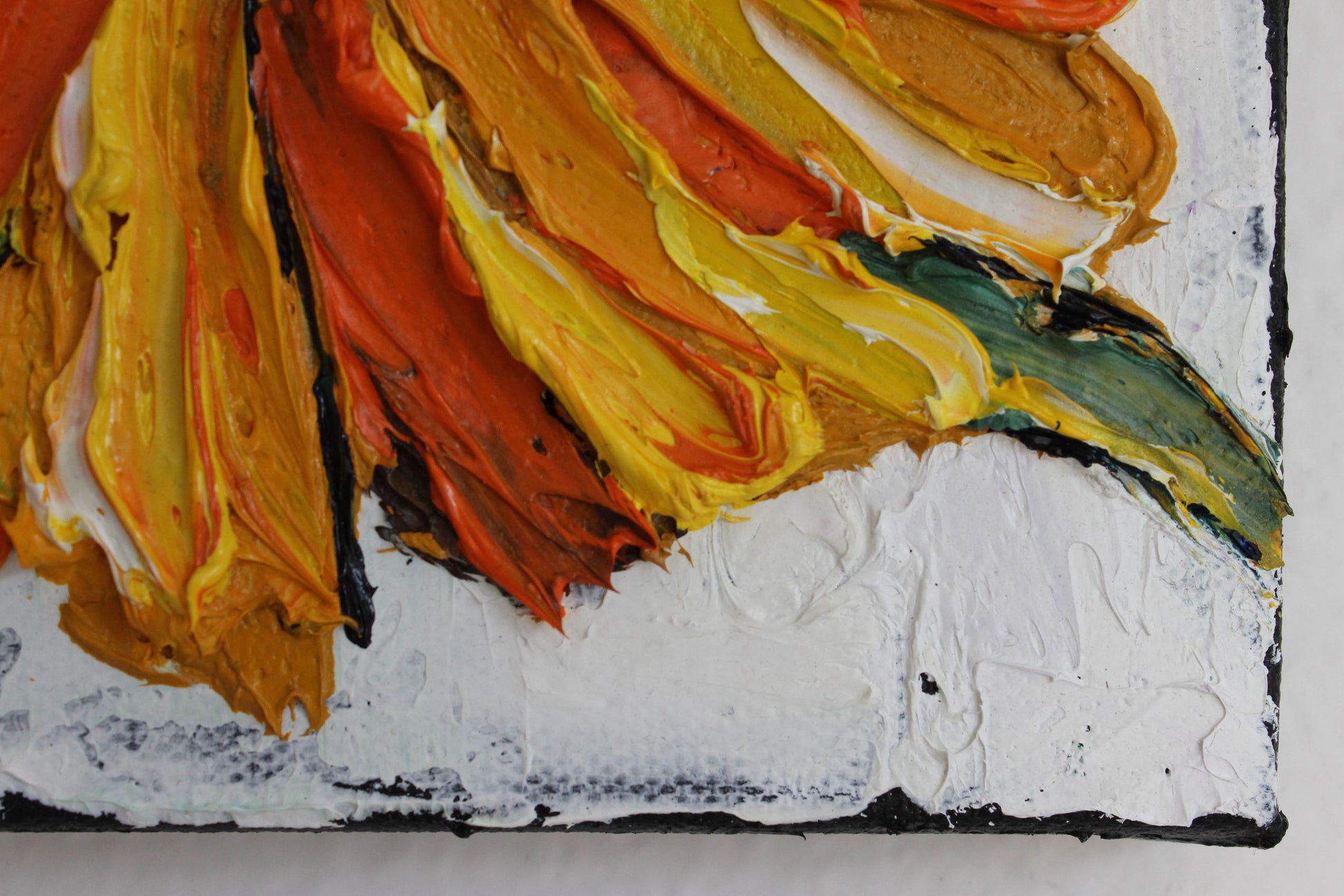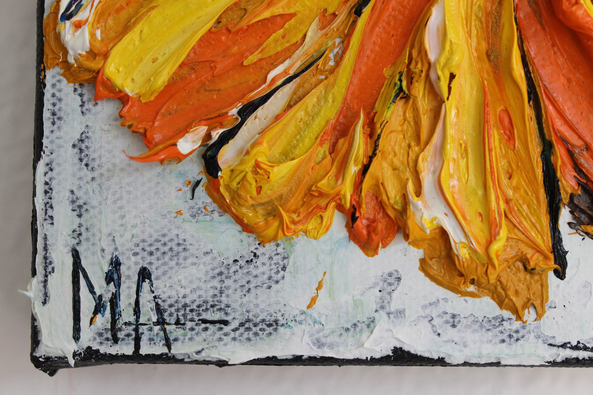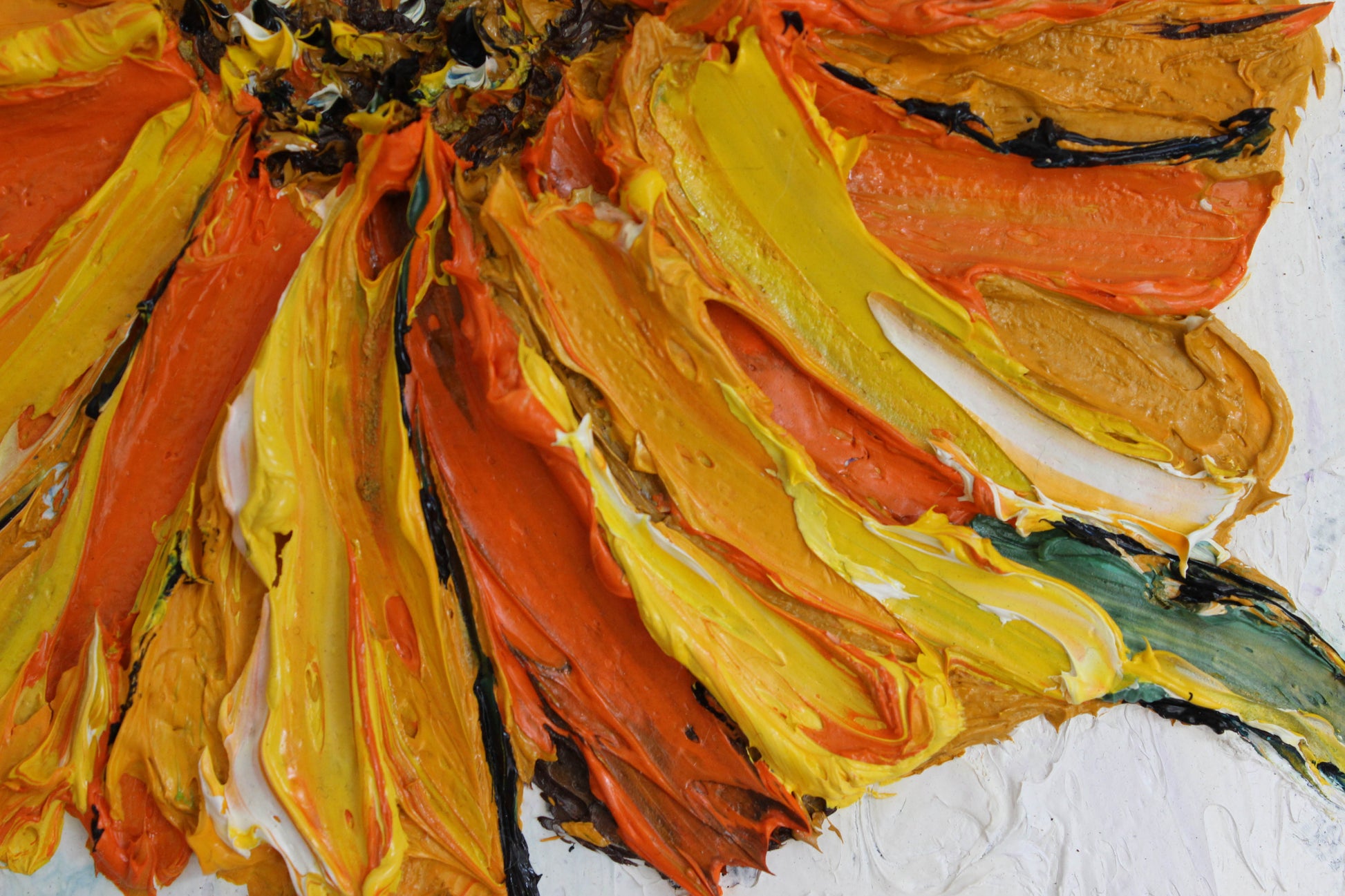 A textured deep impasto palette knife painting in oil, featuring a colorful and textured Van Gogh inspired sunflower painting.