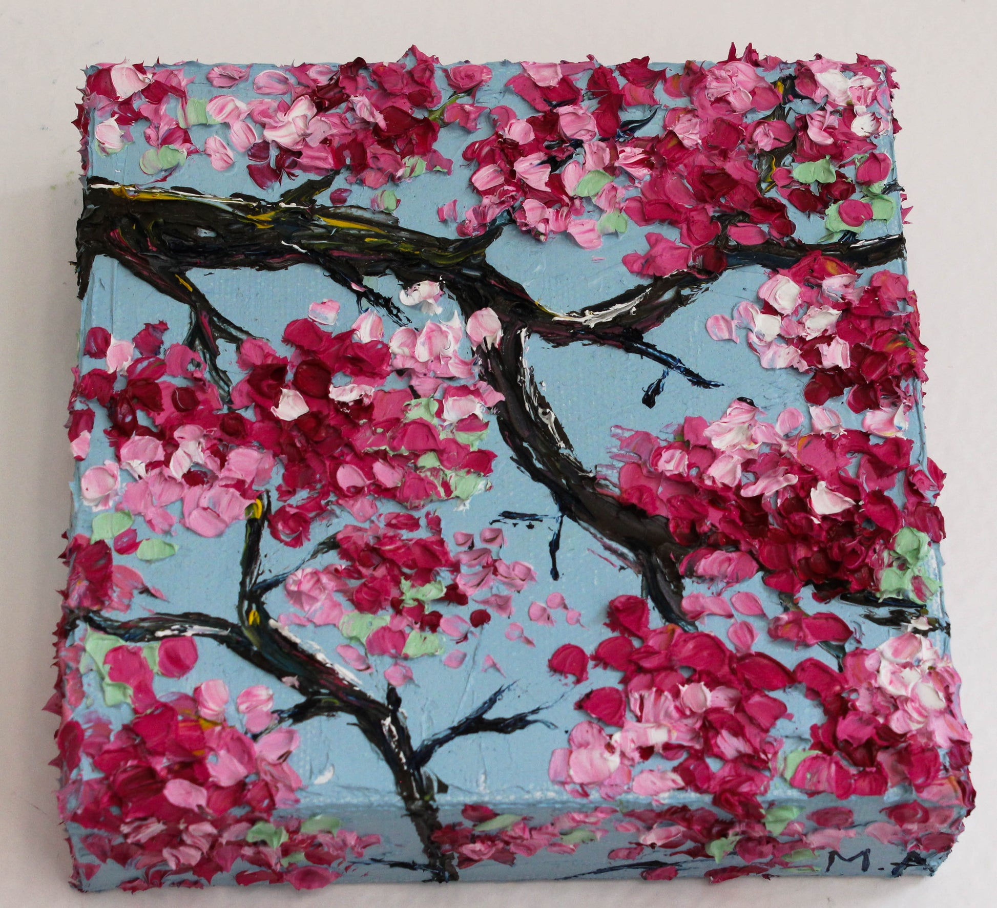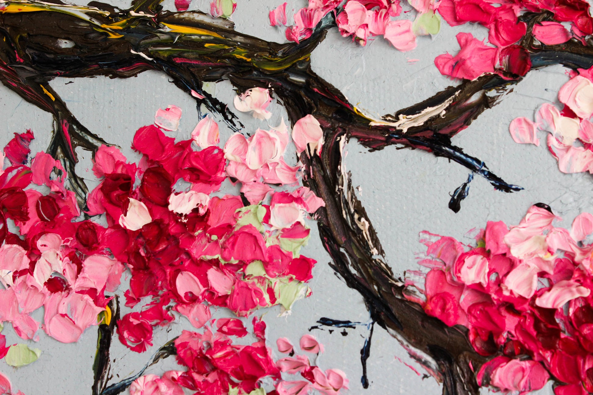 A textured, deep impasto palette knife painting in oil, featuring a colorful Cherry Blossom branch. This piece has several layers of paint creating thick, luxurious textures in a beautiful color combination.