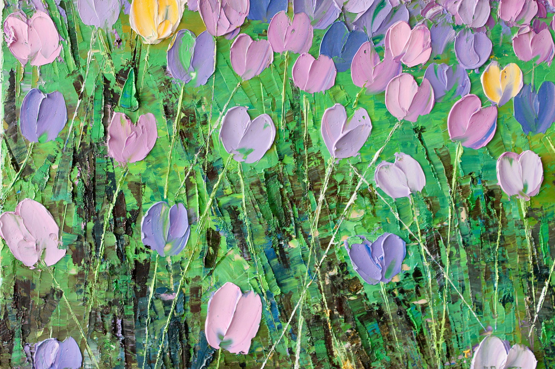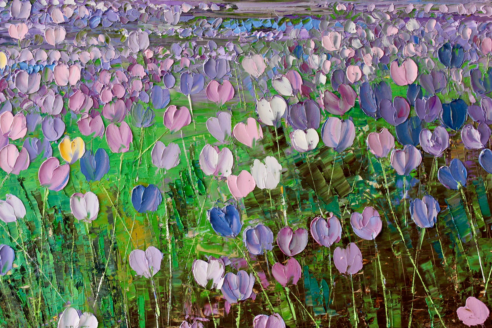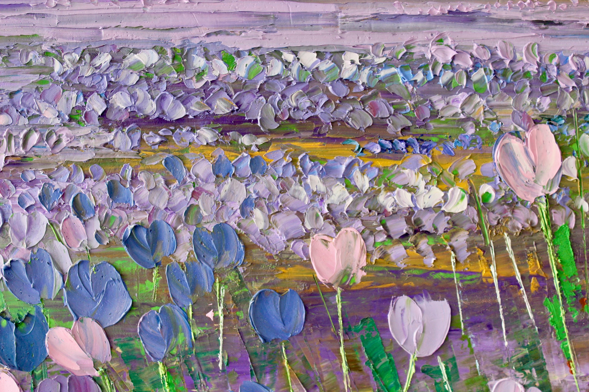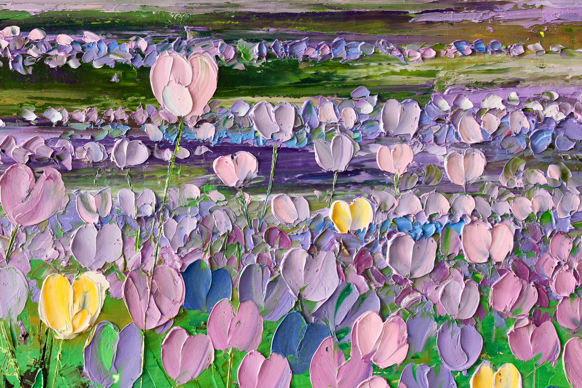 An original and unique high textured palette knife oil painting, featuring a beautiful landscape inspired by the fascinating tulip fields in SoCal. This piece has several layers of paint, creating thick luxurious textures in a beautiful, vivid color combination.