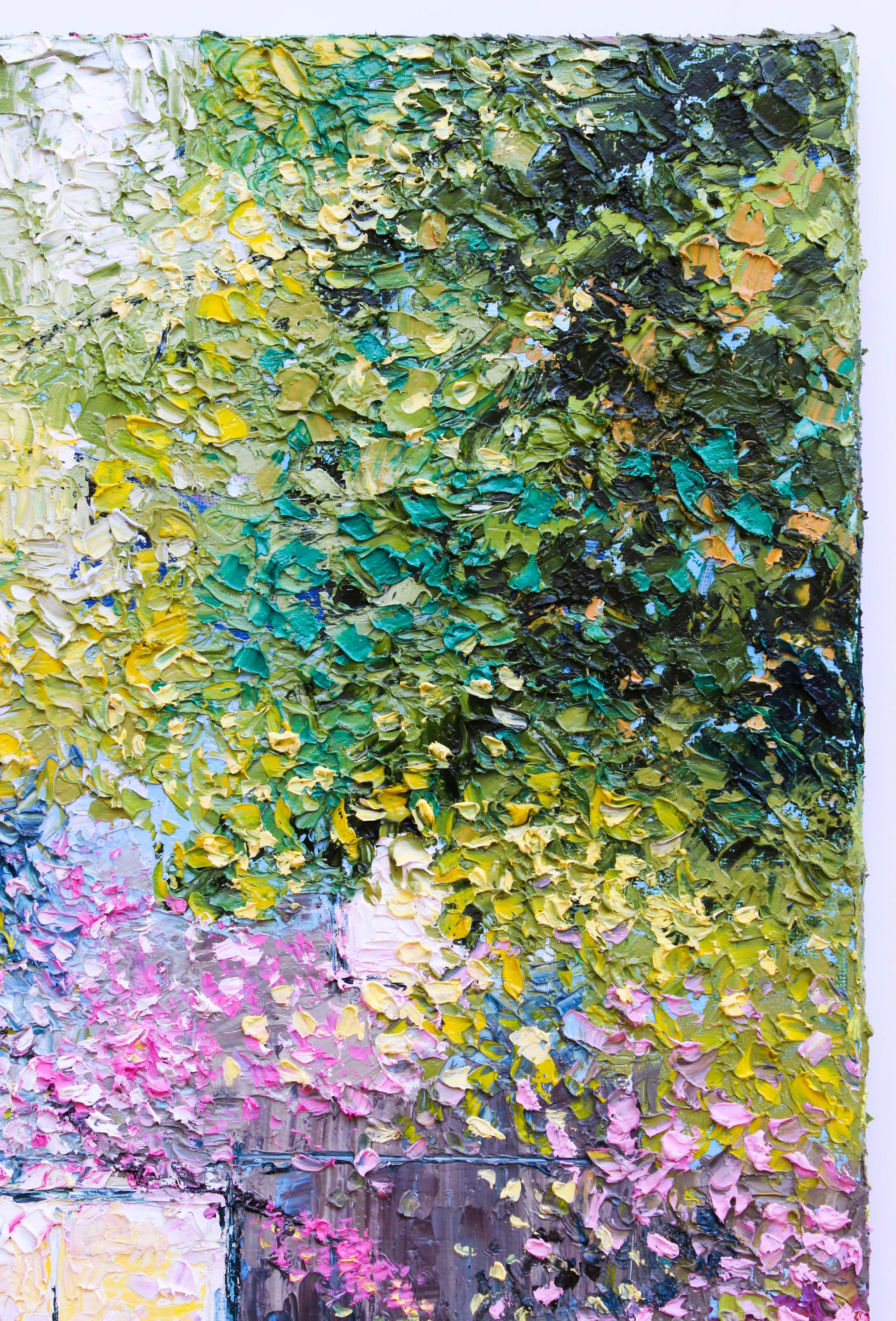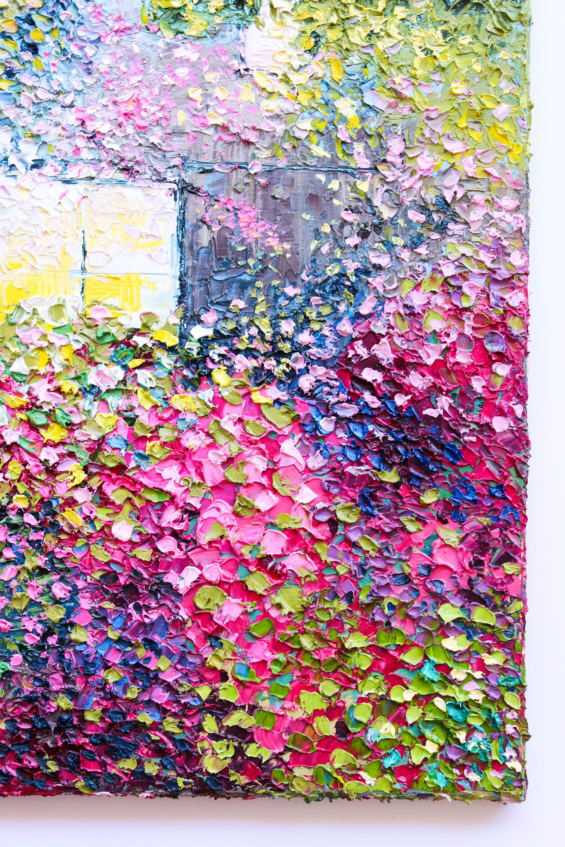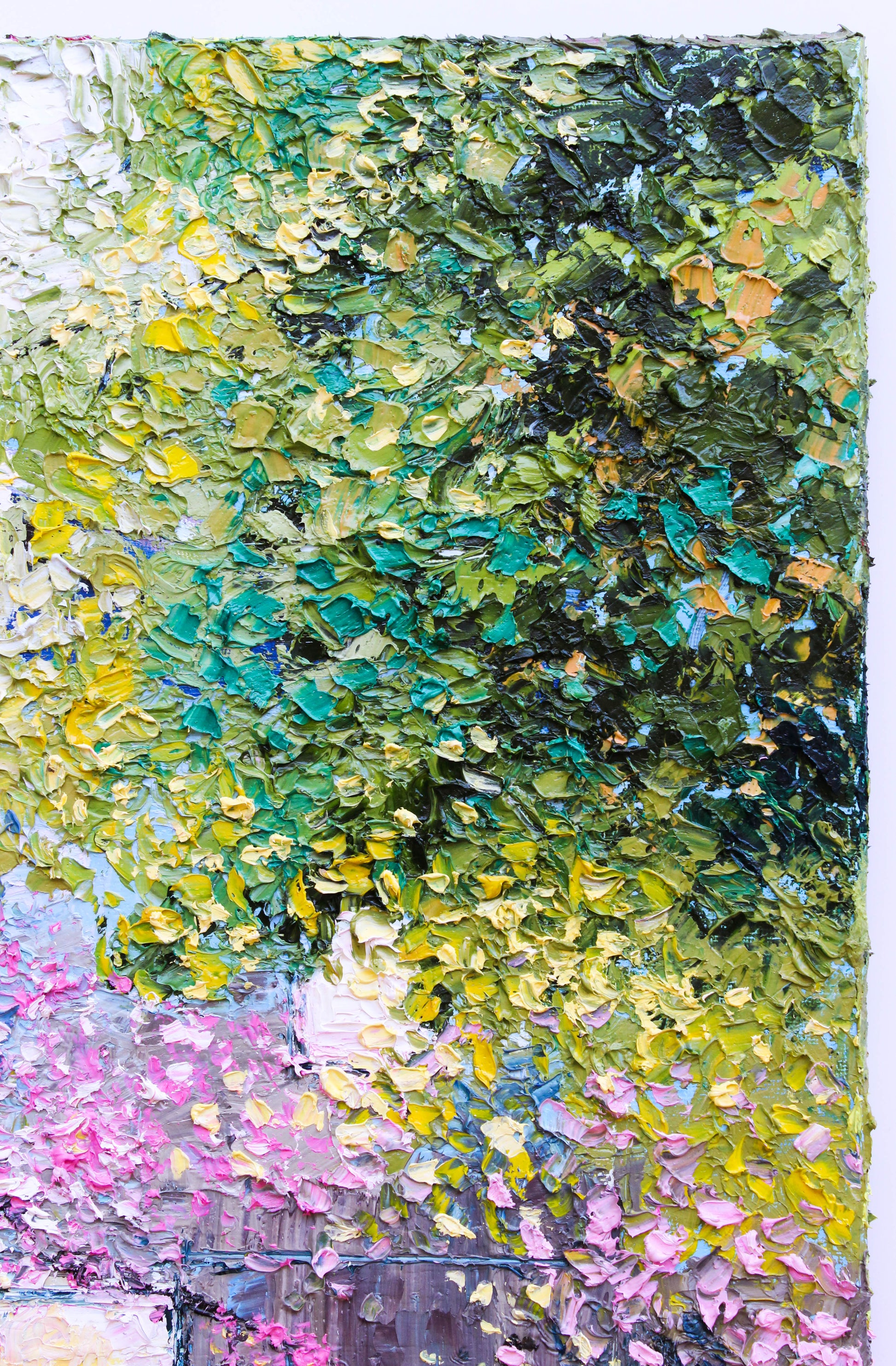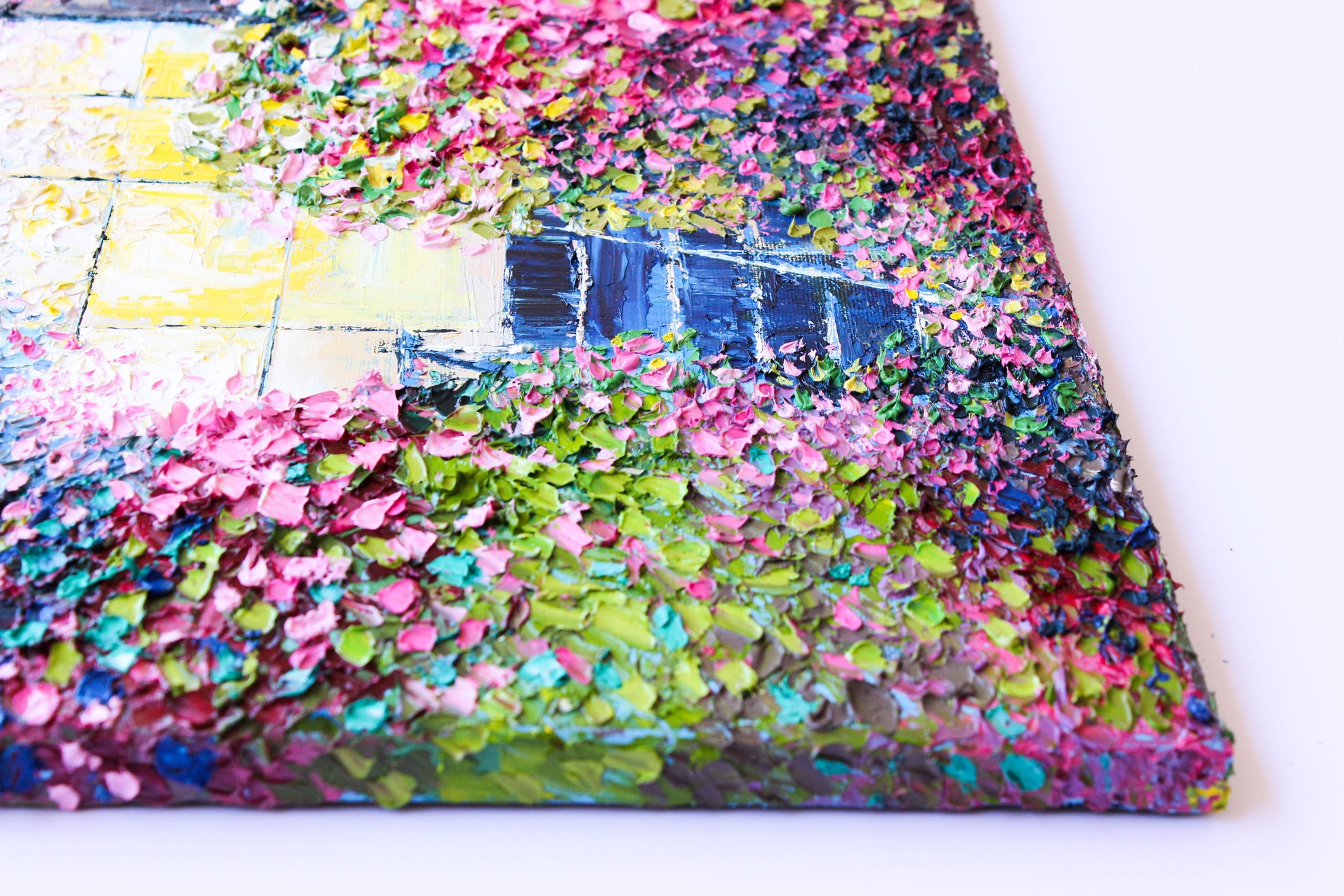This original artwork features a heavily textured and unique painting of a house surrounded by trees and flowers during spring time. This piece has several layers of paint creating thick, luxurious textures in a bright, vivid color combination.