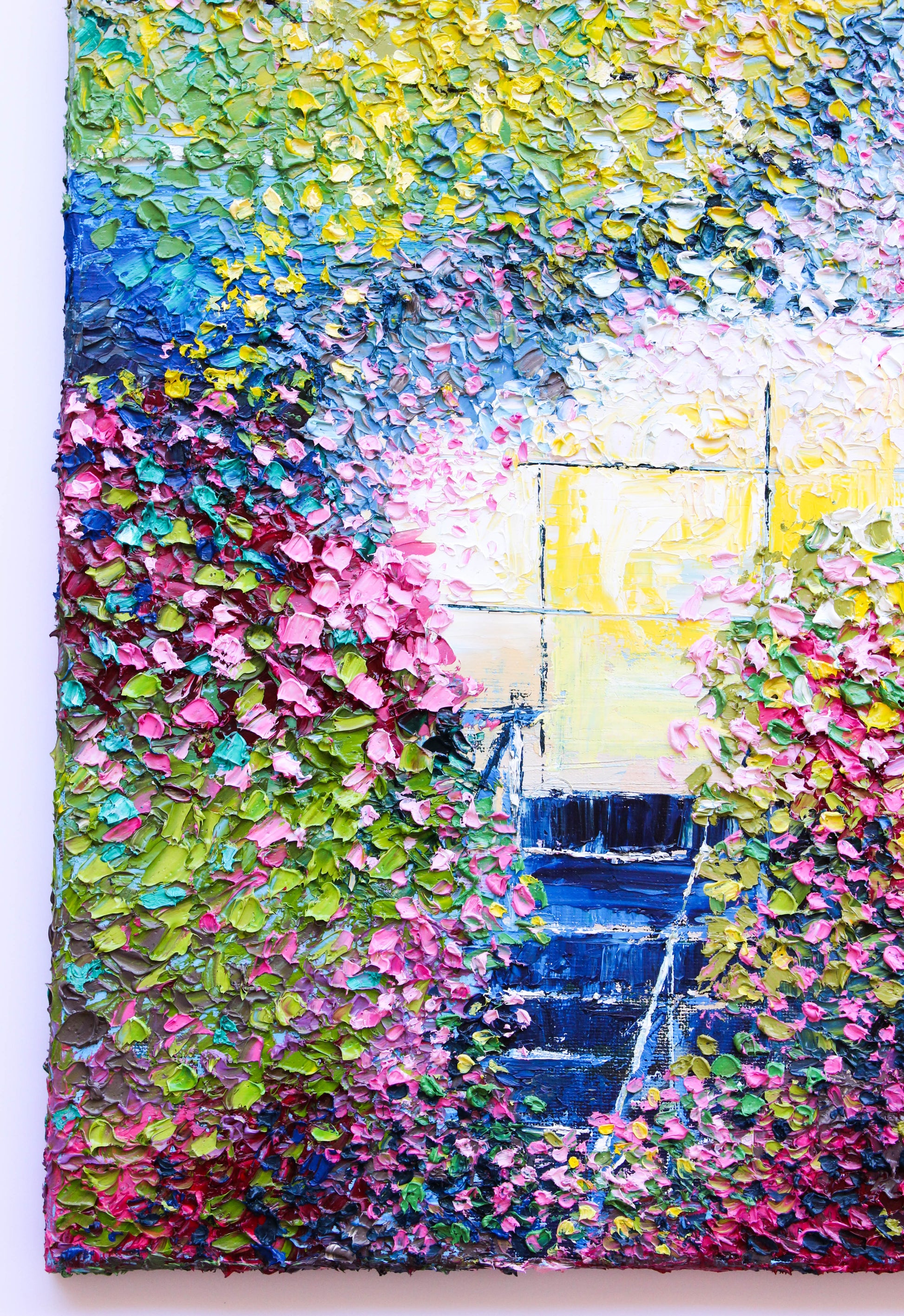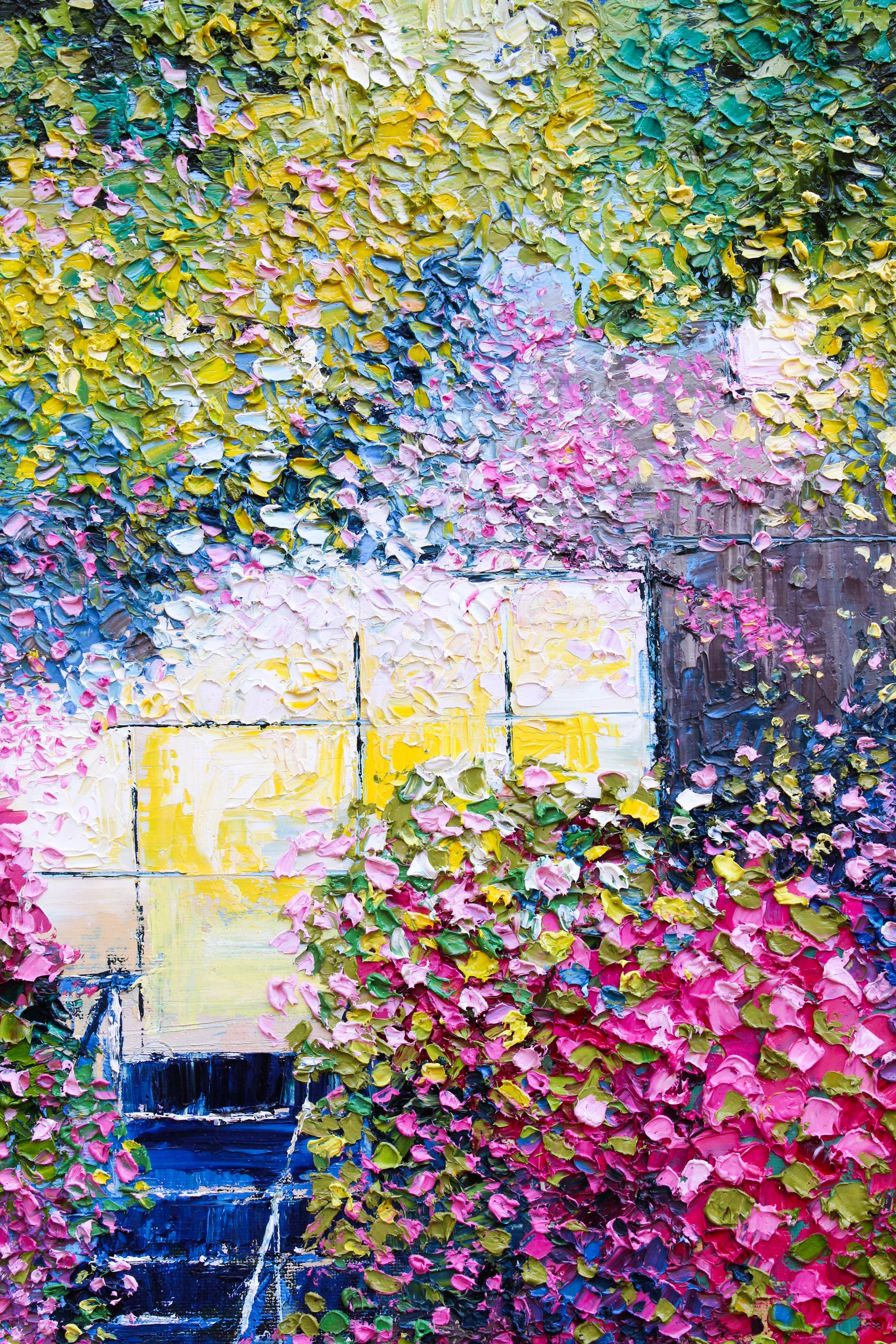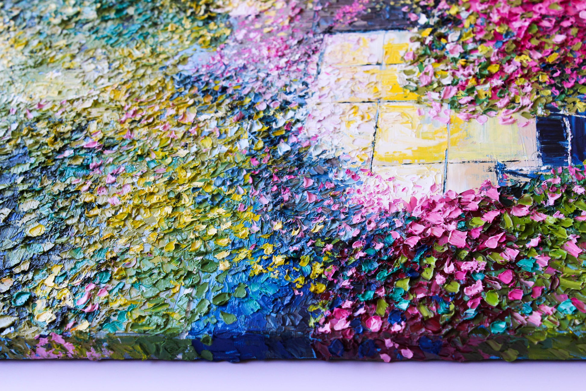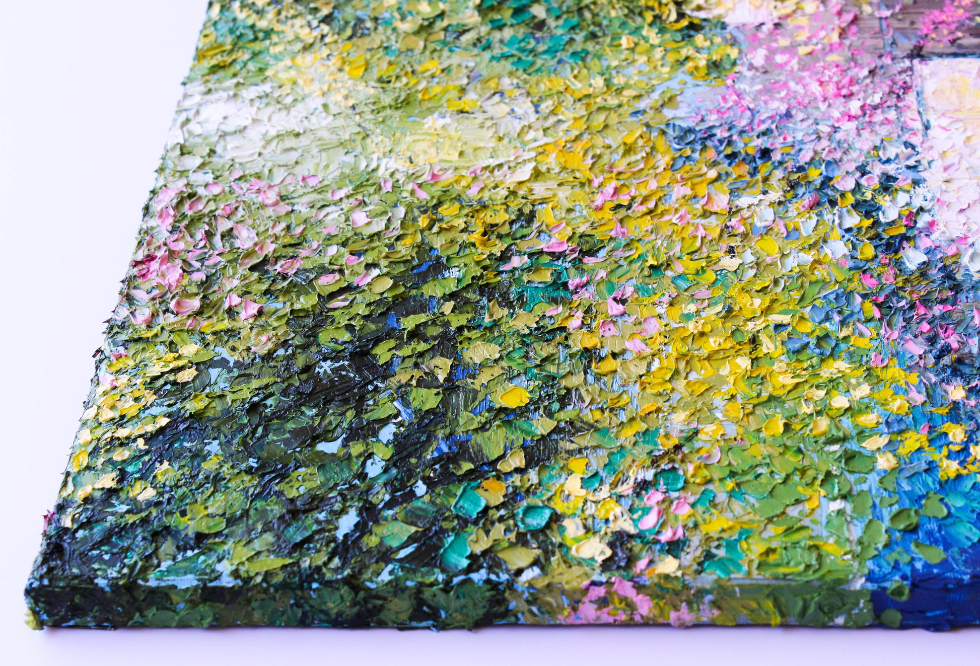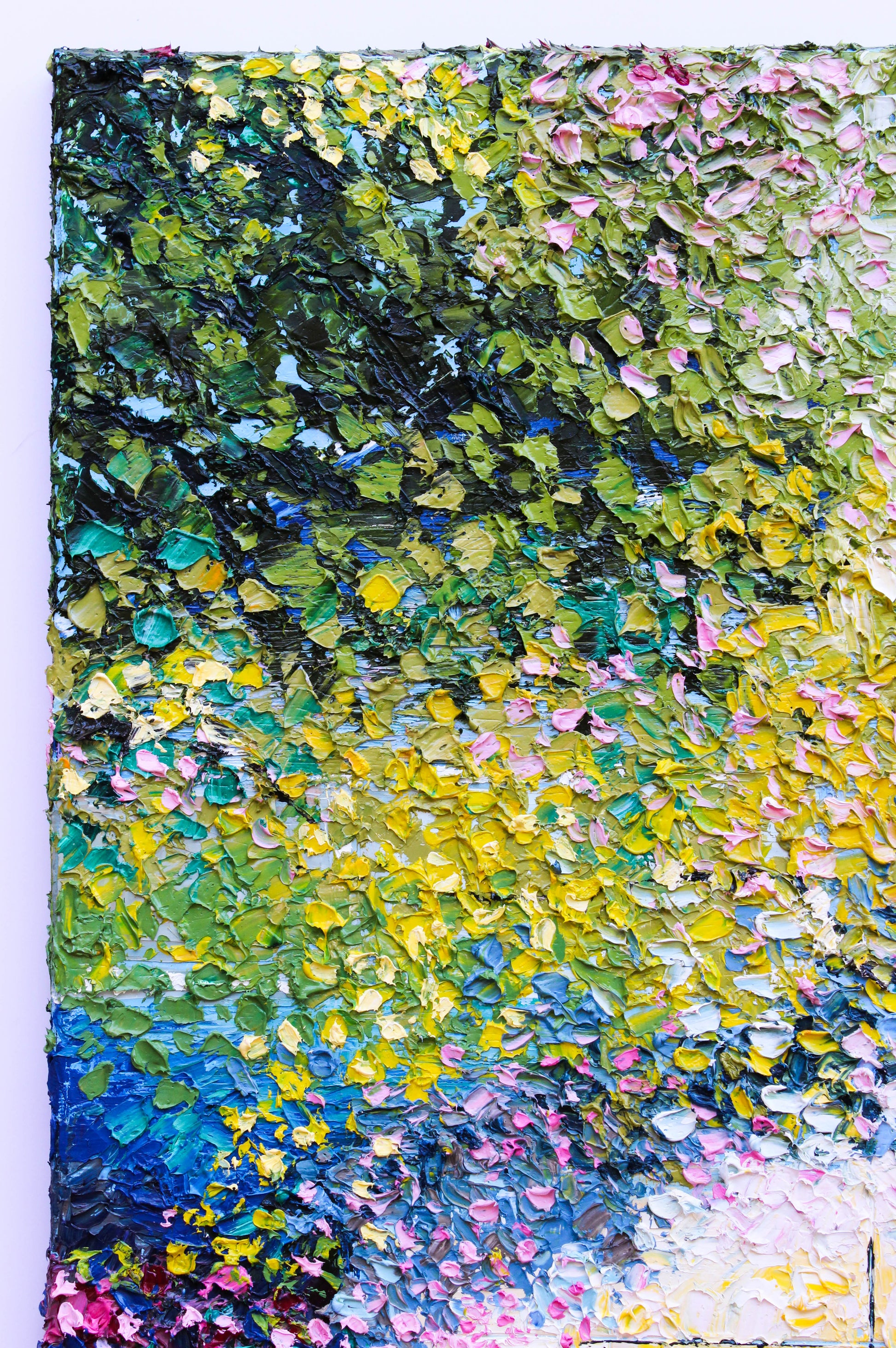 This original artwork features a heavily textured and unique painting of a house surrounded by trees and flowers during spring time. This piece has several layers of paint creating thick, luxurious textures in a bright, vivid color combination.