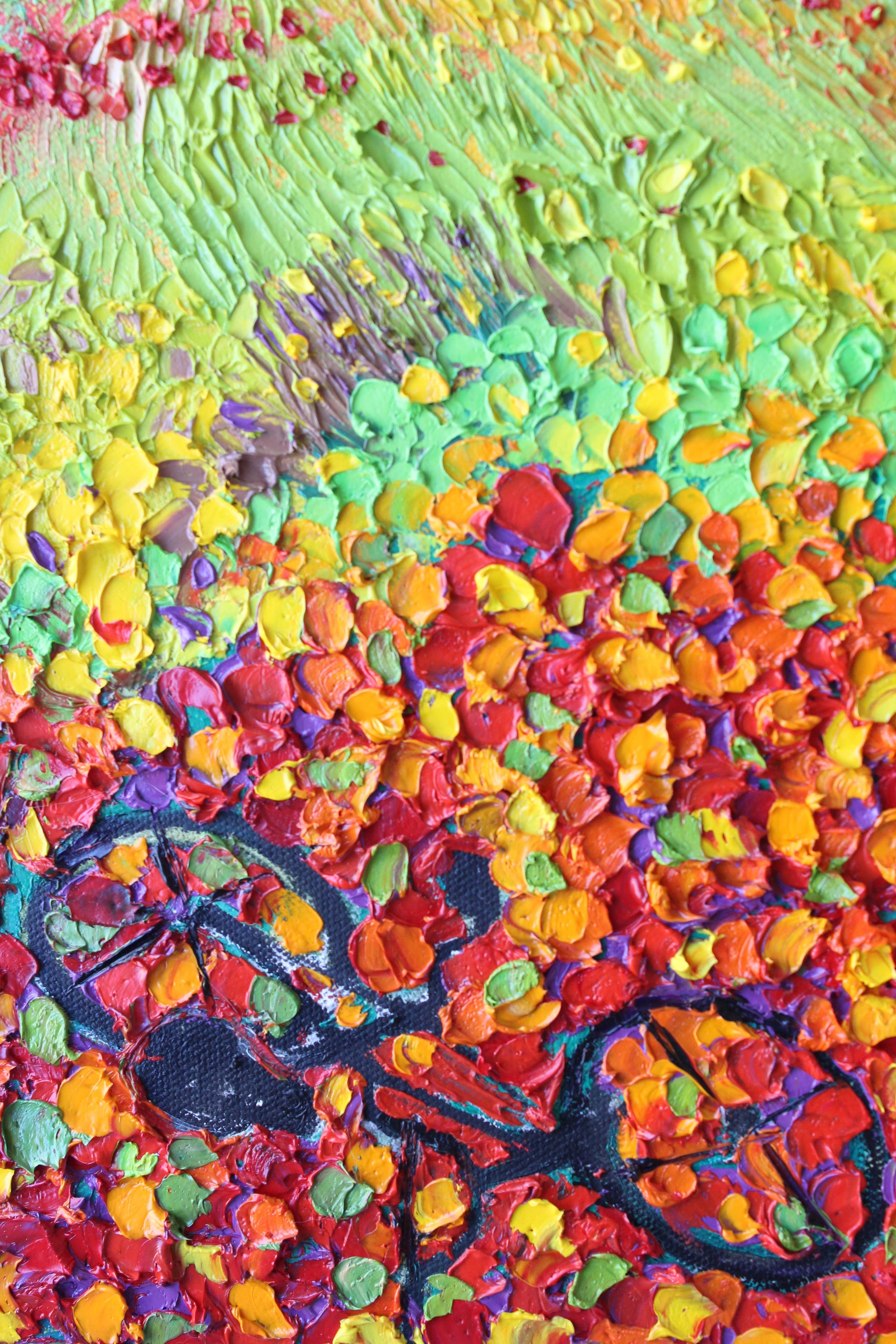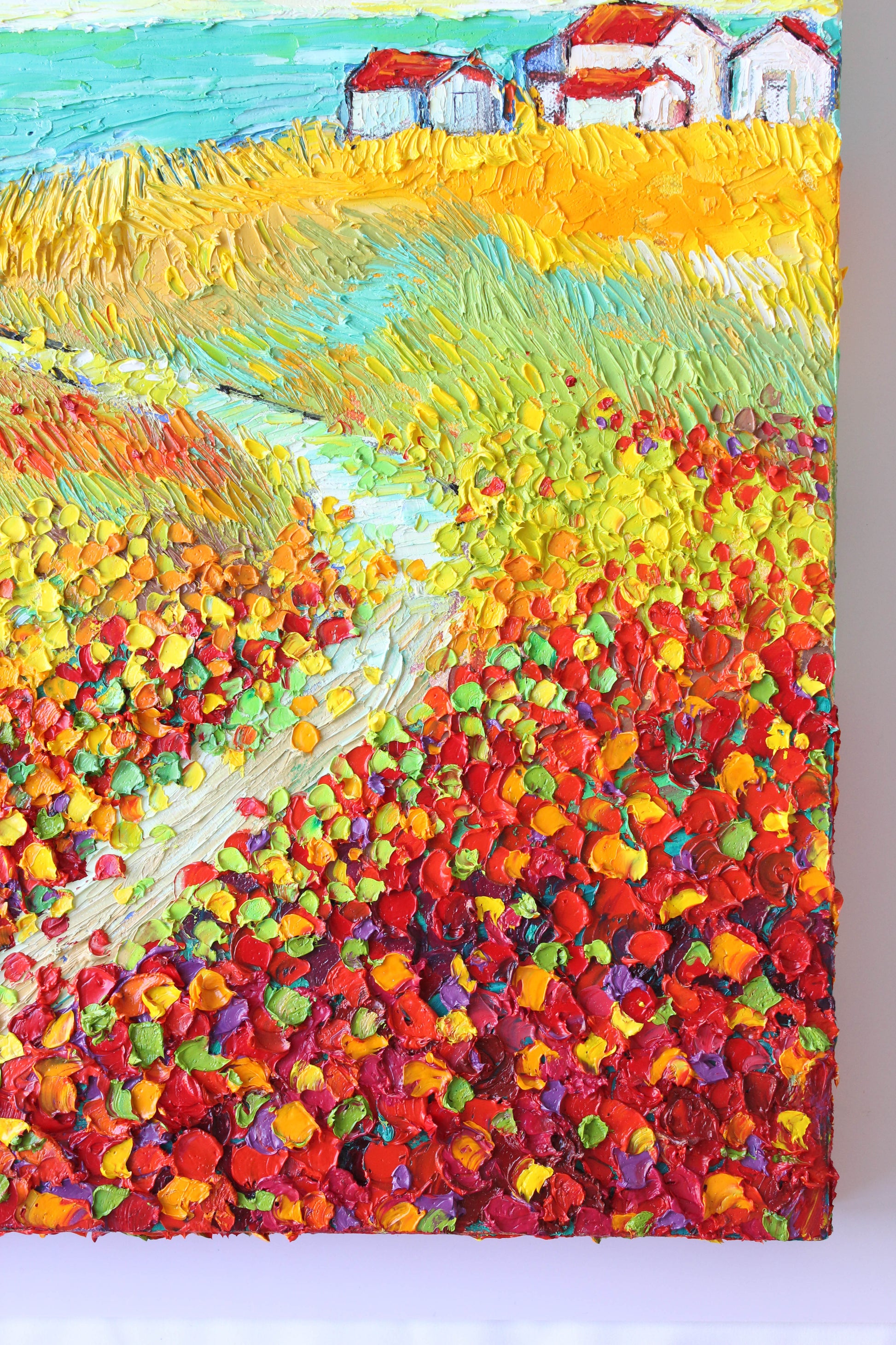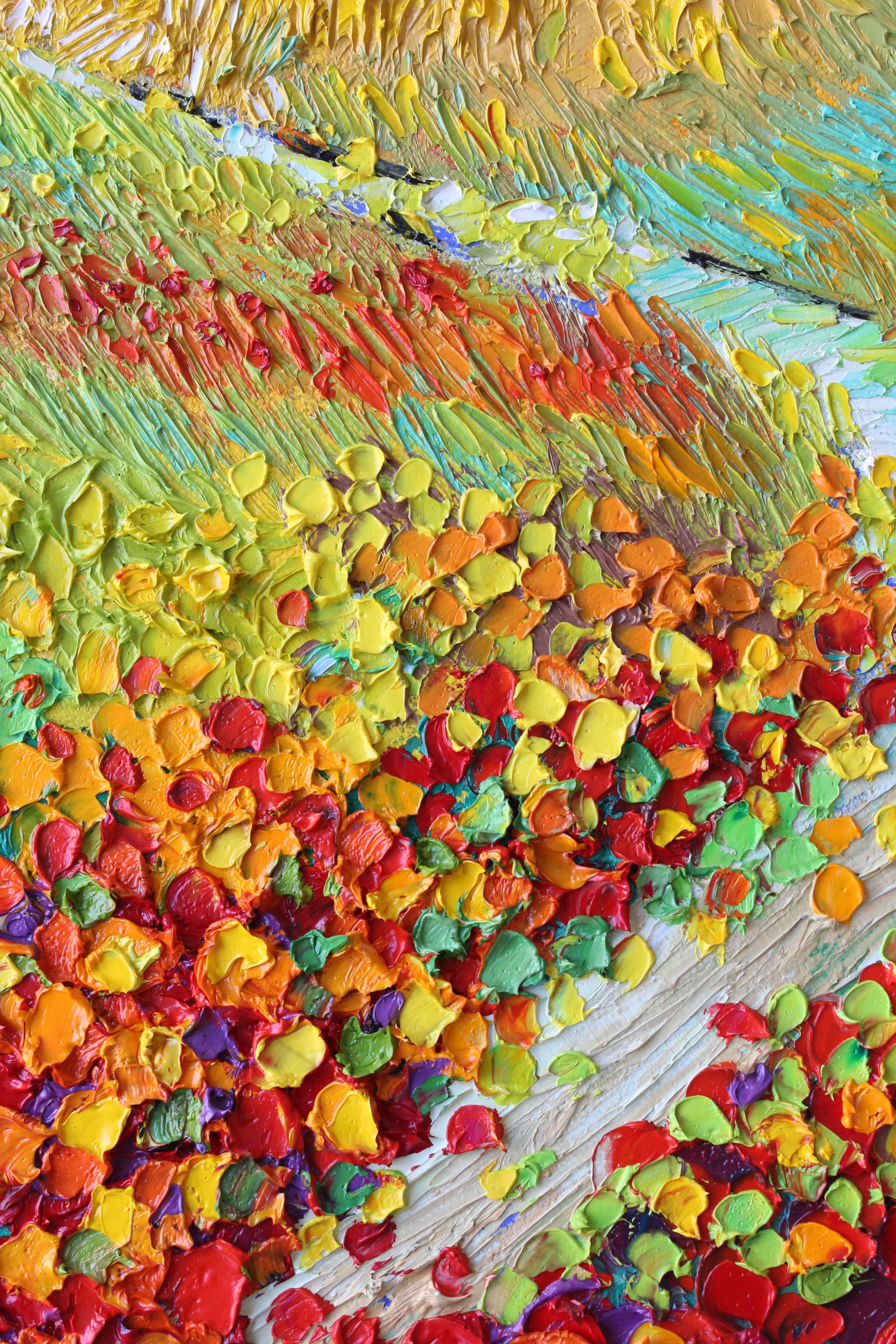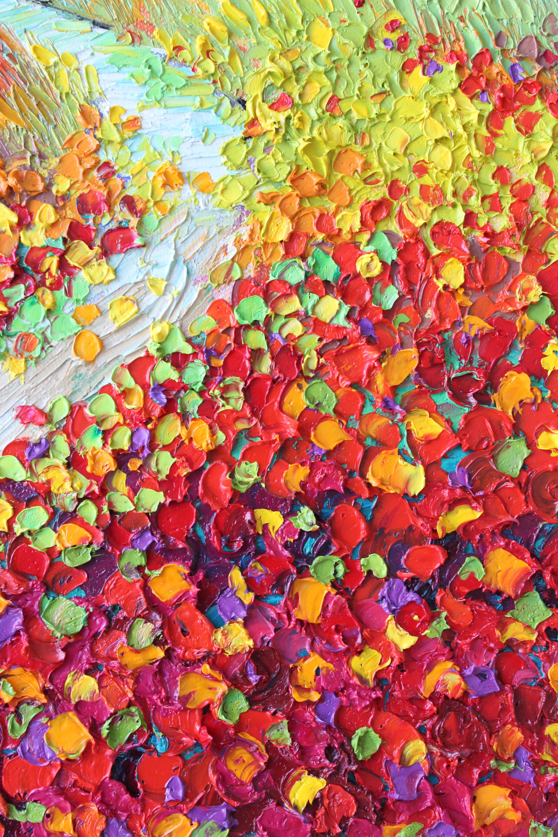 This original high textured palette knife oil painting is inspired by the fascinating views in SoCal during spring time. This piece has several layers of paint, creating eye catching, thick, luxurious textures in a beautiful color combination.