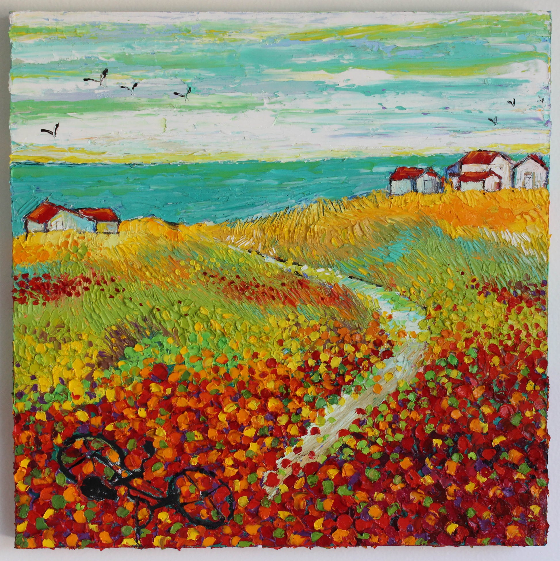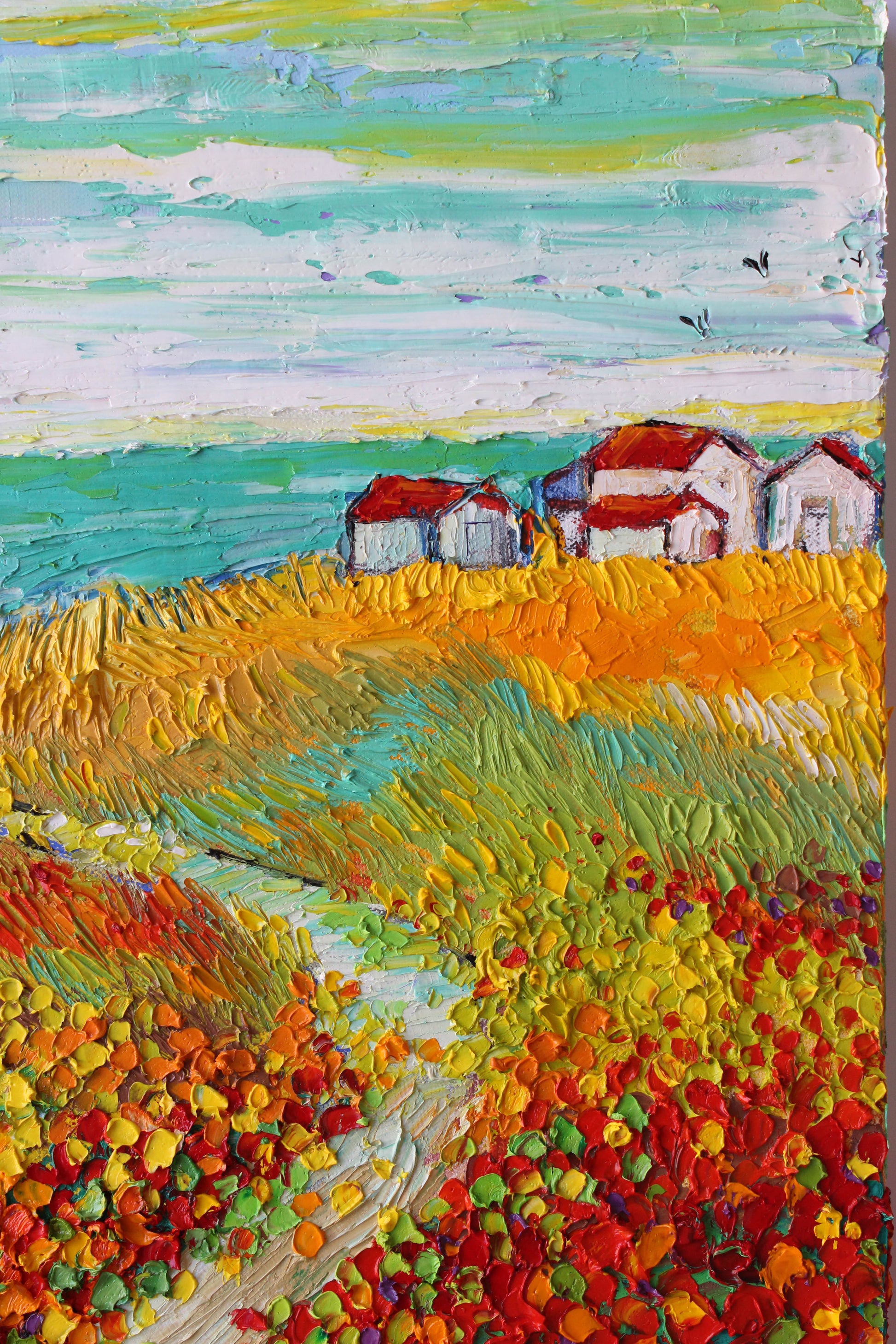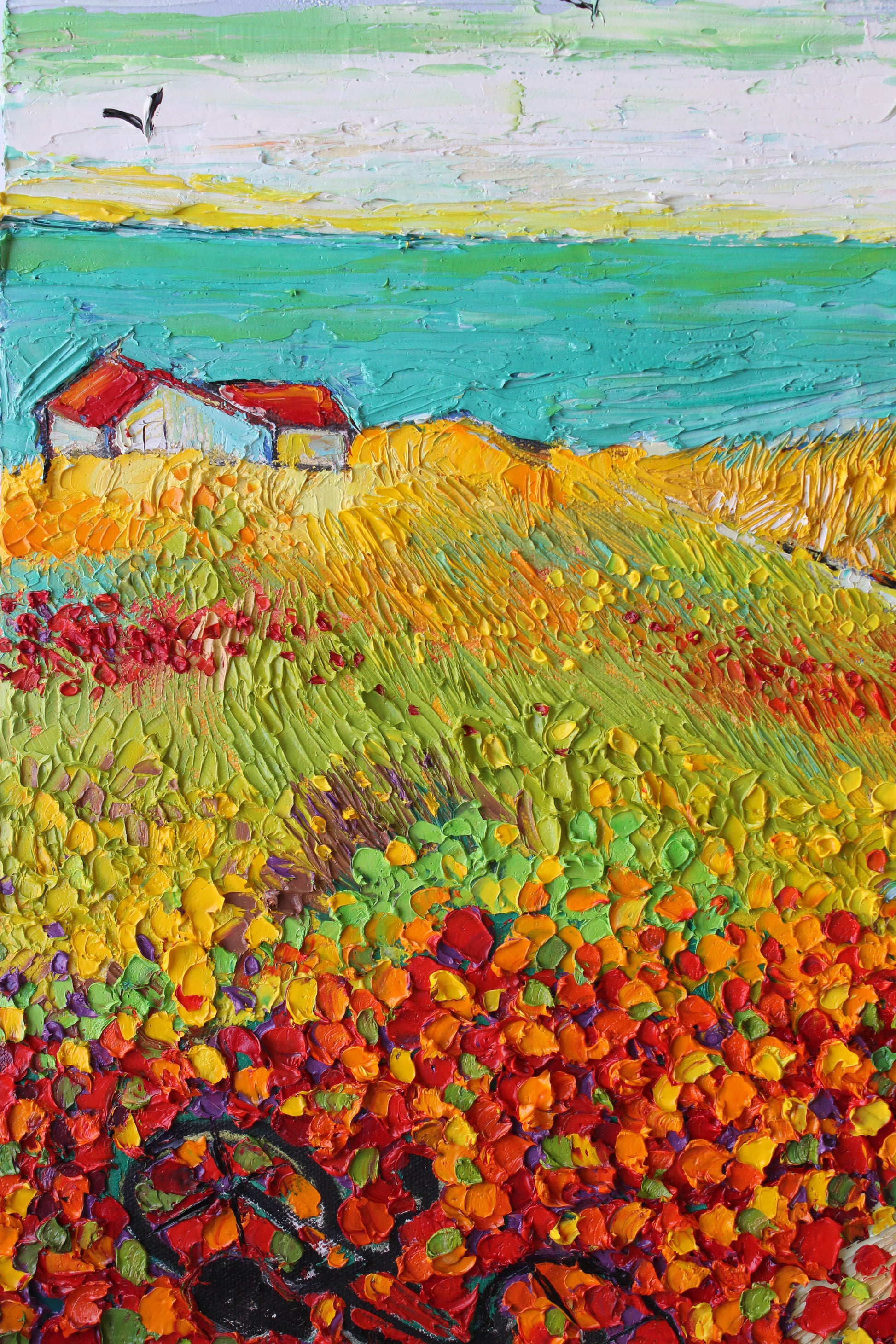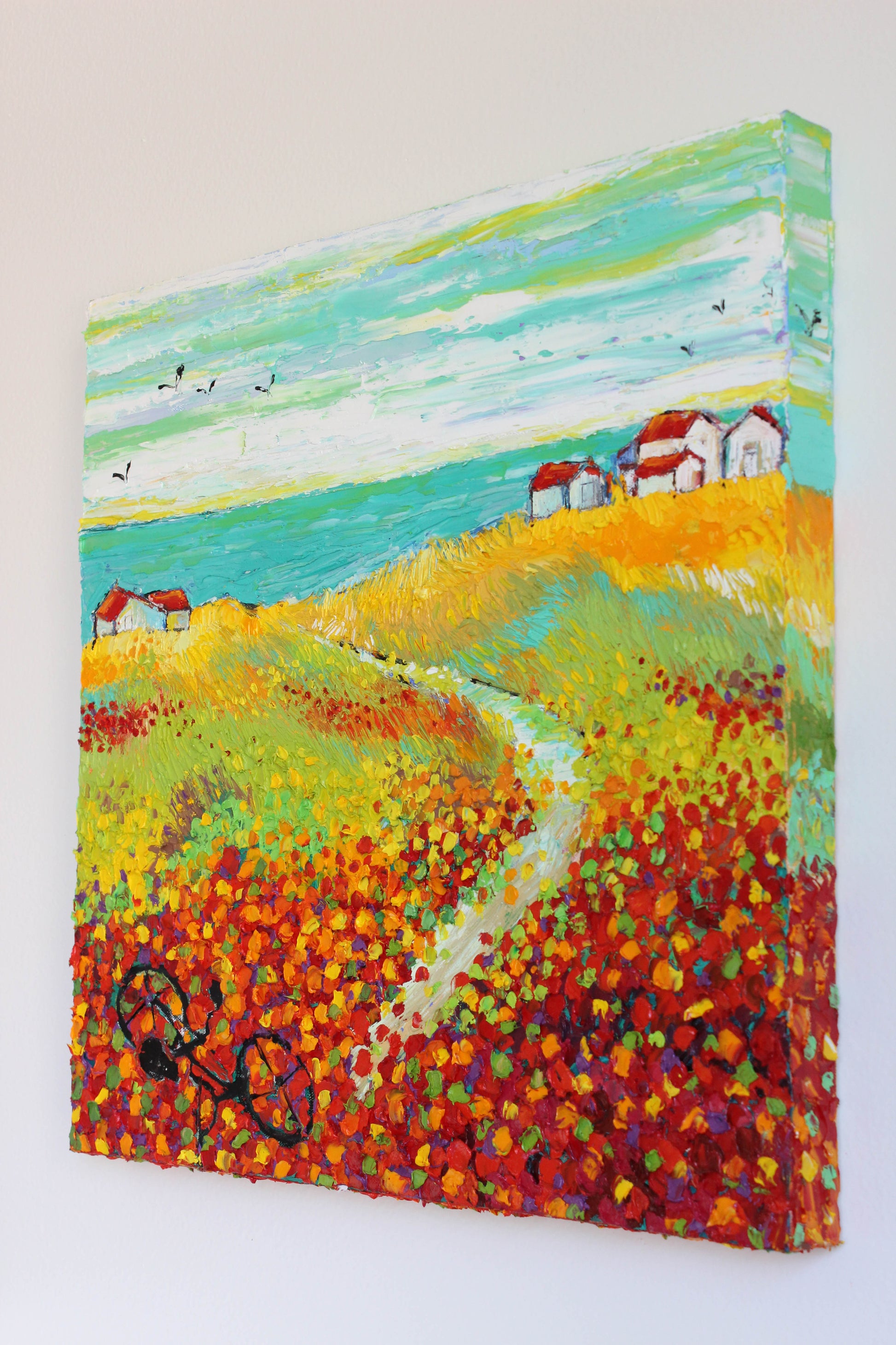 This original high textured palette knife oil painting is inspired by the fascinating views in SoCal during spring time. This piece has several layers of paint, creating eye catching, thick, luxurious textures in a beautiful color combination.