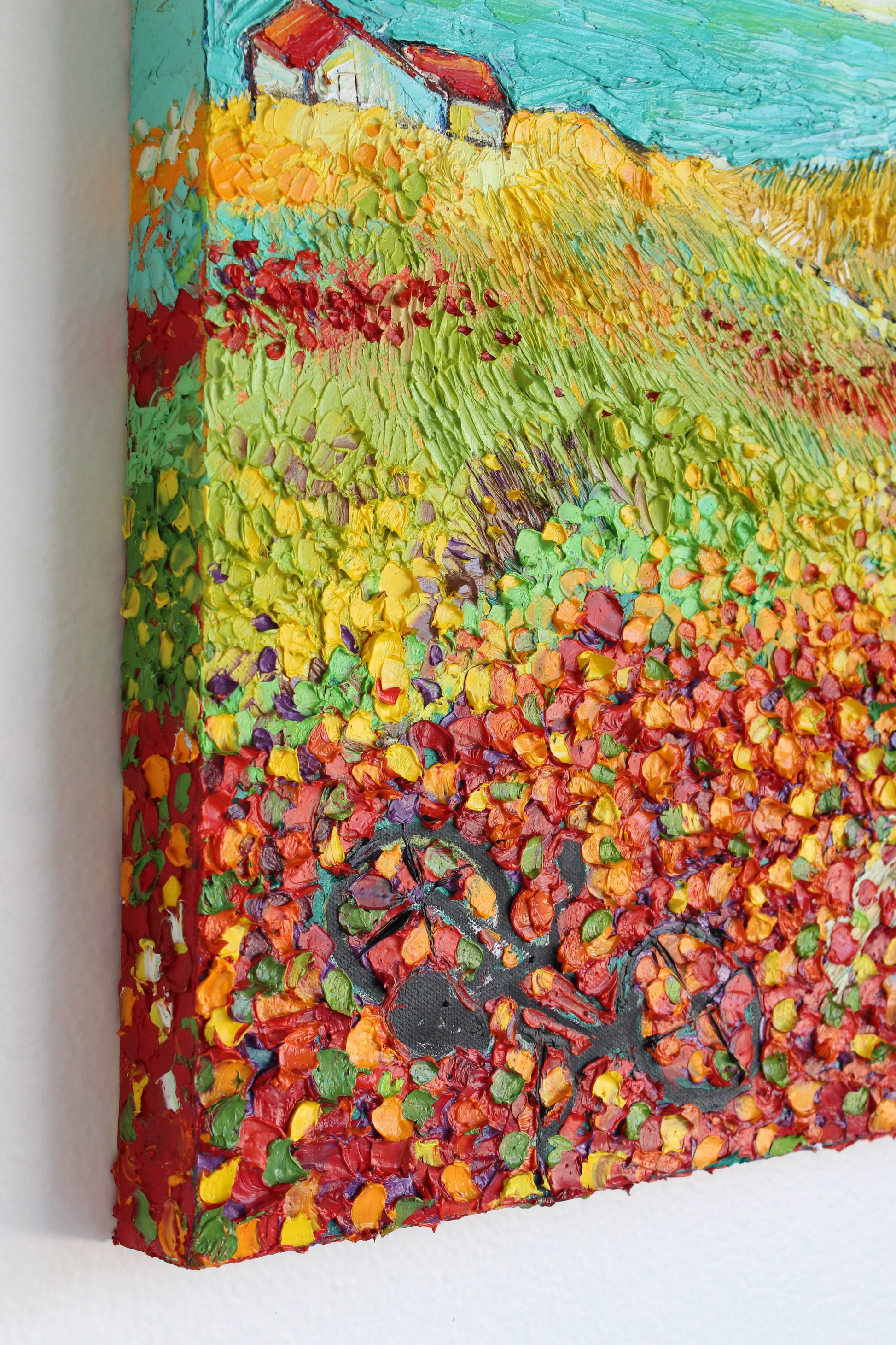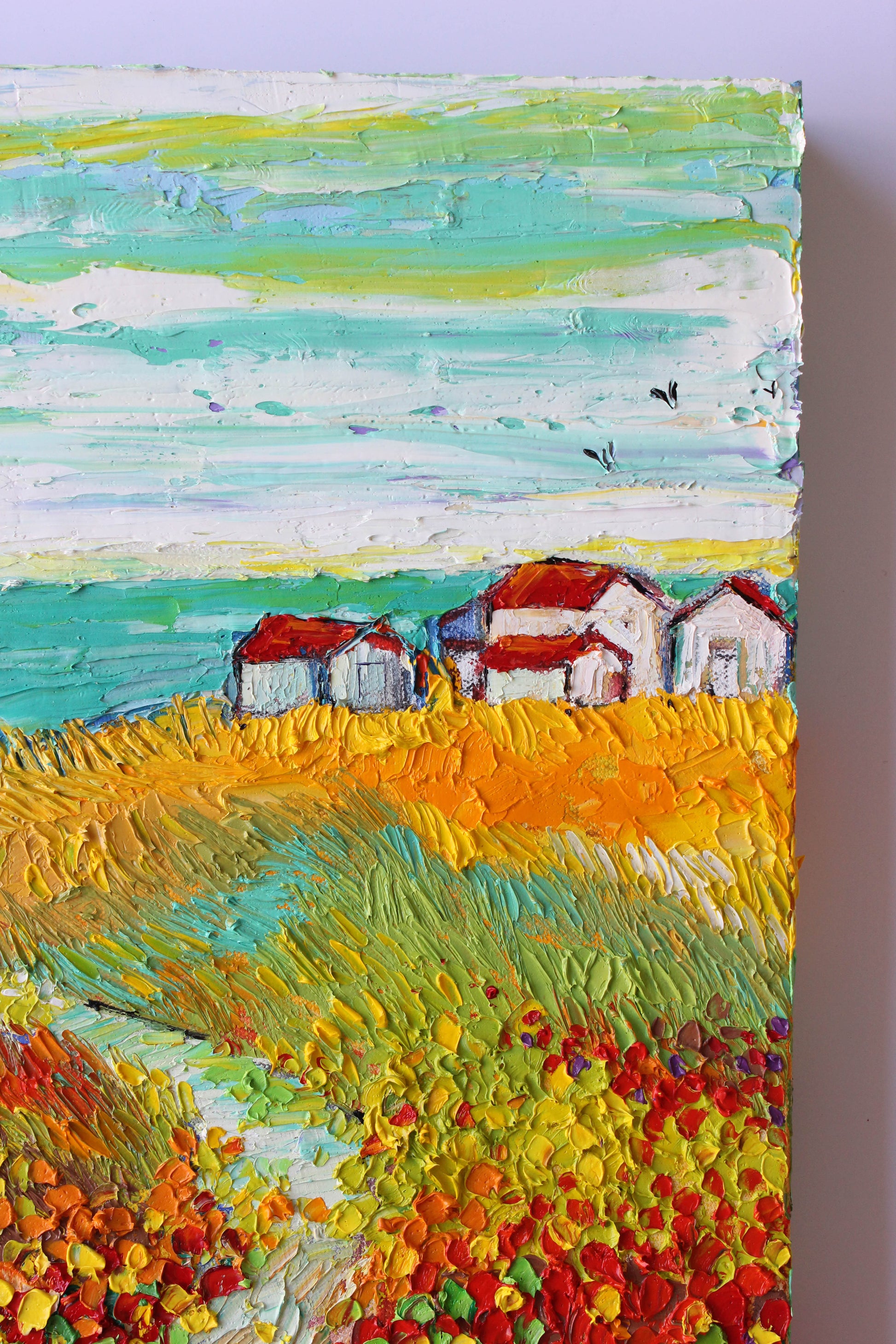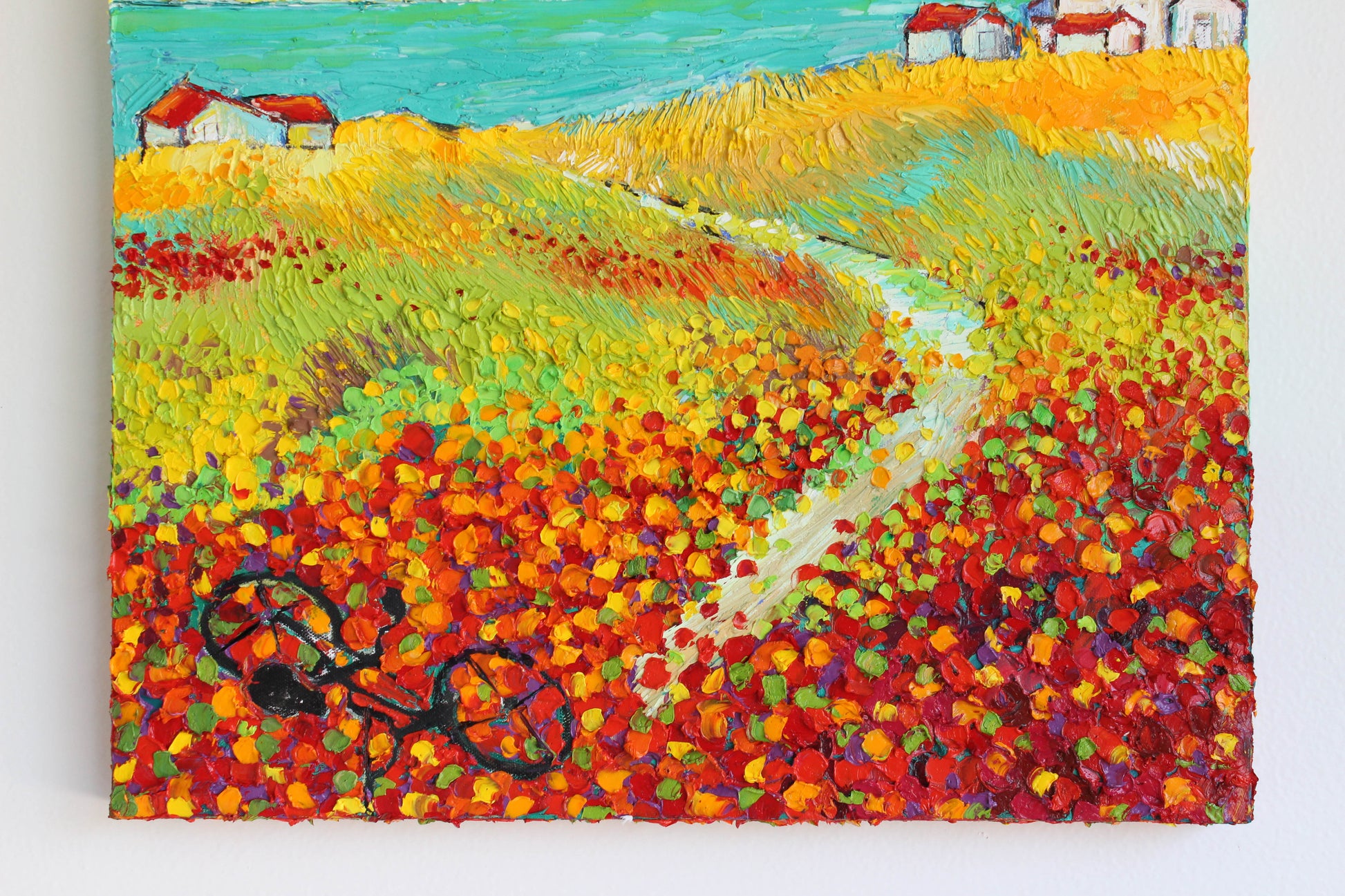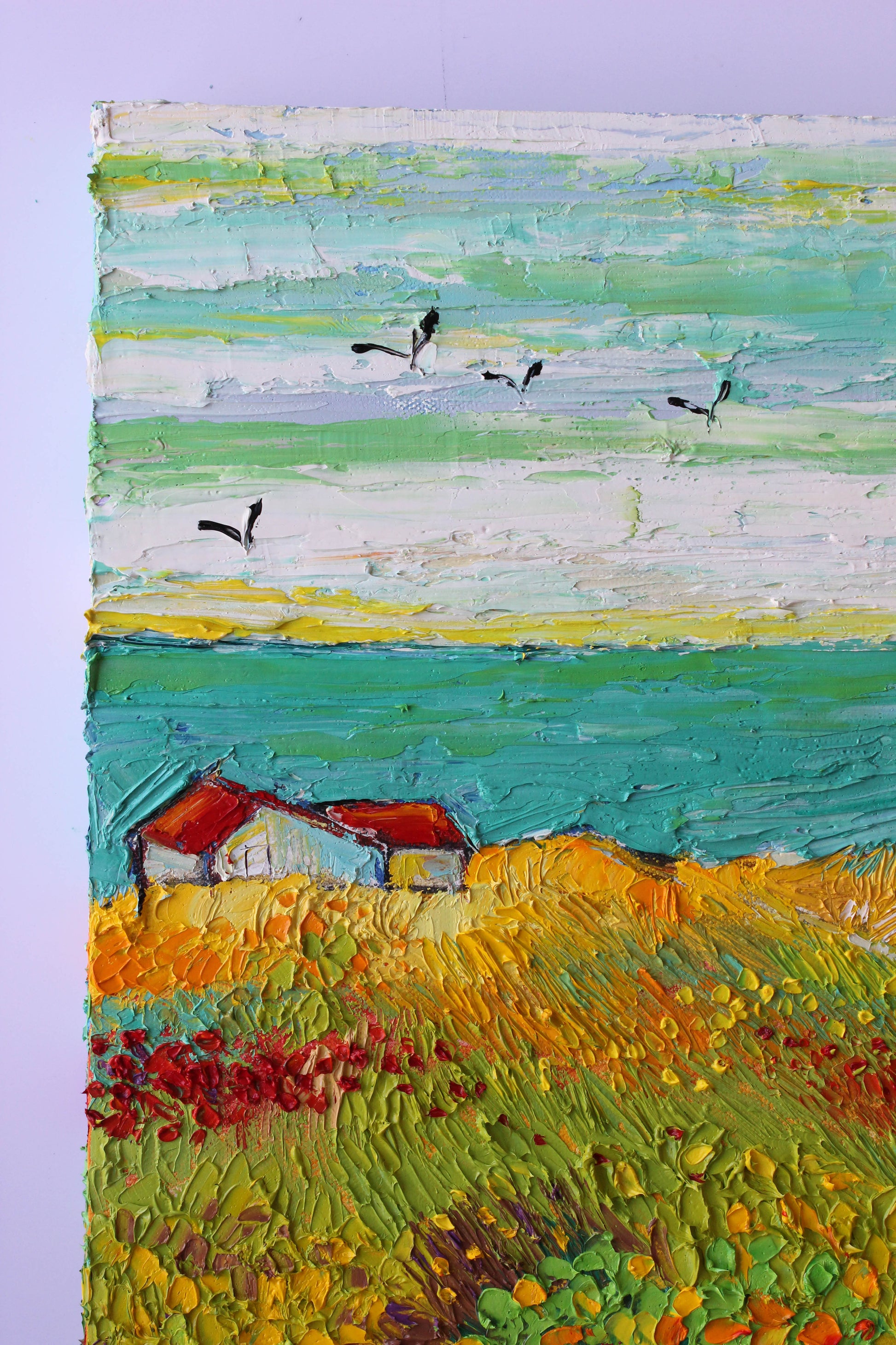 This original high textured palette knife oil painting is inspired by the fascinating views in SoCal during spring time. This piece has several layers of paint, creating eye catching, thick, luxurious textures in a beautiful color combination.