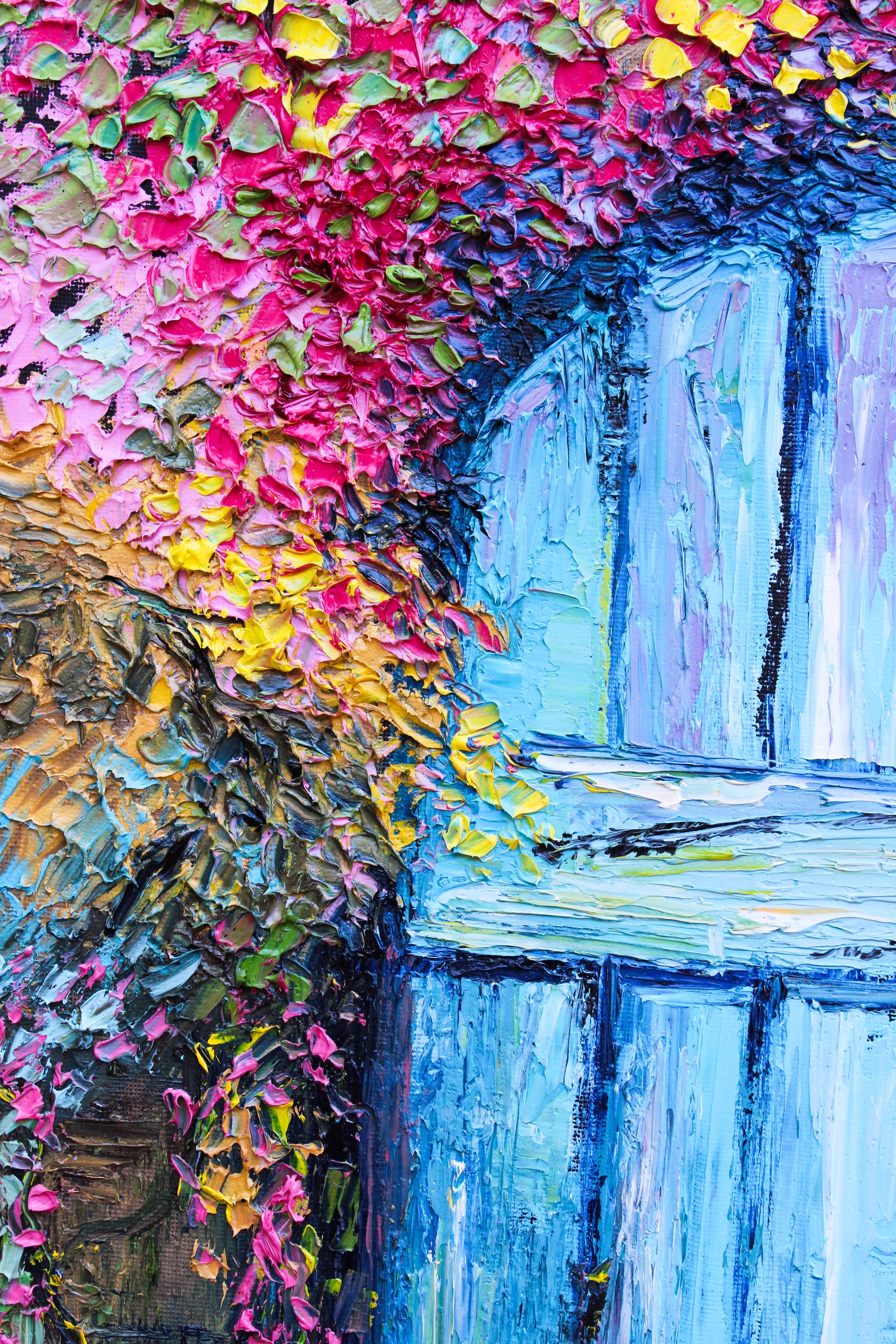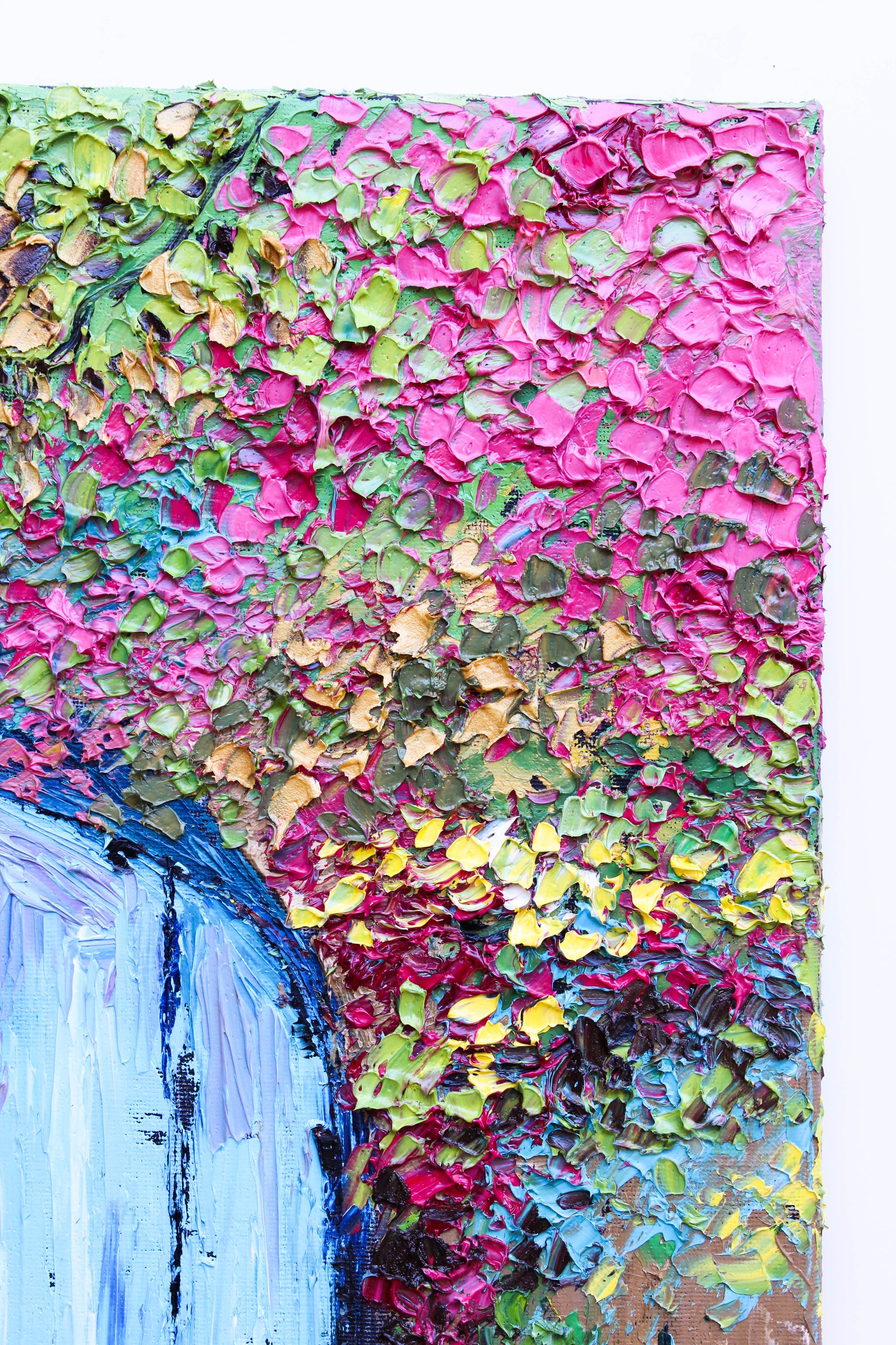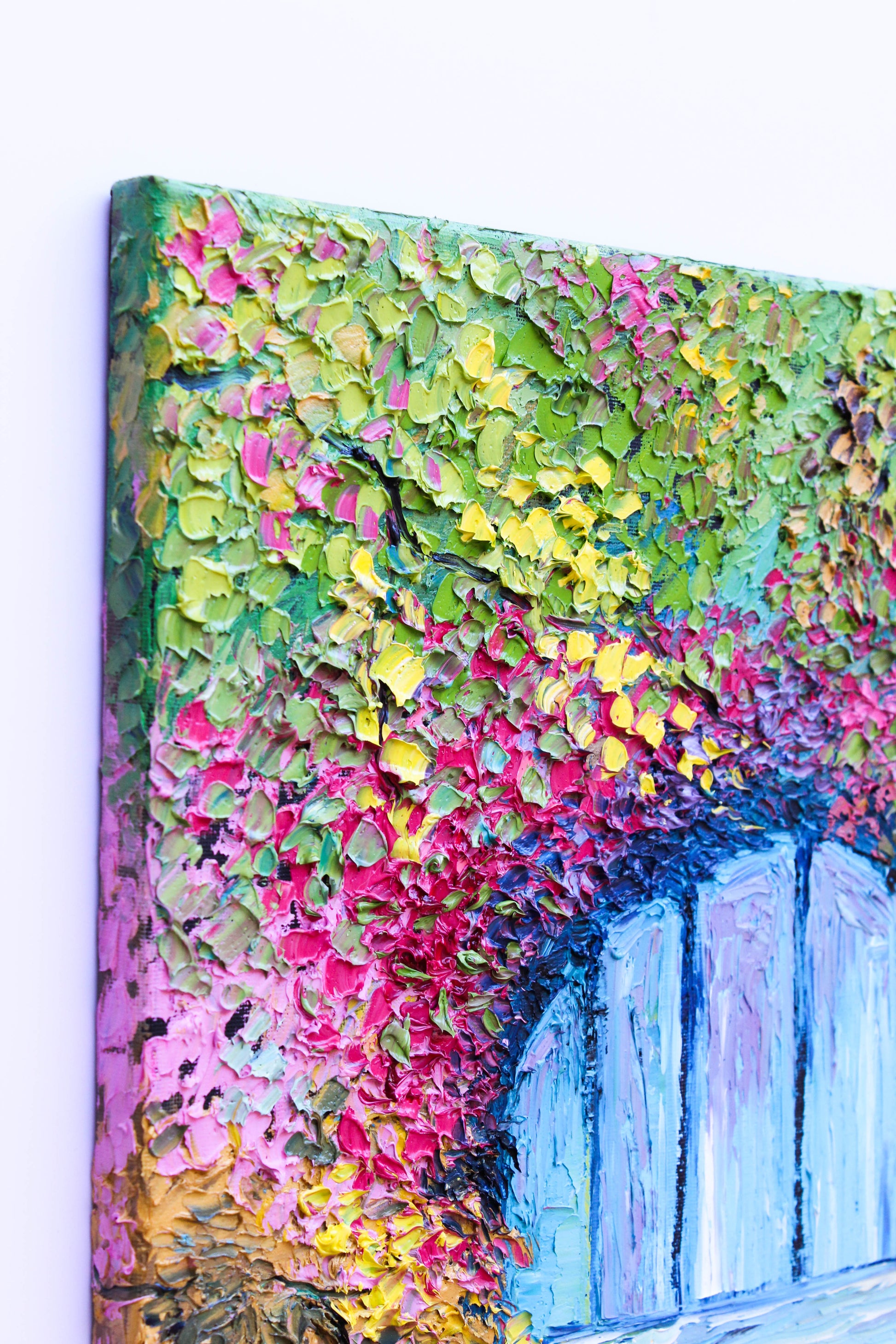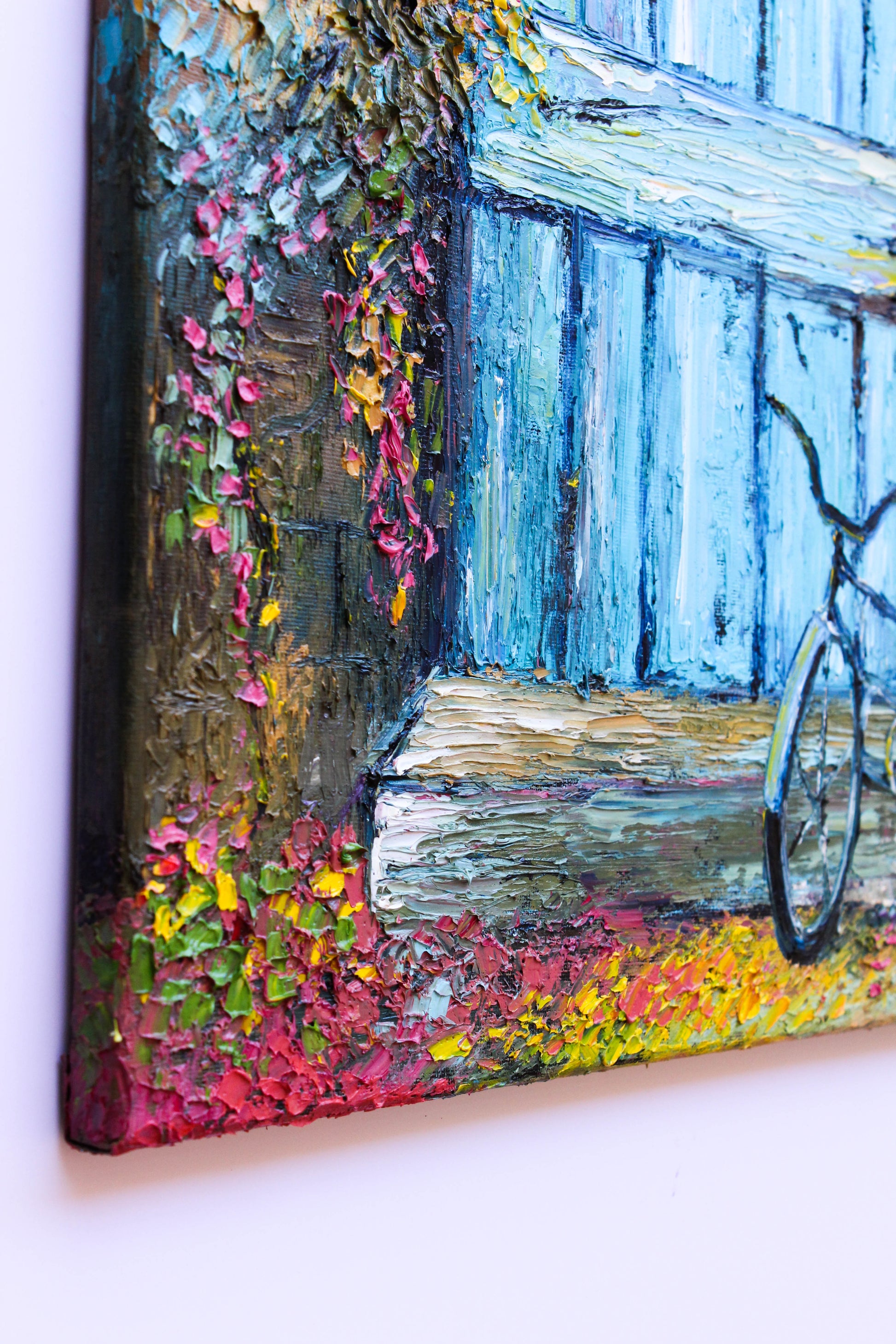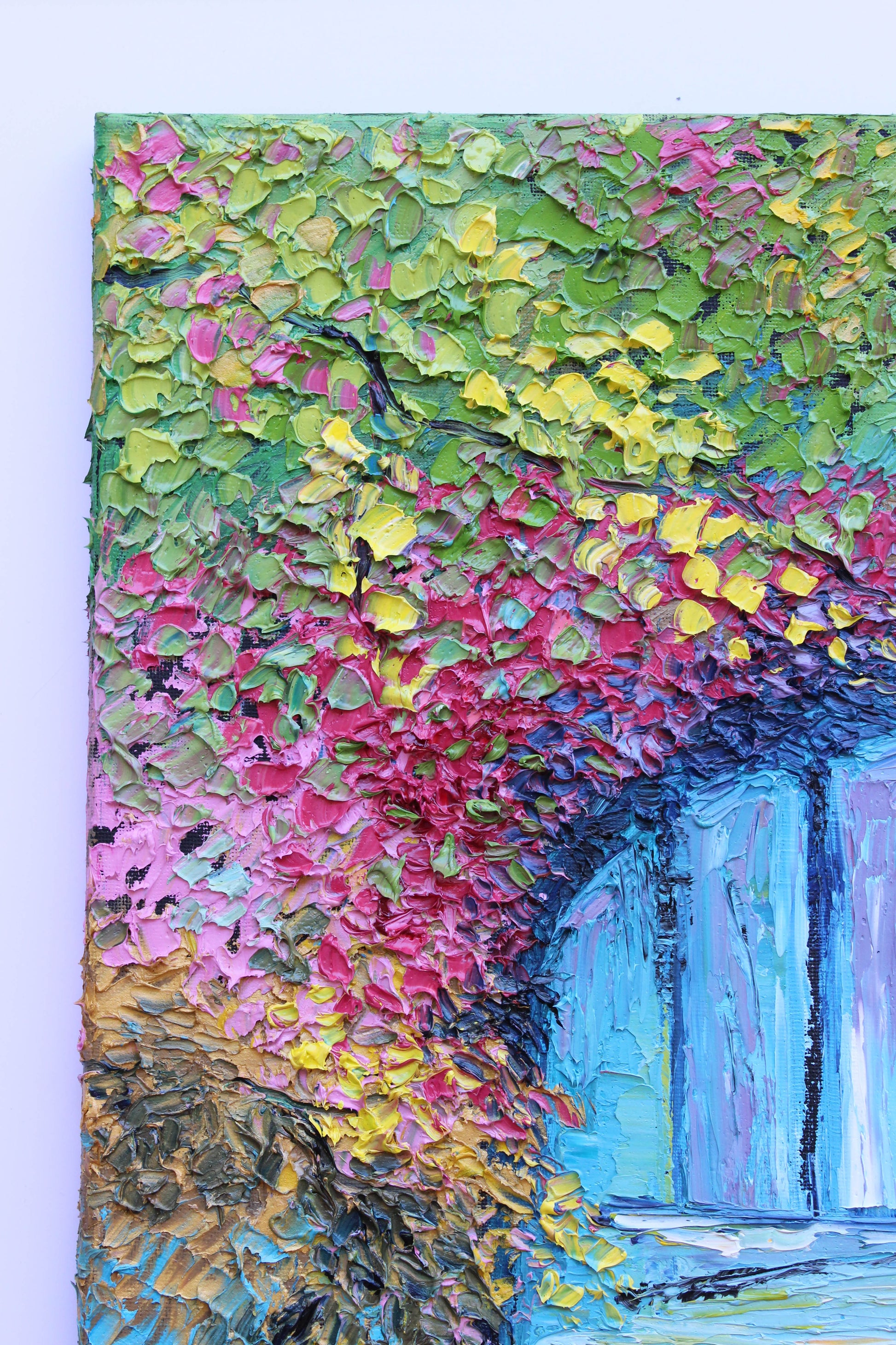 This original artwork features a heavily textured and unique painting of a beautiful blue door and a bicycle. The door is surrounded by very colorful trees and flowers during spring time. This piece has several layers of paint creating thick, luxurious textures, that are visible to the eye.