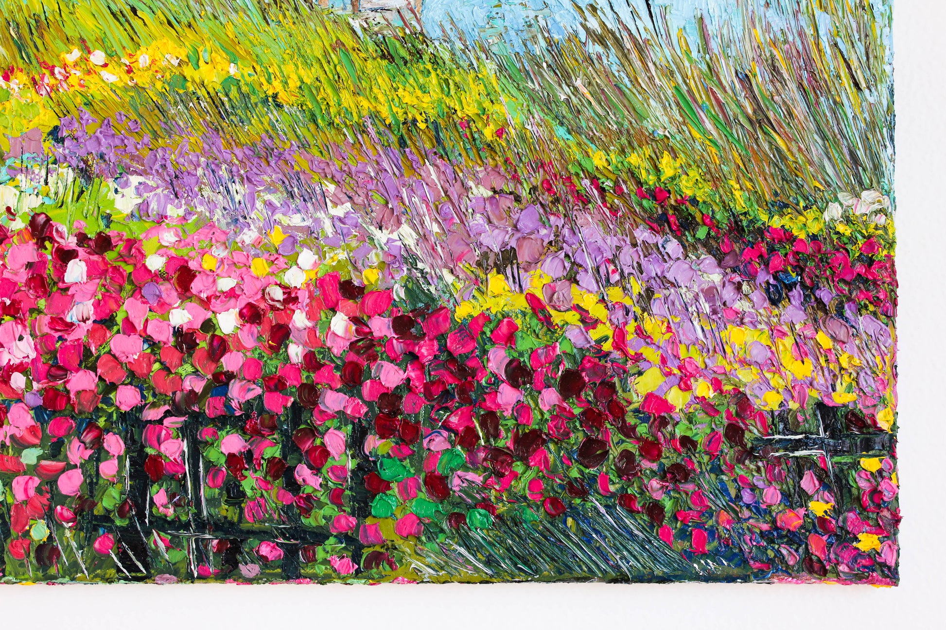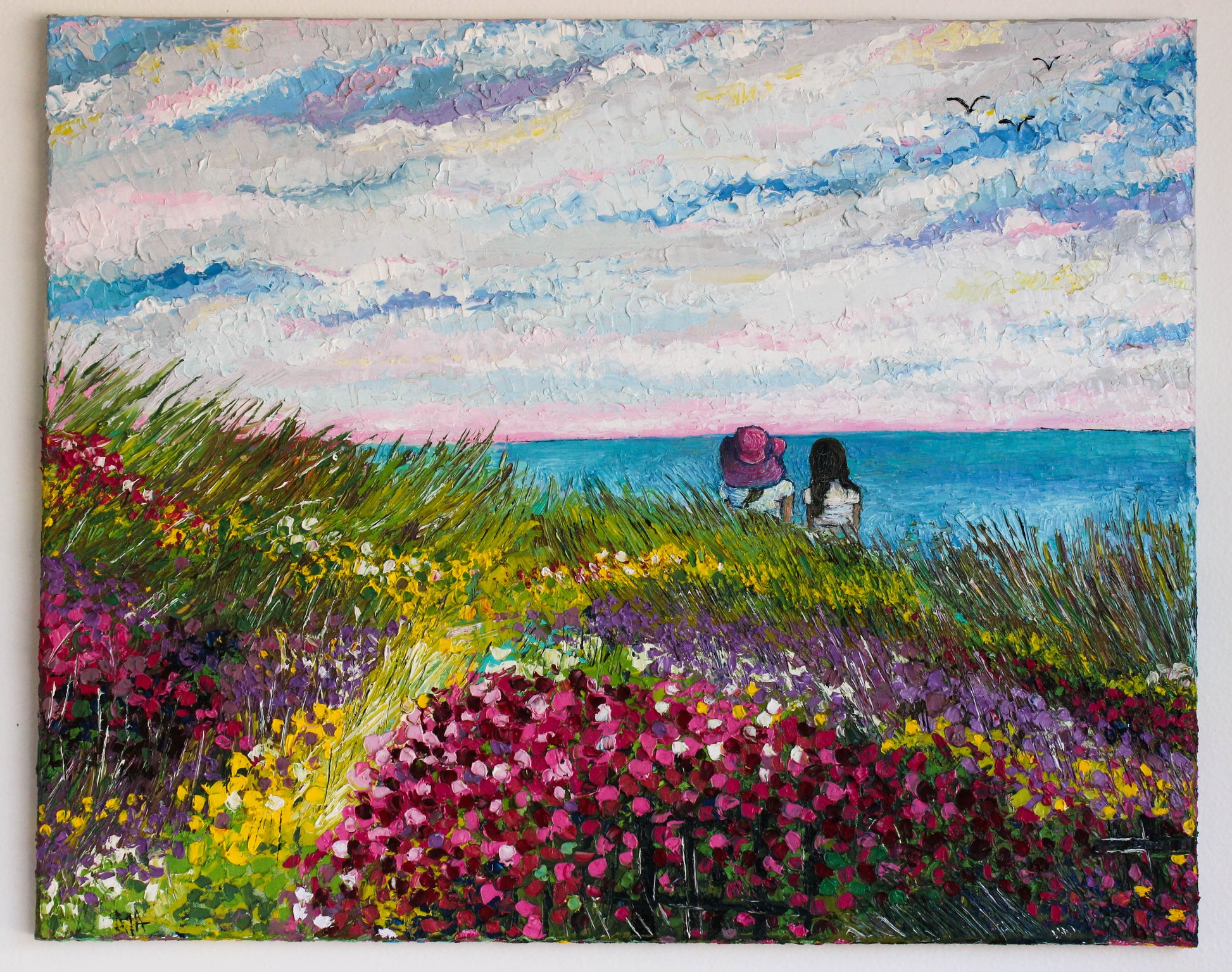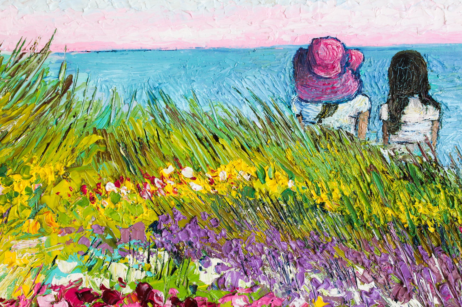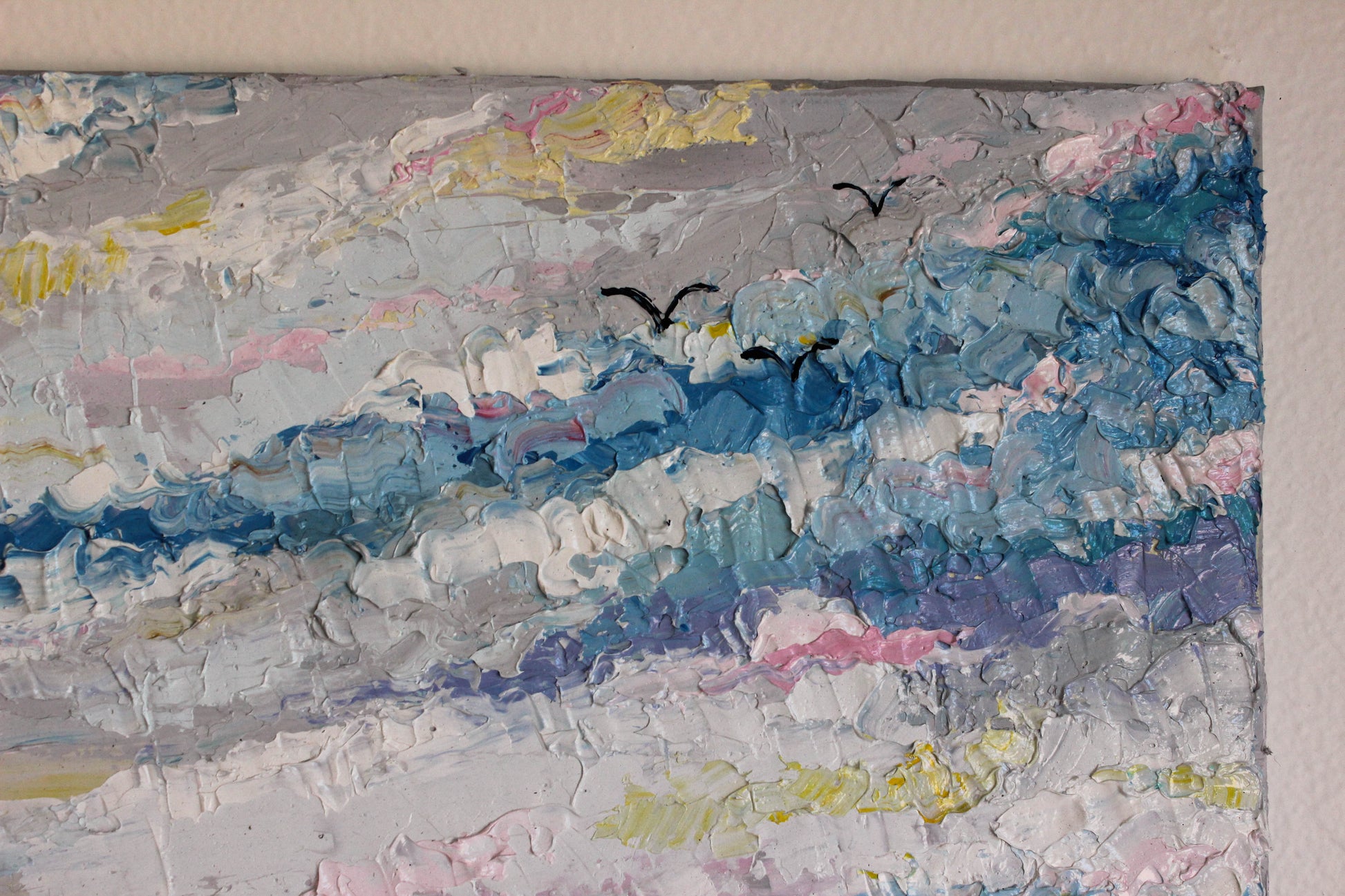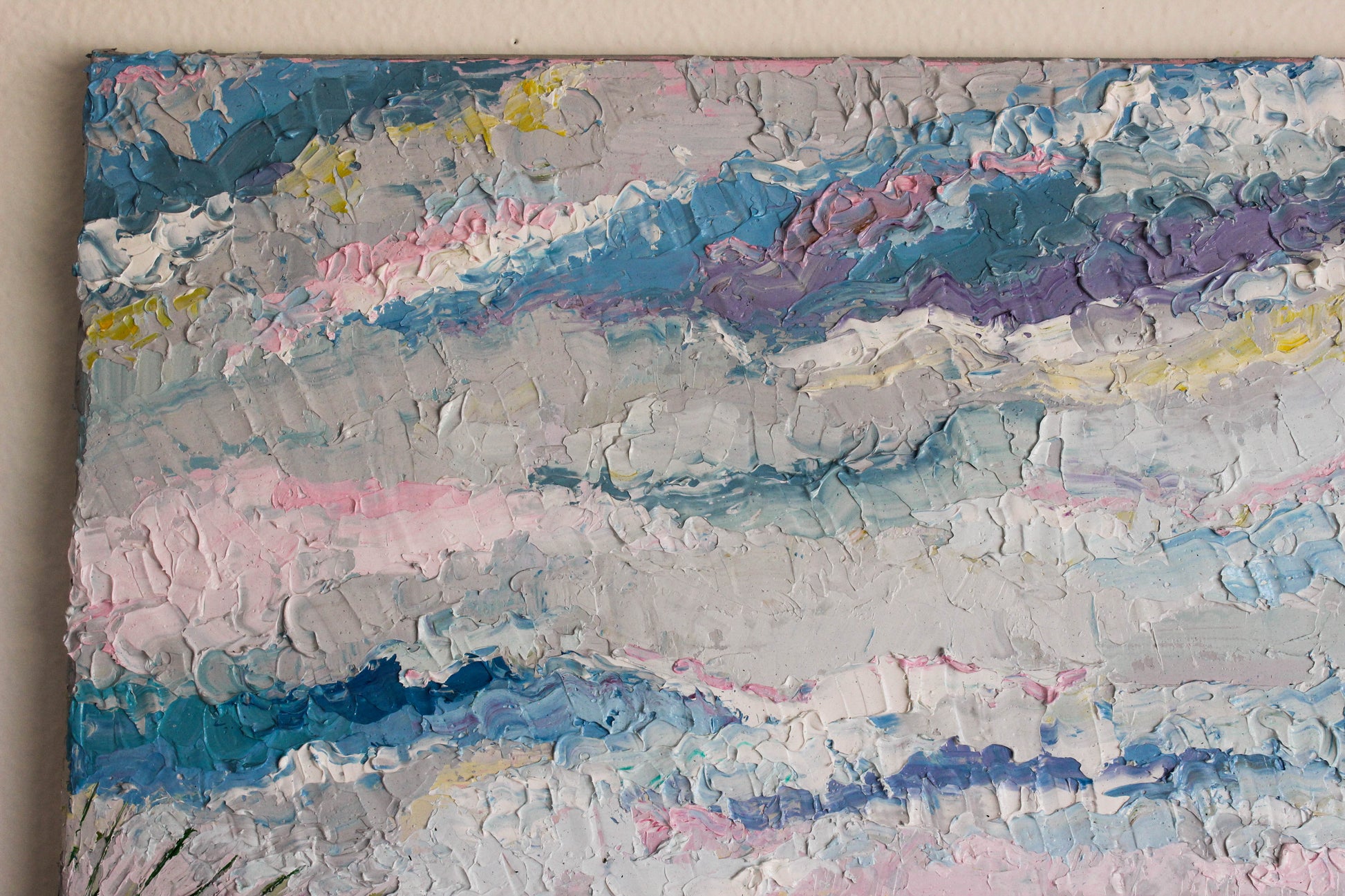 This original artwork features a heavily textured and unique palette knife oil painting. This piece has several layers of paint, creating thick, luxurious textures in a beautiful color combination.
