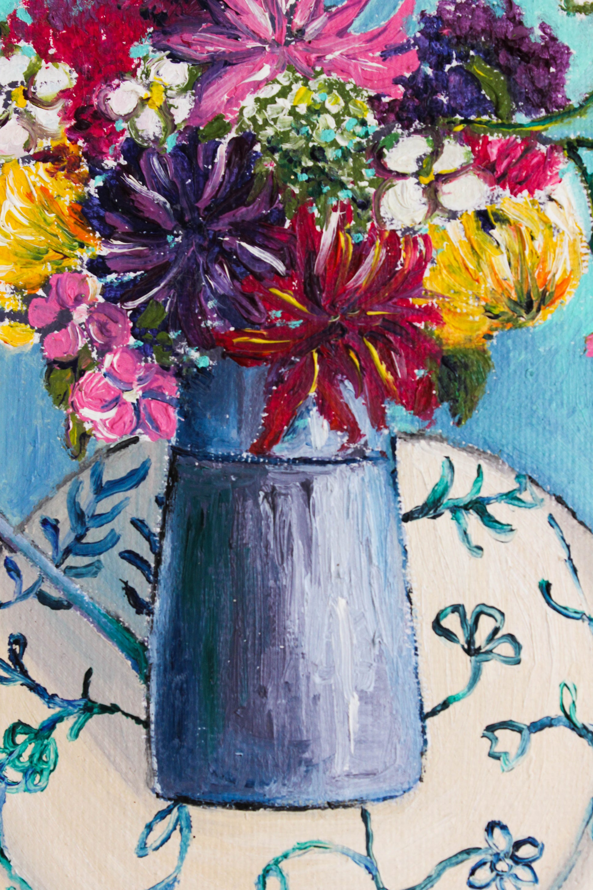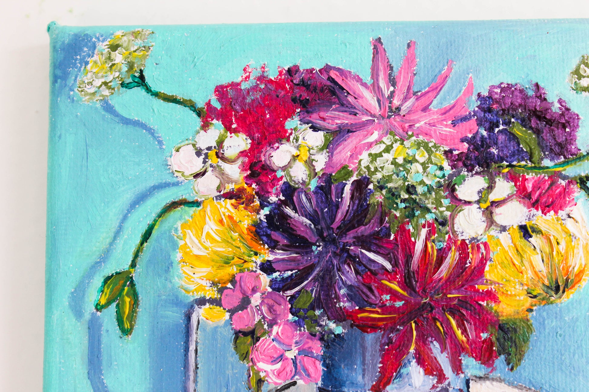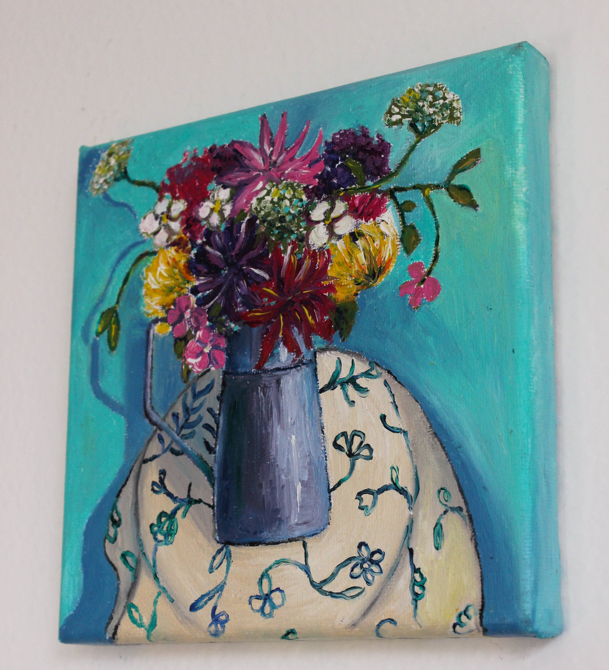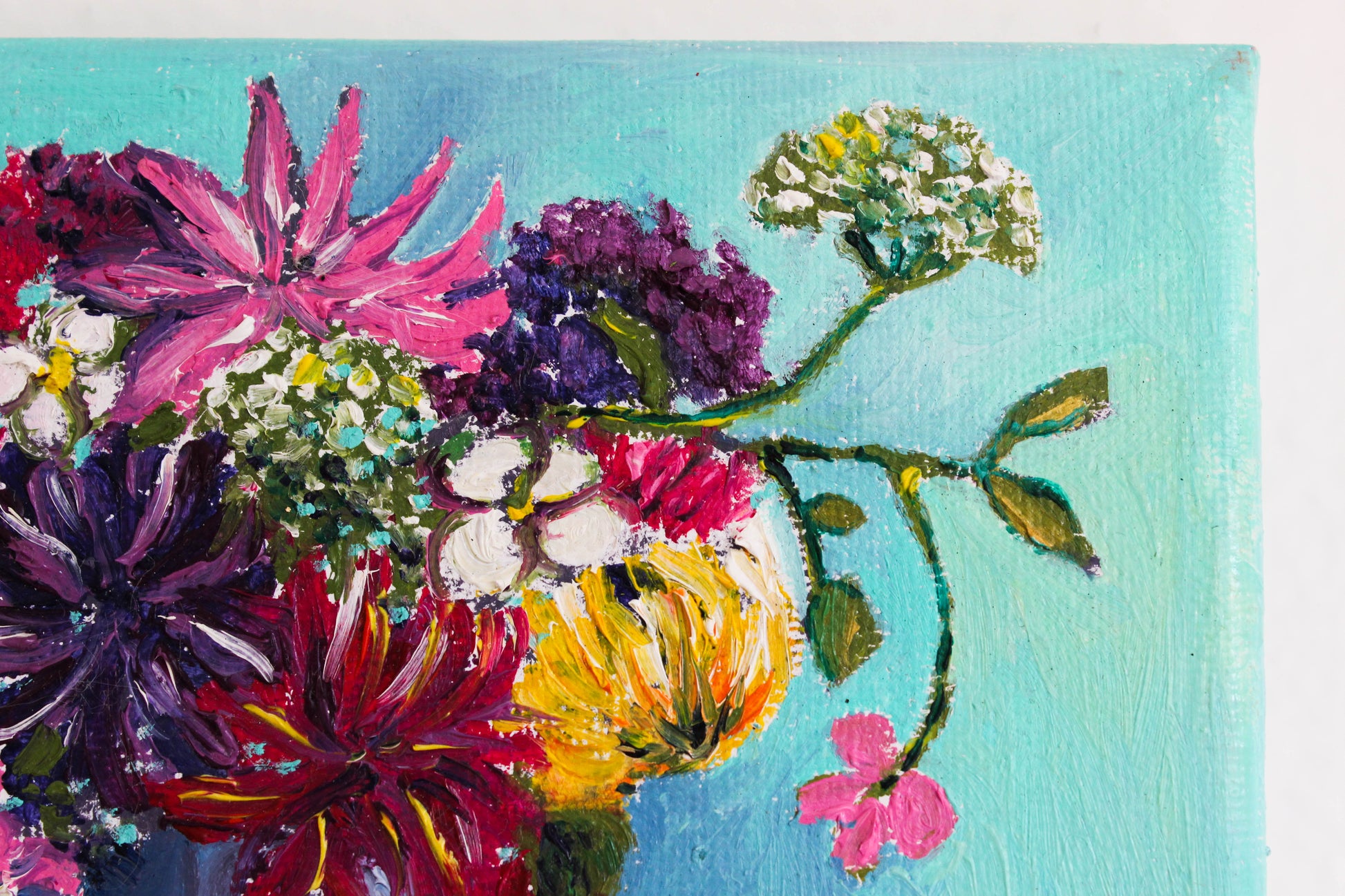 A beautiful and original oil painting with brush, featuring a gray vase with summer, colorful flowers.