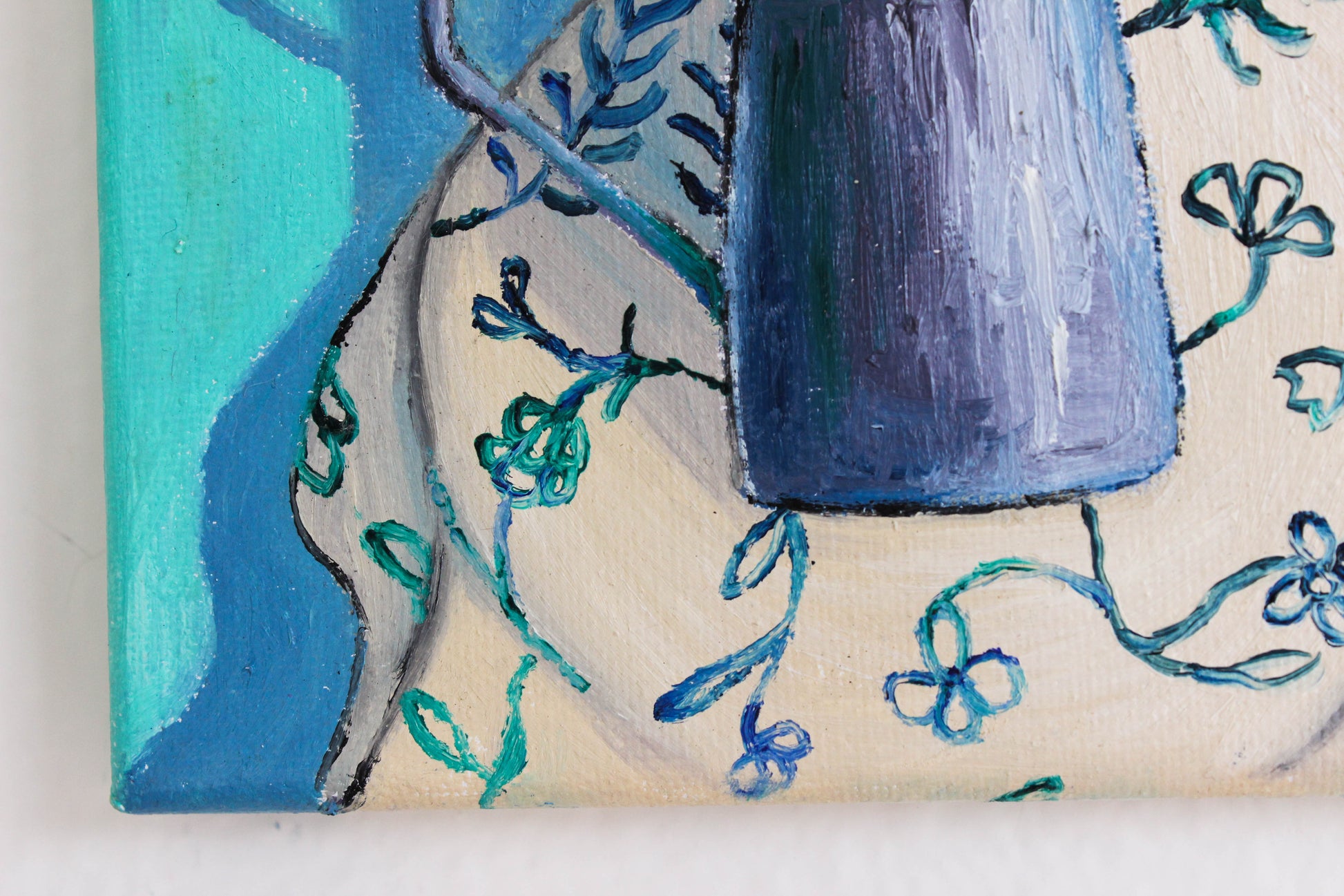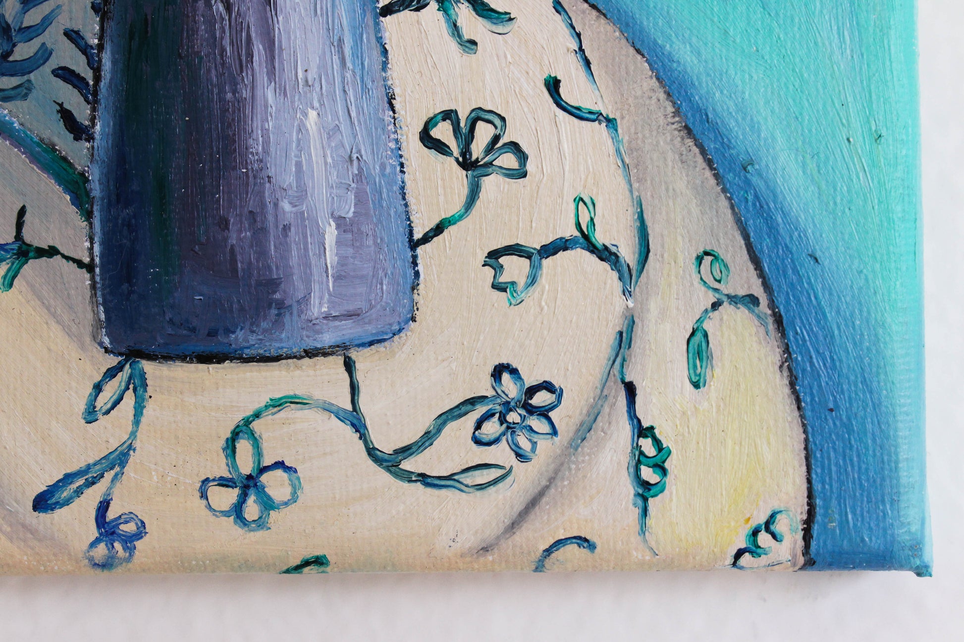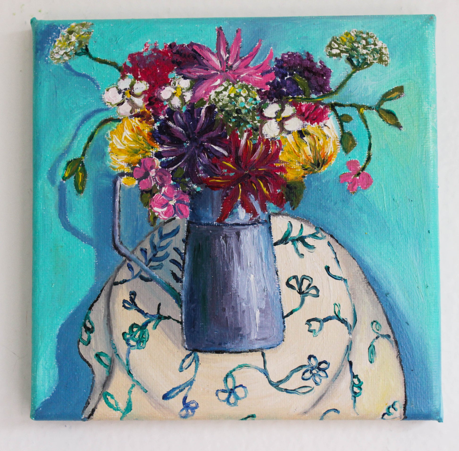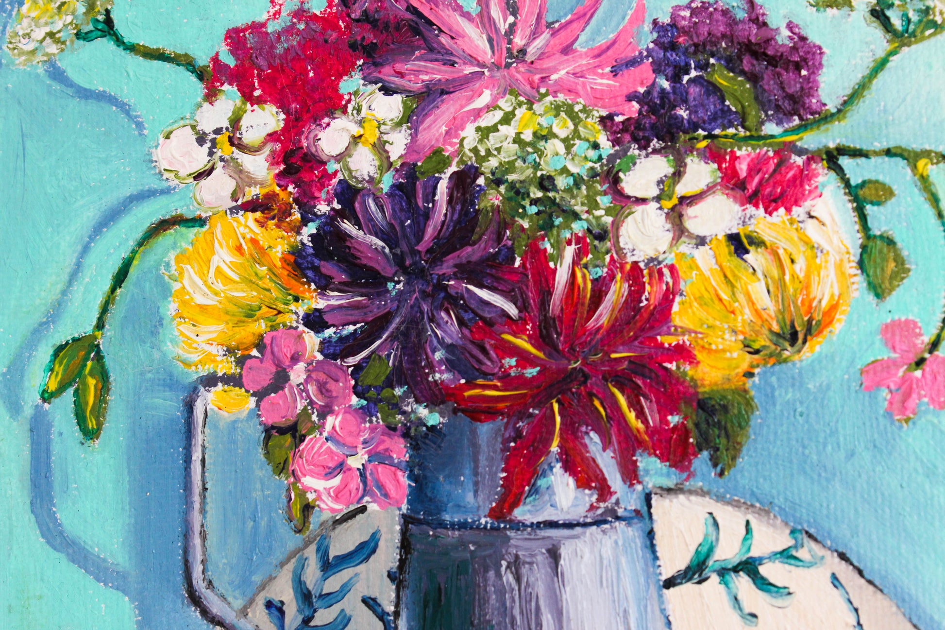 A beautiful and original oil painting with brush, featuring a gray vase with summer, colorful flowers.