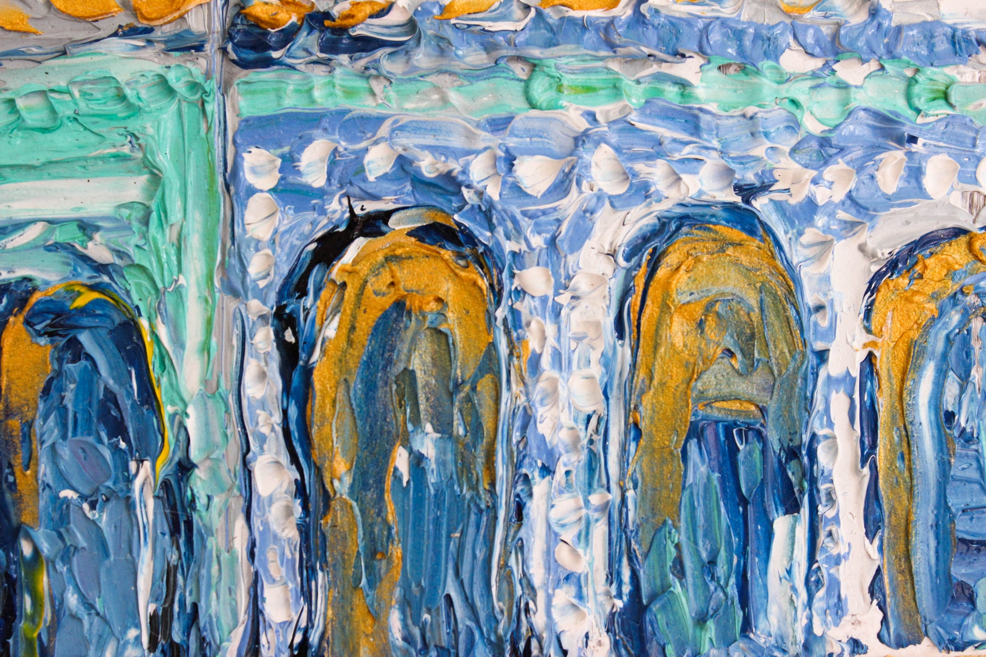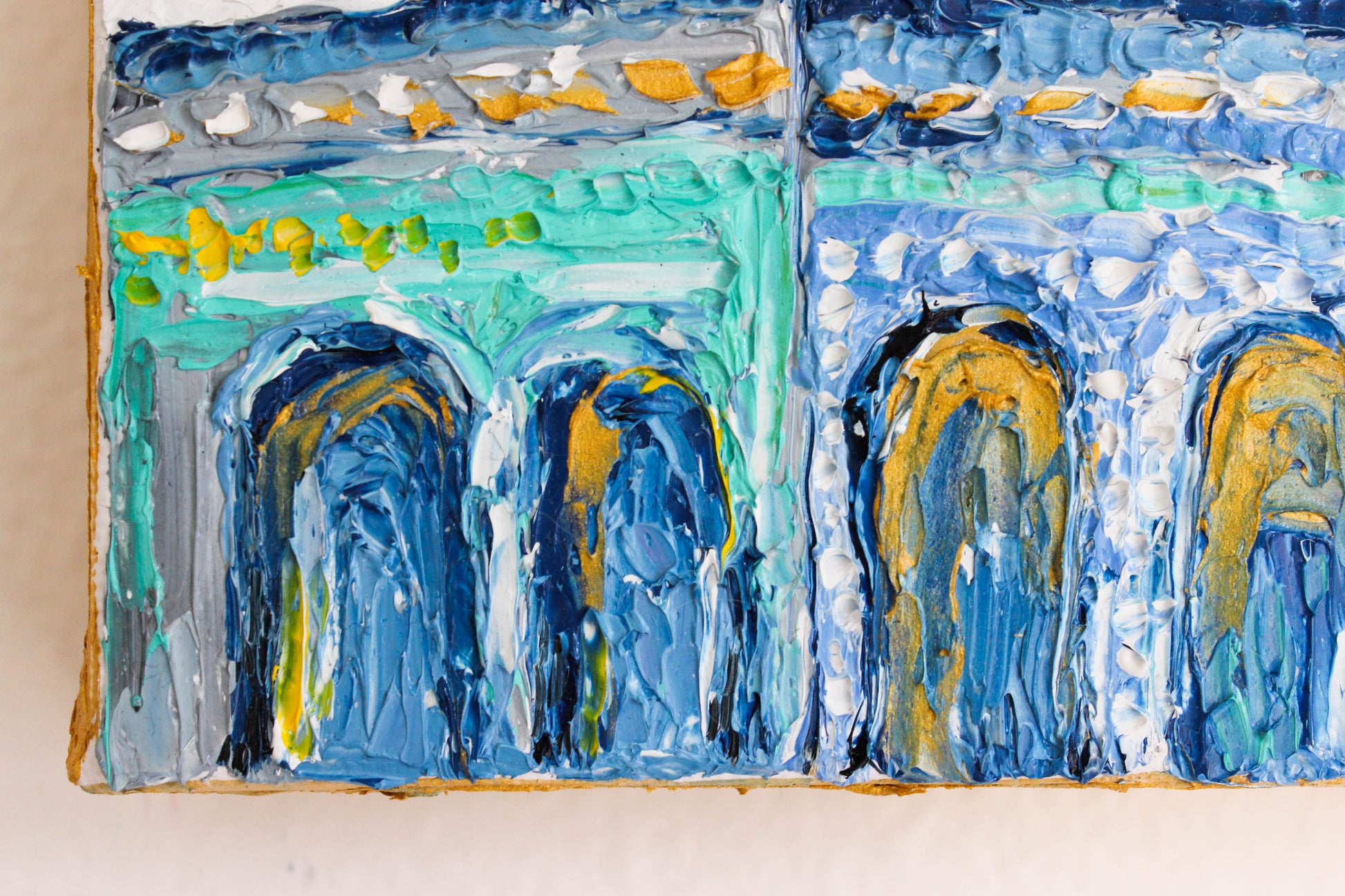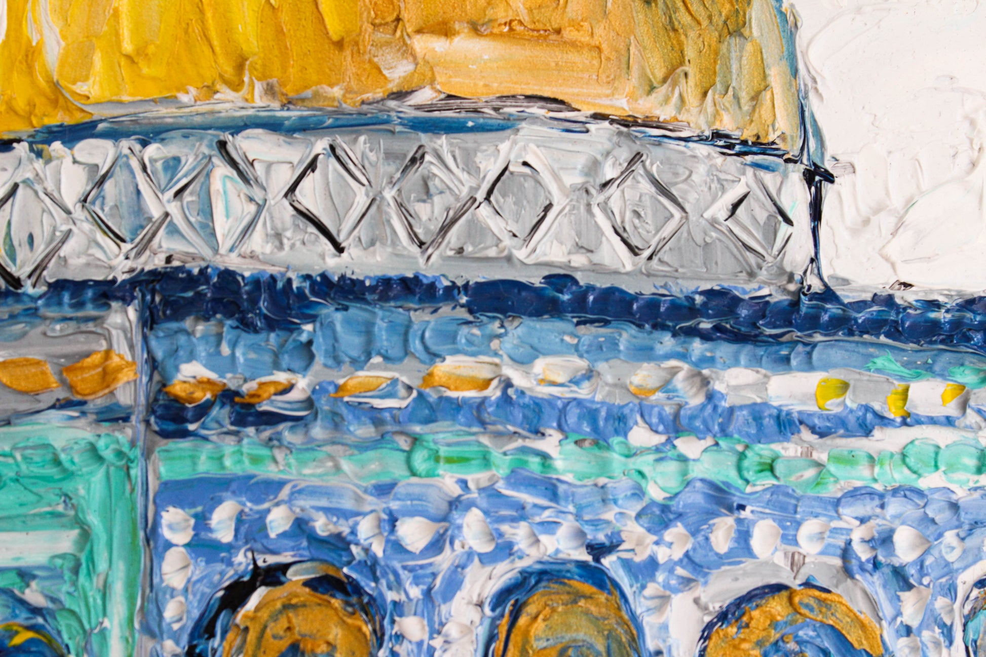 A textured deep impasto palette knife painting in oil, featuring the famous "Dome of the rock" located in the beautiful city of Jerusalem. This piece has several layers of paint, creating thick, luxurious textures in a beautiful color combination.