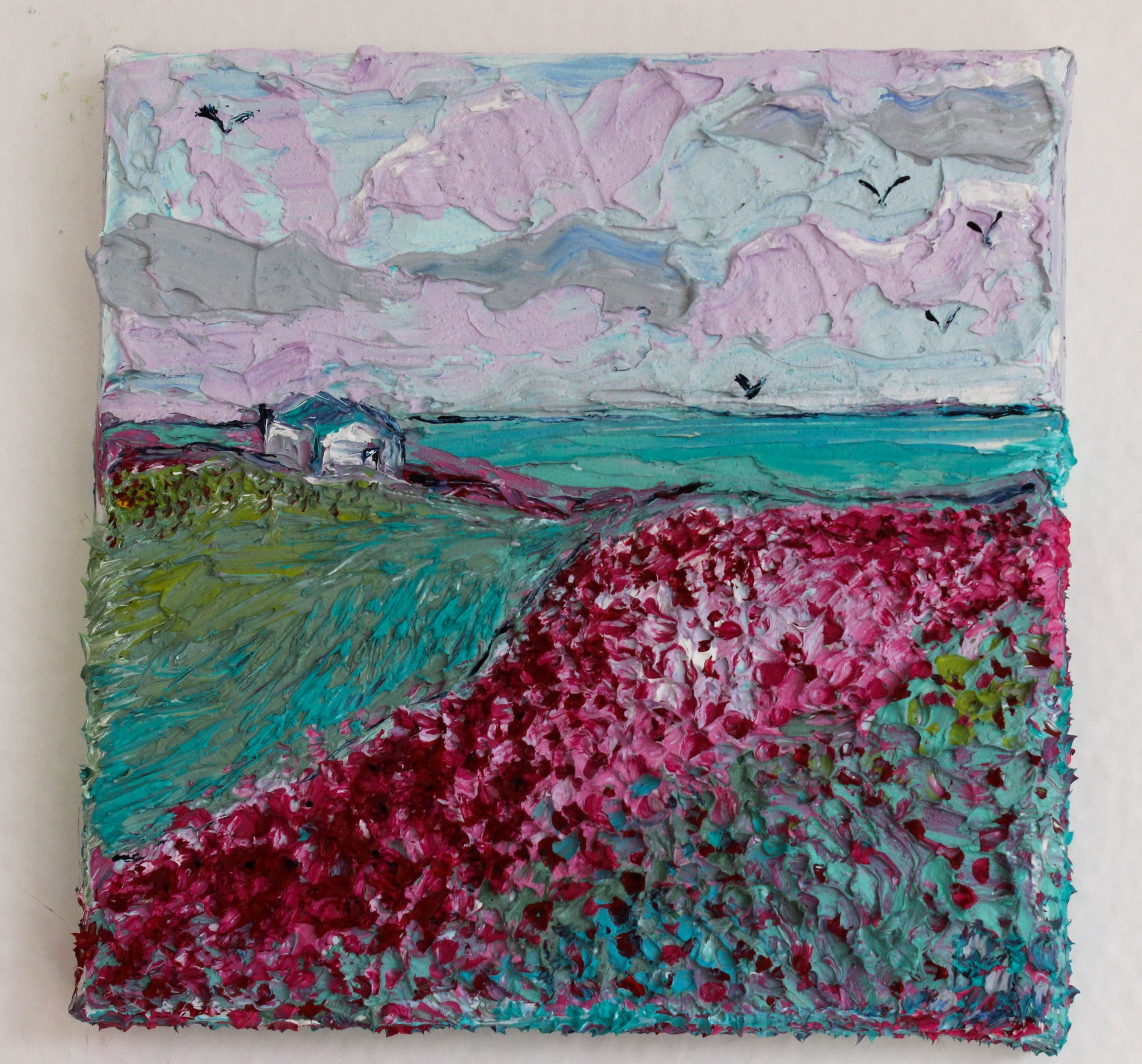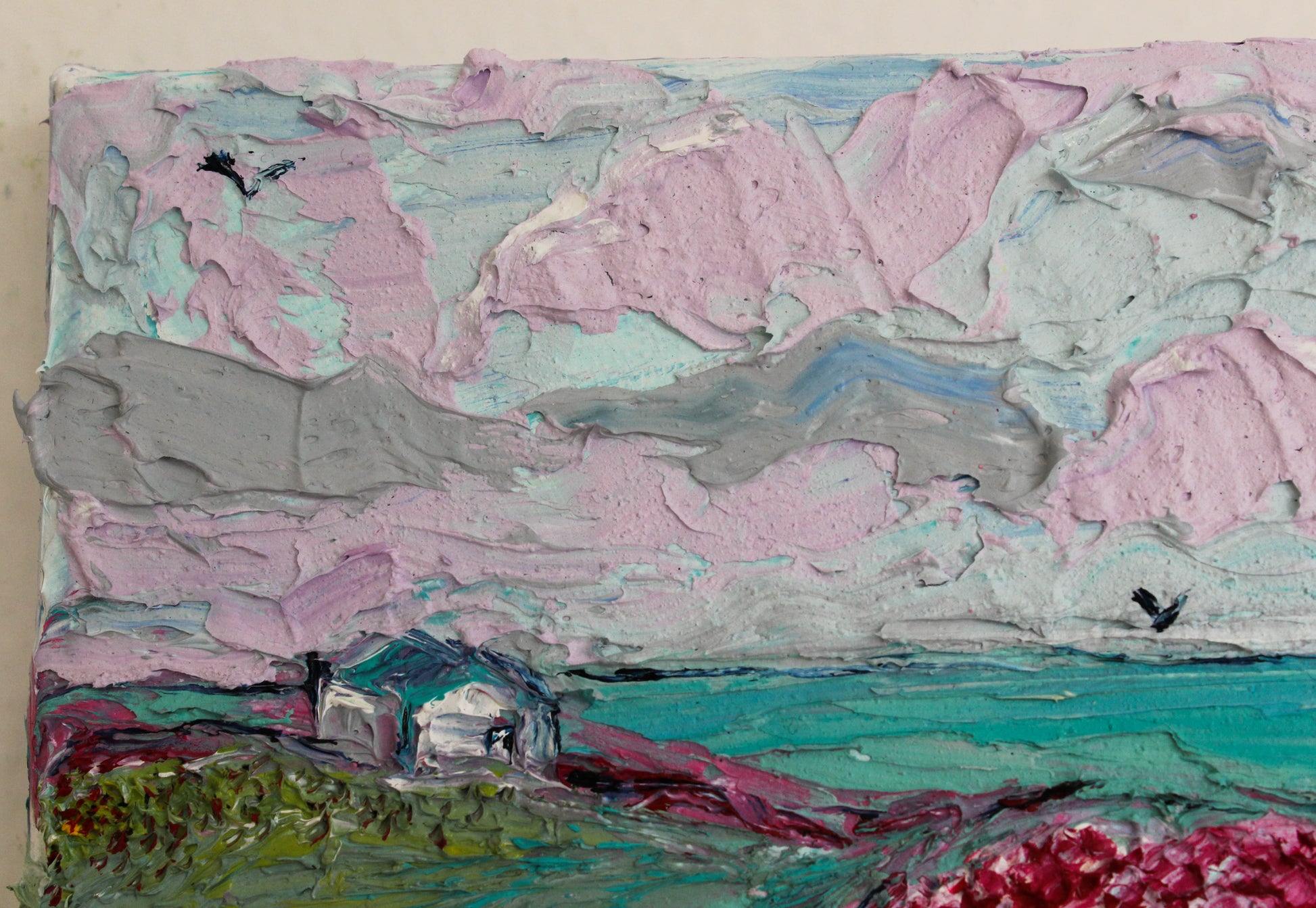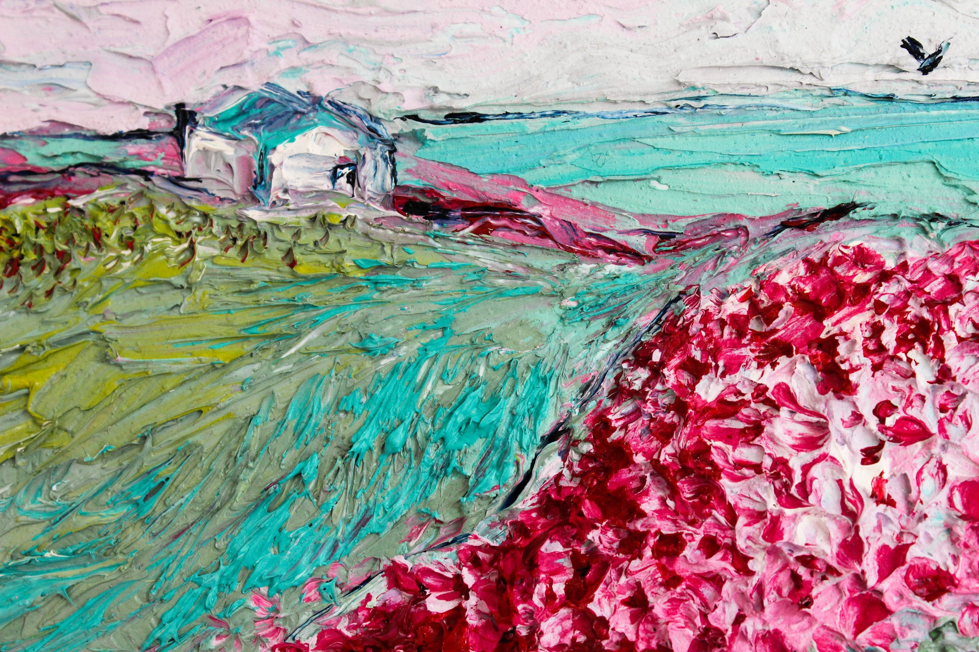 A textured, deep impasto palette knife painting in oil and cold wax, featuring a house on a hill during spring time. This piece has several layers of paint, creating thick, luxurious textures in a beautiful color combination.