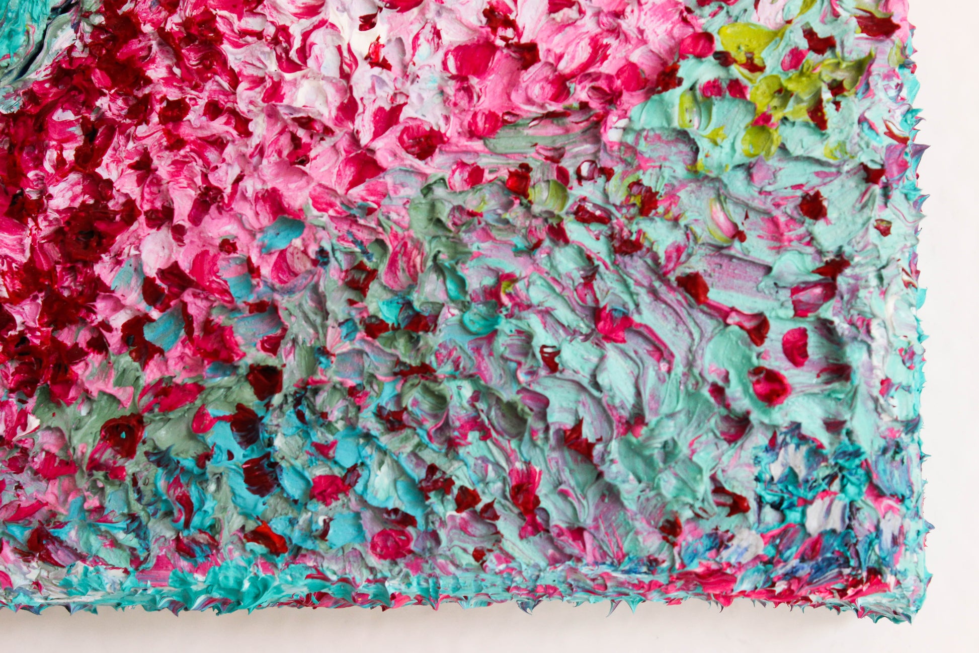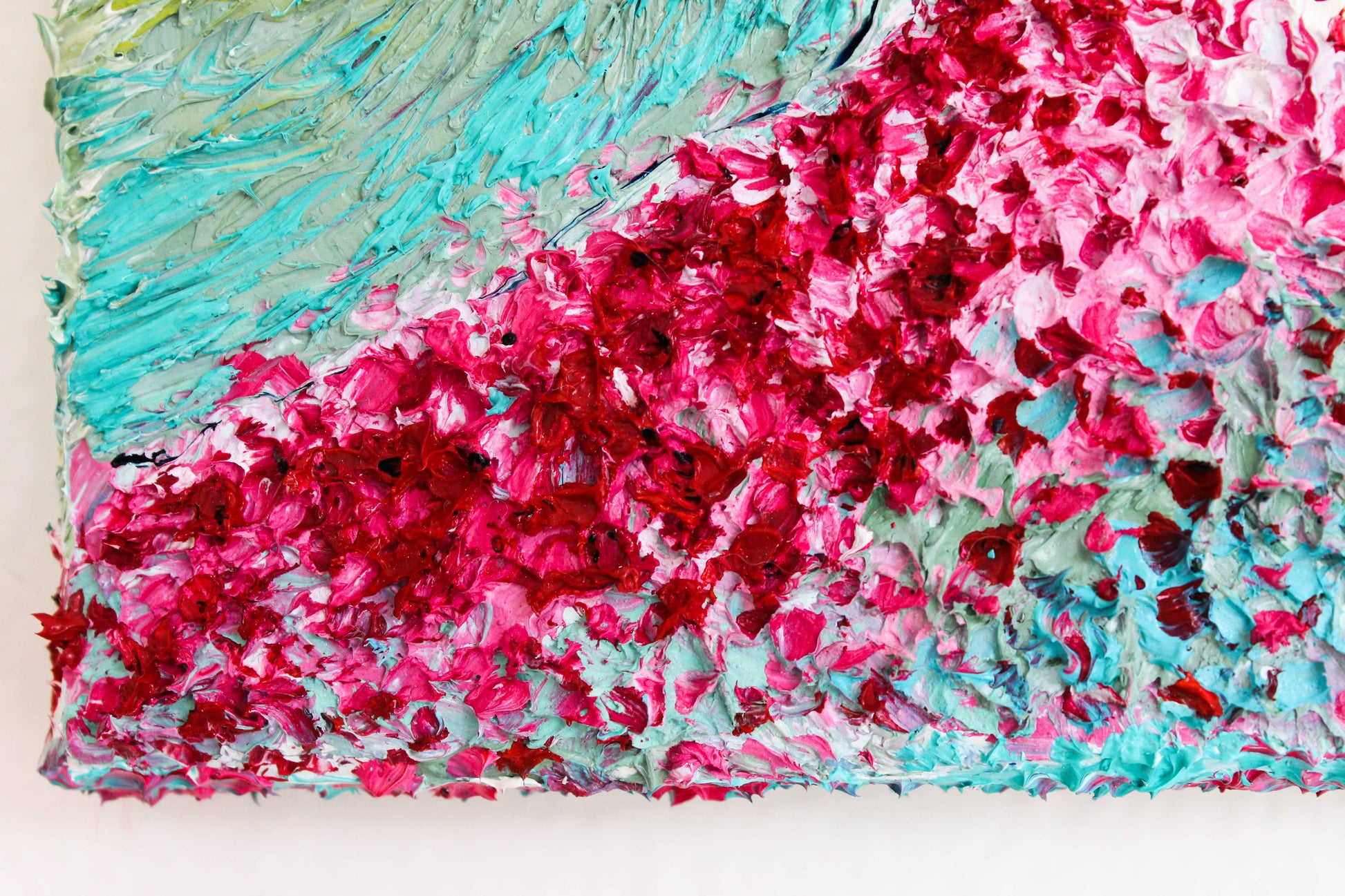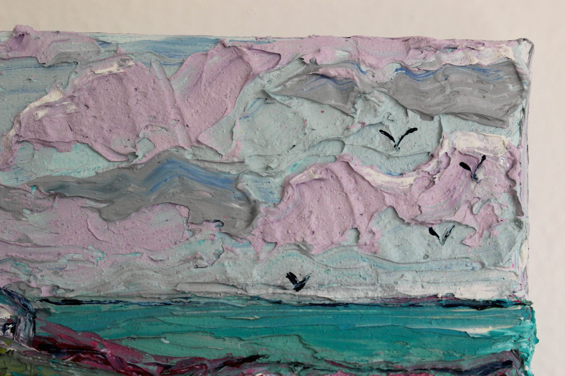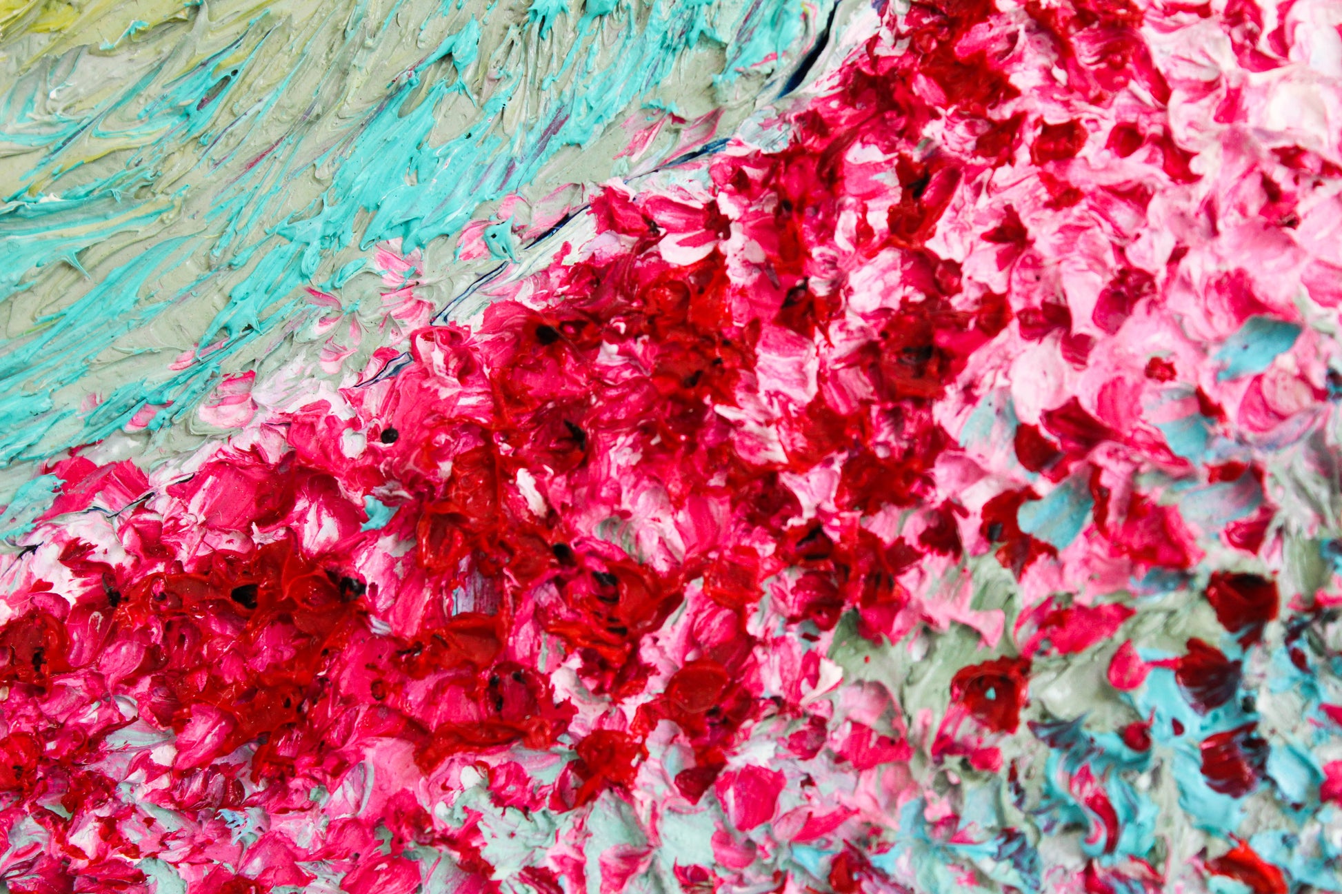 A textured, deep impasto palette knife painting in oil and cold wax, featuring a house on a hill during spring time. This piece has several layers of paint, creating thick, luxurious textures in a beautiful color combination.