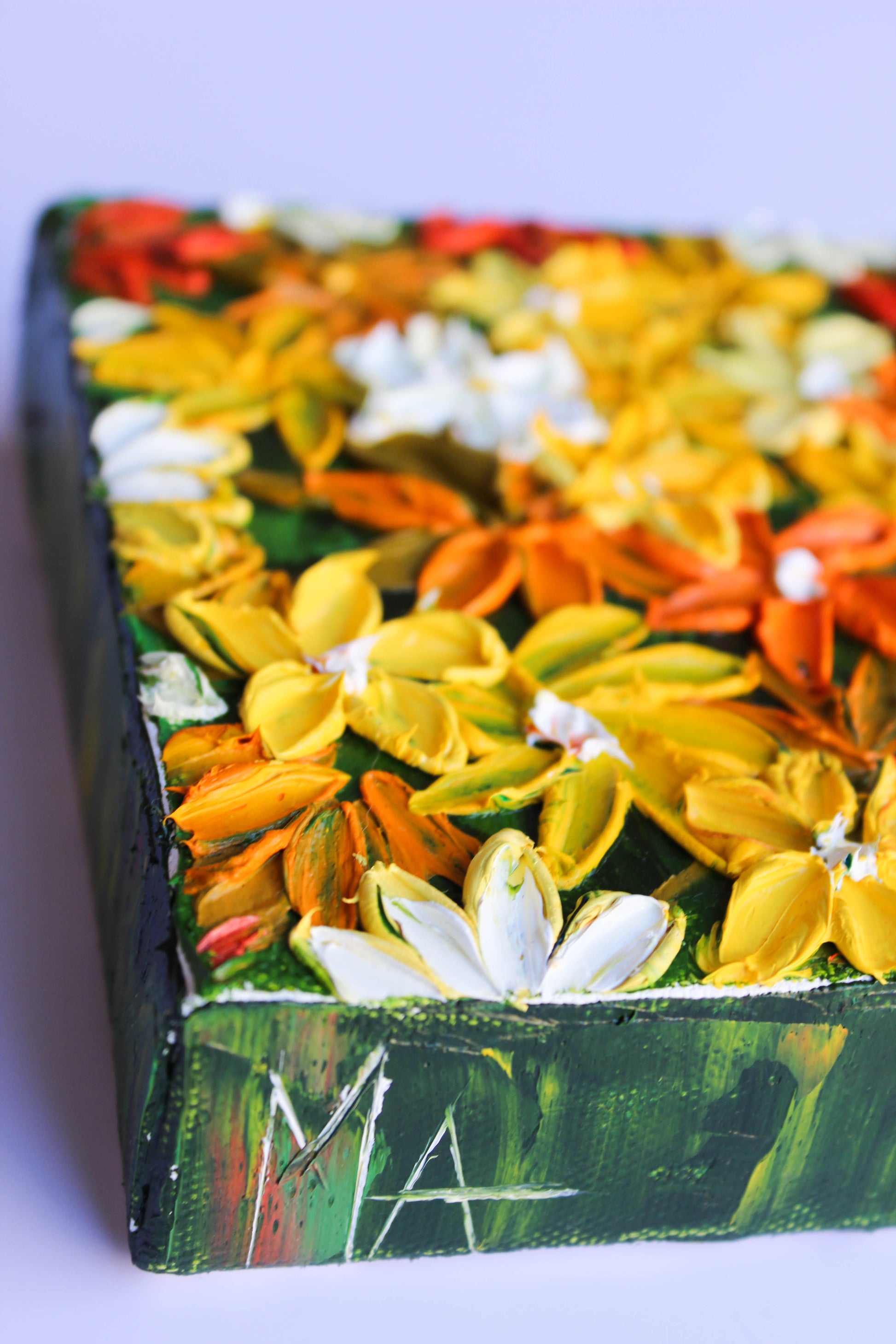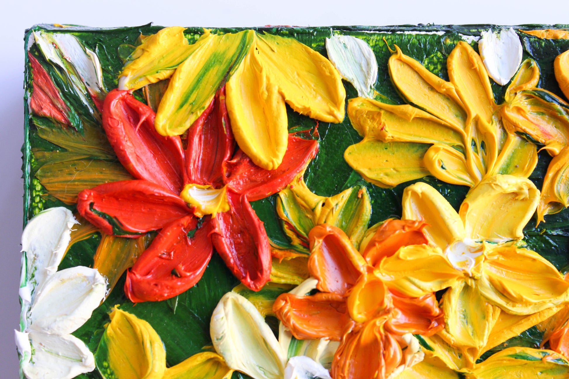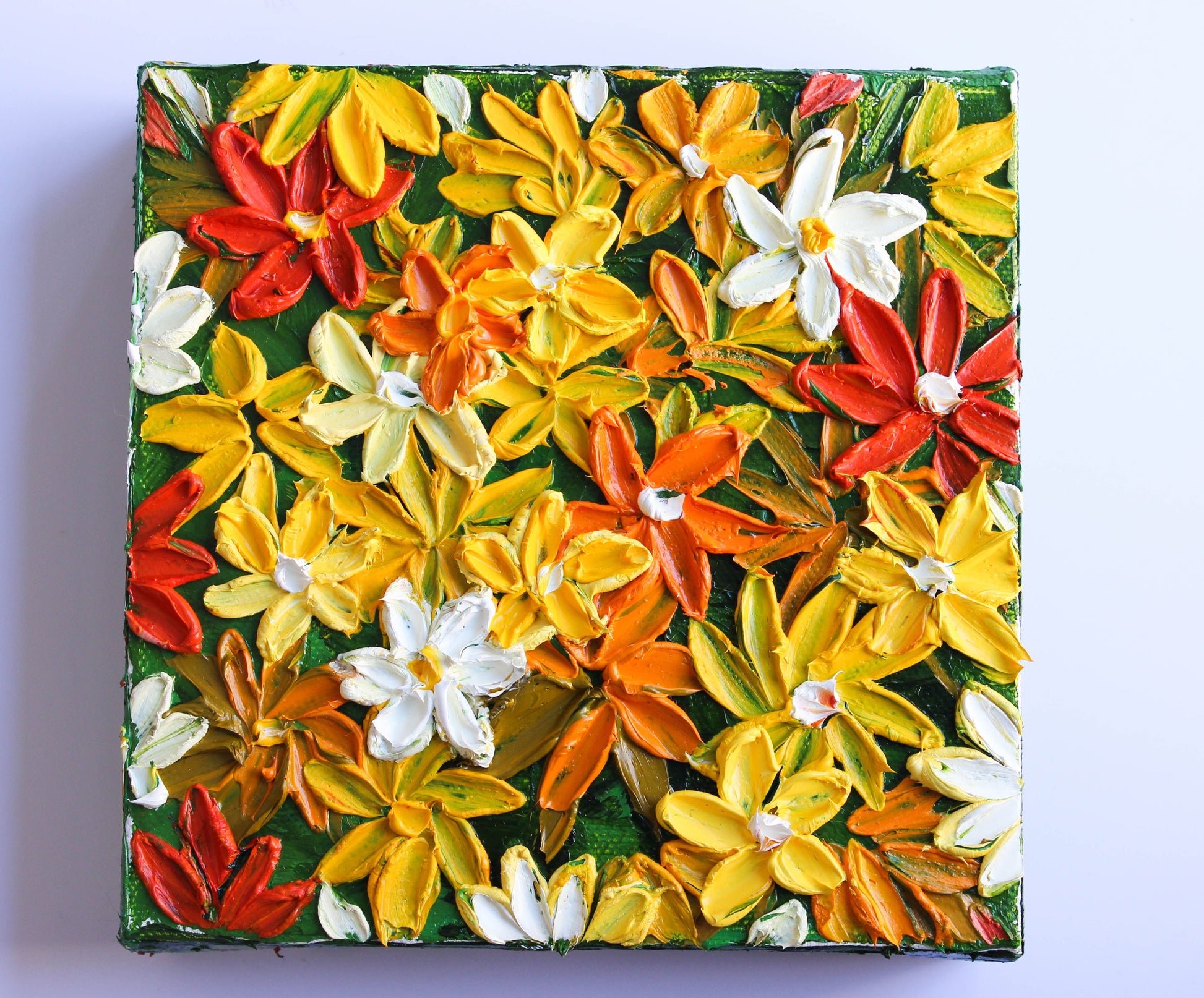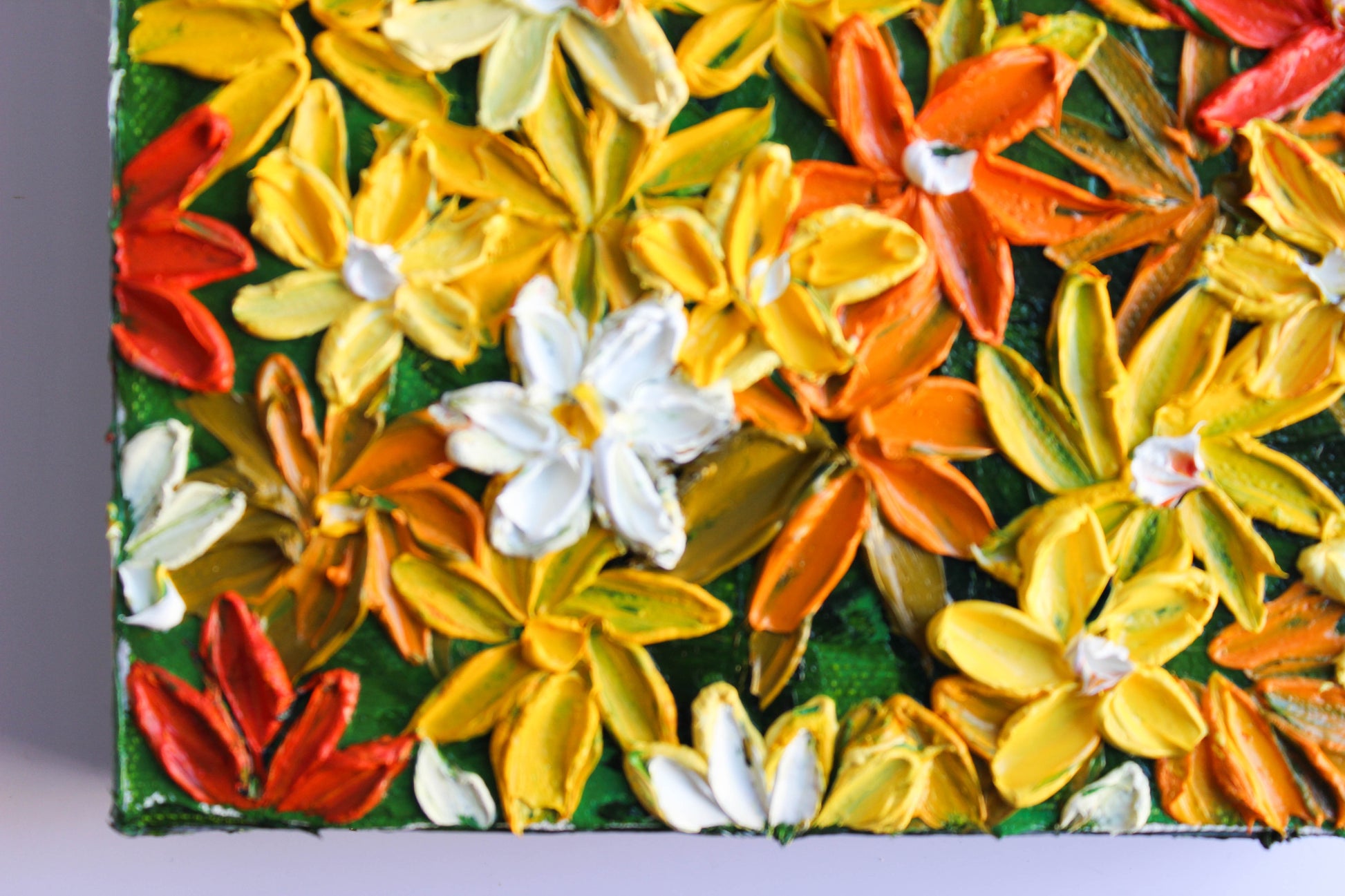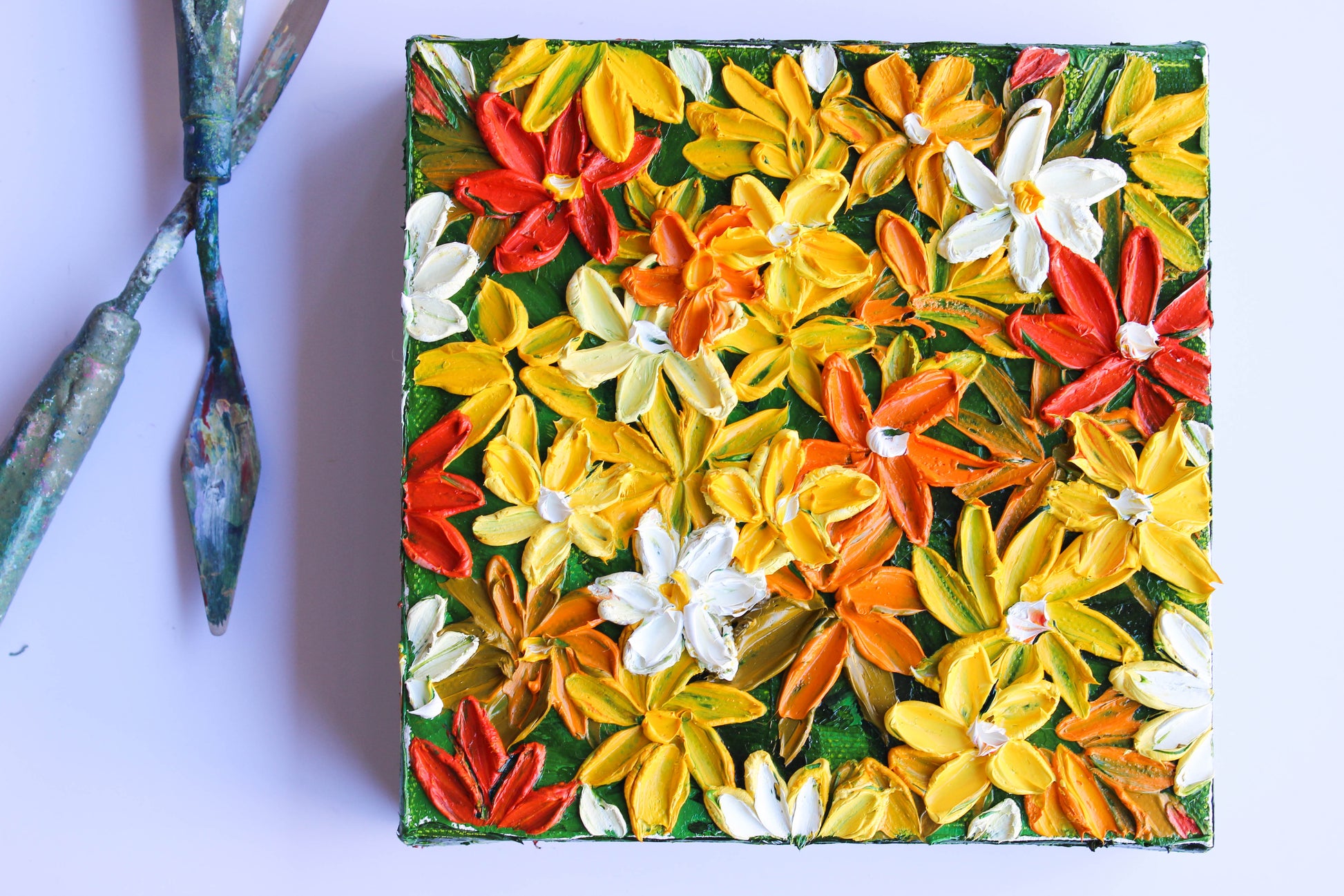 A textured deep impasto palette knife painting in oil, featuring beautiful, colorful flowers during fall time. This piece has several layers of paint creating thick, luxurious textures in a beautiful color combination.