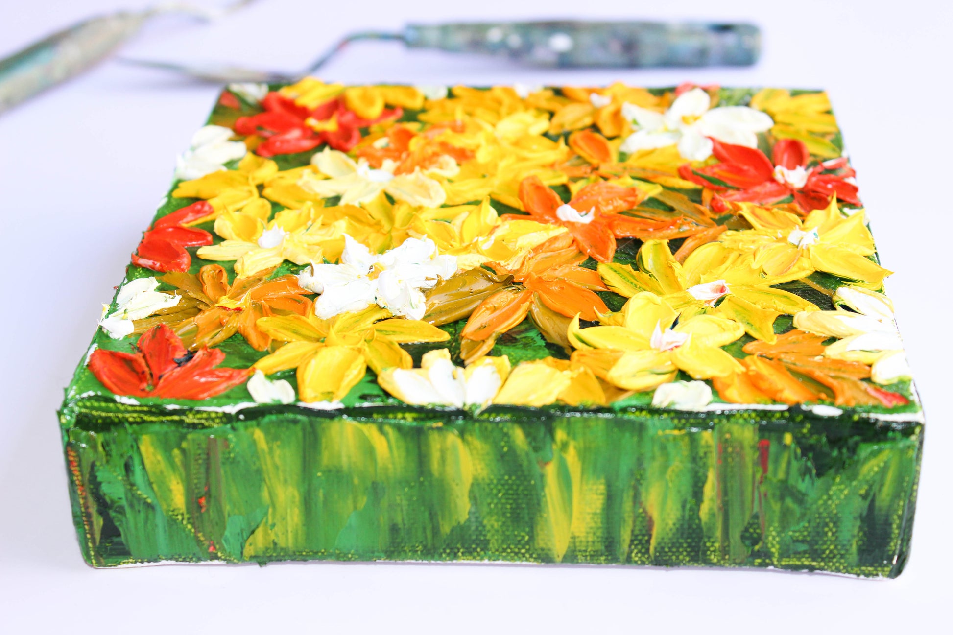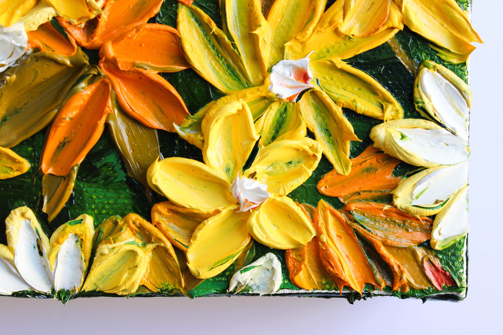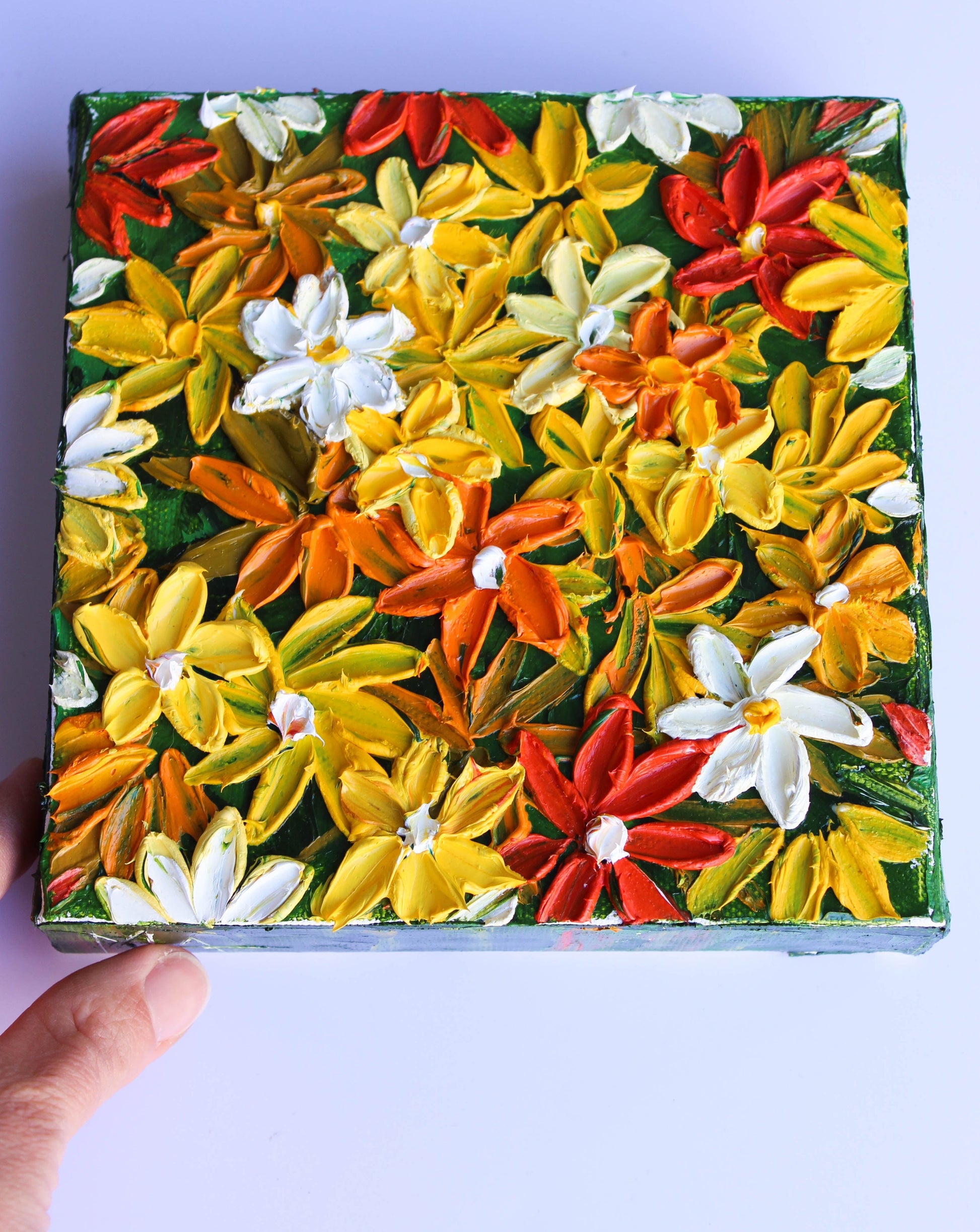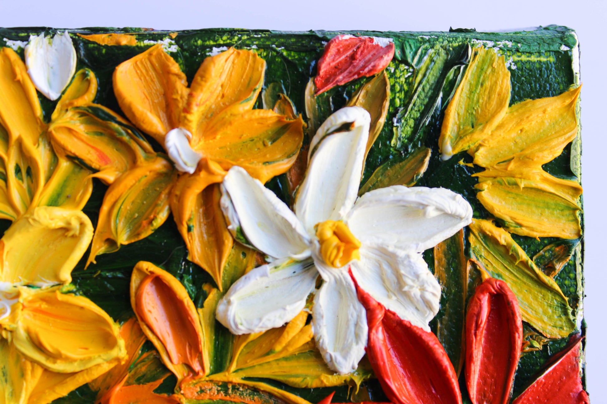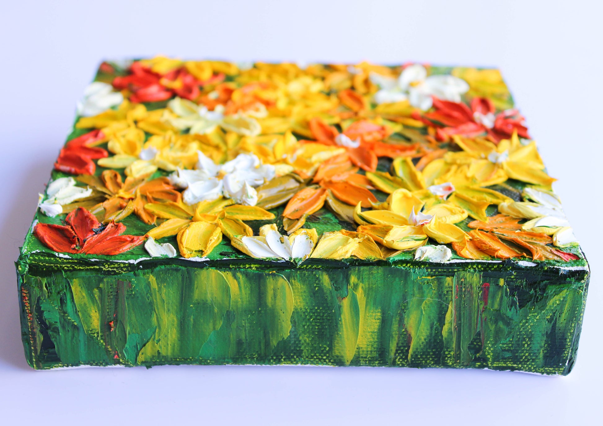 A textured deep impasto palette knife painting in oil, featuring beautiful, colorful flowers during fall time. This piece has several layers of paint creating thick, luxurious textures in a beautiful color combination.