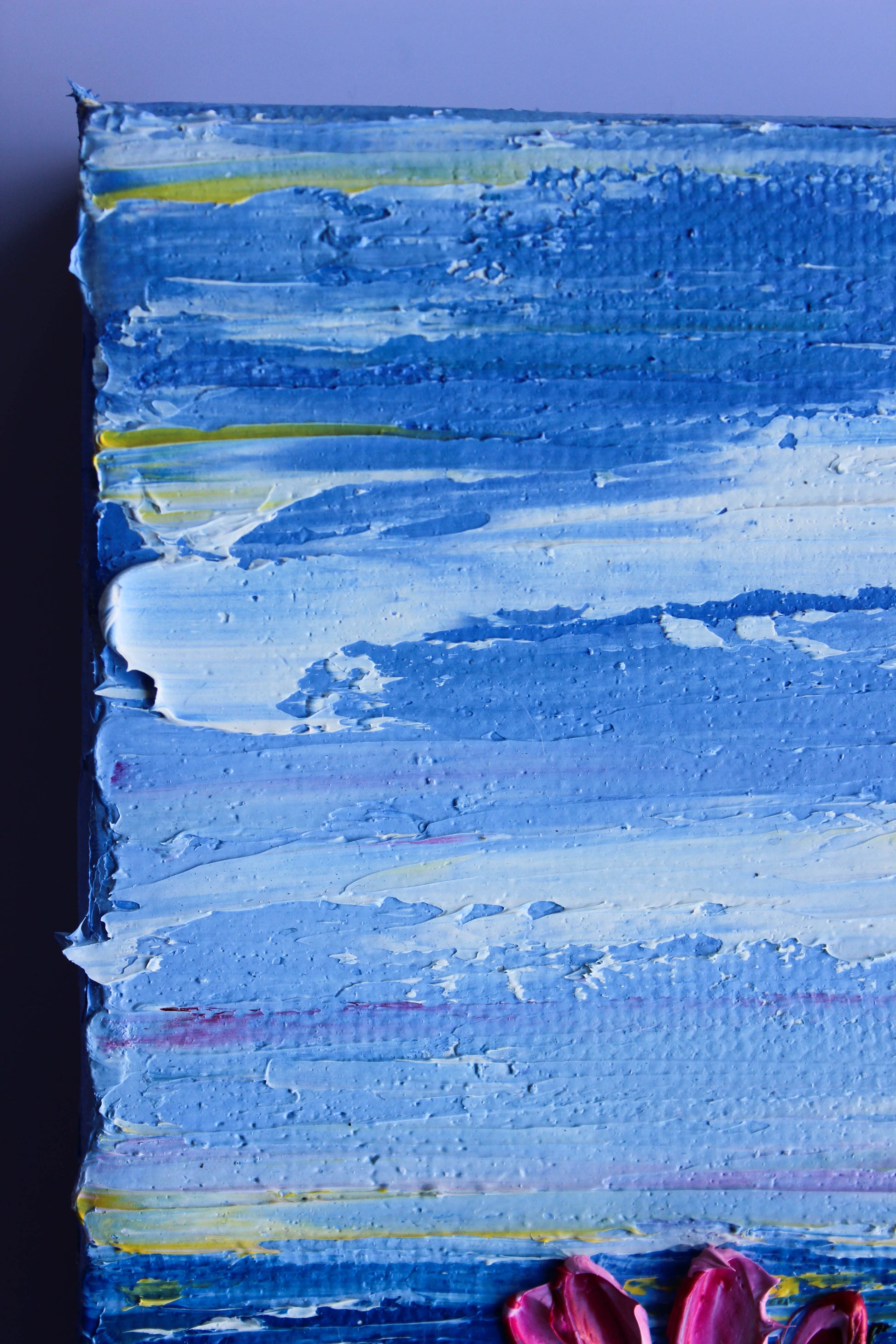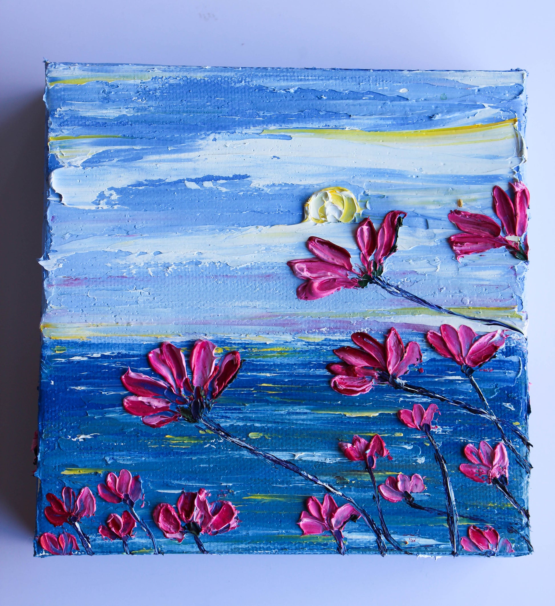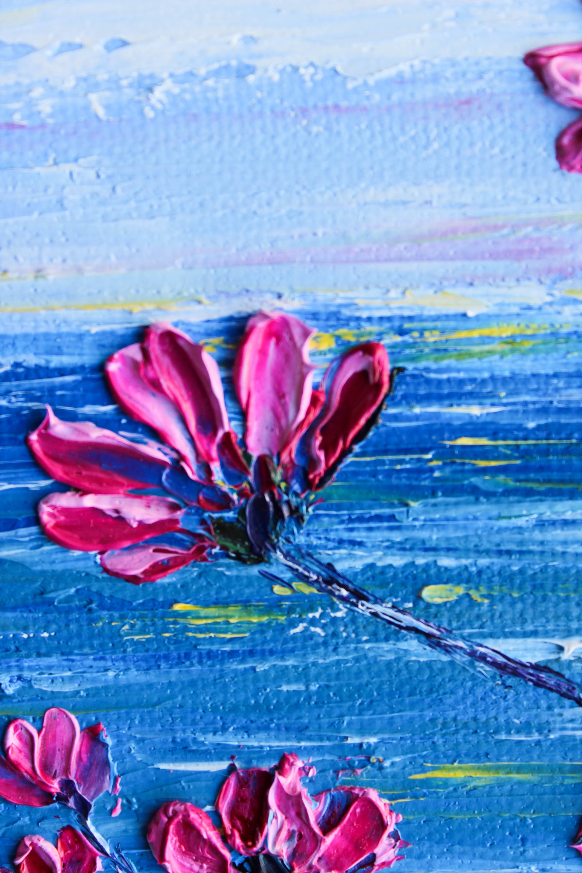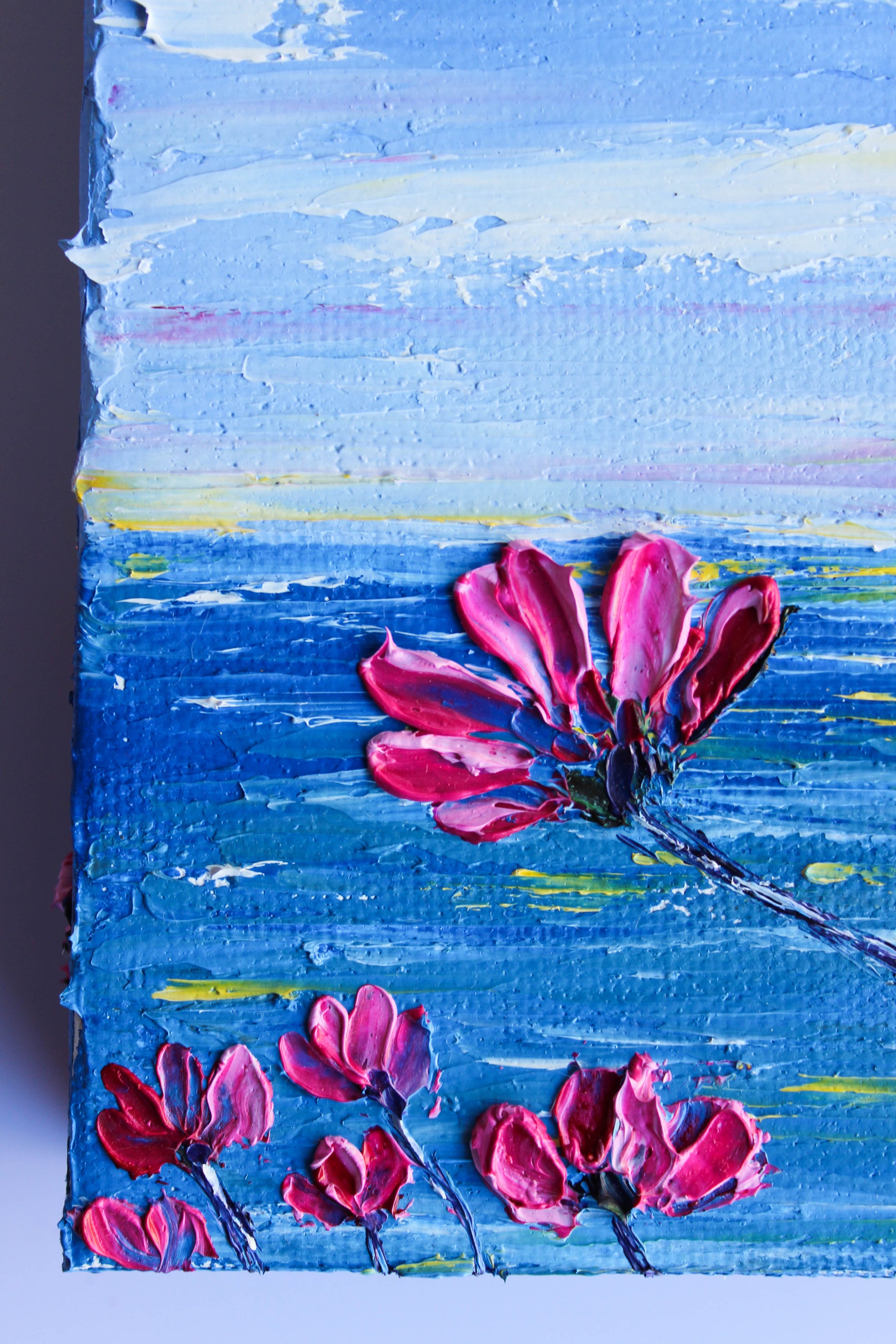 A textured palette knife painting in oil, featuring a beautiful seascape inspired by the "Del Mar" coast in SoCal. This piece has several layers of paint creating thick, luxurious textures with a beautiful, vivid color combination.