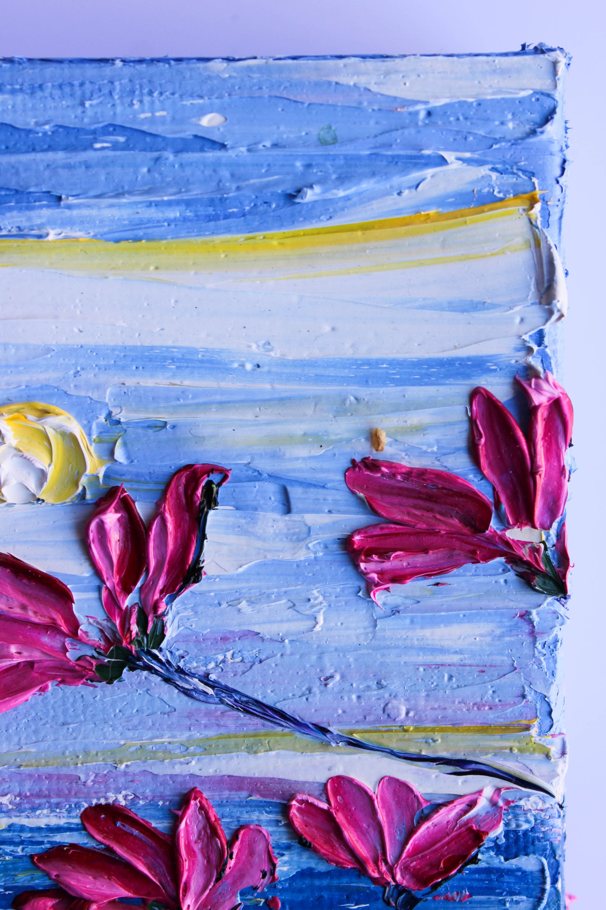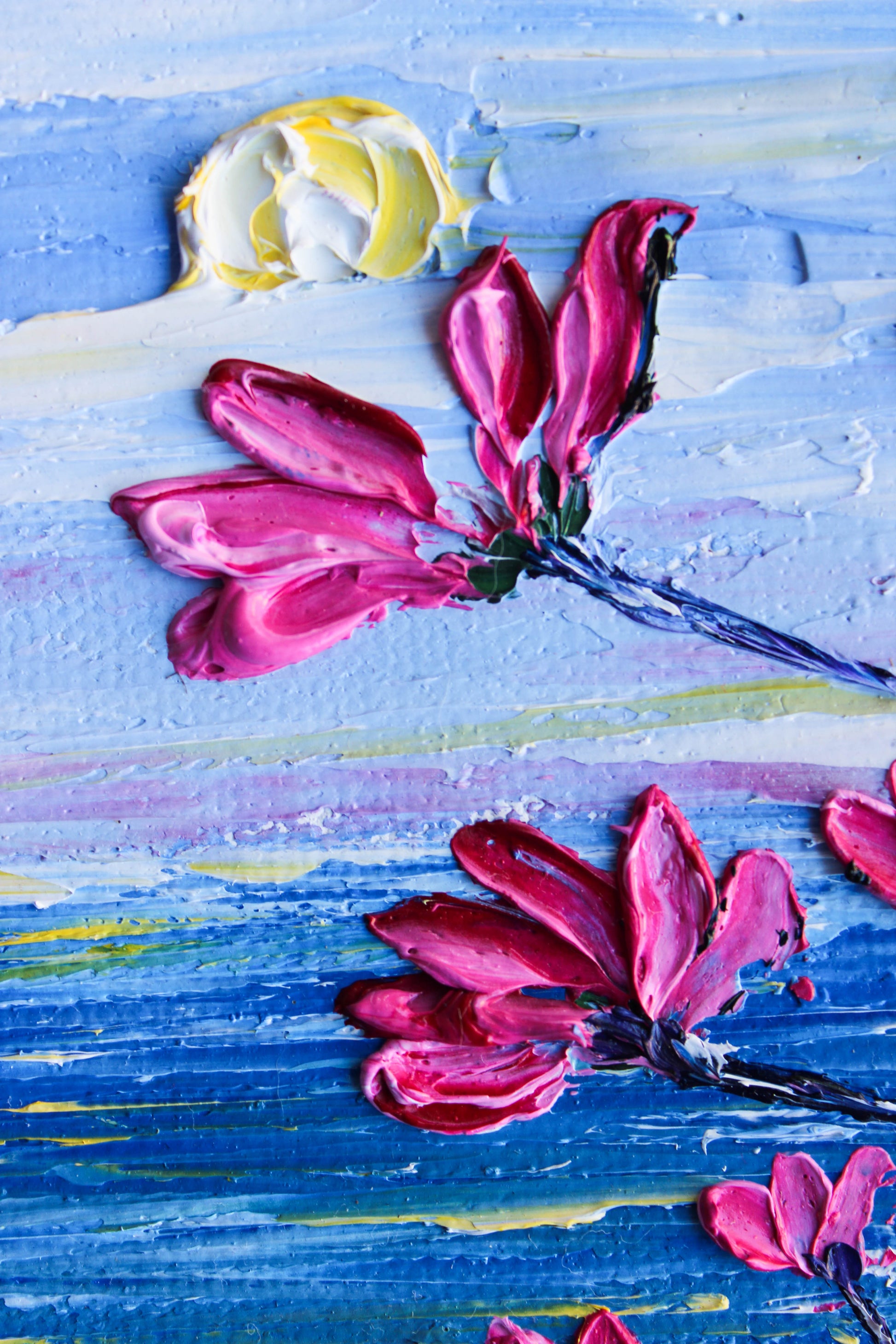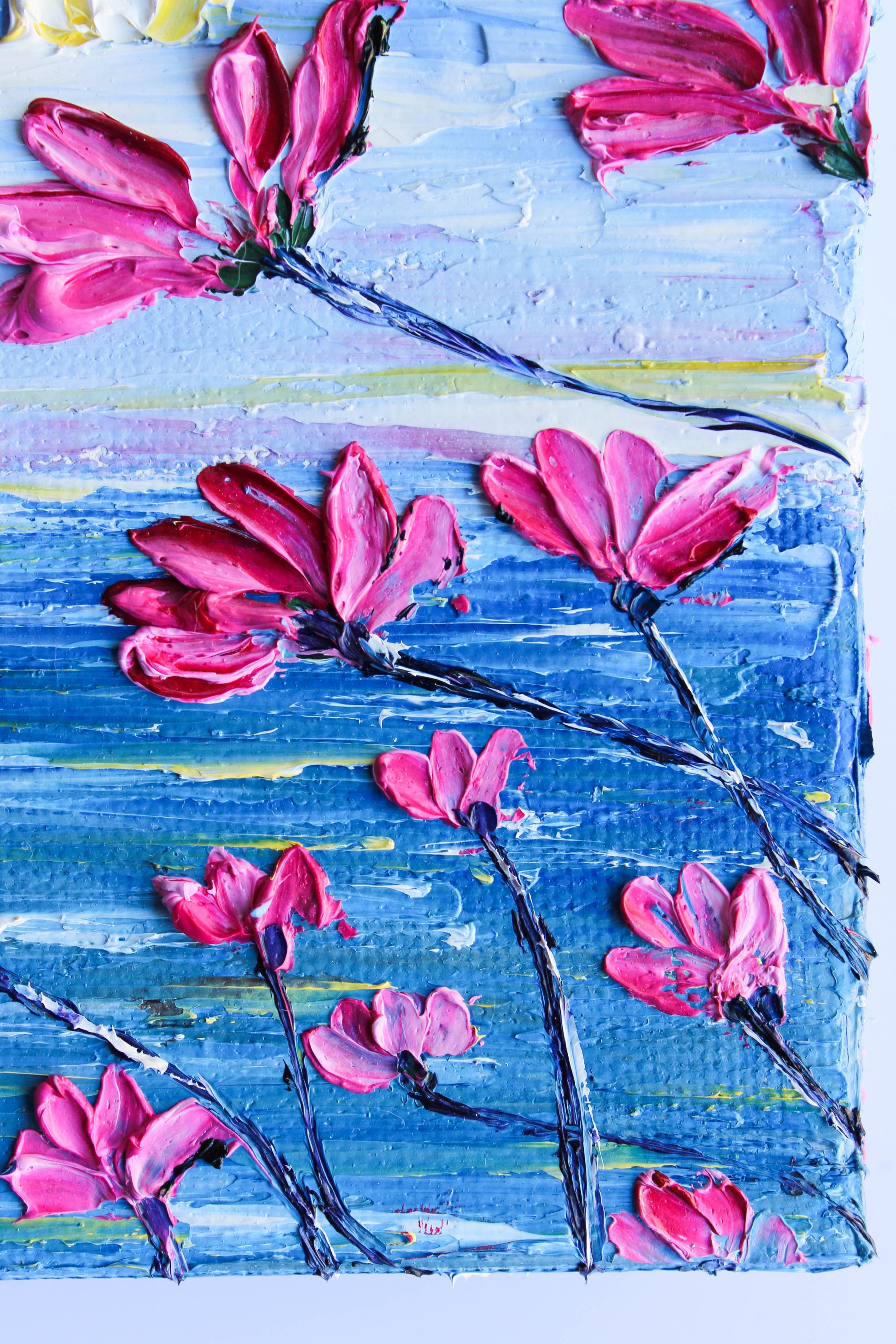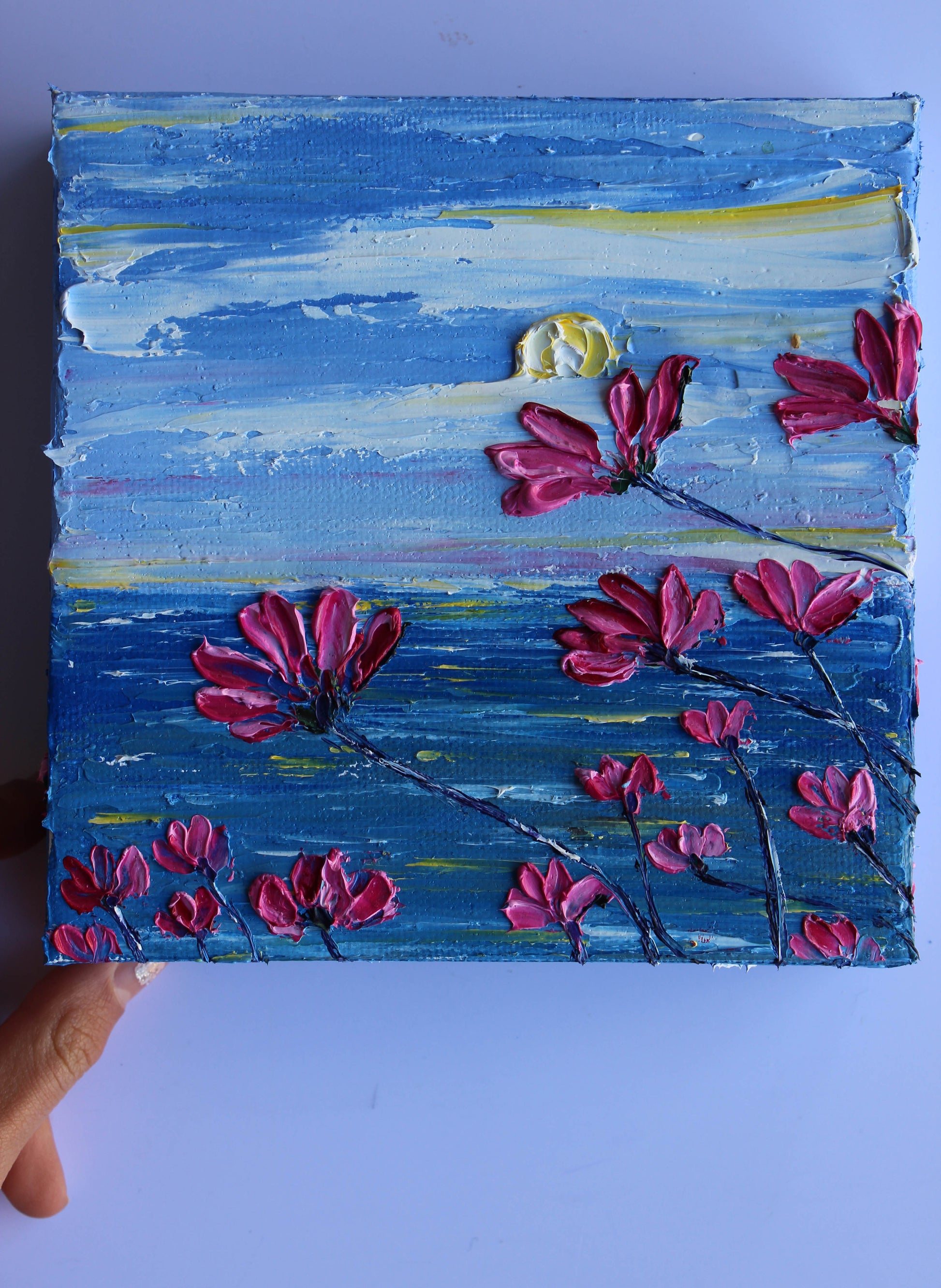 A textured palette knife painting in oil, featuring a beautiful seascape inspired by the "Del Mar" coast in SoCal. This piece has several layers of paint creating thick, luxurious textures with a beautiful, vivid color combination.