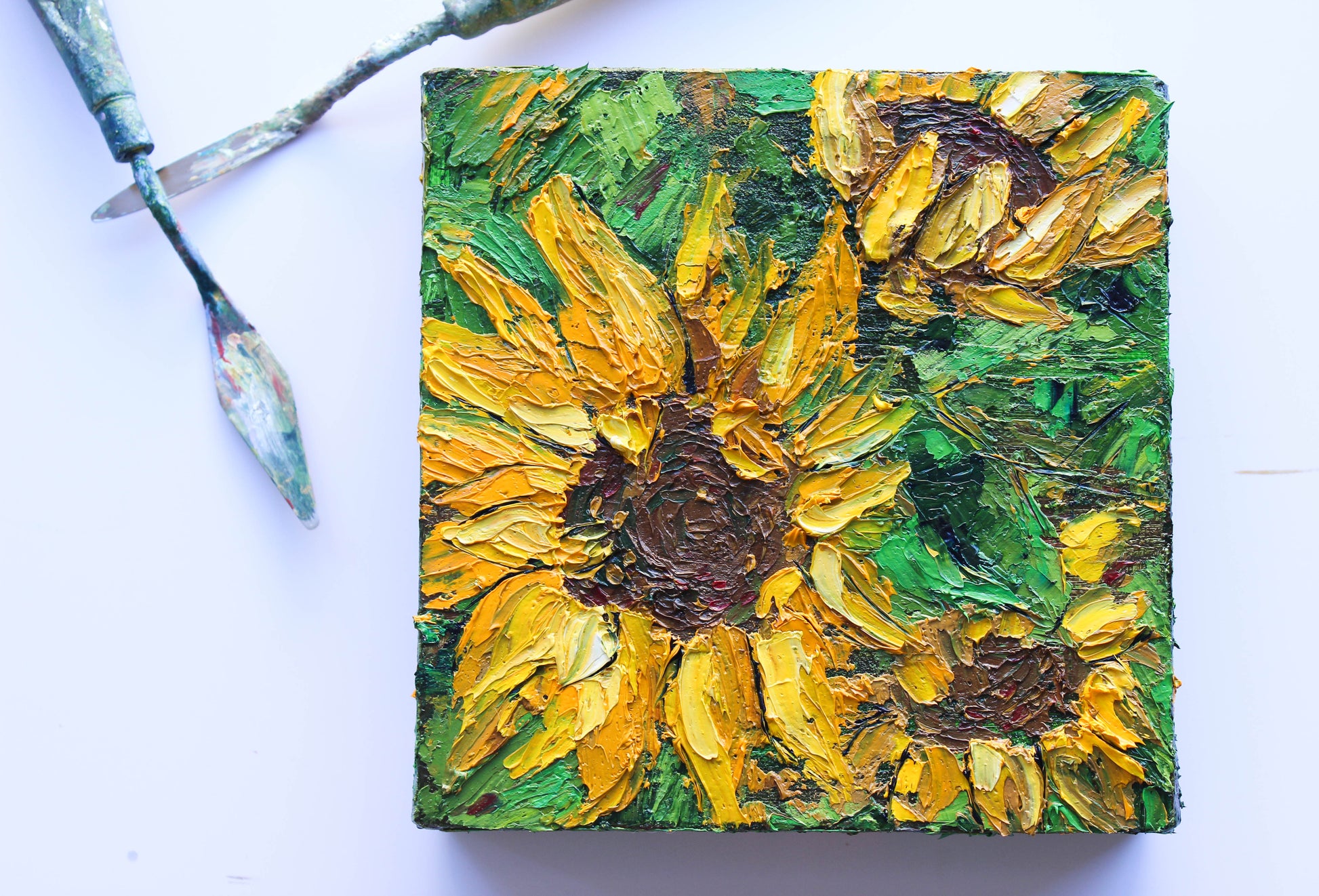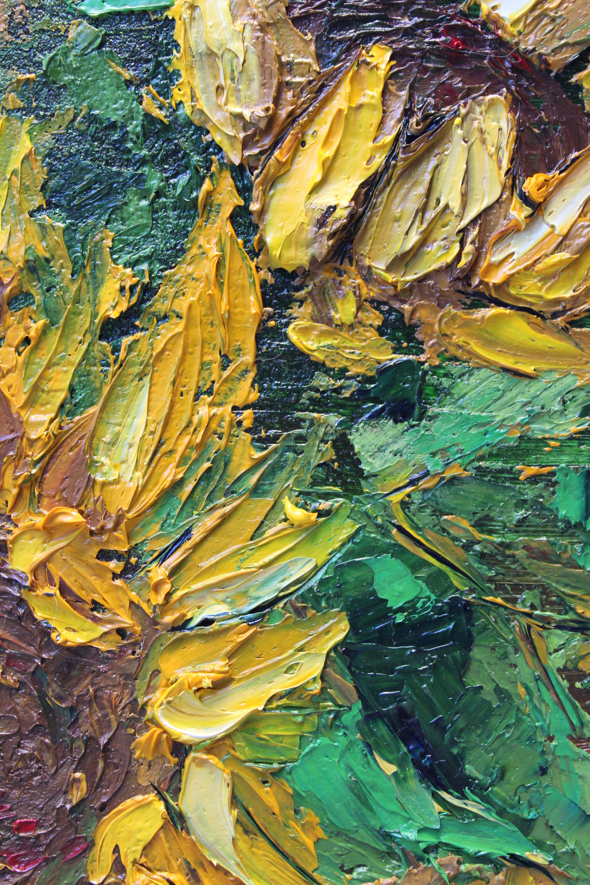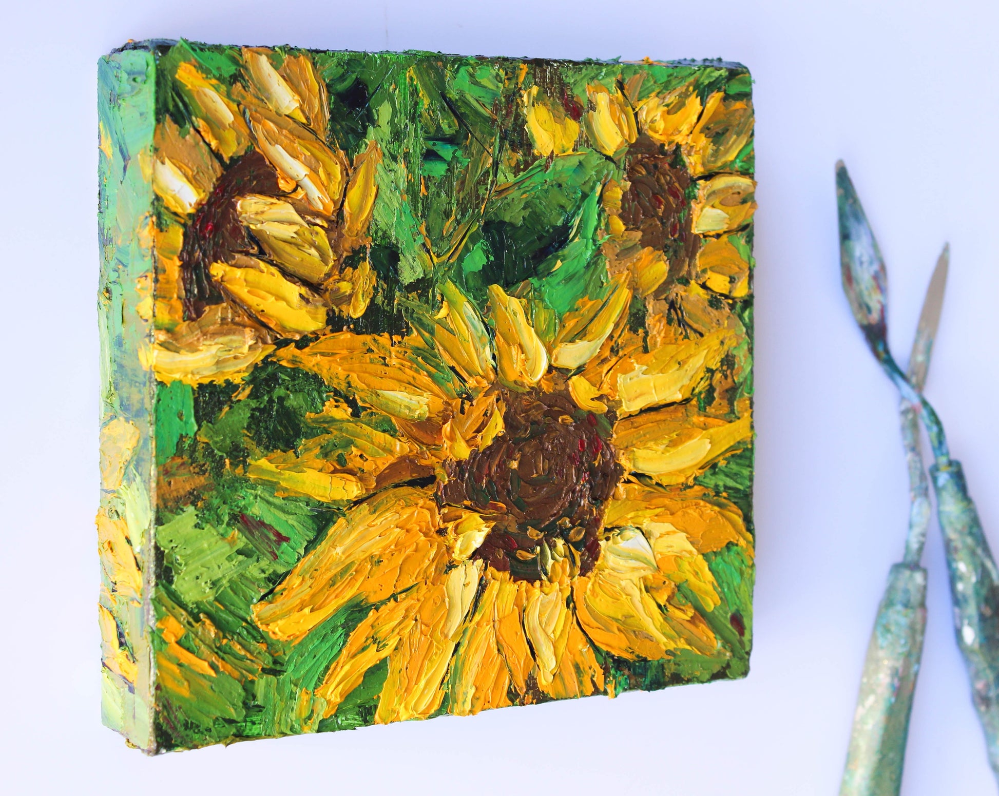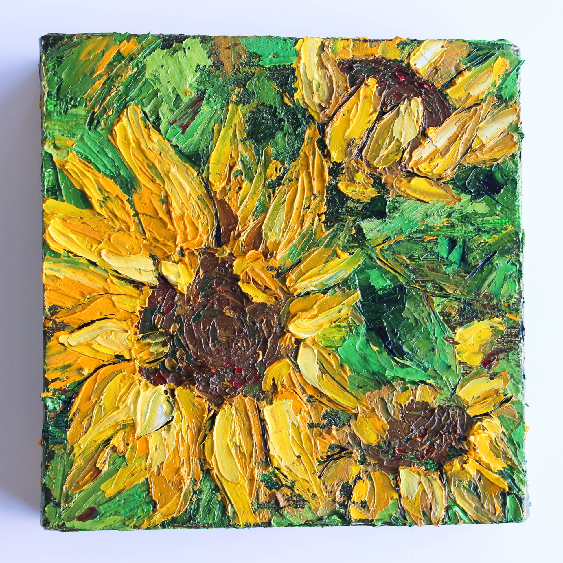 A textured impasto palette knife painting in oil, featuring three beautiful sunflowers. This piece has several layers of paint creating thick, luxurious textures in a beautiful color combination.
