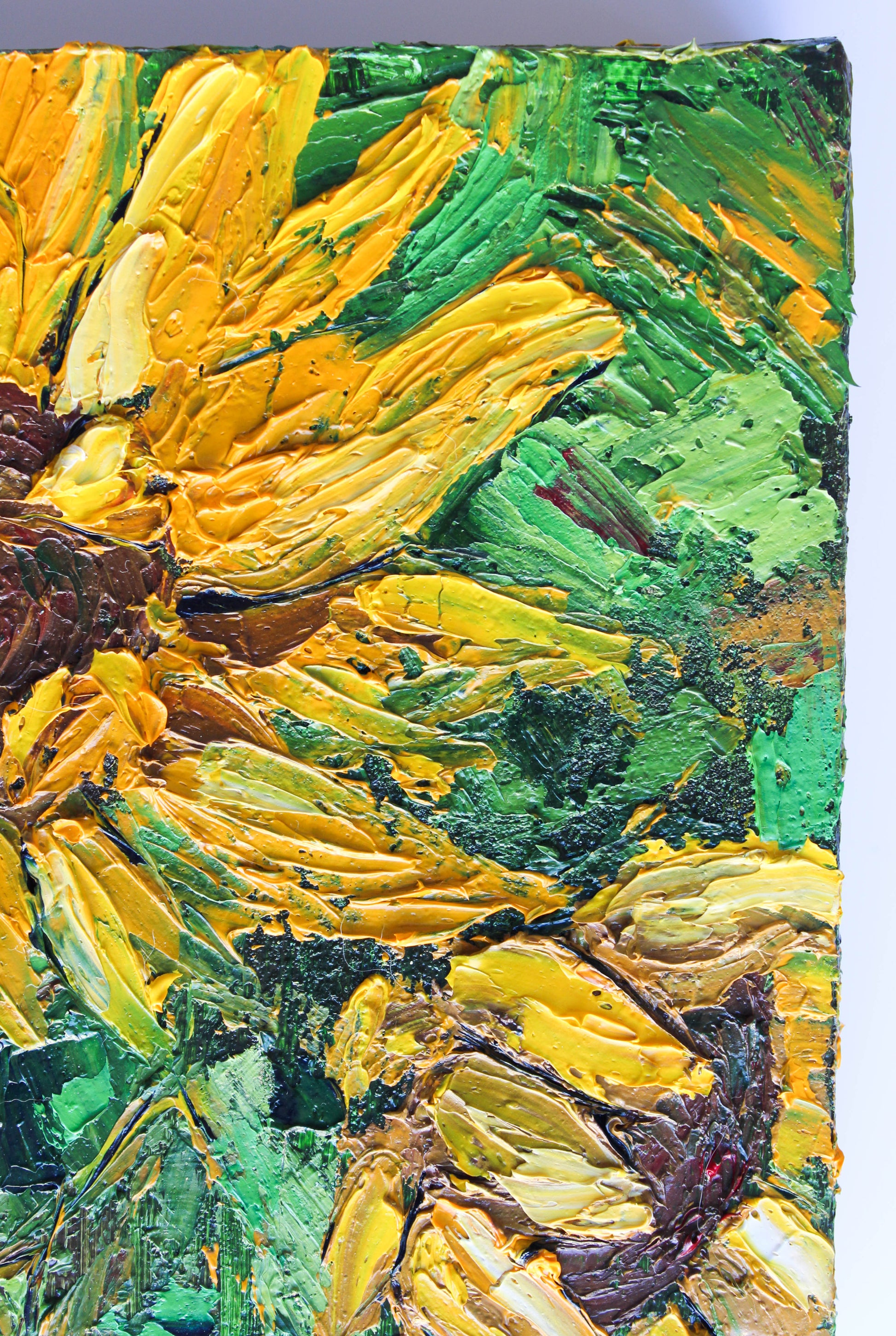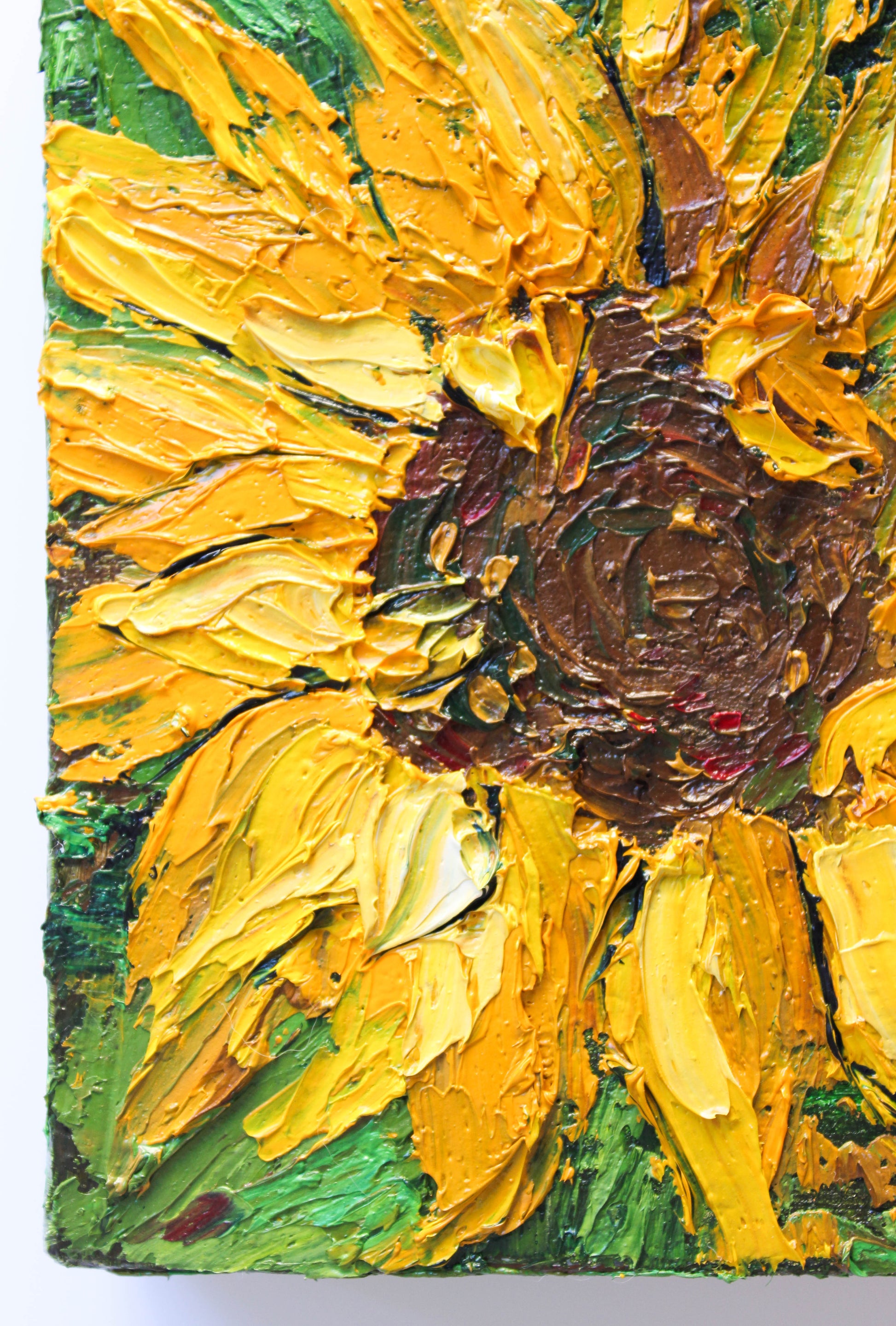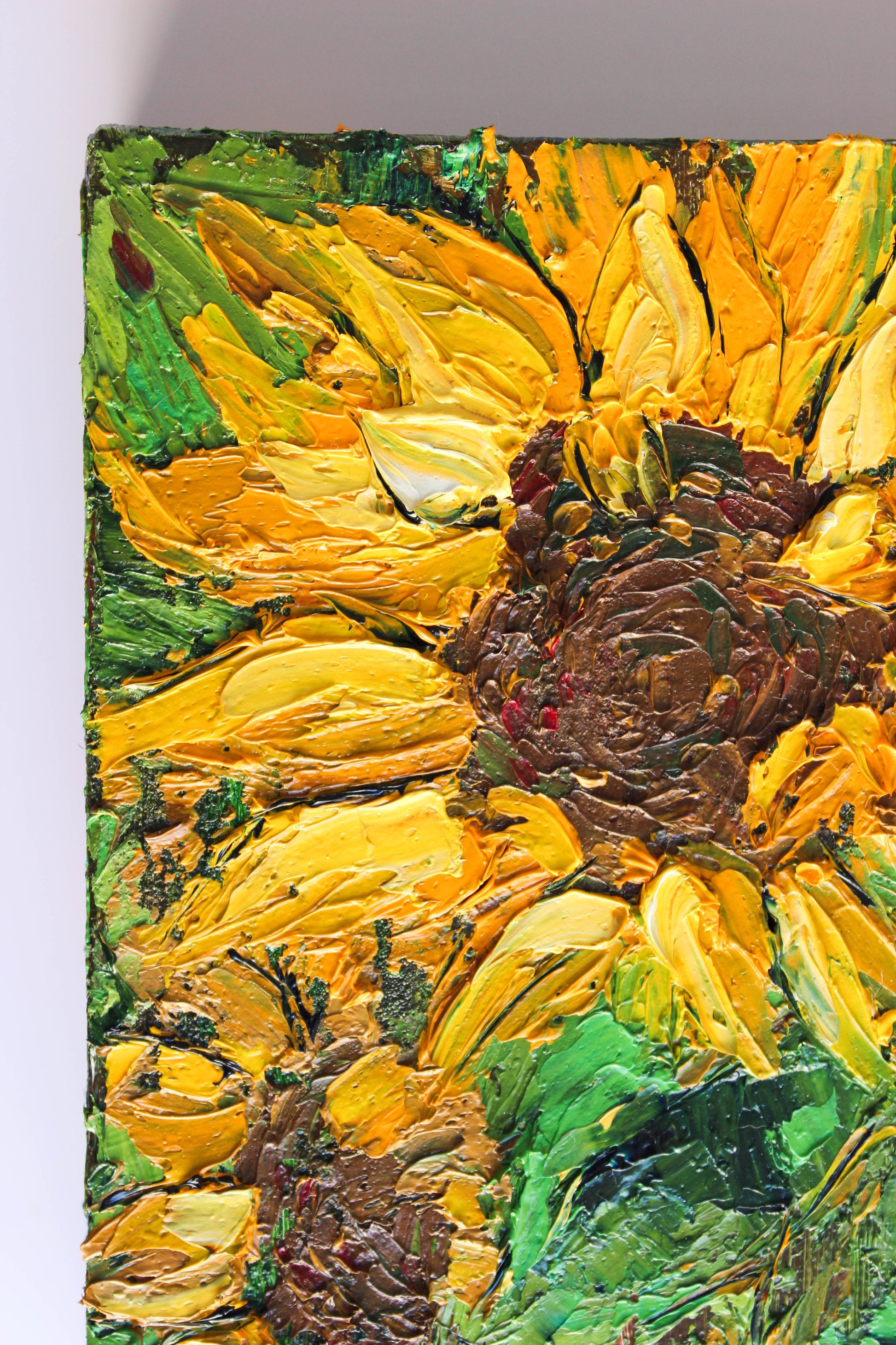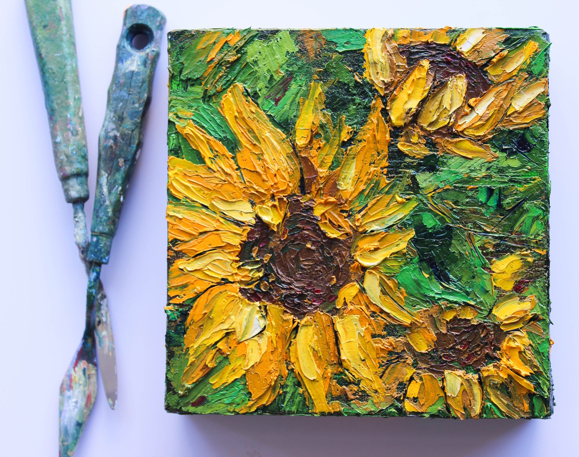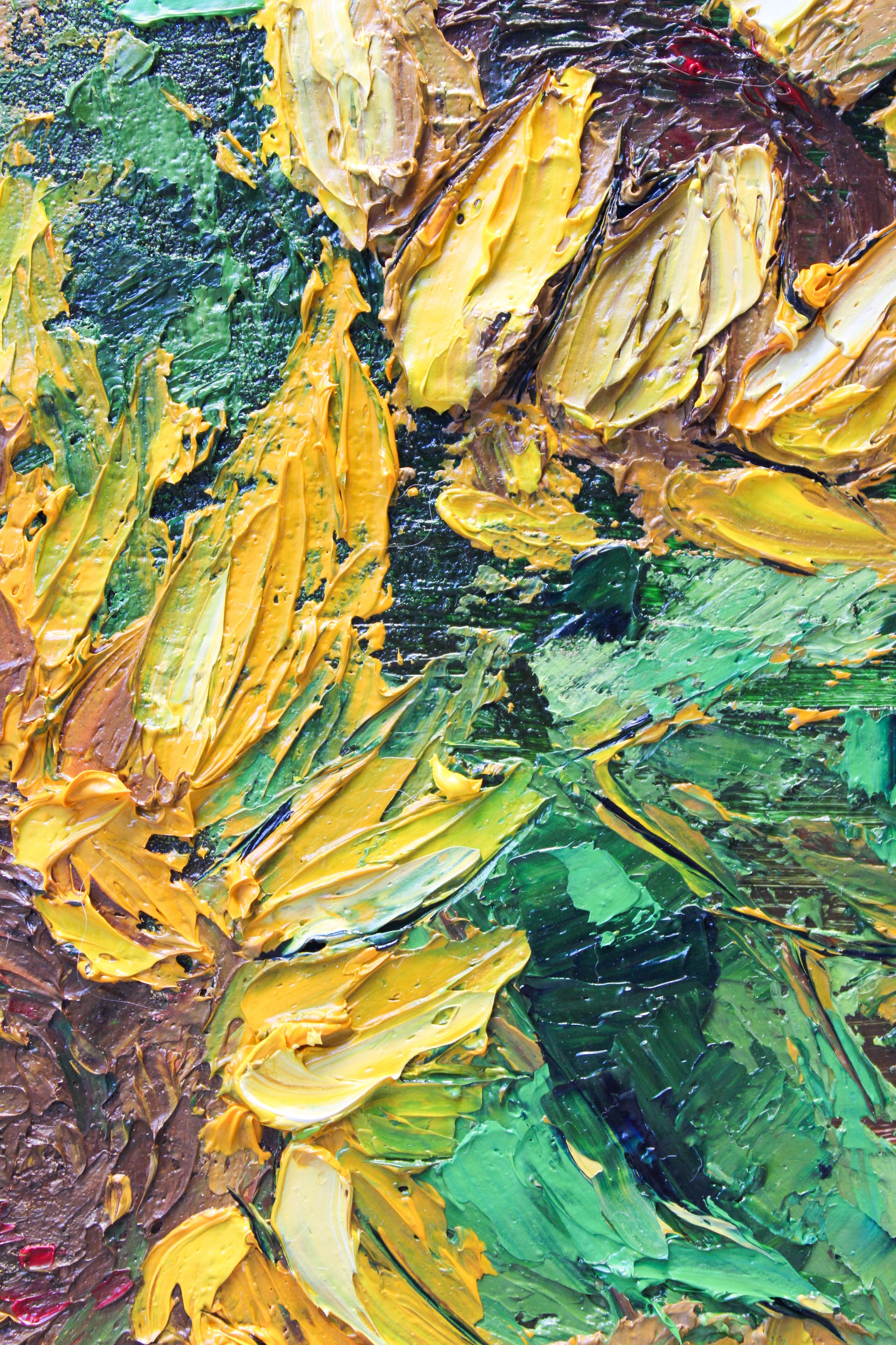 A textured impasto palette knife painting in oil, featuring three beautiful sunflowers. This piece has several layers of paint creating thick, luxurious textures in a beautiful color combination.