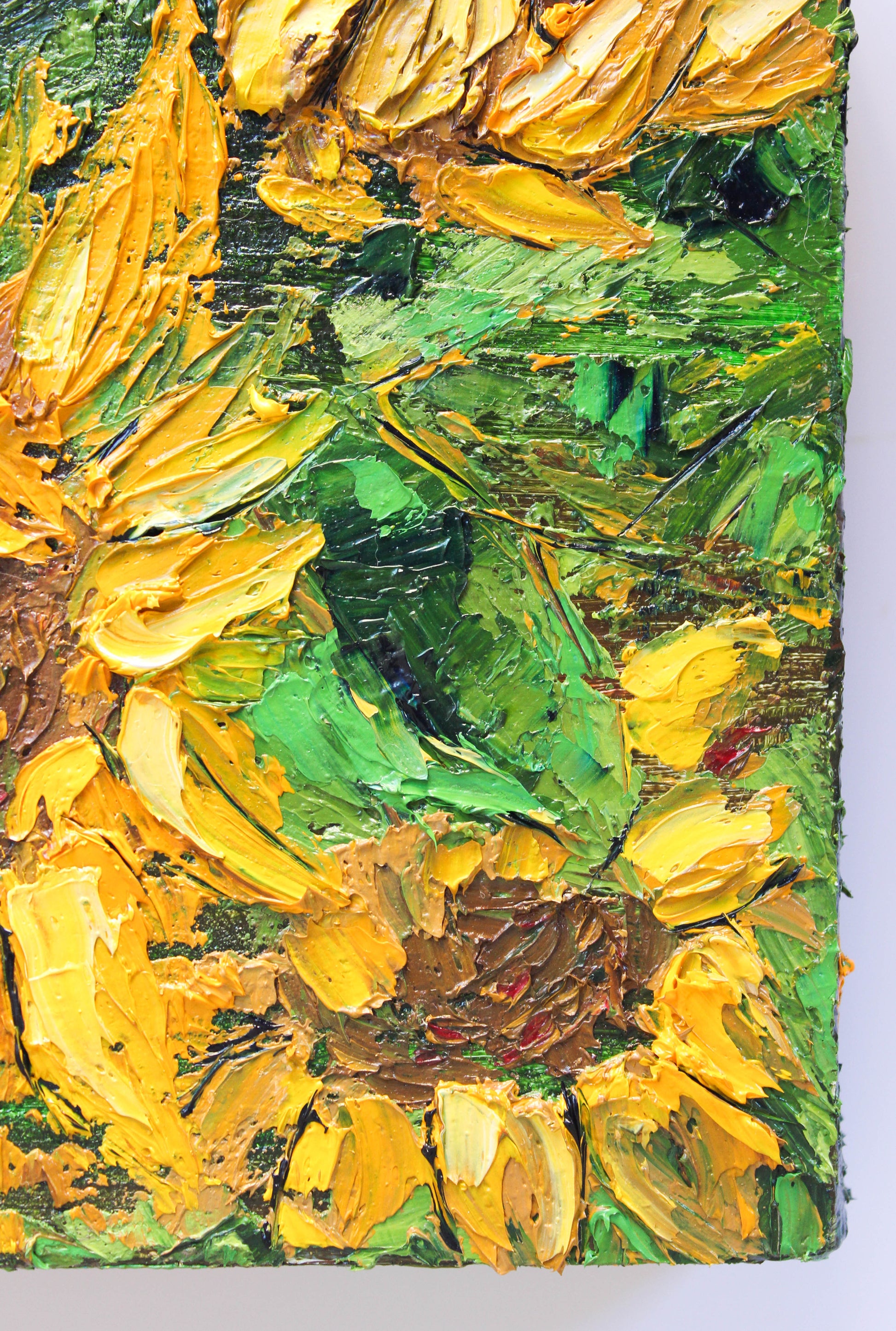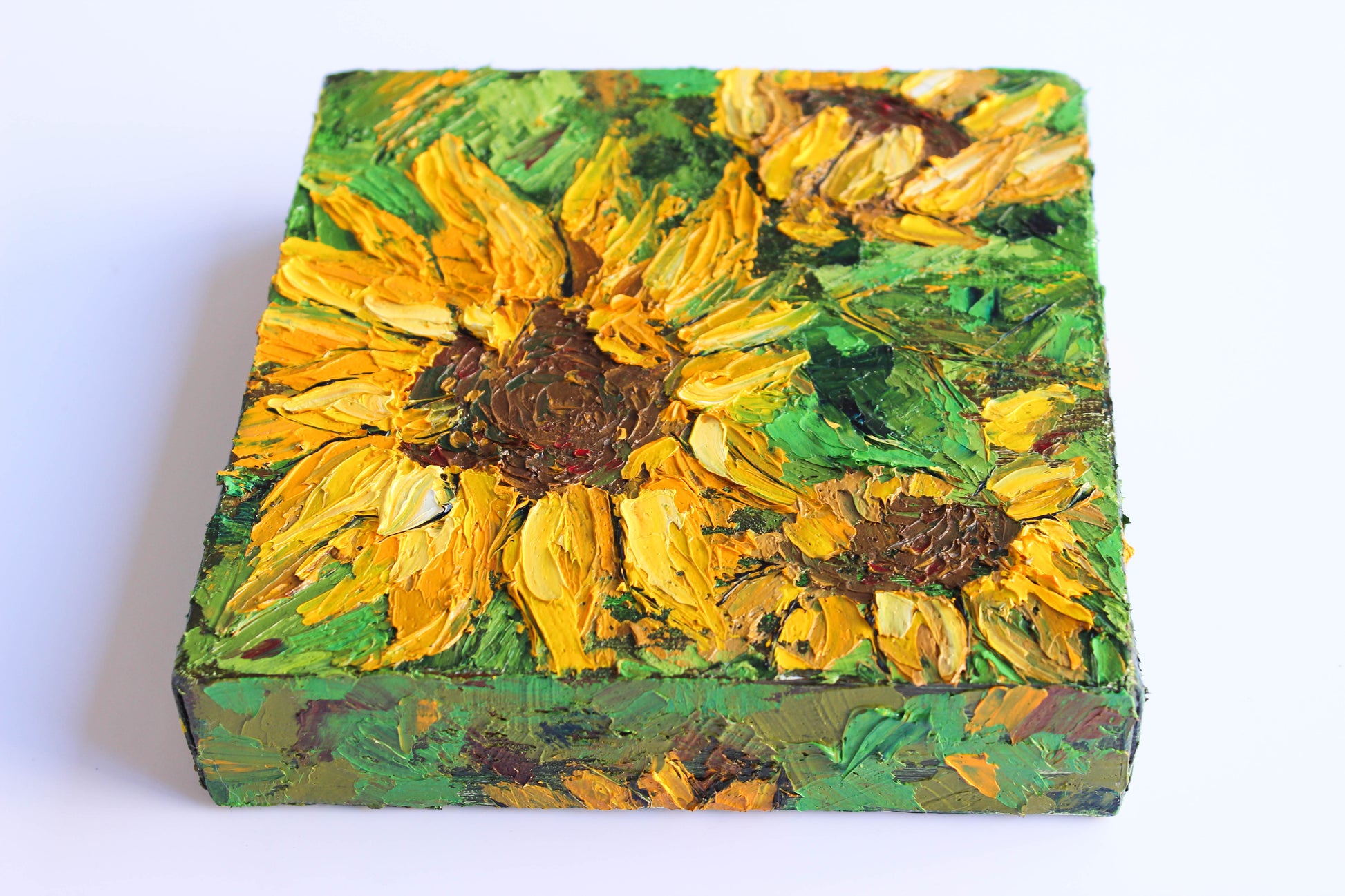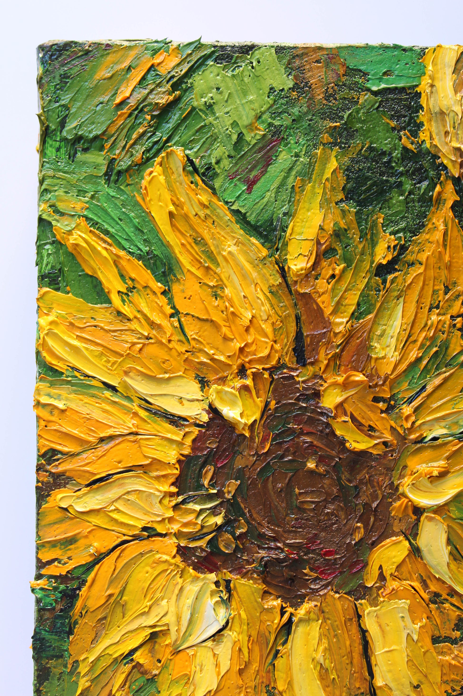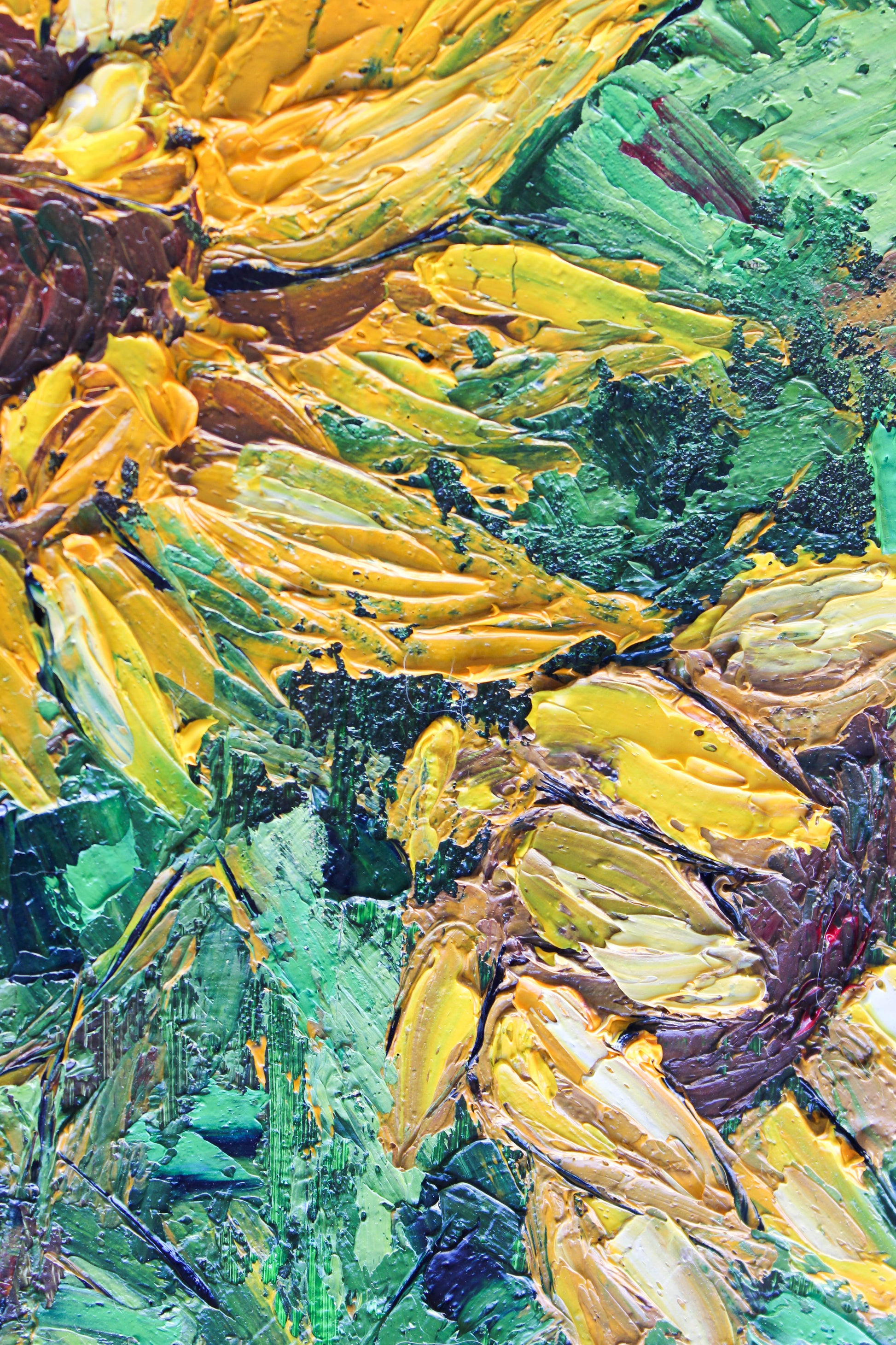 A textured impasto palette knife painting in oil, featuring three beautiful sunflowers. This piece has several layers of paint creating thick, luxurious textures in a beautiful color combination.