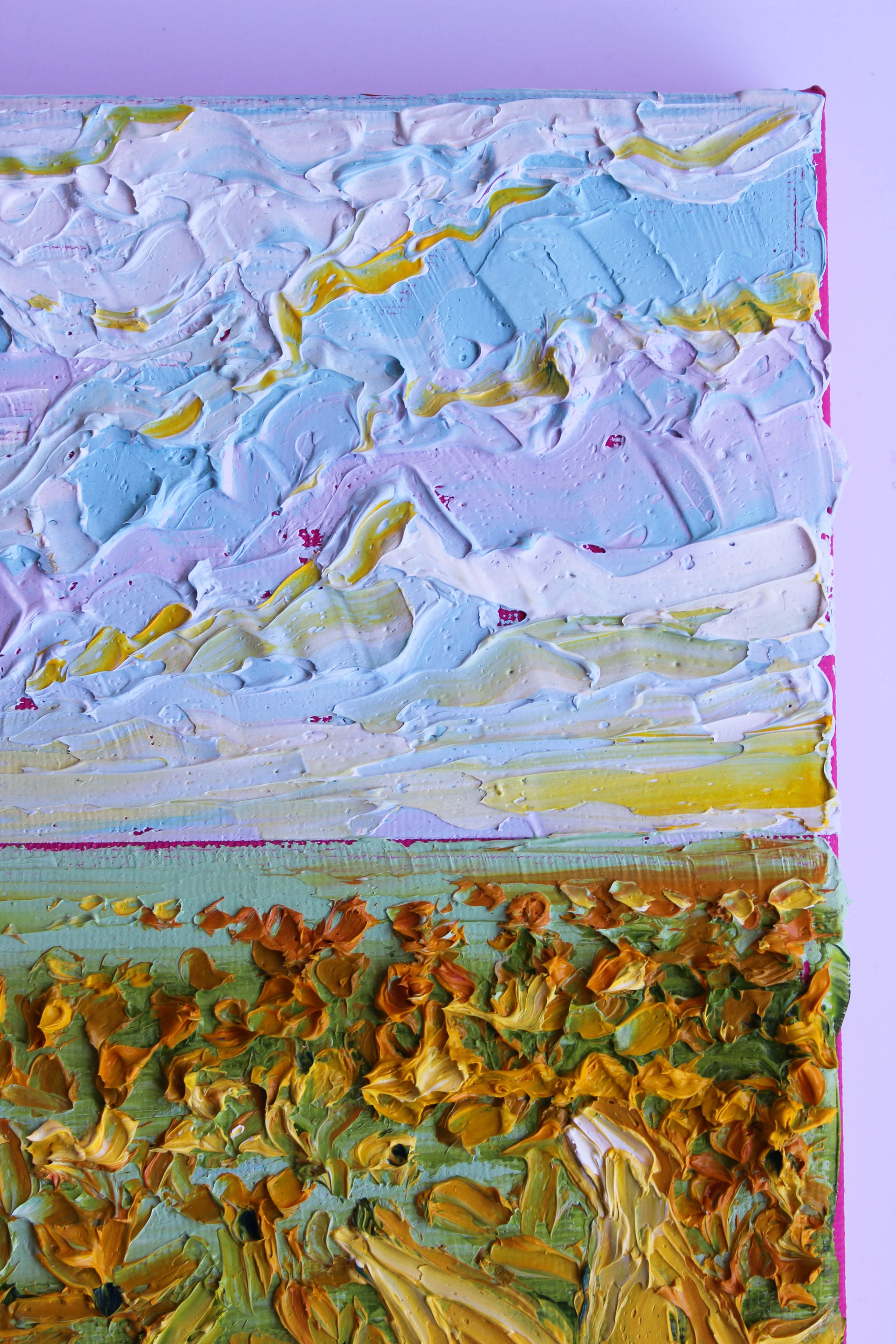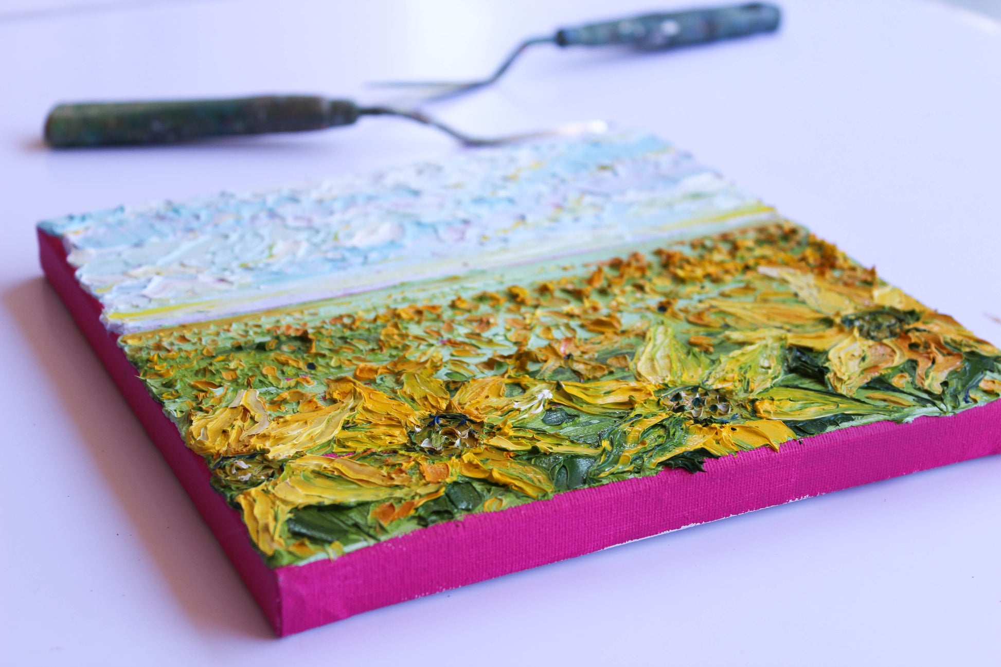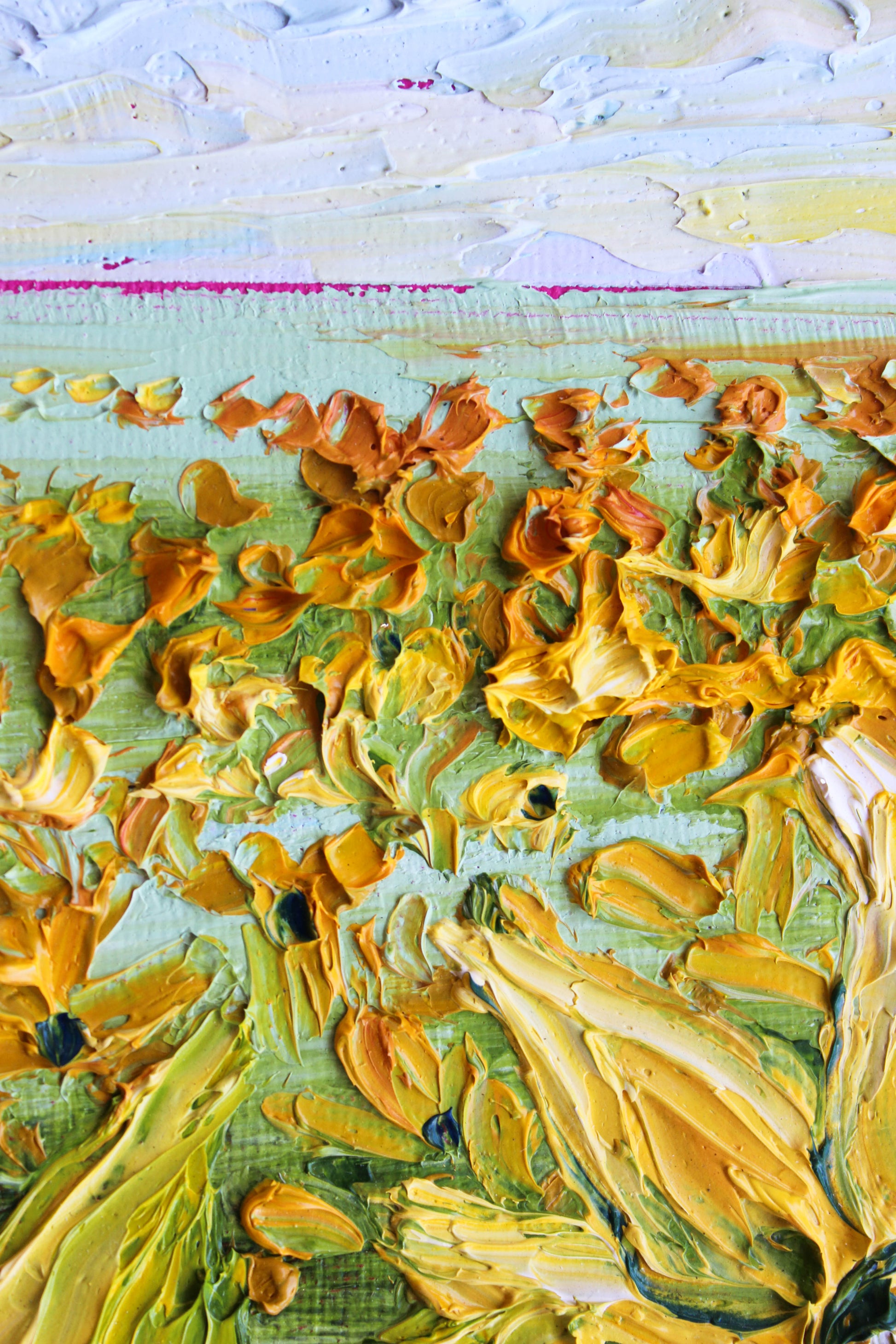 An original and unique high texture palette knife oil painting featuring a beautiful sunflower field. This piece has several layers of paint creating thick, luxurious textures in a beautiful color combination.