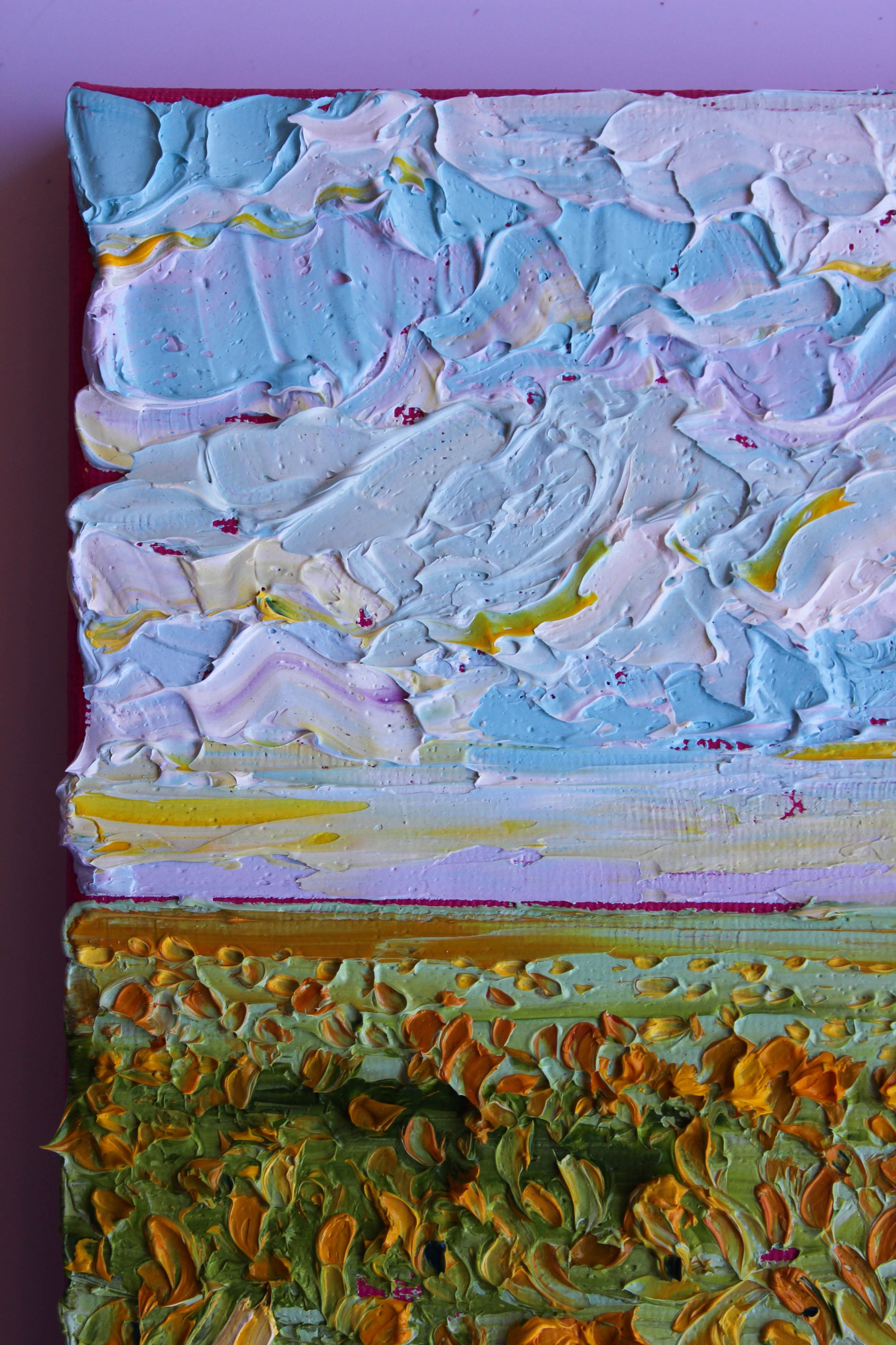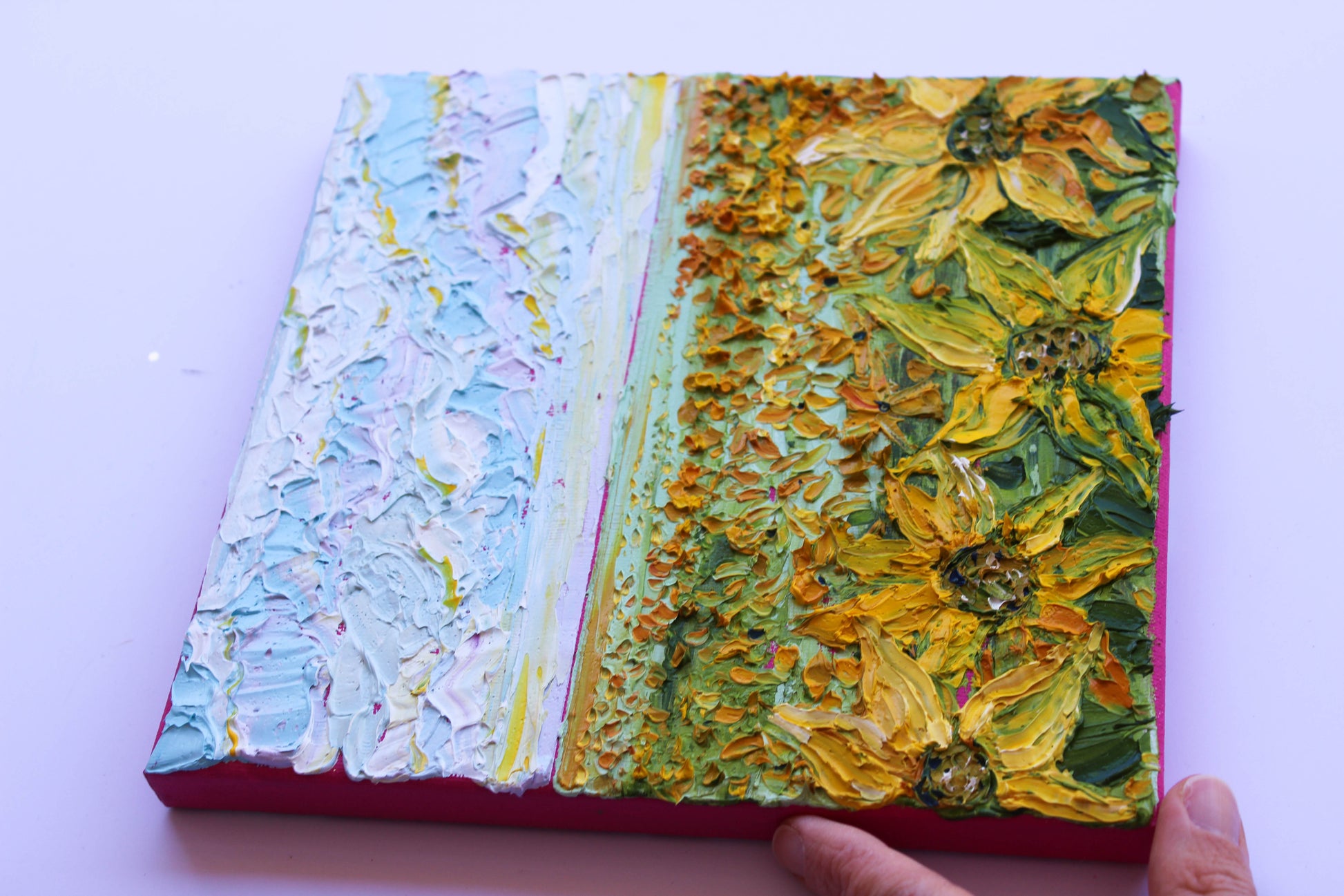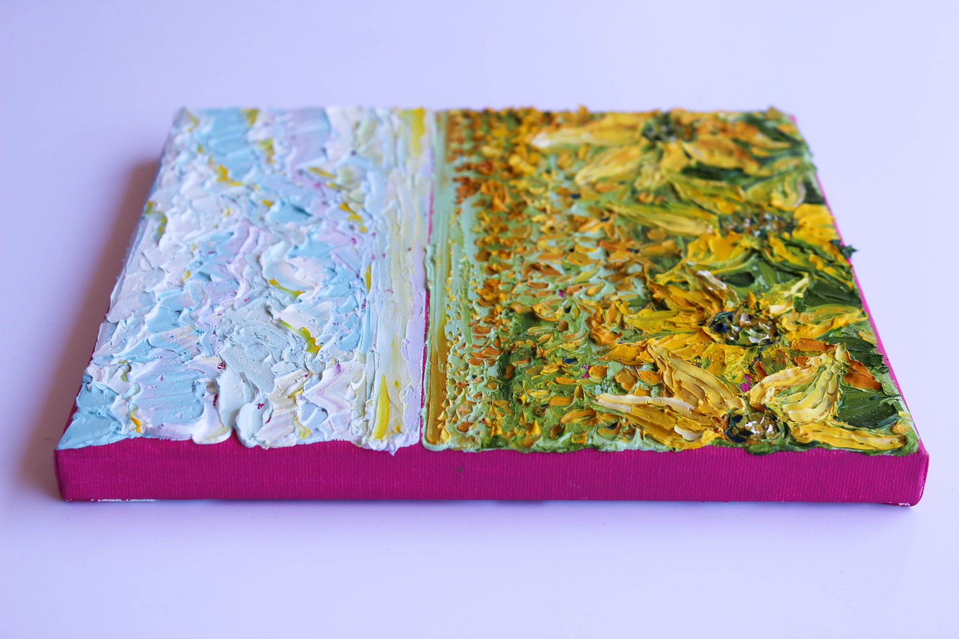 An original and unique high texture palette knife oil painting featuring a beautiful sunflower field. This piece has several layers of paint creating thick, luxurious textures in a beautiful color combination.