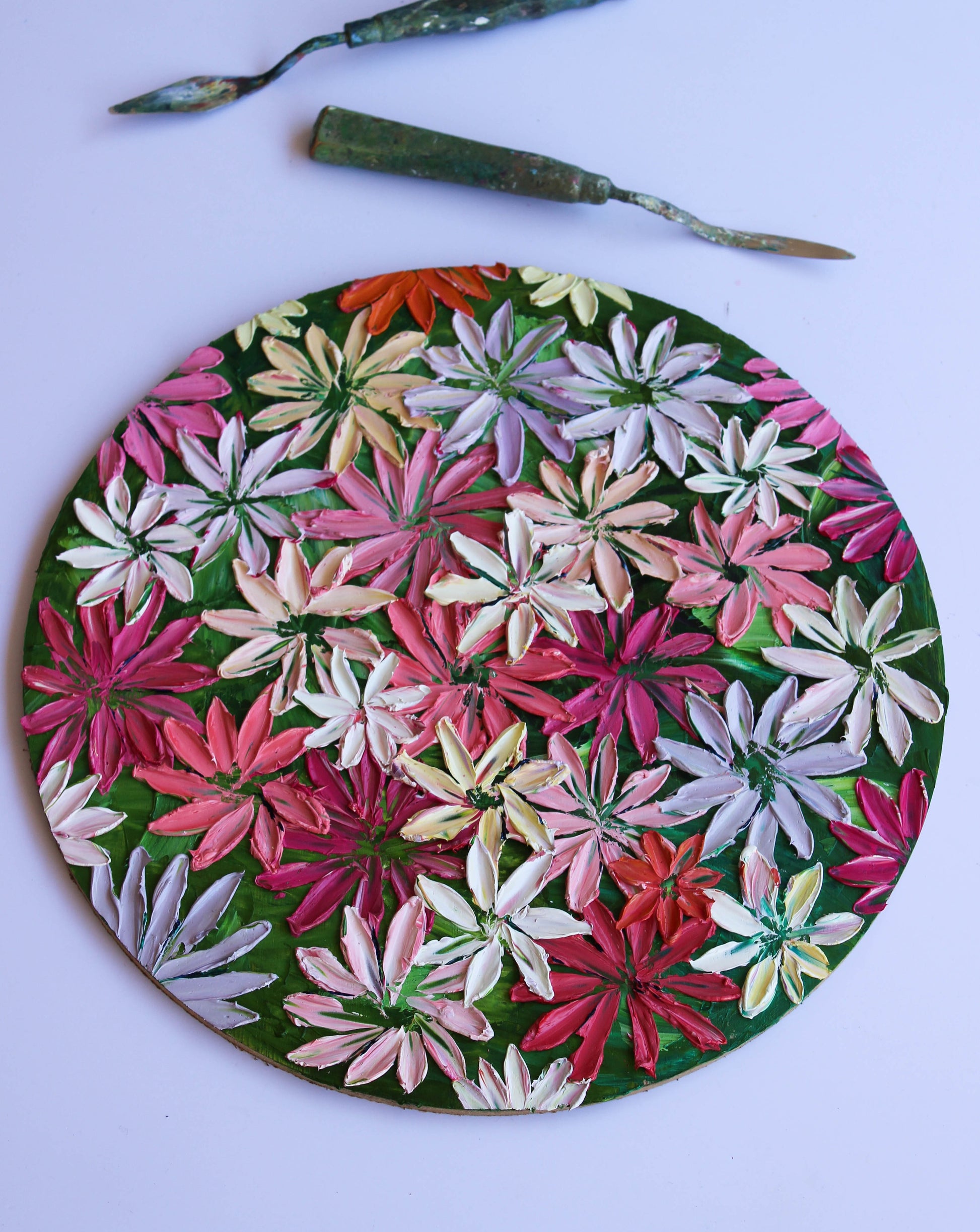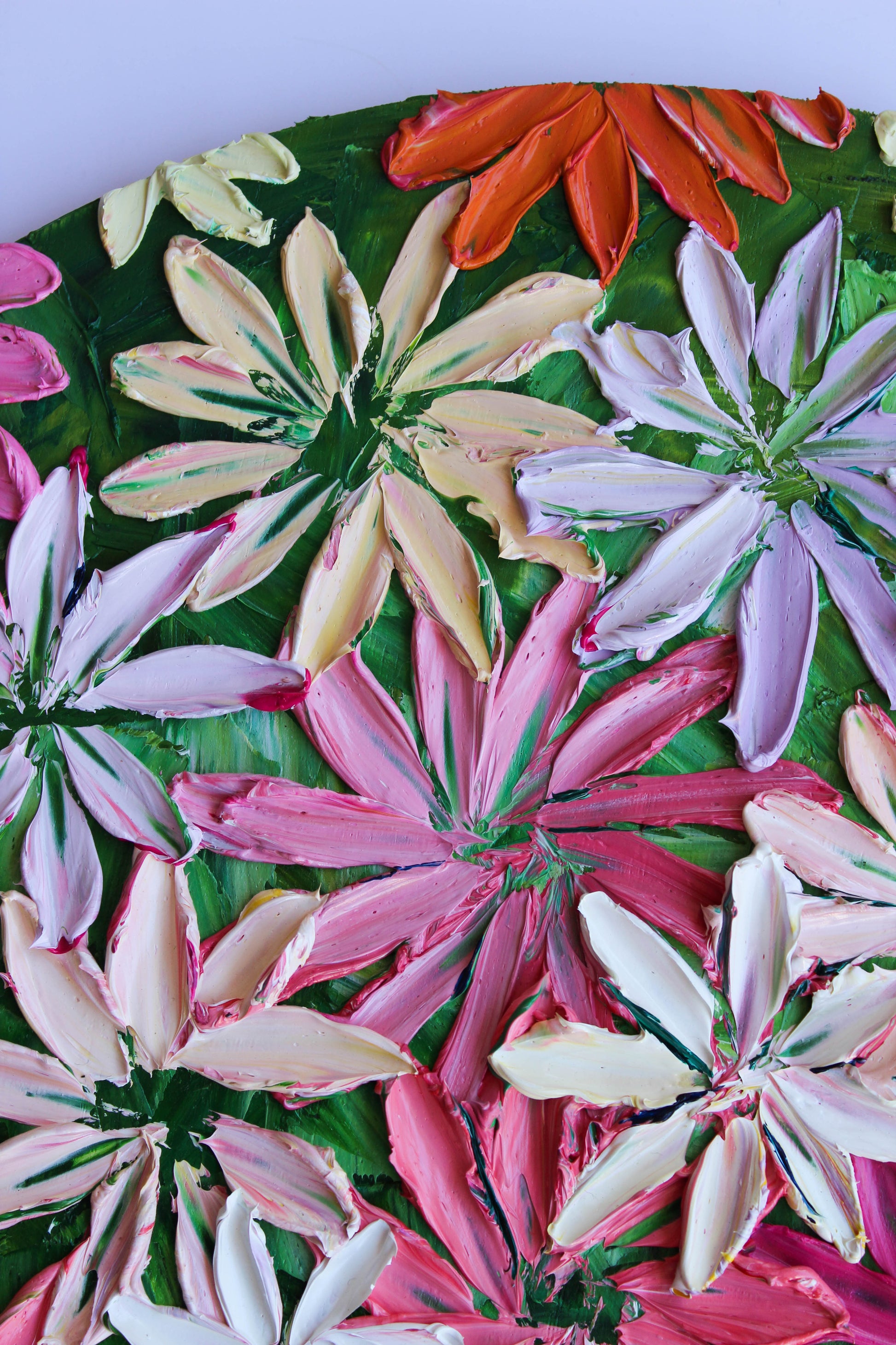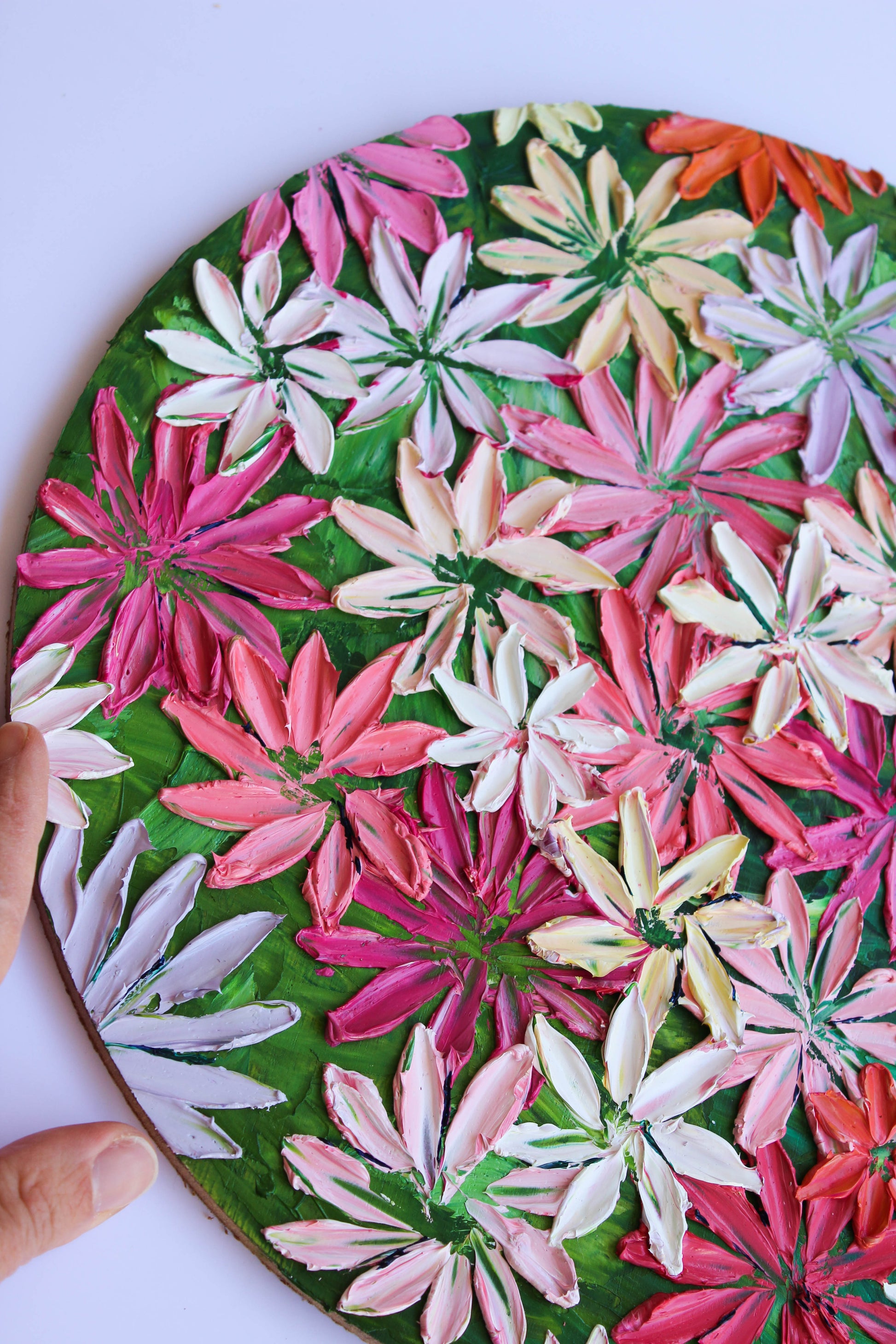 A textured impasto palette knife painting in oil, featuring colorful flowers blooming during spring time. This artwork has thick layers of paint that gives the viewer a 3D effect.