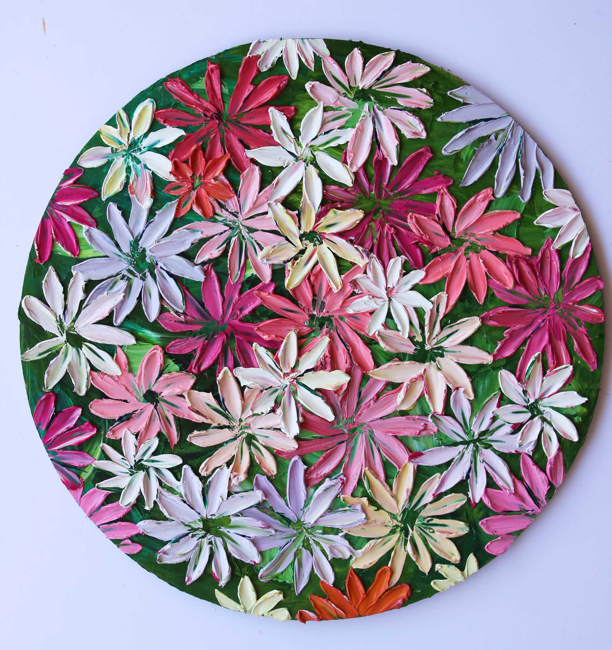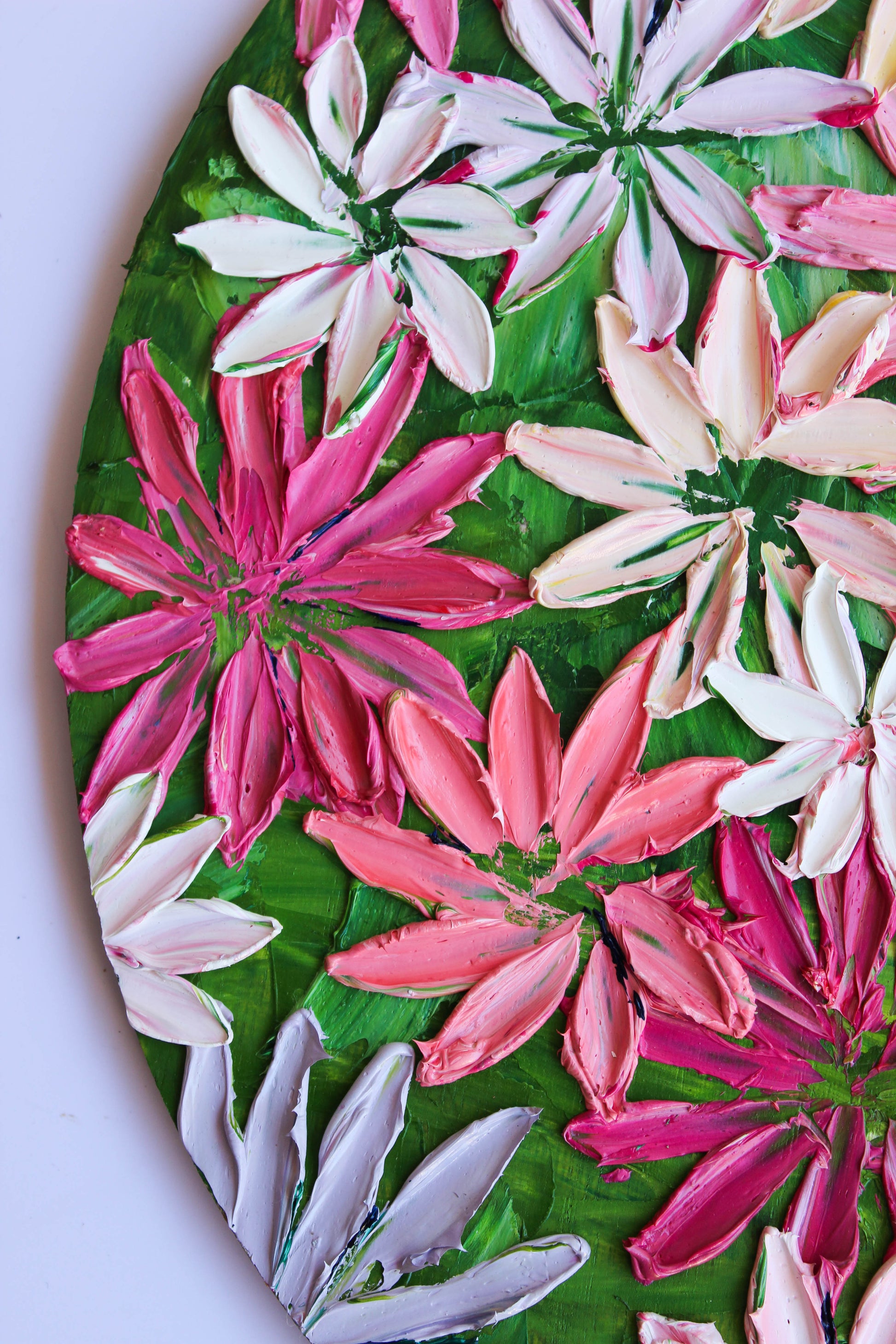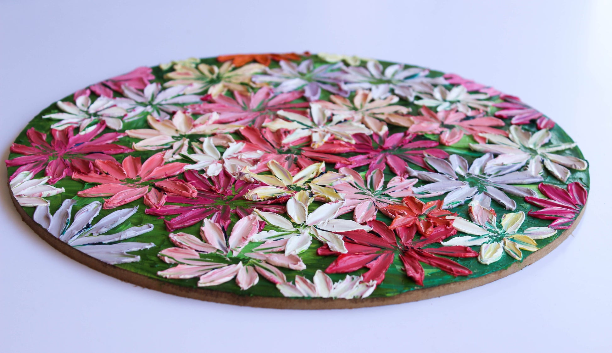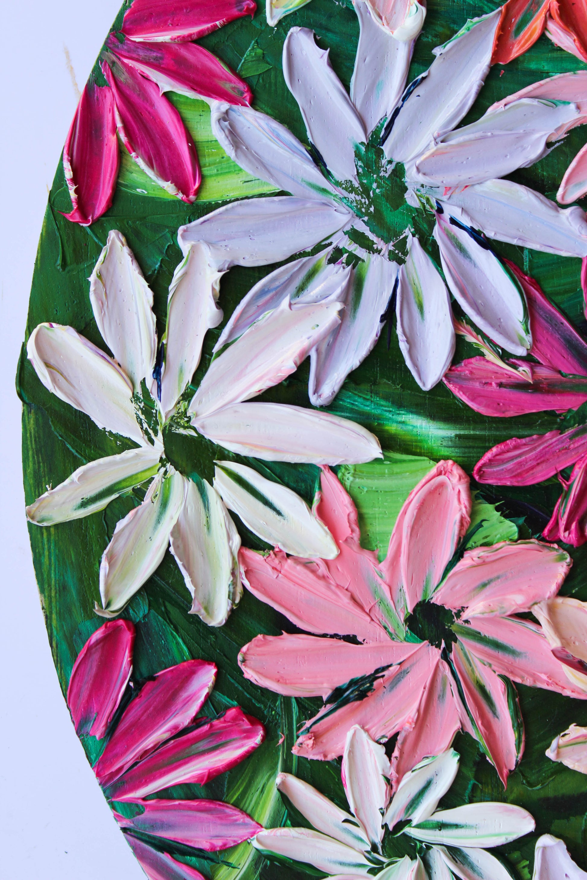 A textured impasto palette knife painting in oil, featuring colorful flowers blooming during spring time. This artwork has thick layers of paint that gives the viewer a 3D effect.