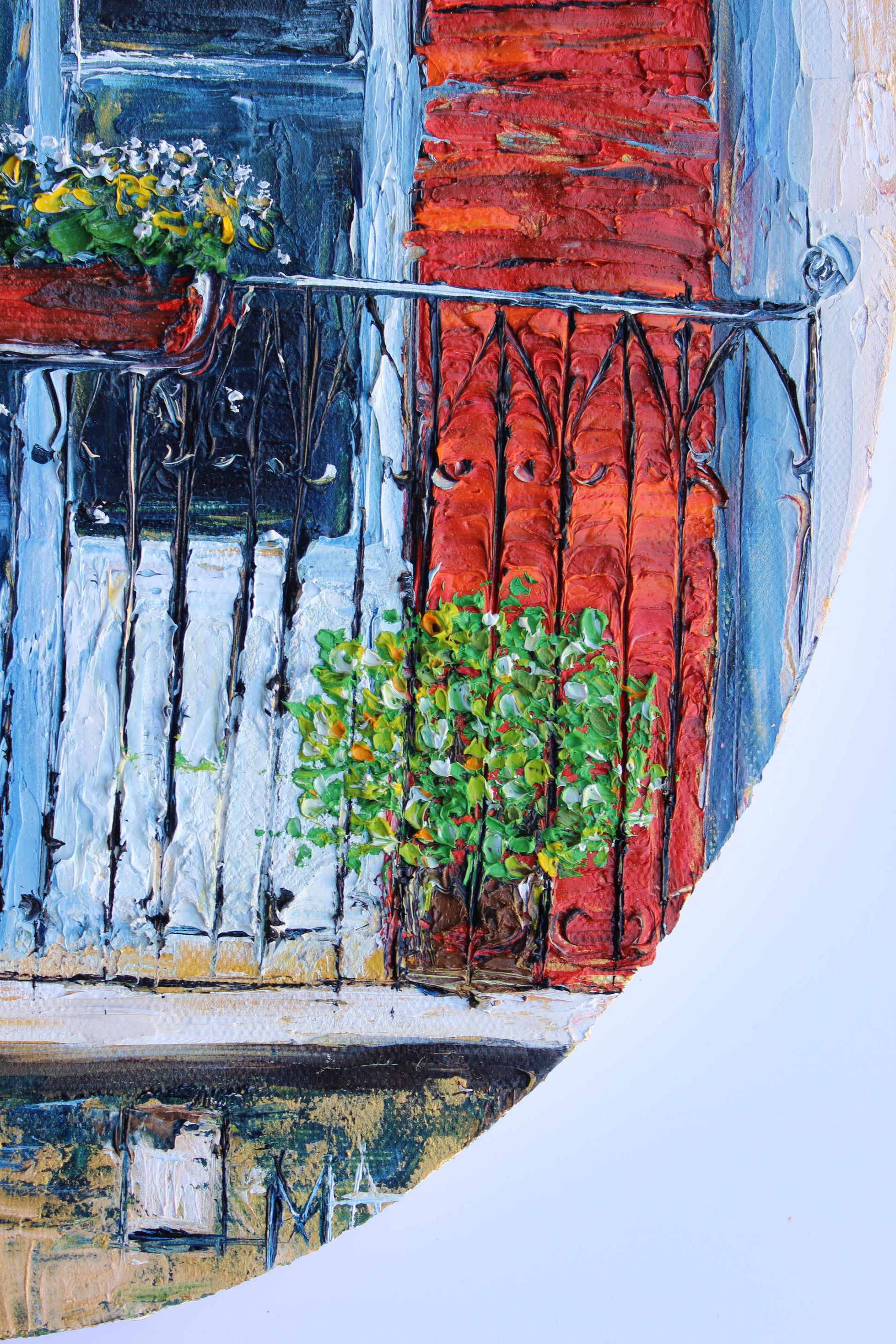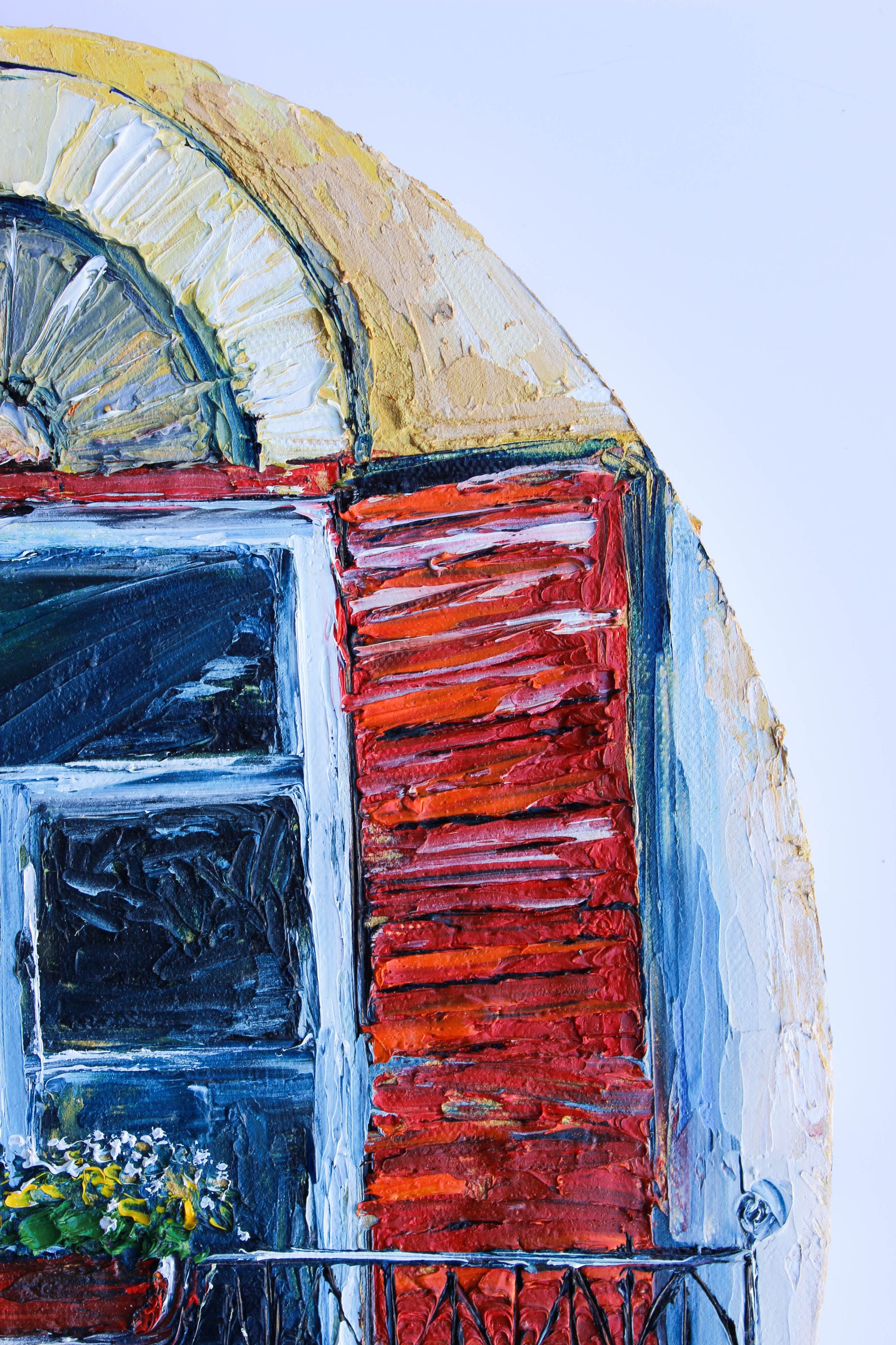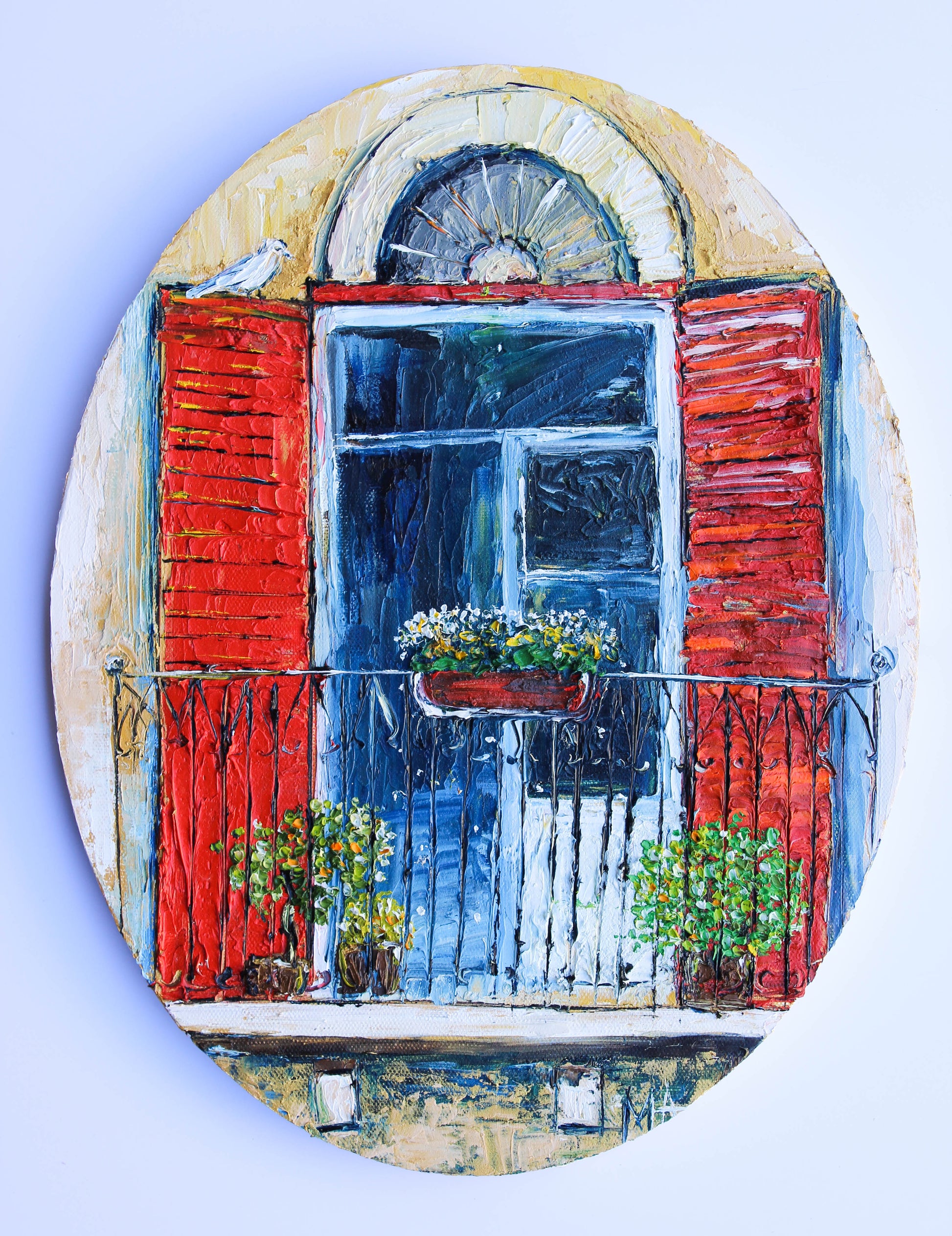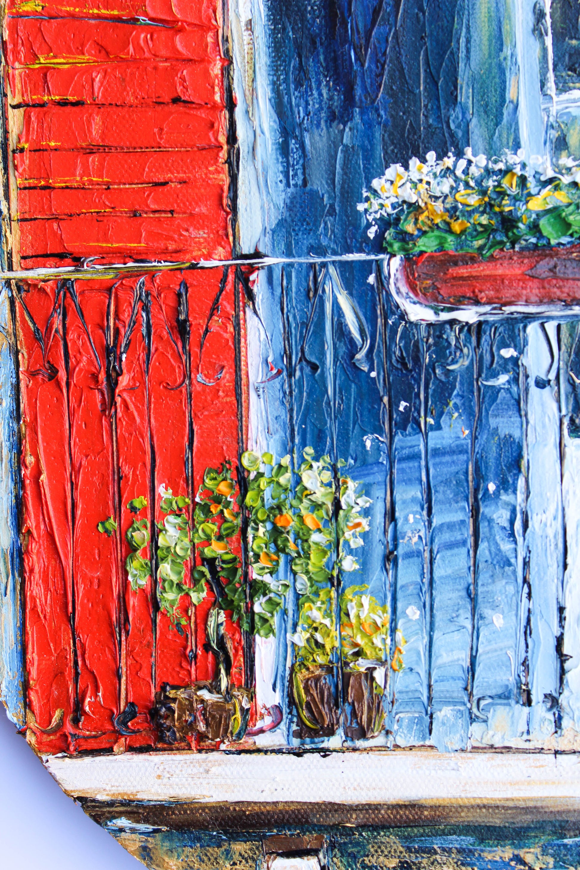 An original and unique high textured palette knife oil painting, featuring a beautiful balcony inspired by Beirut old buildings and windows. This piece has several layers of paint creating thick, luxurious textures in a beautiful color combination.