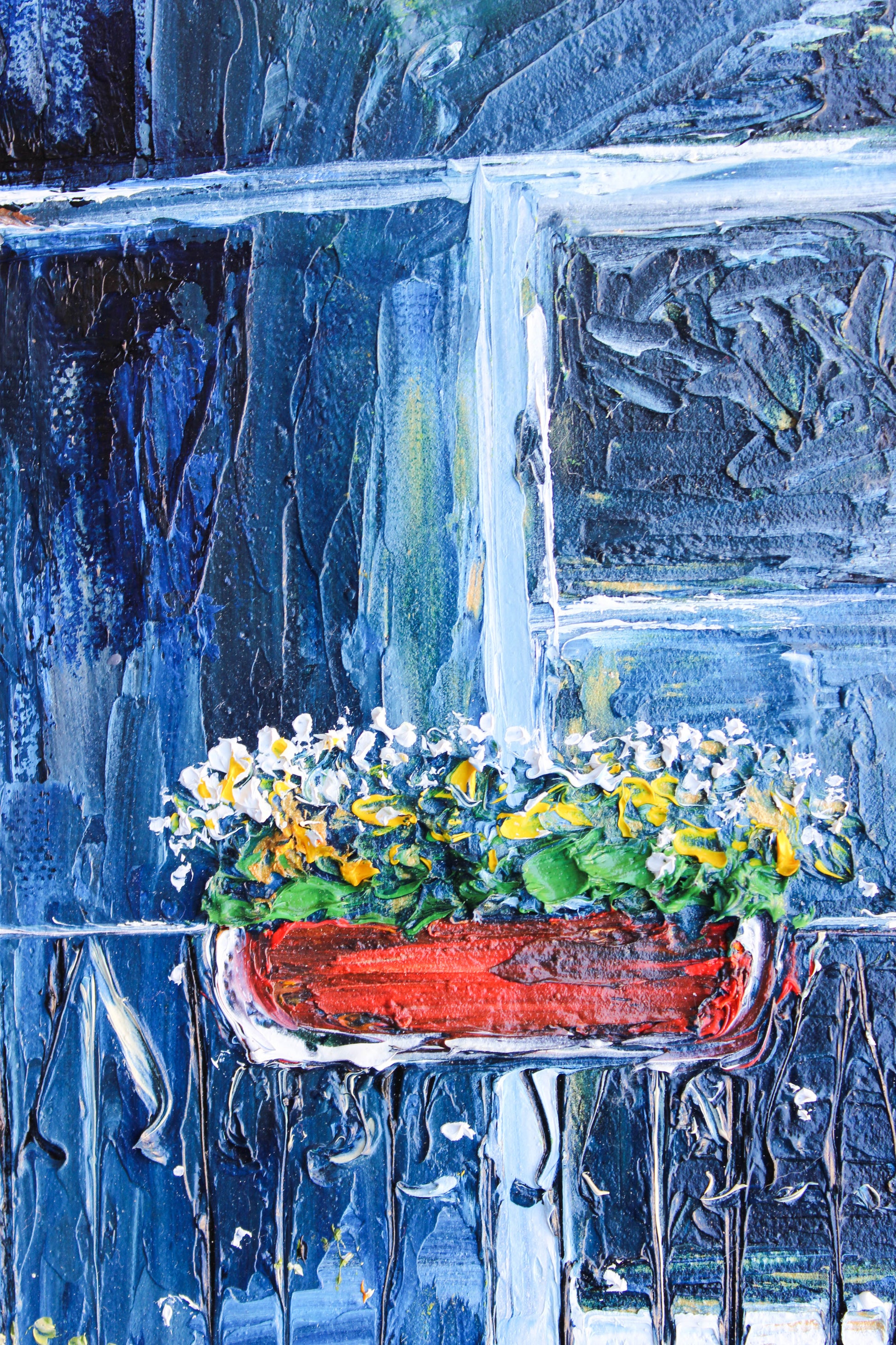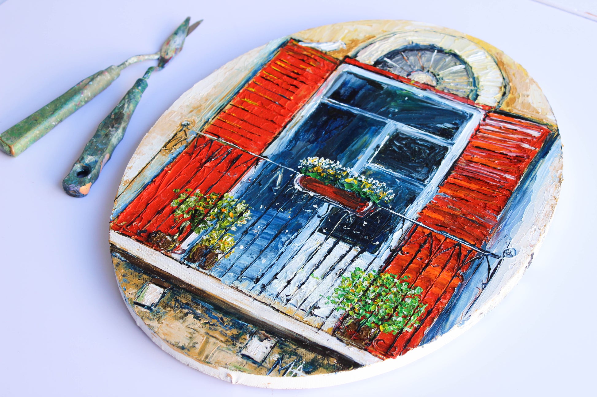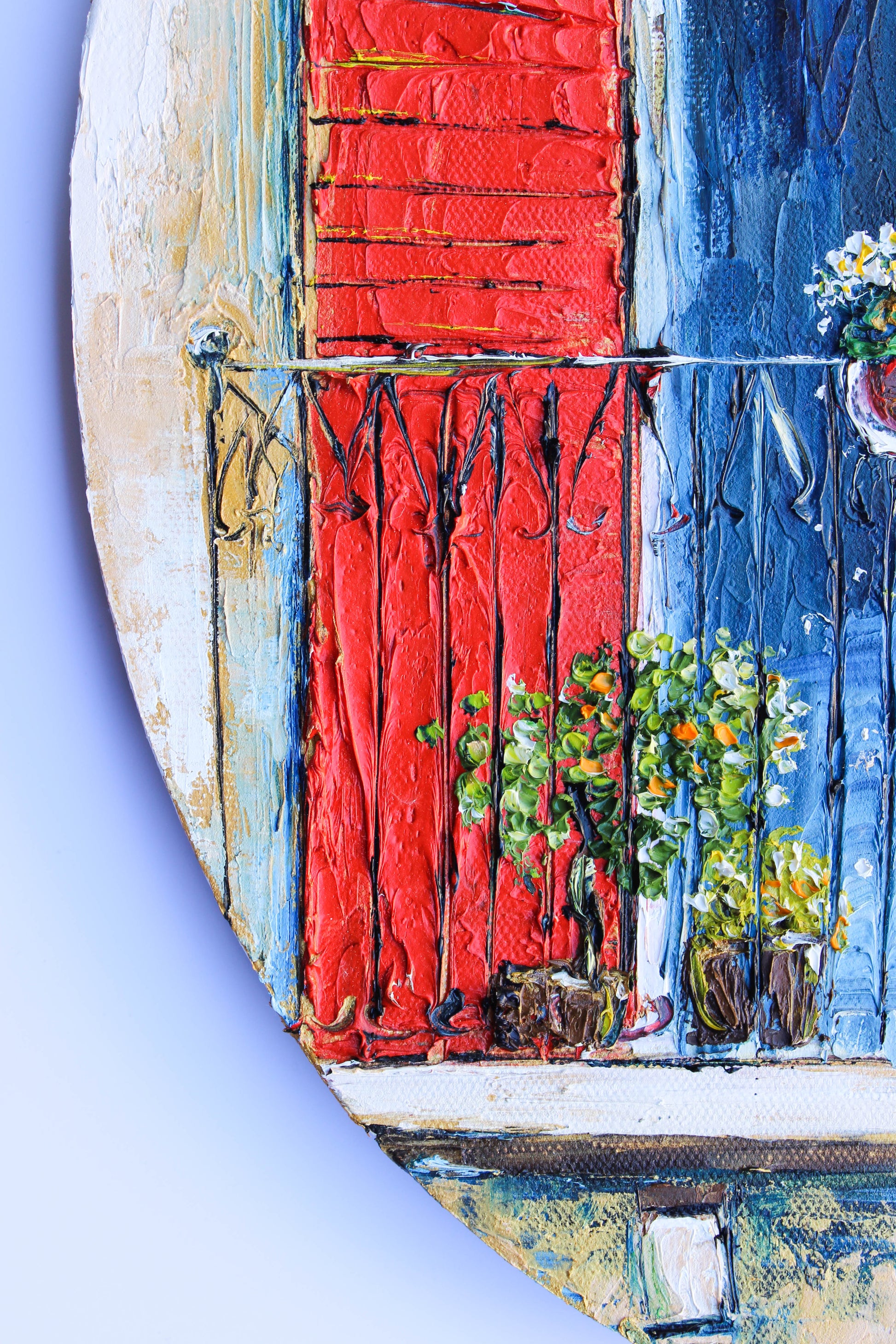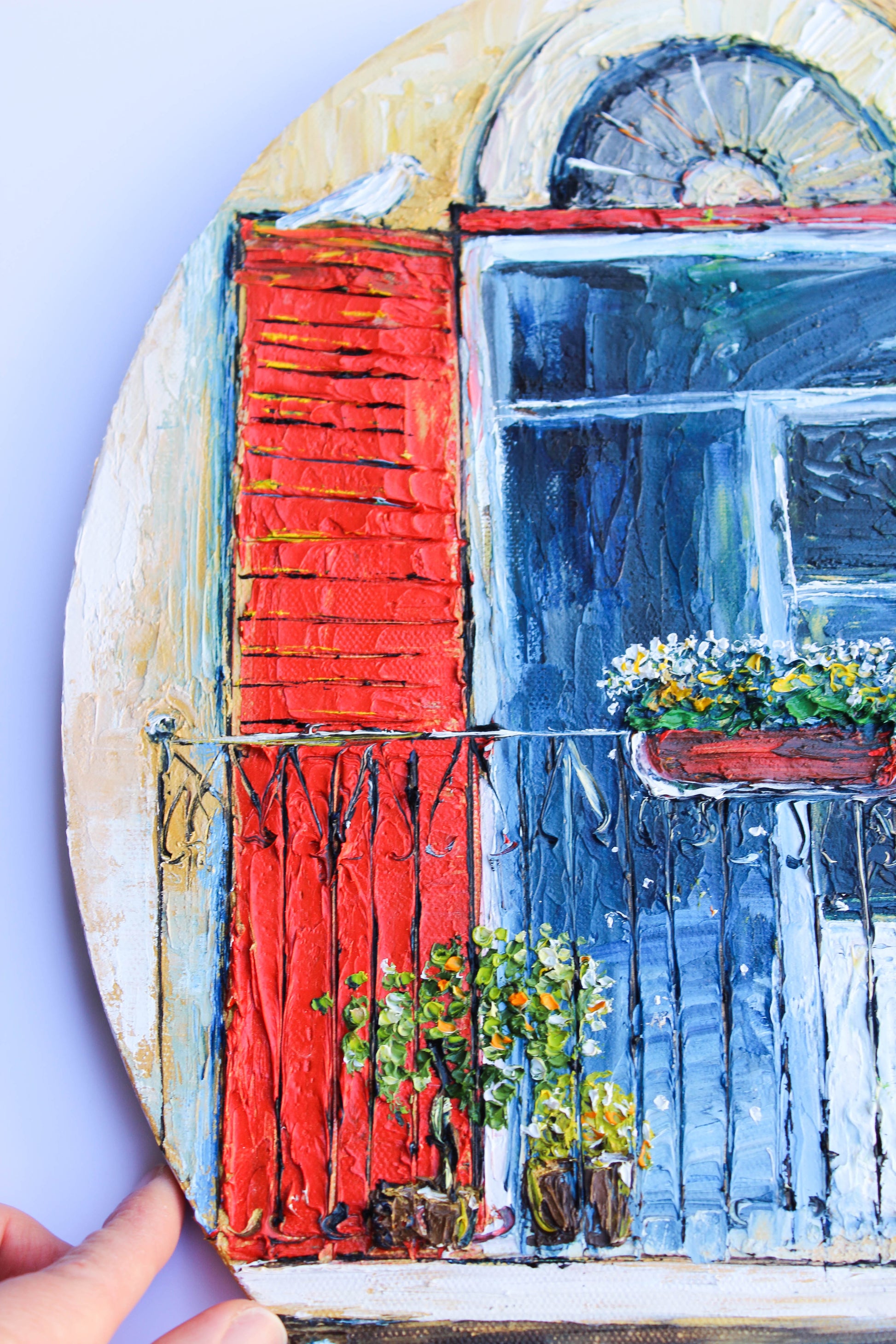An original and unique high textured palette knife oil painting, featuring a beautiful balcony inspired by Beirut old buildings and windows. This piece has several layers of paint creating thick, luxurious textures in a beautiful color combination.
