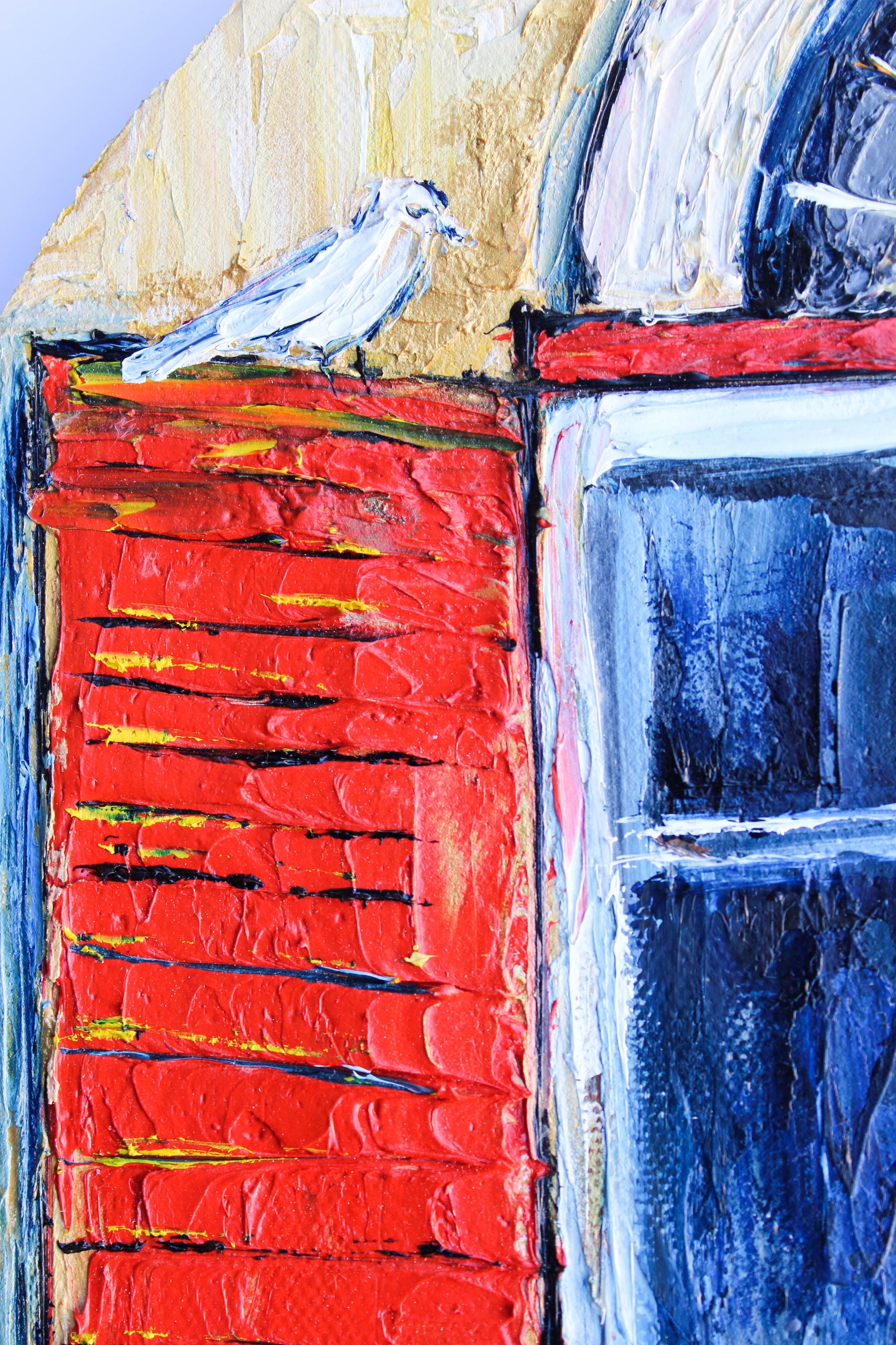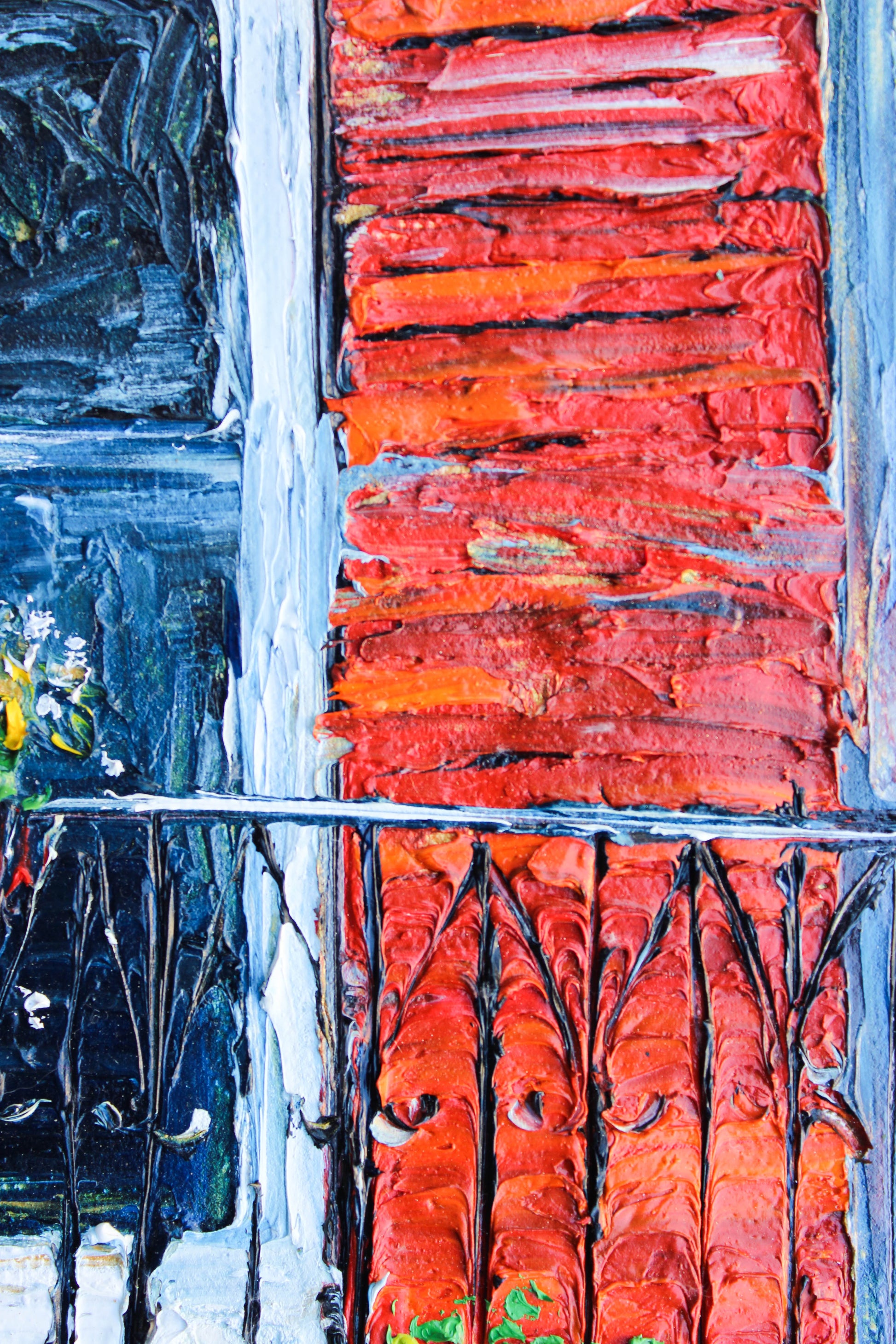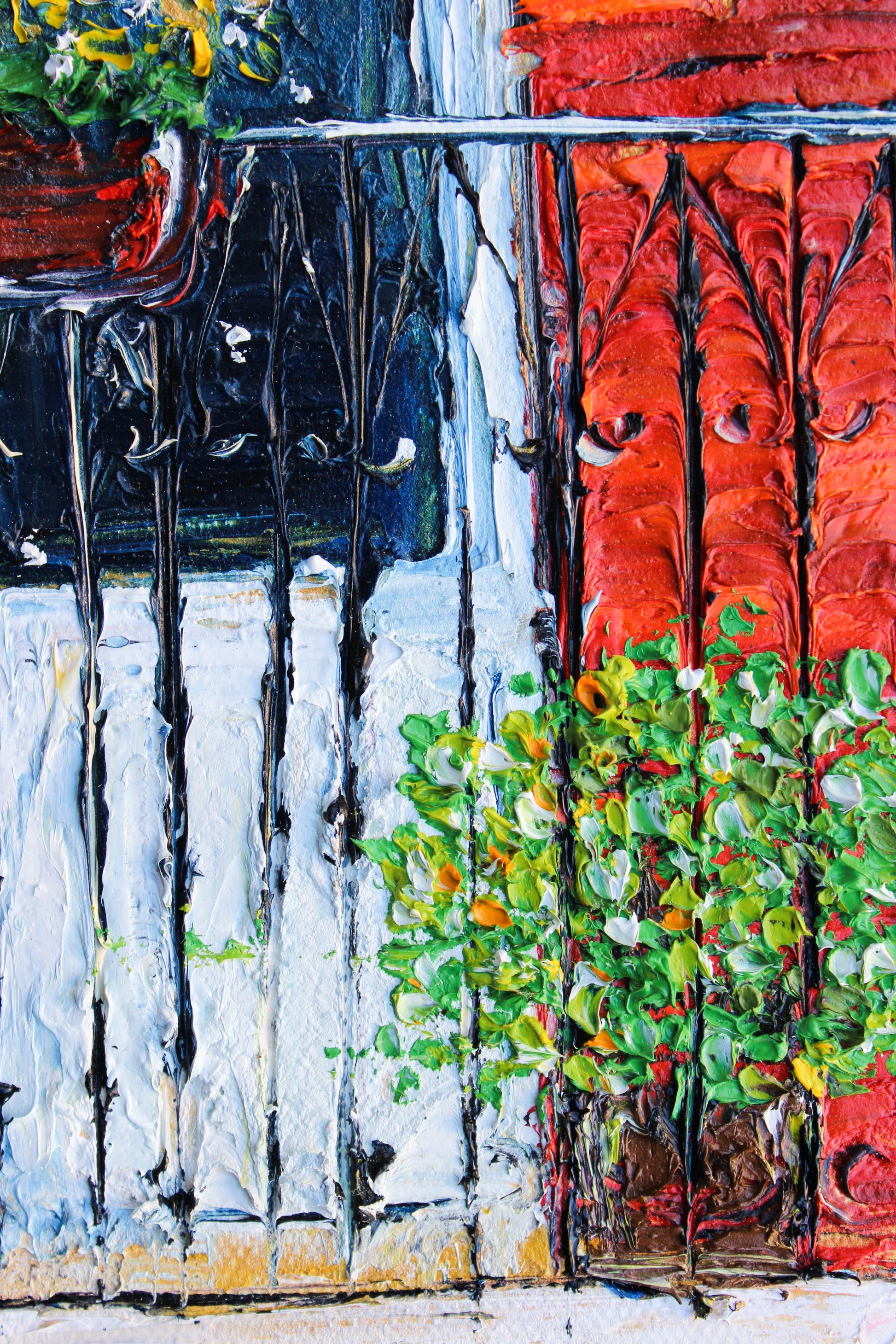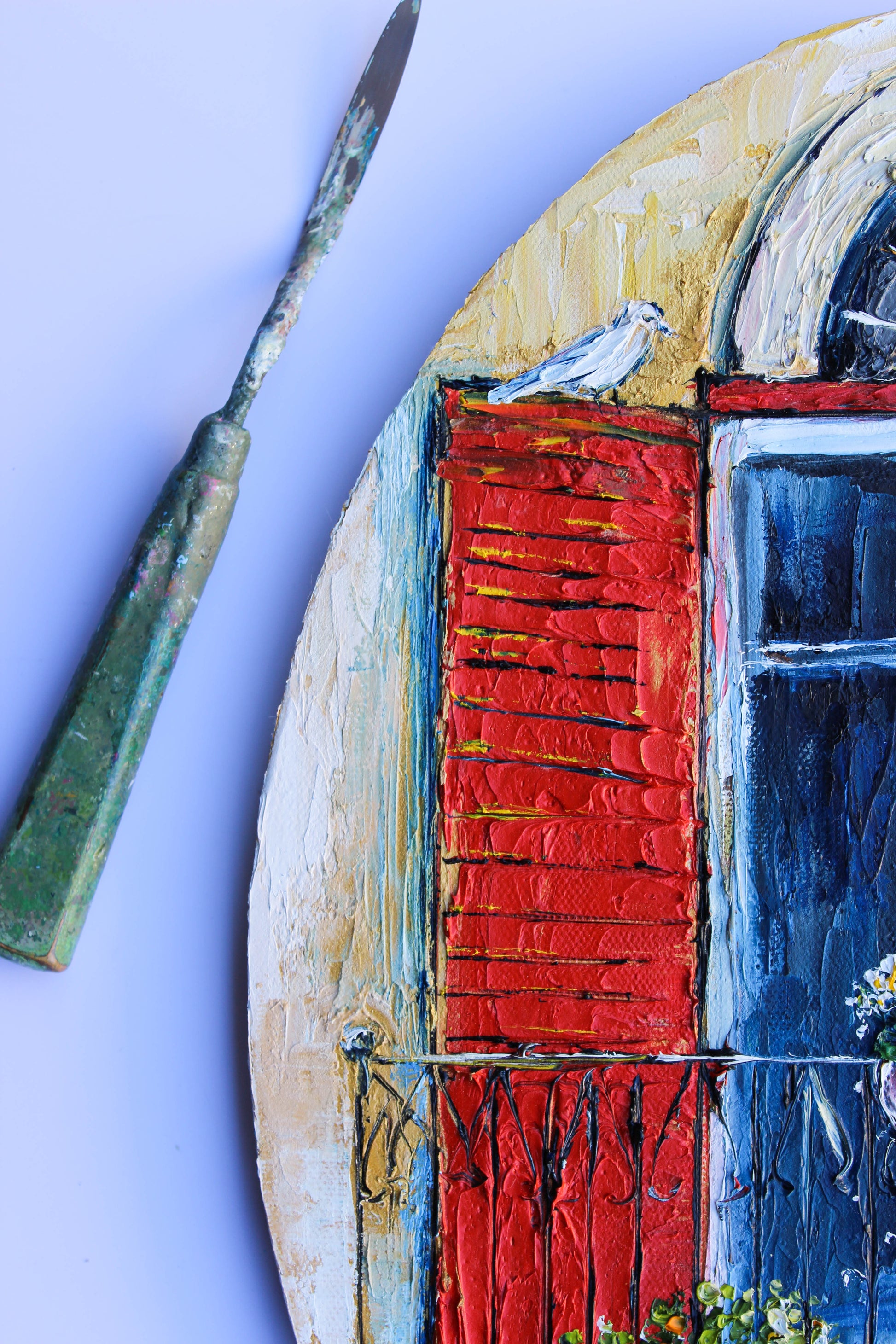 An original and unique high textured palette knife oil painting, featuring a beautiful balcony inspired by Beirut old buildings and windows. This piece has several layers of paint creating thick, luxurious textures in a beautiful color combination.