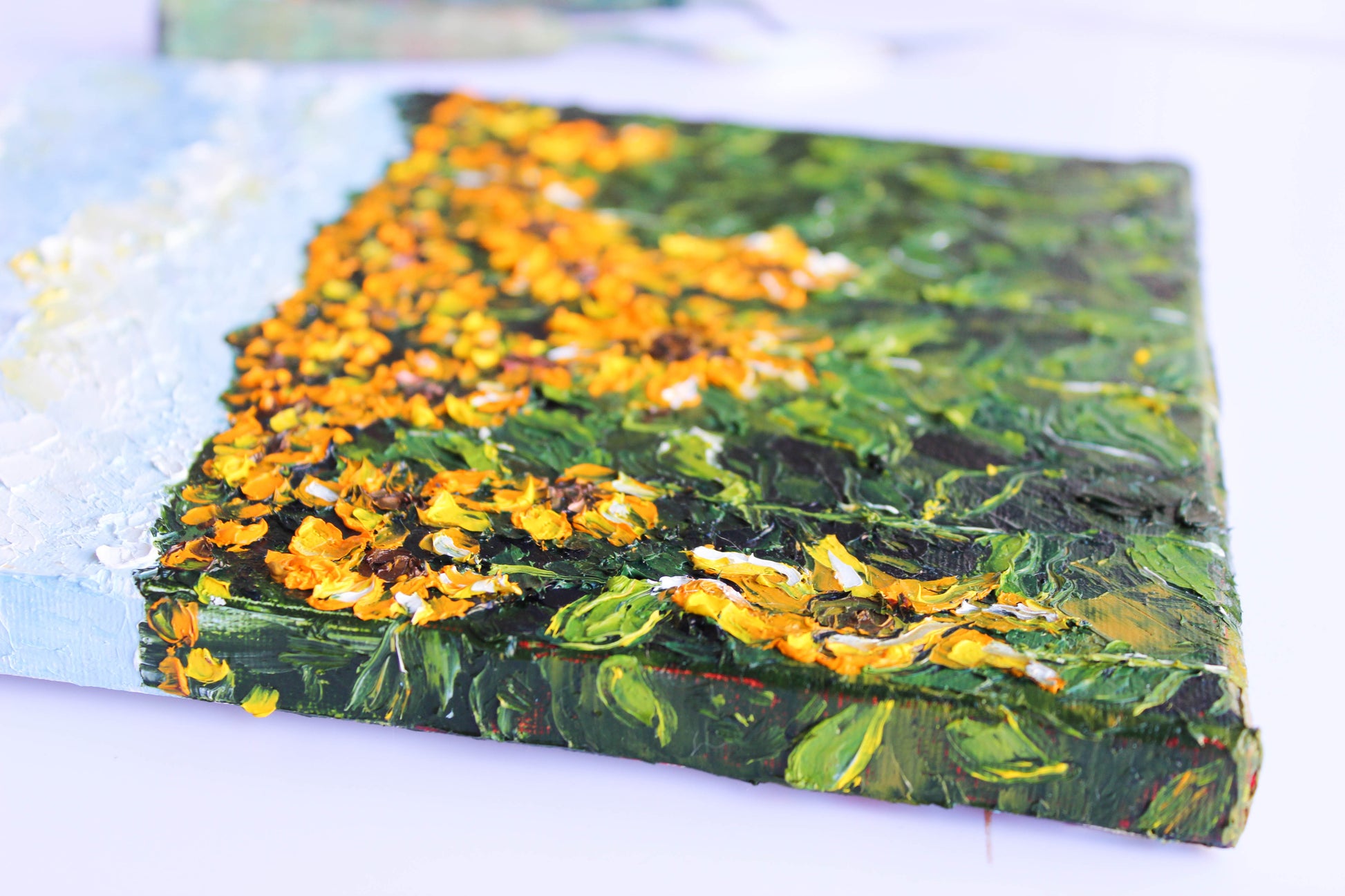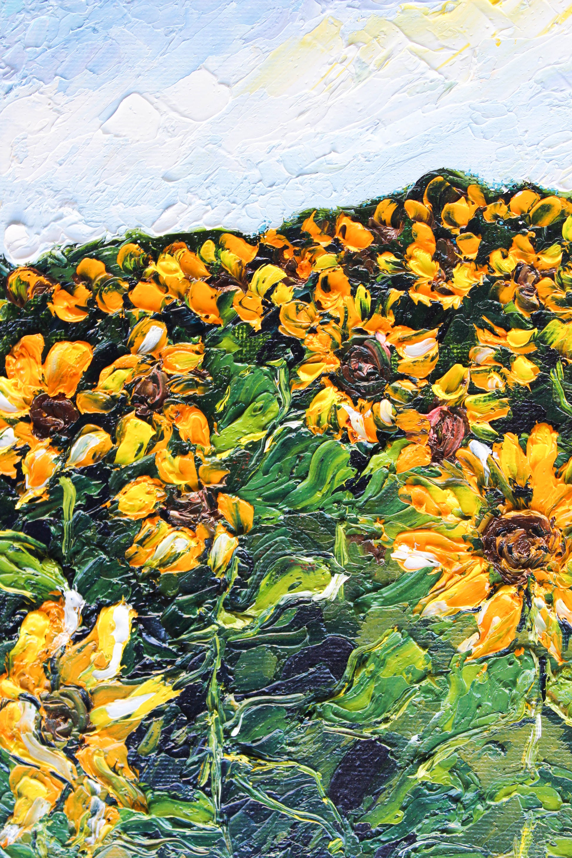 An original and unique high textured palette knife oil painting featuring a beautiful sunflower field. This piece has several layers of paint, creating thick, luxurious textures in a beautiful color combination.