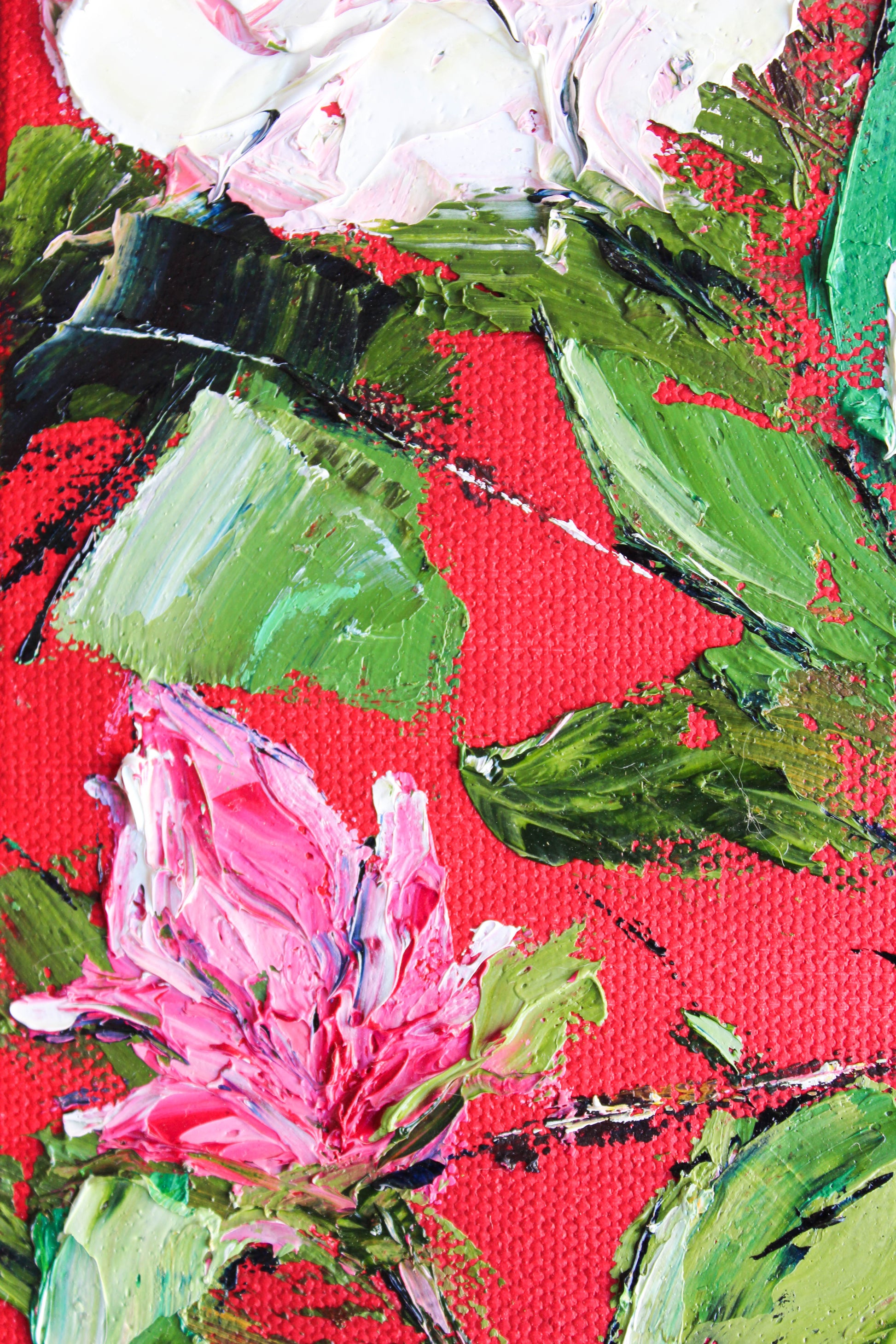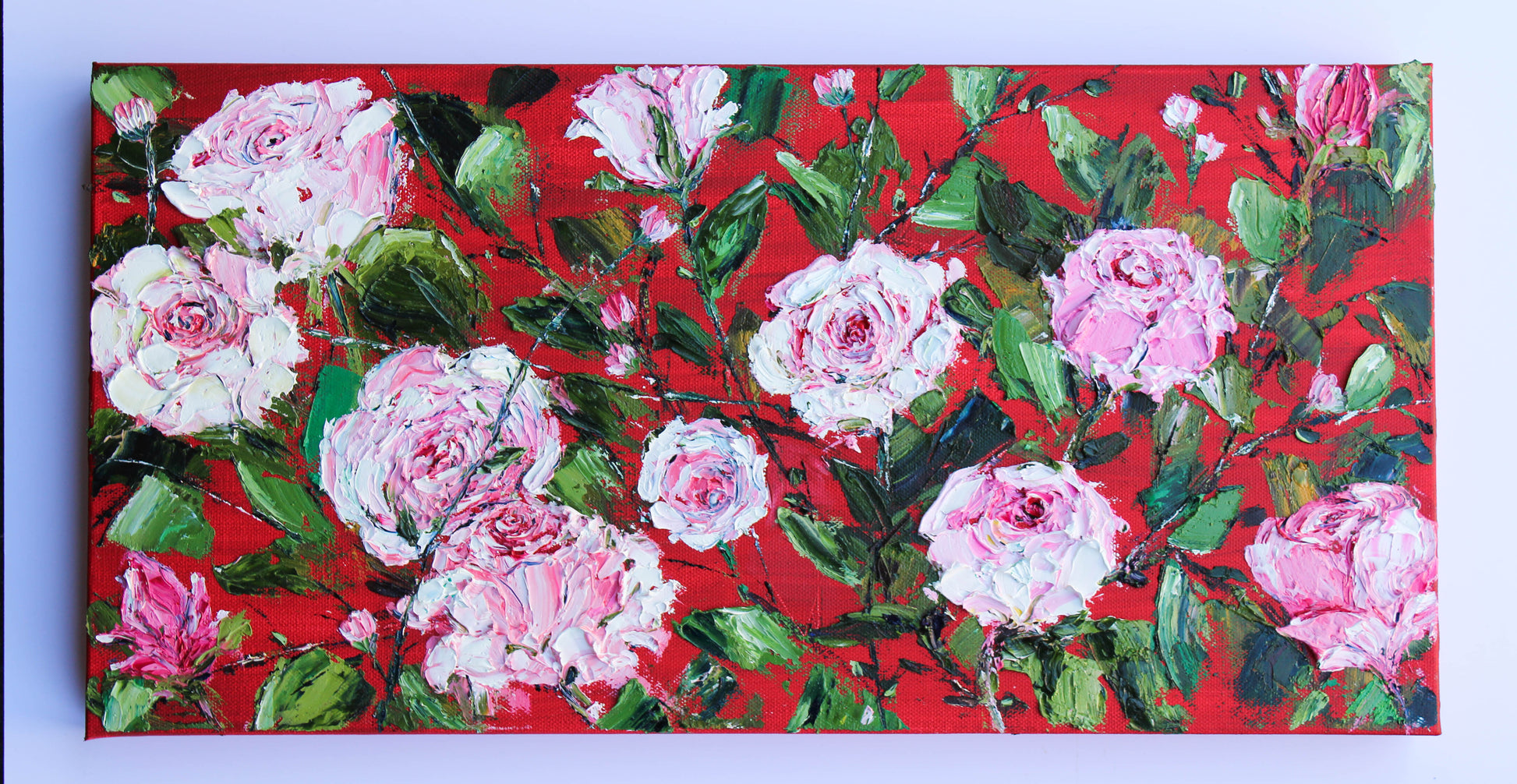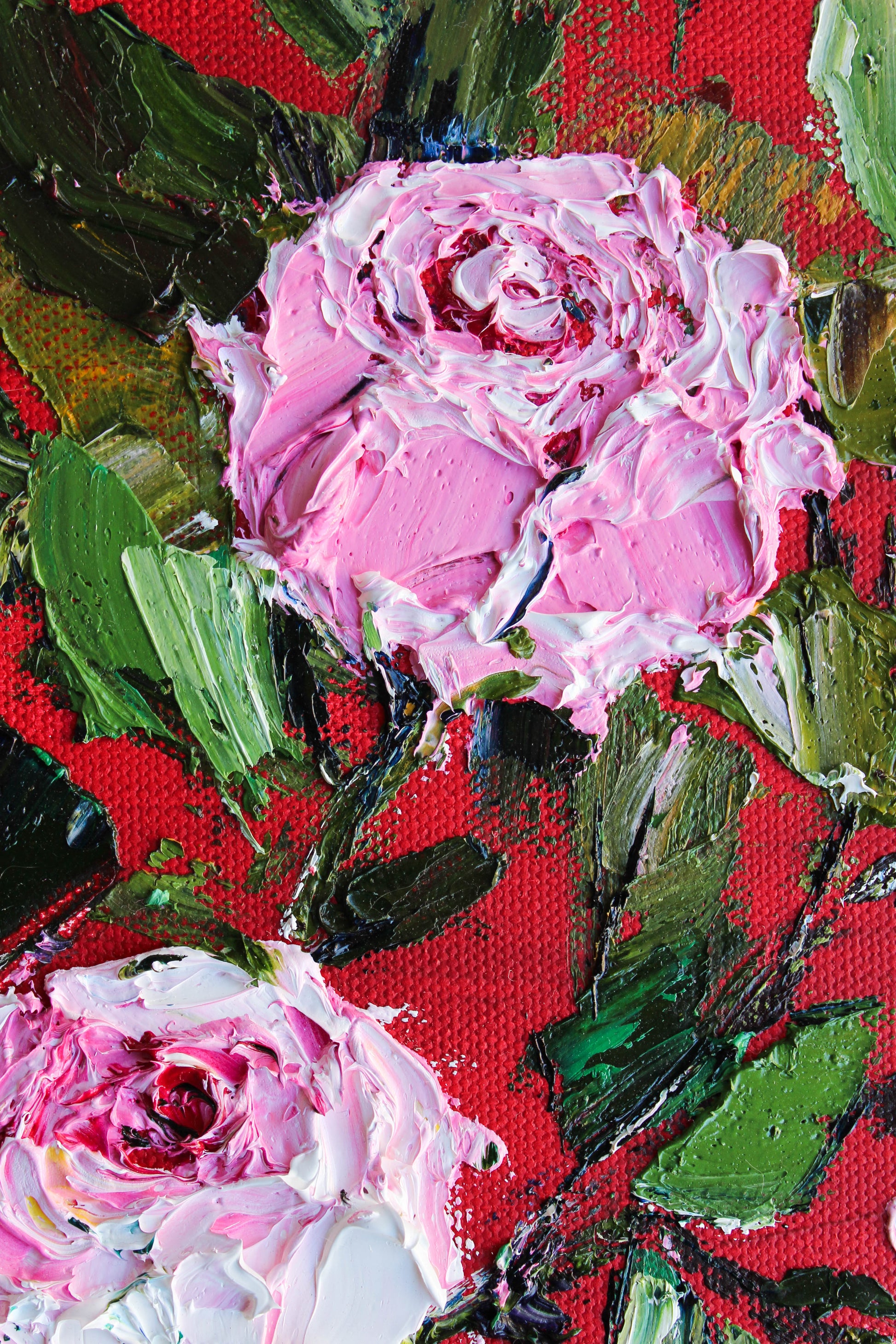 A textured palette knife painting, featuring pink roses on a red colored background. This piece has several layers of paint creating thick, luxurious textures in a beautiful color combination.