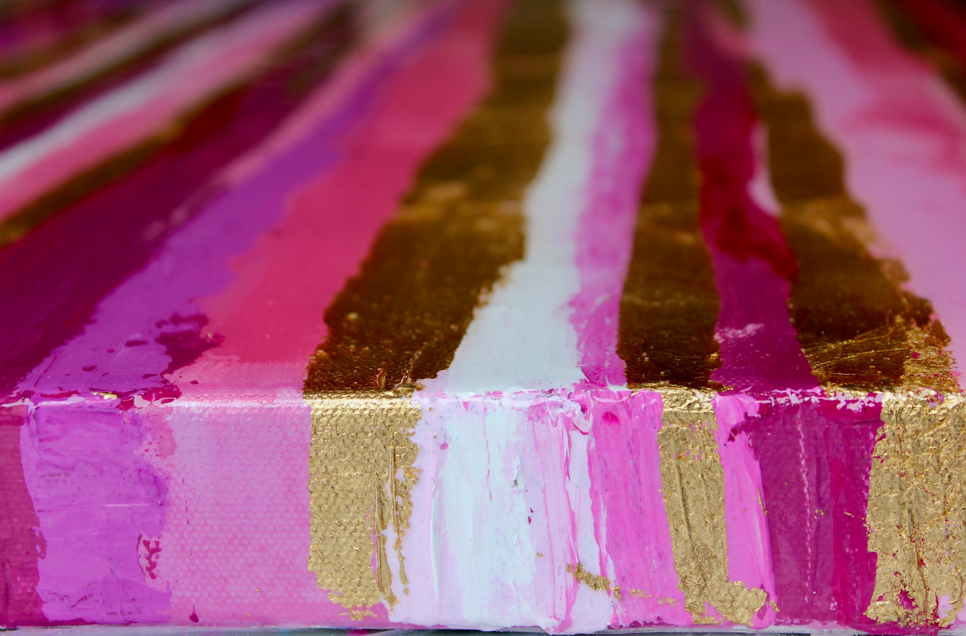 An original and unique modern abstract palette knife mixed media on canvas. Painted with different shades of pink and gold leaf, this beauty is finished with two coats of high quality epoxy resin for protection and for a shiny effect.