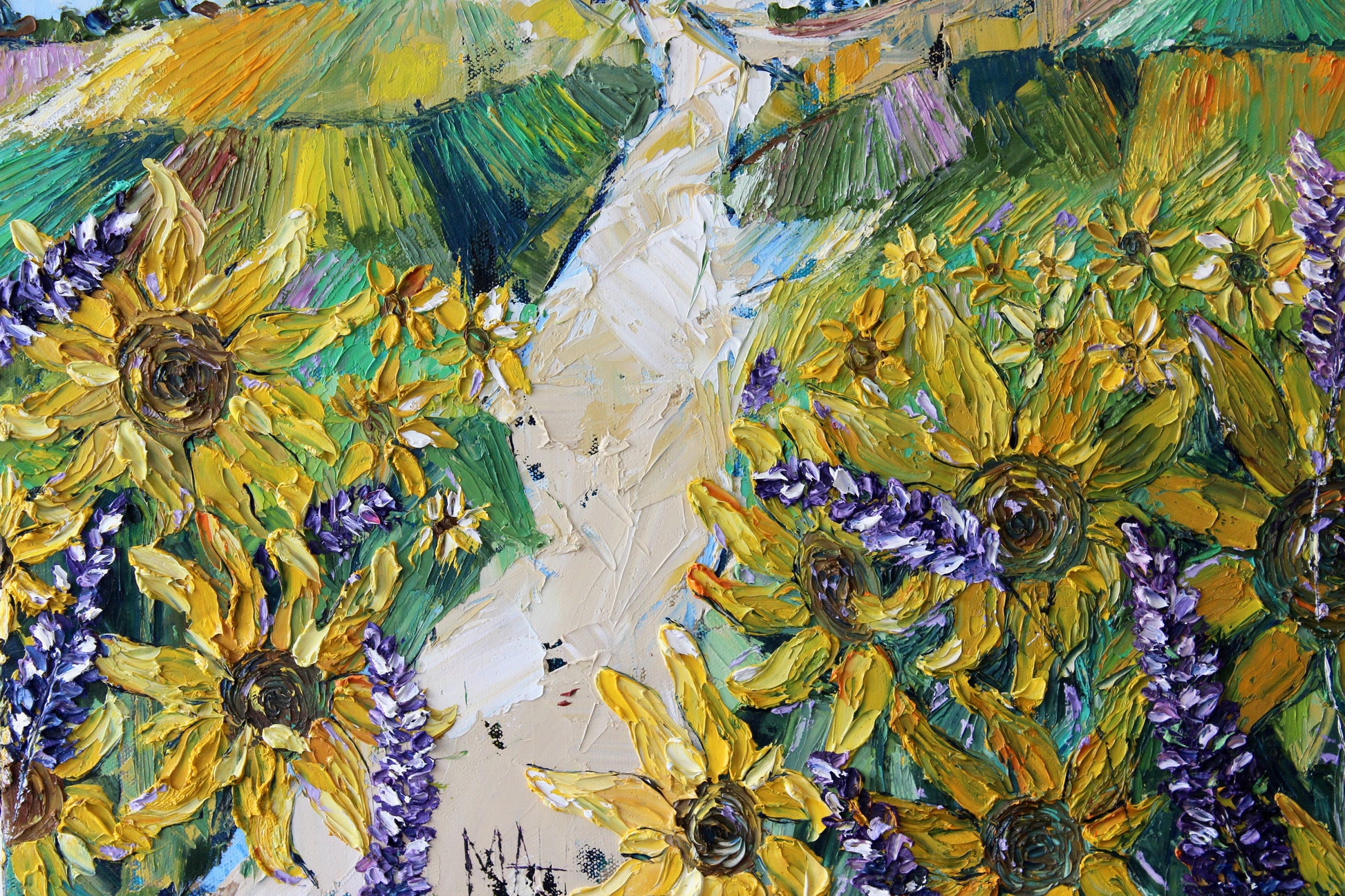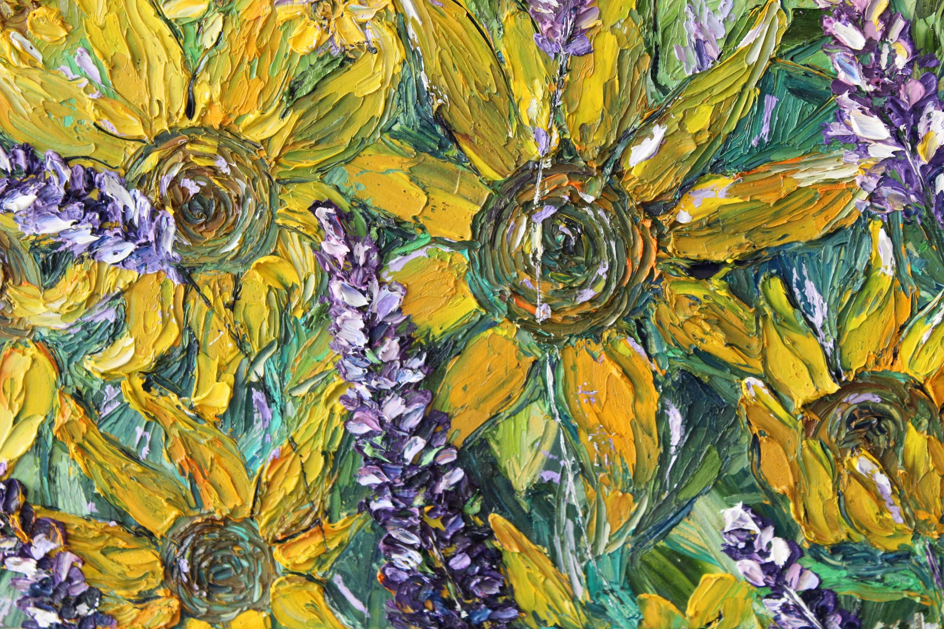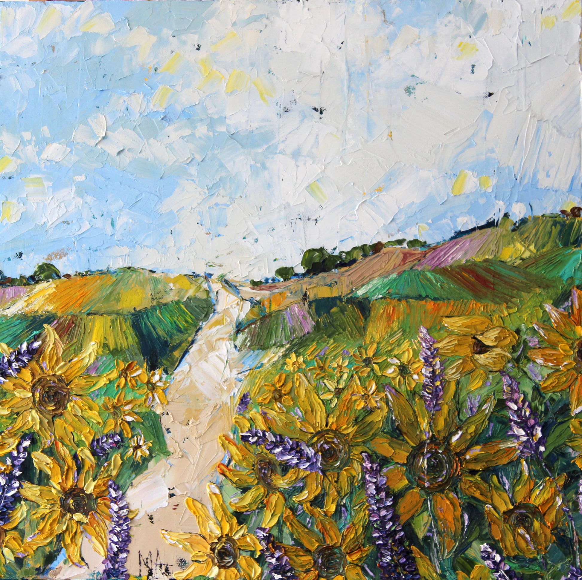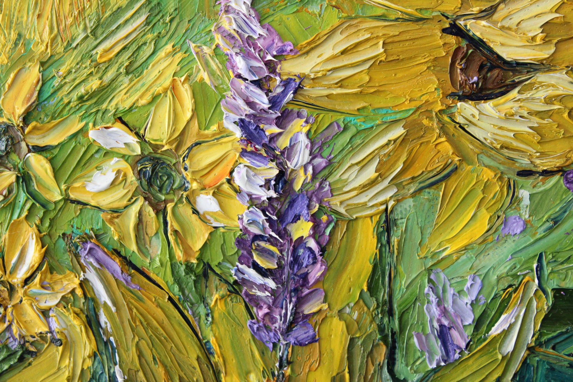 "Sunshine" is an original highly textured palette knife oil painting on gallery wrapped canvas, inspired by my trips to beautiful Carmel By The Sea, depicting thickly textured lavenders and sunflowers reaching for the sun. The playful palette of yellows, purples and greens is a summertime delight!