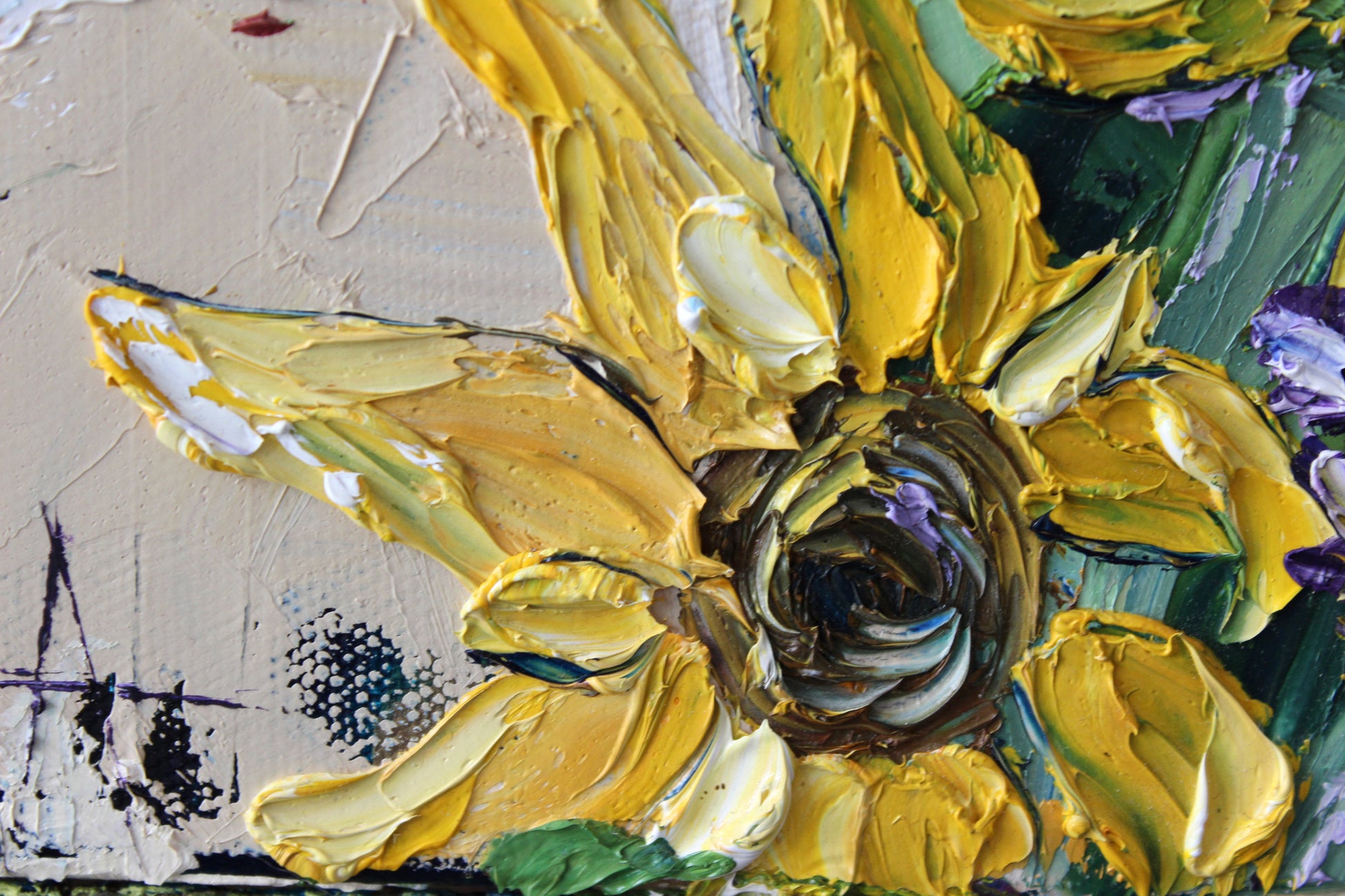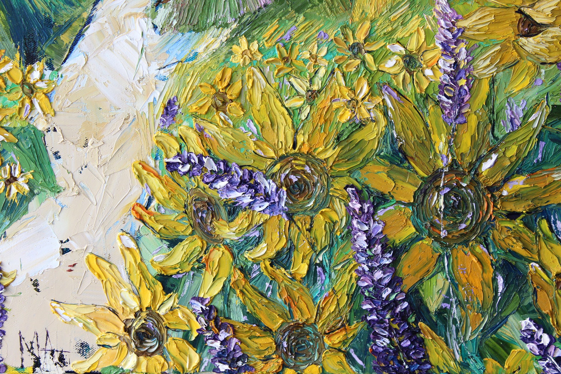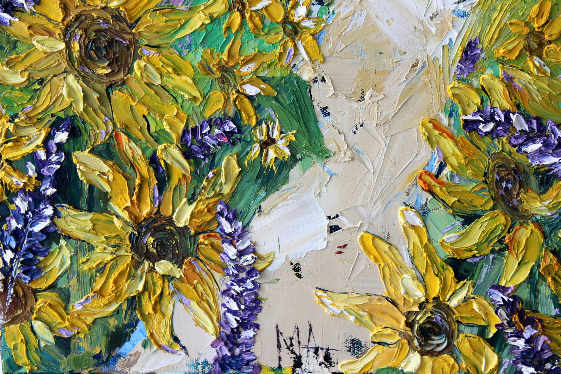 "Sunshine" is an original highly textured palette knife oil painting on gallery wrapped canvas, inspired by my trips to beautiful Carmel By The Sea, depicting thickly textured lavenders and sunflowers reaching for the sun. The playful palette of yellows, purples and greens is a summertime delight!