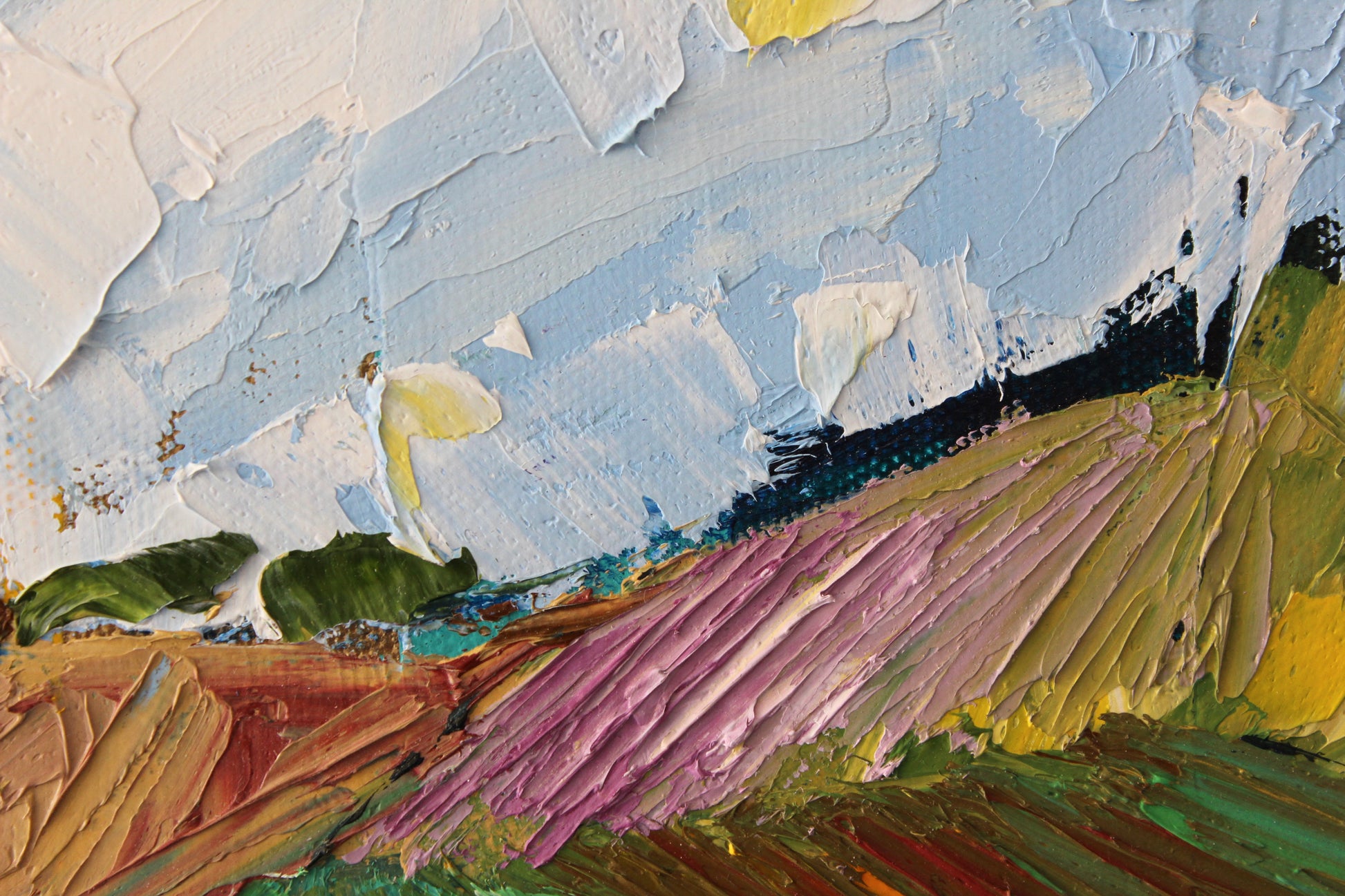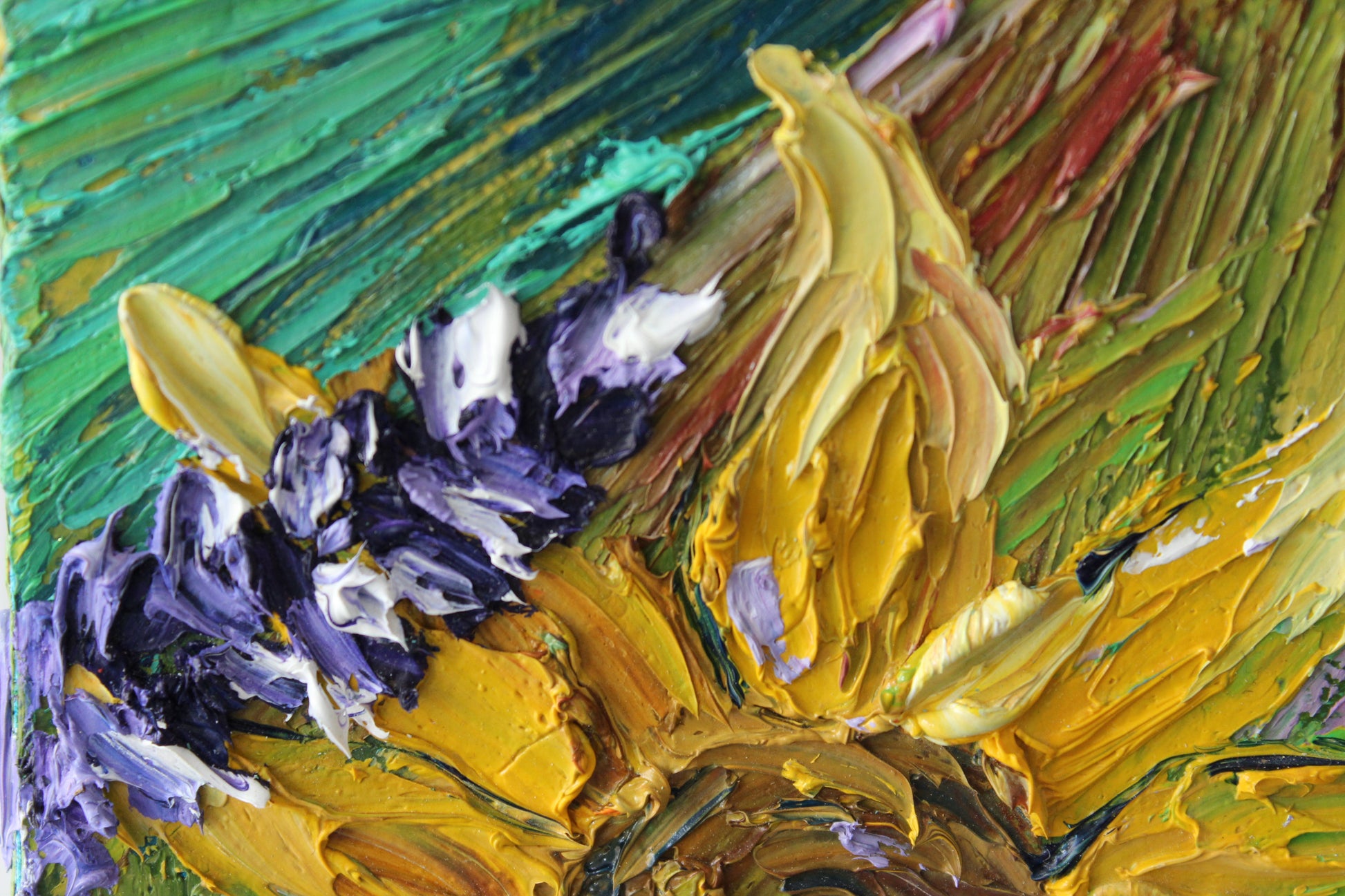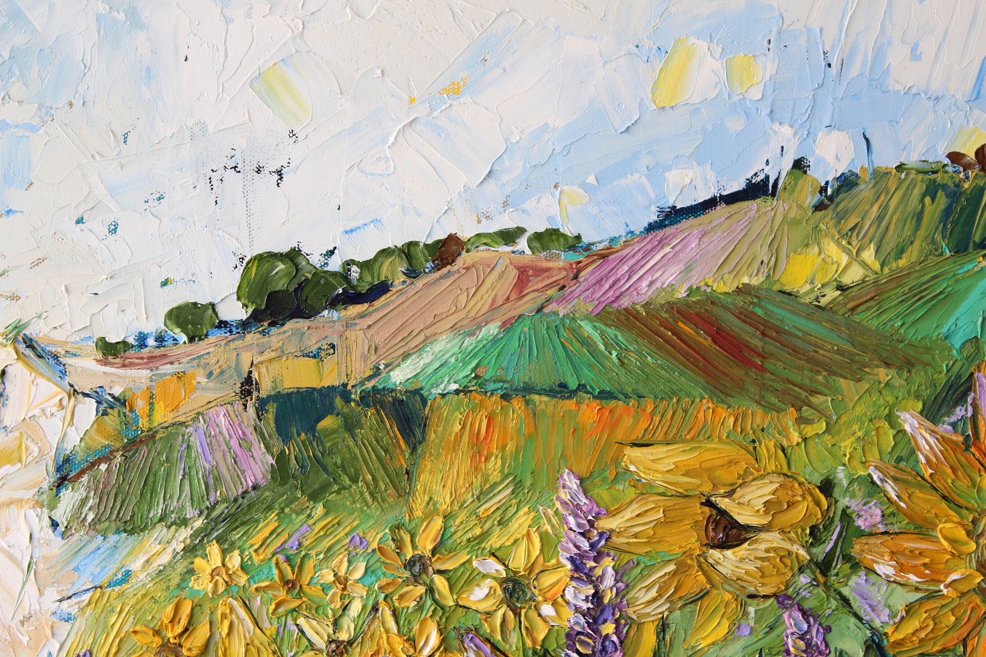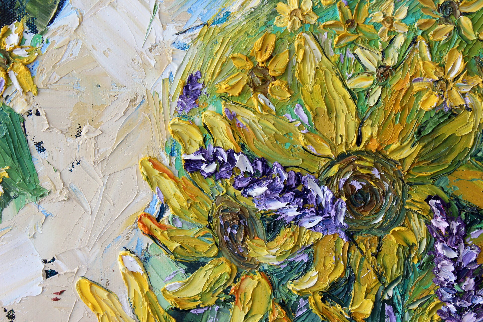 "Sunshine" is an original highly textured palette knife oil painting on gallery wrapped canvas, inspired by my trips to beautiful Carmel By The Sea, depicting thickly textured lavenders and sunflowers reaching for the sun. The playful palette of yellows, purples and greens is a summertime delight!