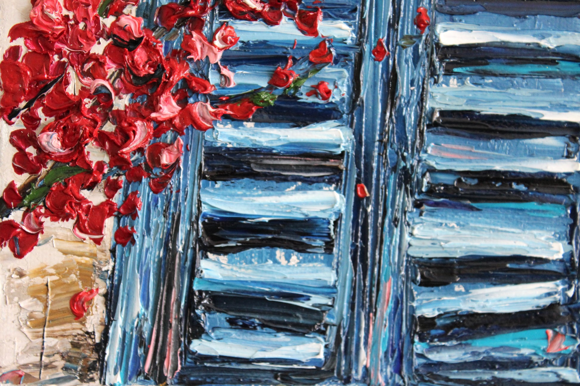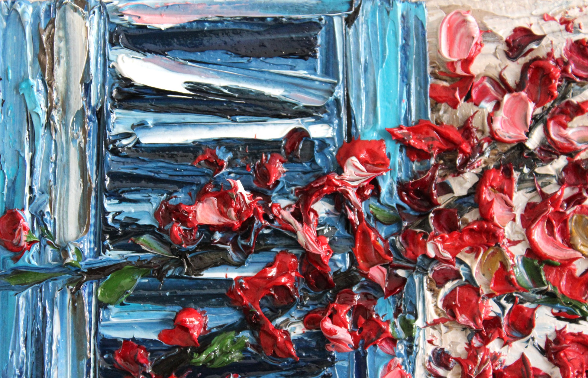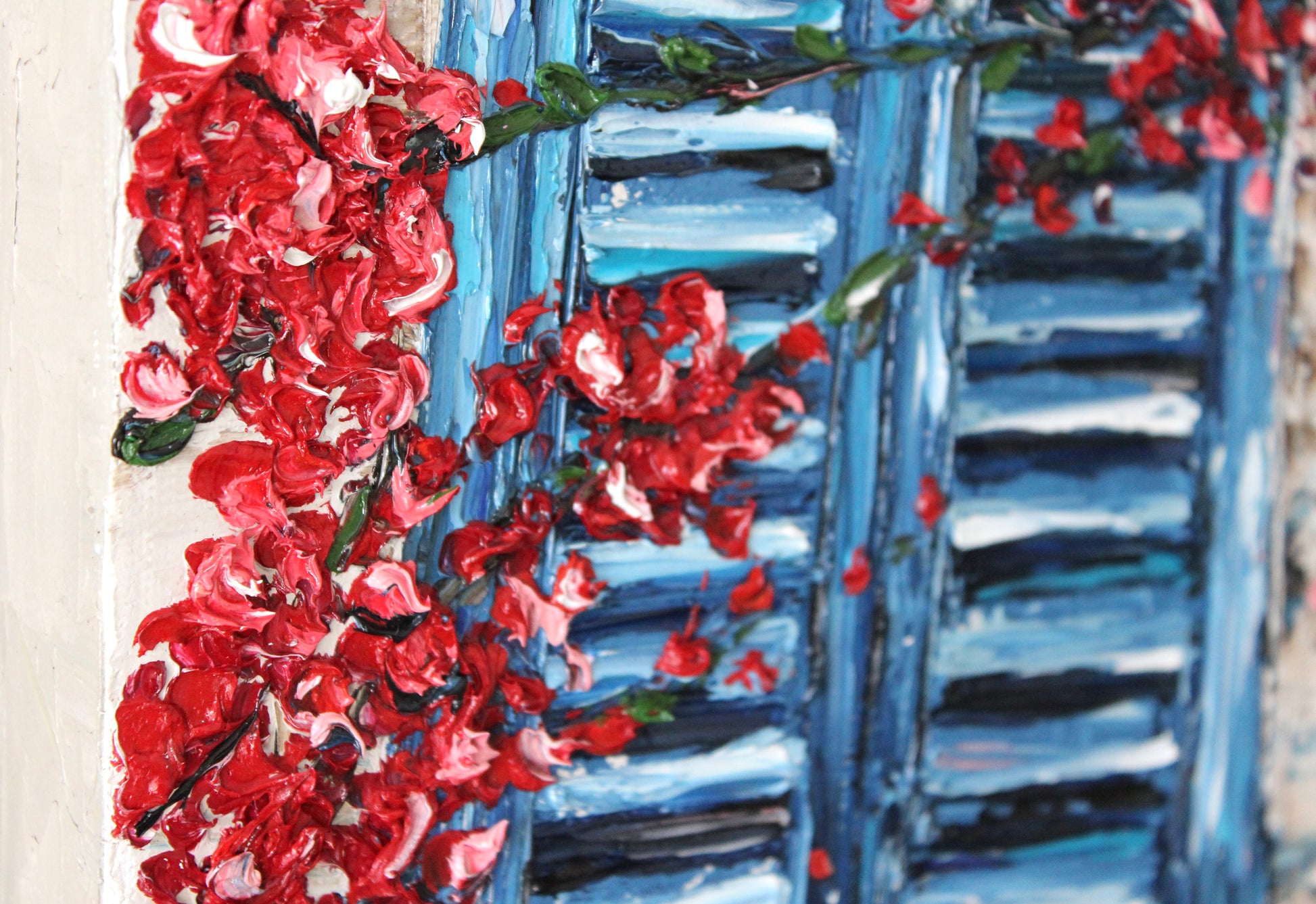 This textured palette knife painting features a vivid blue window framed by delicate flowering branches, evoking warmth and serenity. Inspired by Mediterranean charm, its vibrant colors and intricate details radiate joy and optimism.